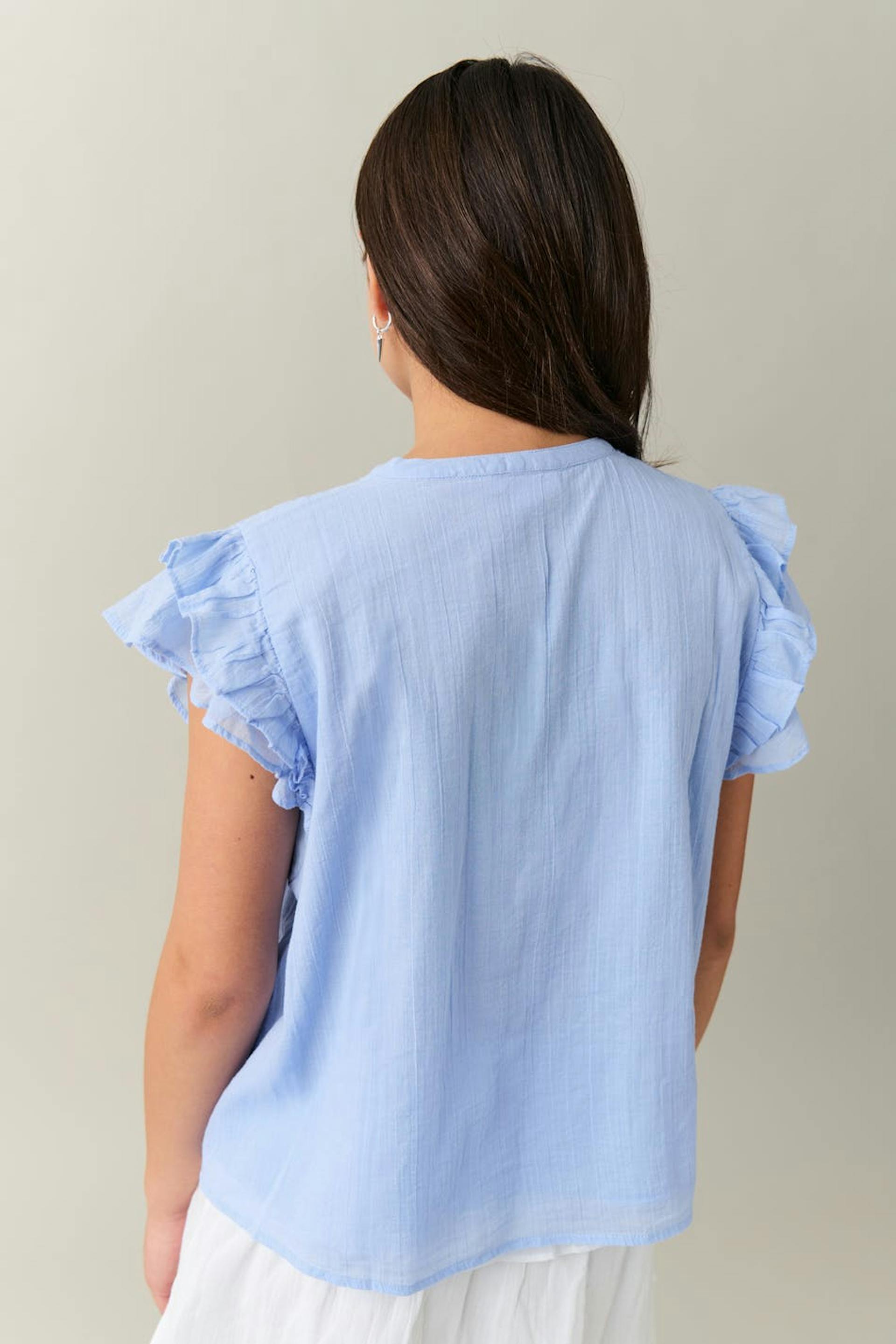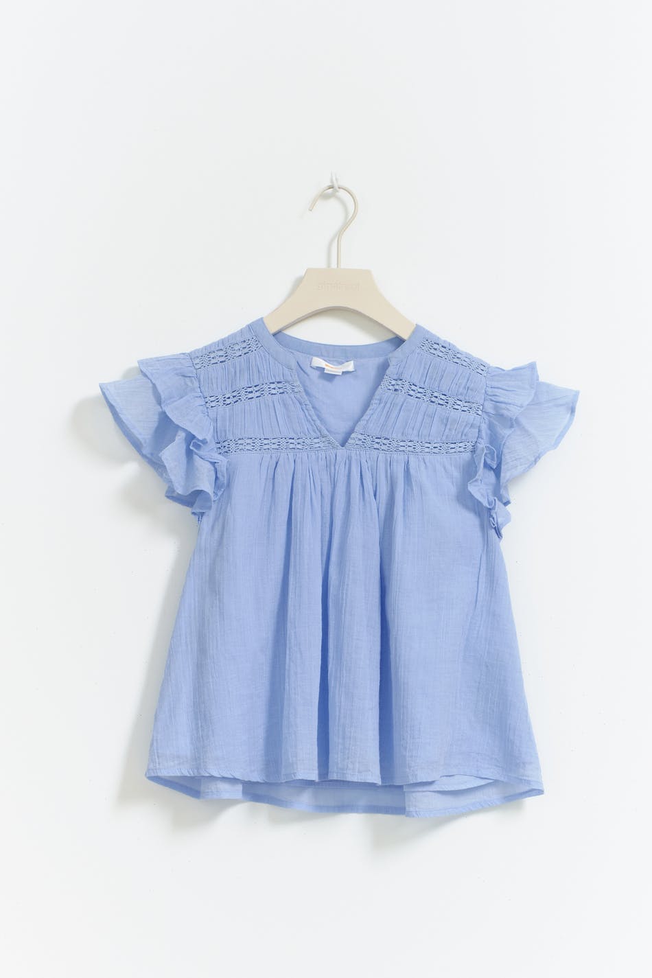 Sleeveless blouse with flounces around the shoulders. The blouse is light-blue, bohemian and lined. It has loose-fitting style, sheer cotton quality, crocheted details at the top, v-neck, small collar and gathered seam at the top.