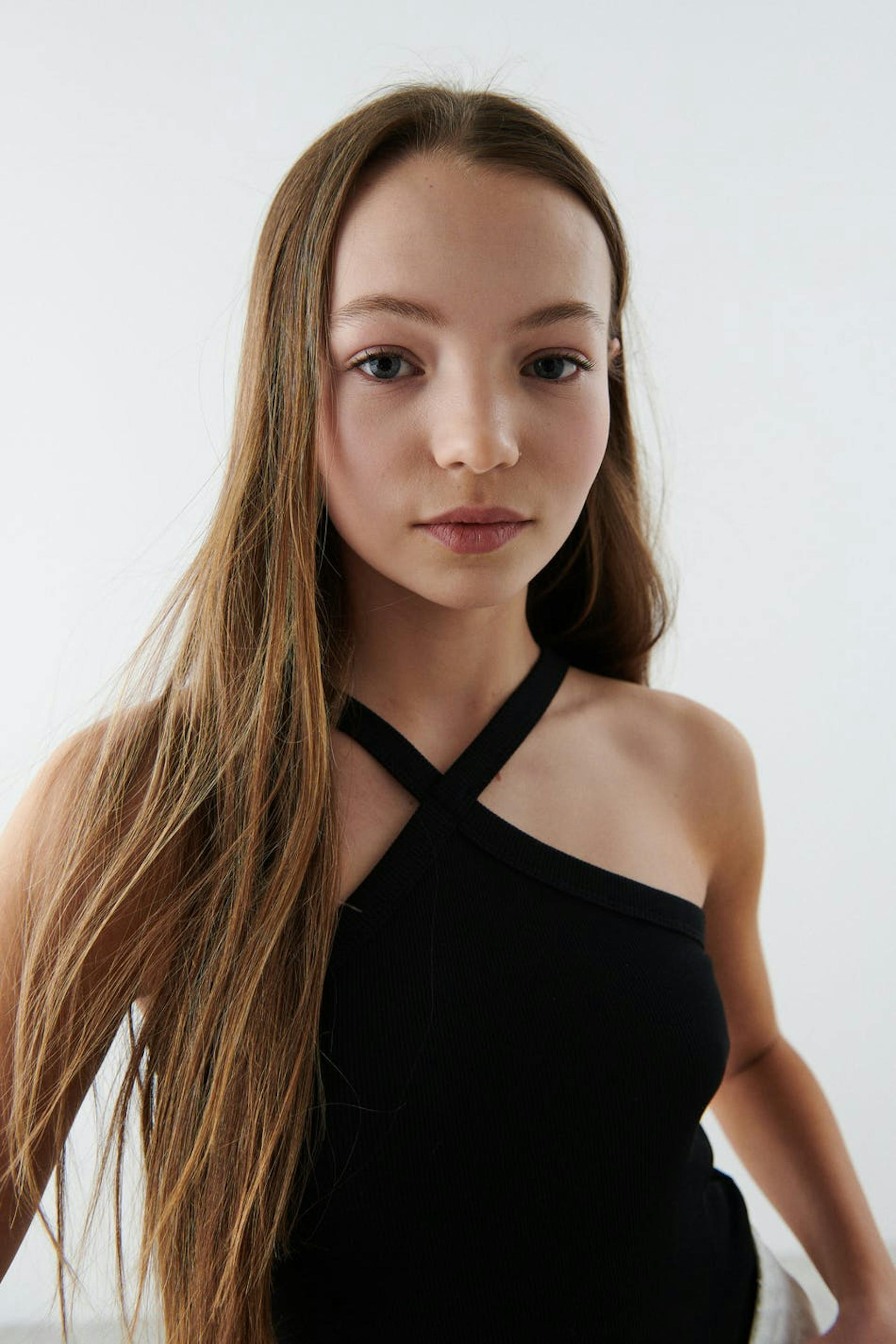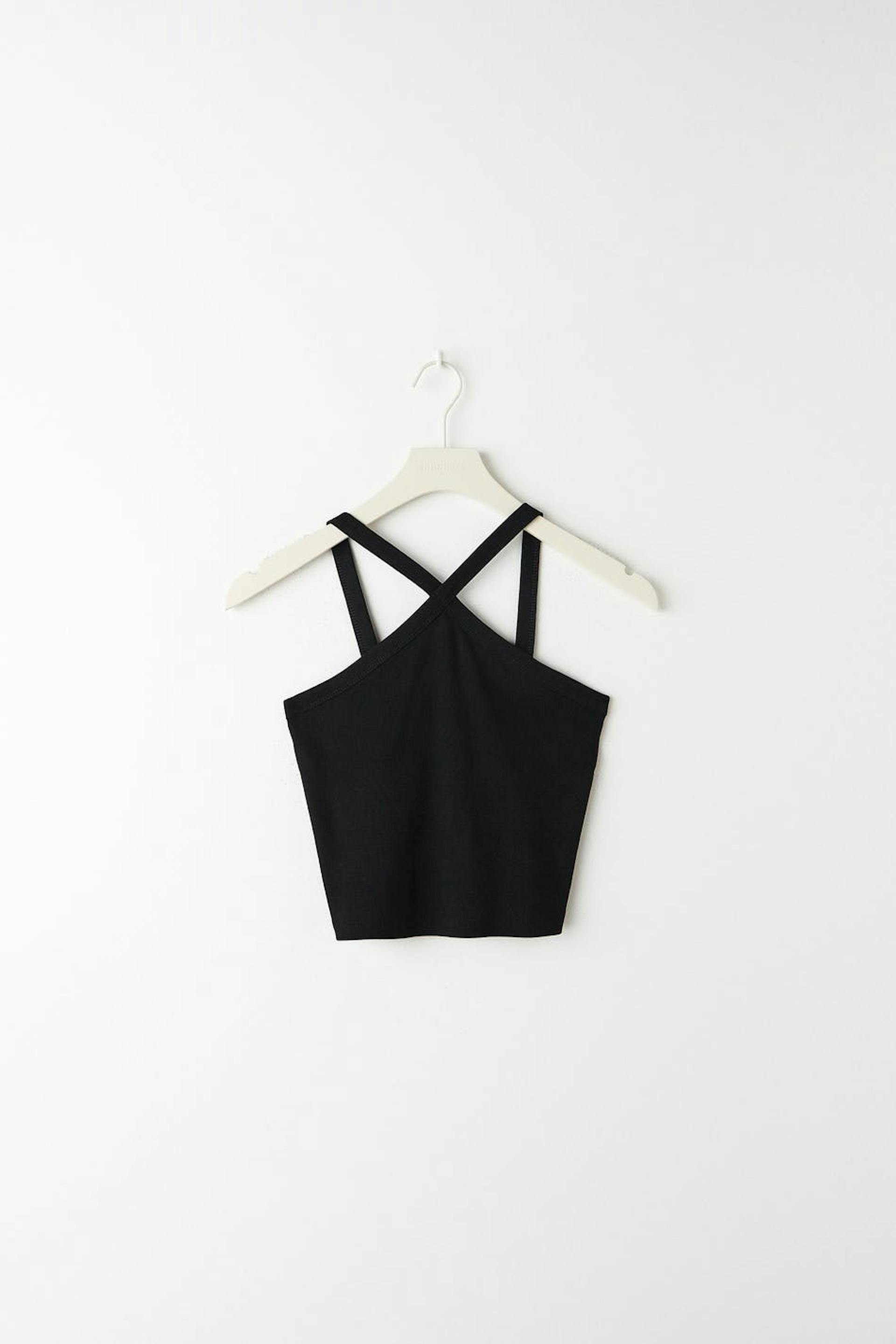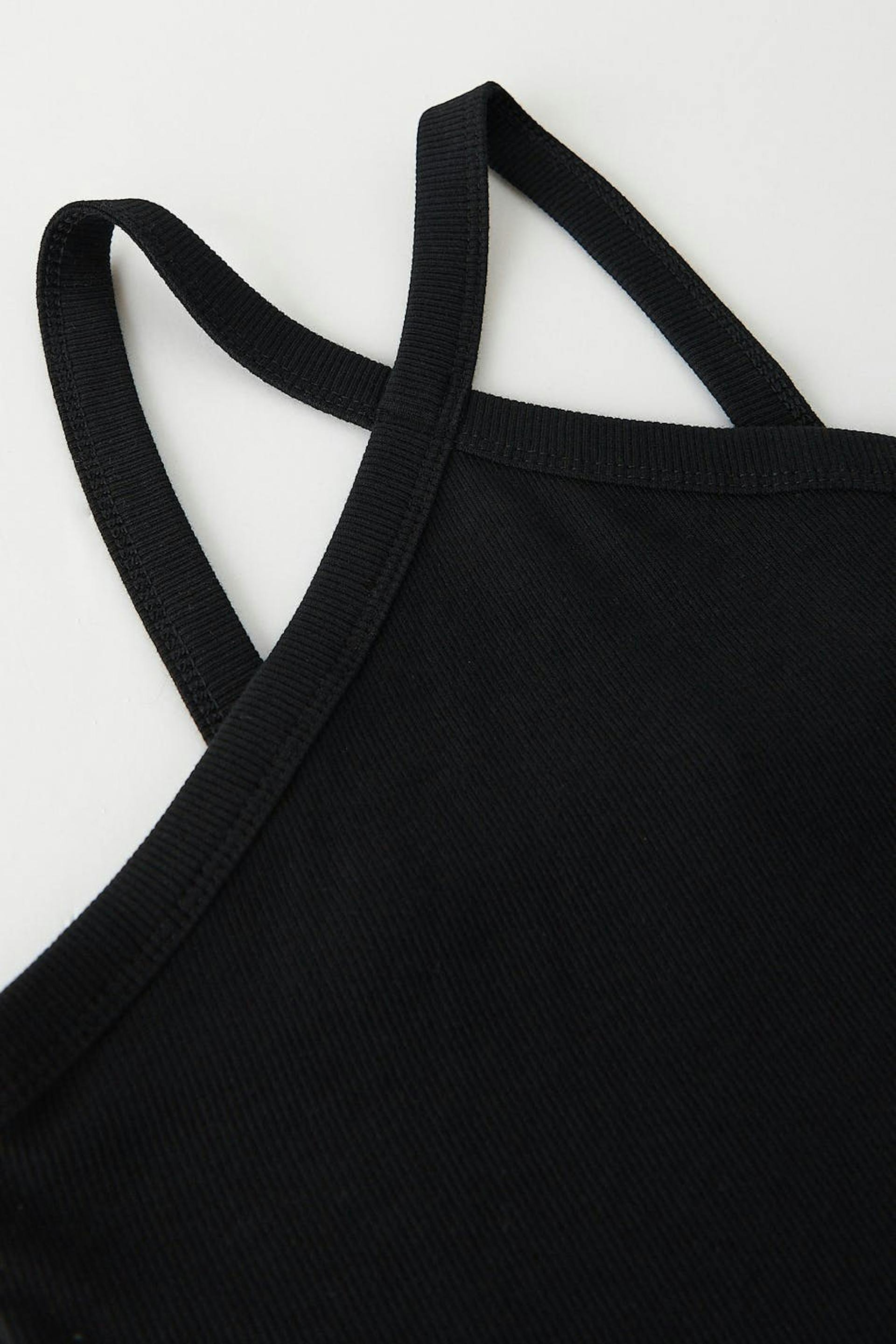 Top by our Young assortment with crossover straps at the front. The top is black and has a ribbed quality in jersey.