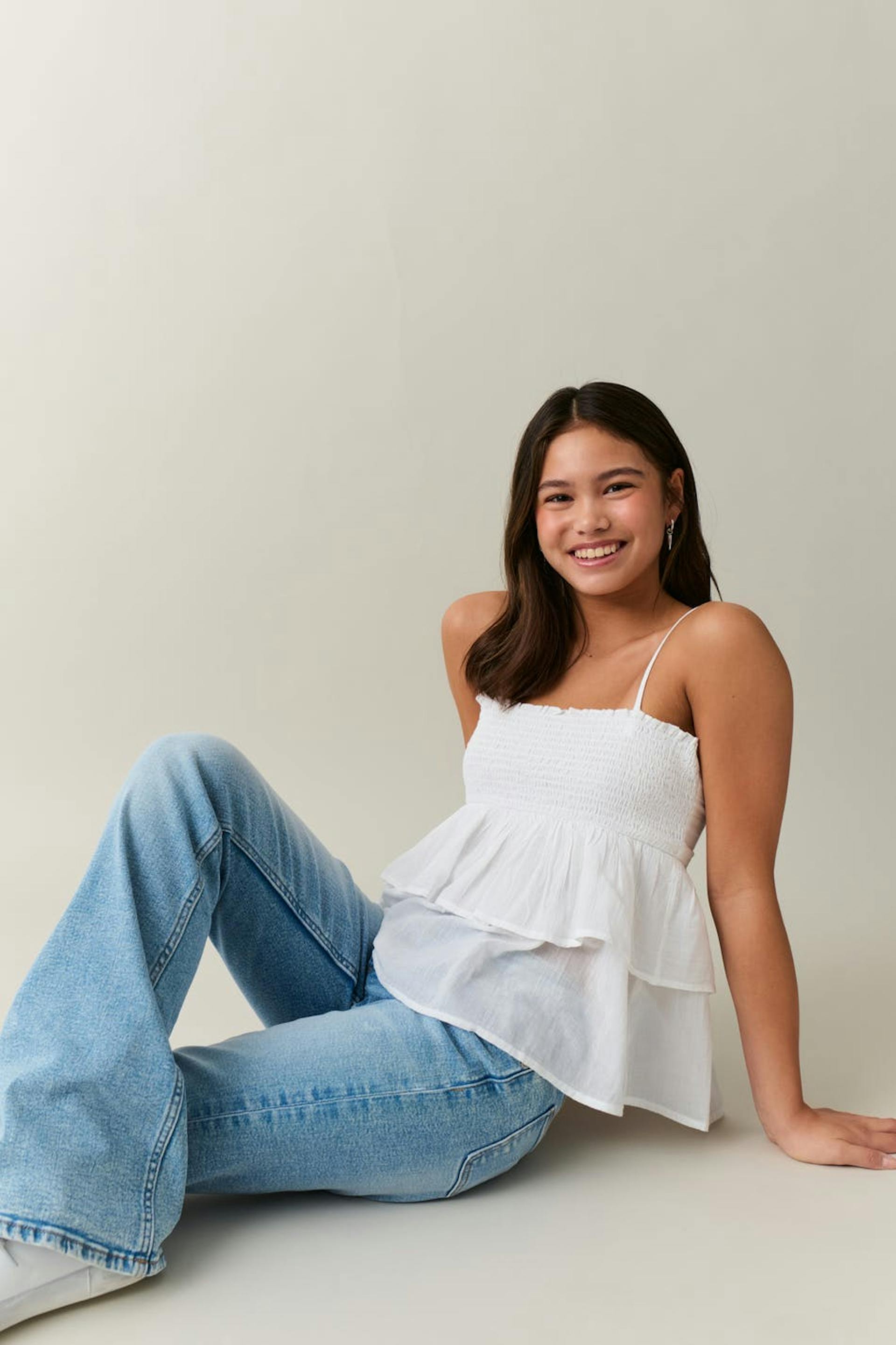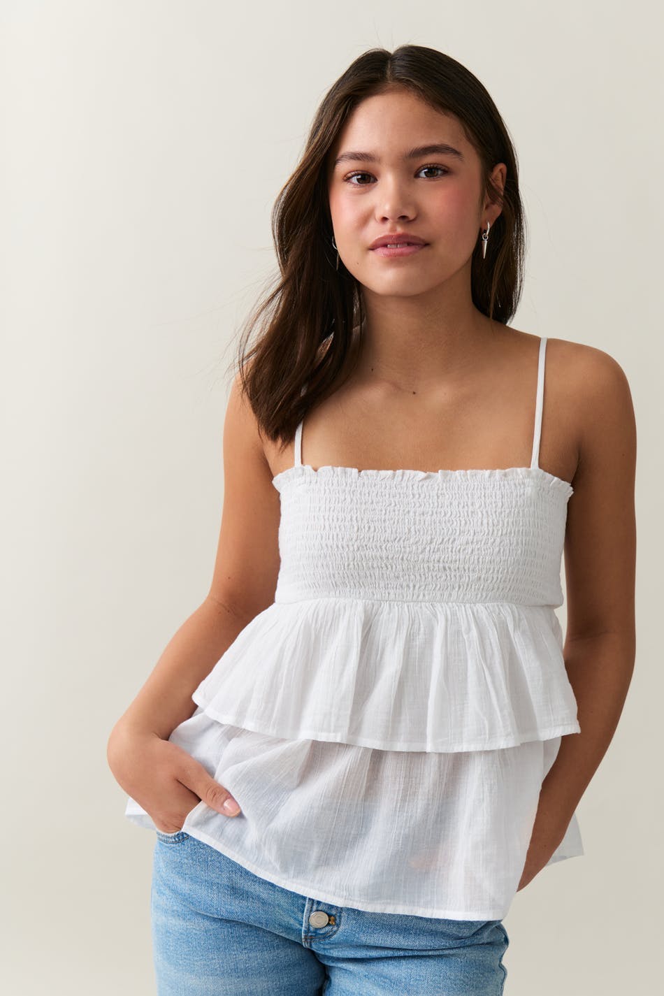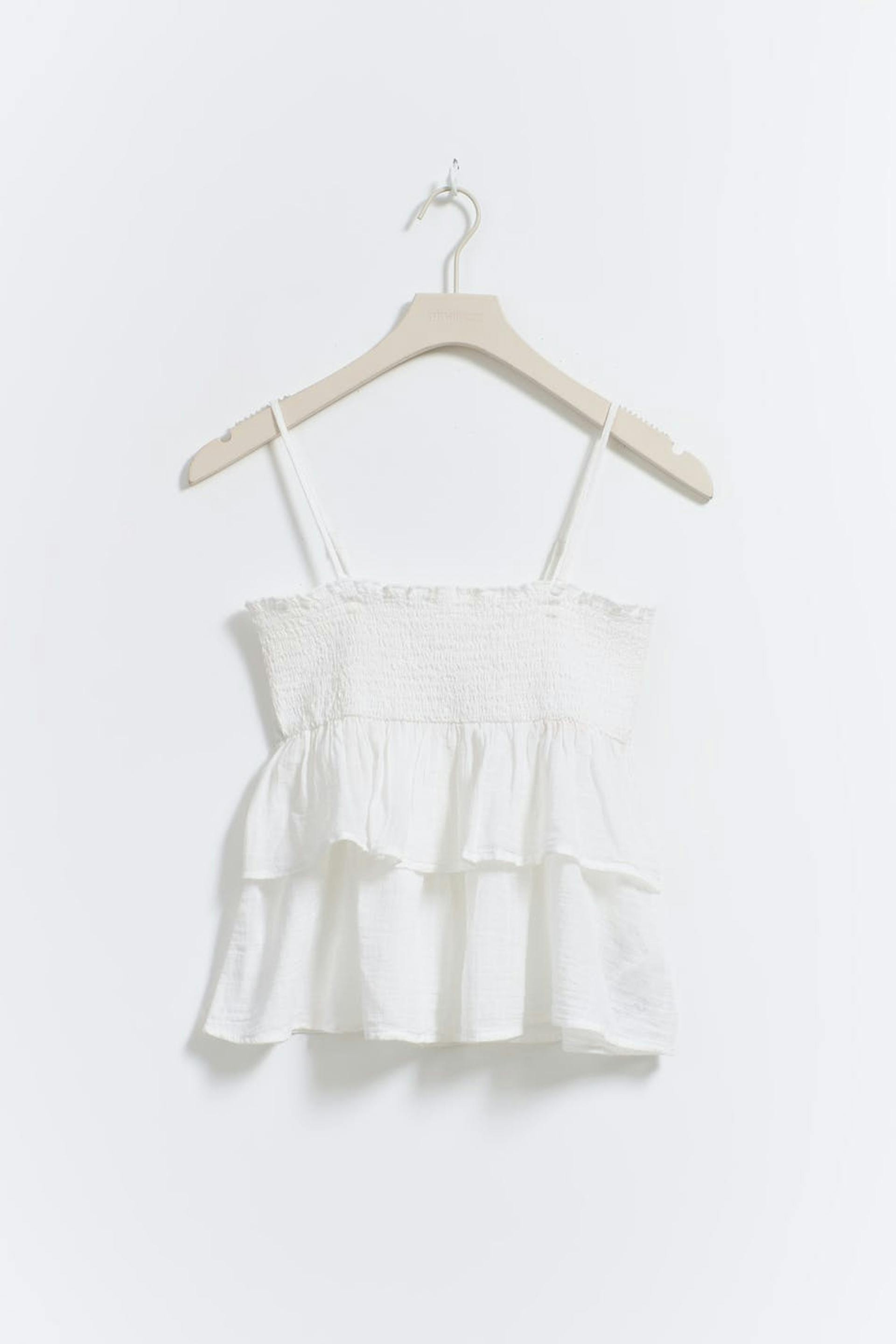 Bohemian singlet with frills. The singlet is white and has smocking at the top. It has removable, adjustable shoulder straps.