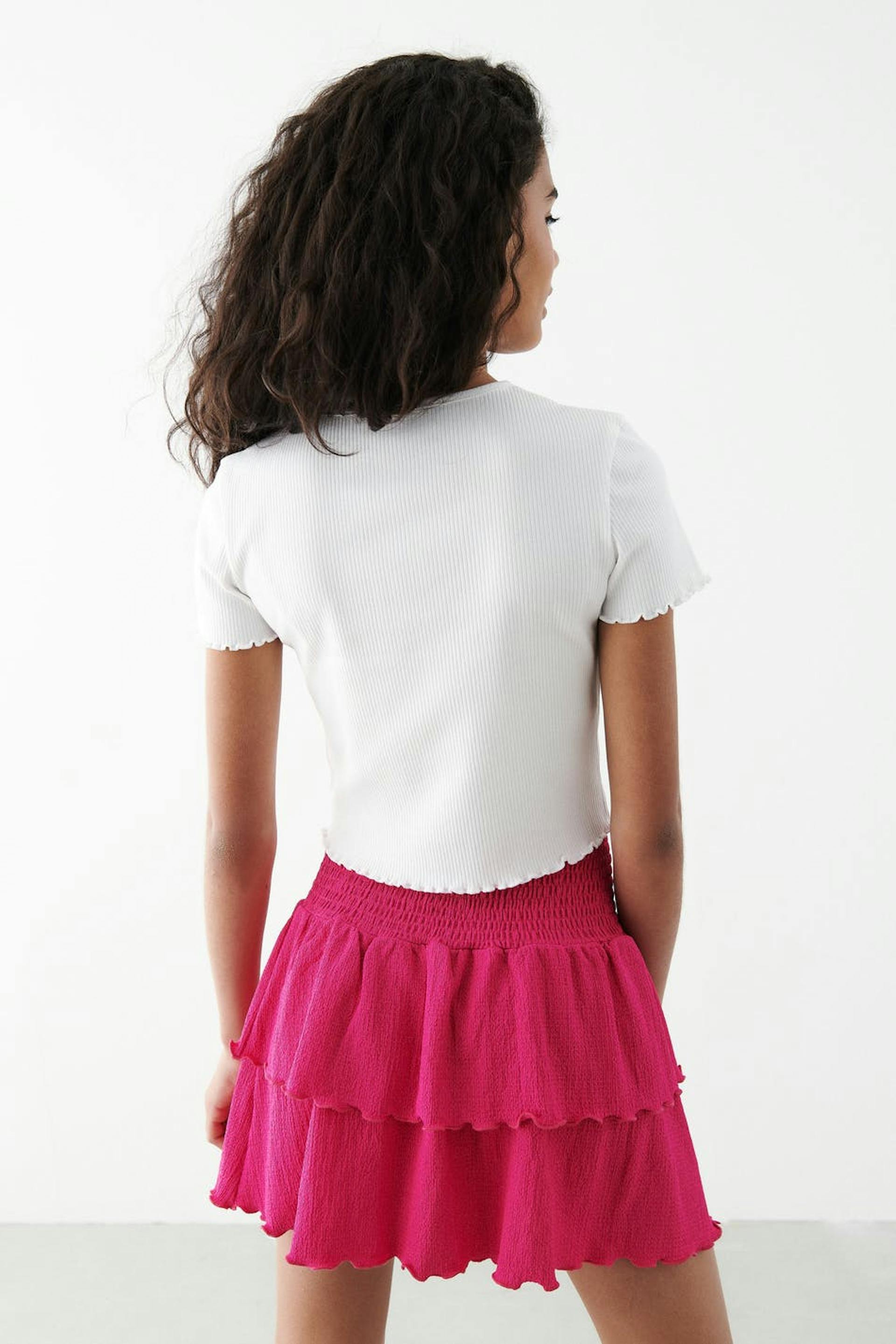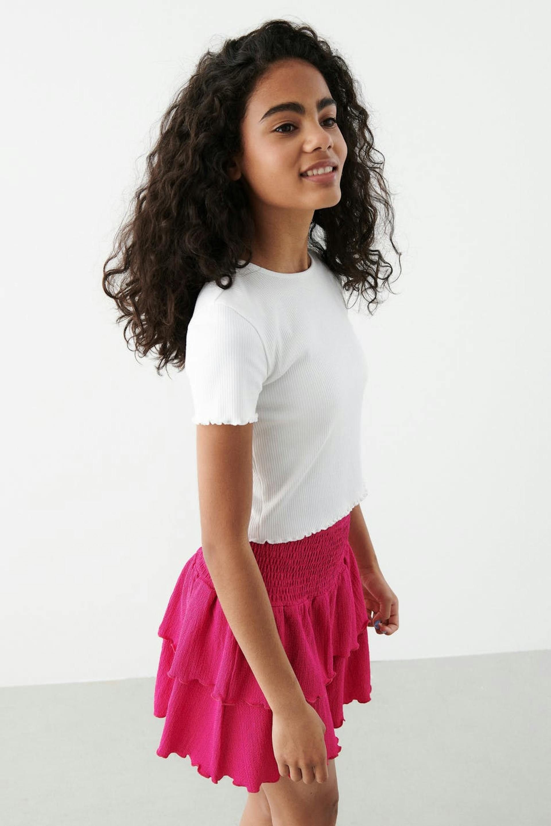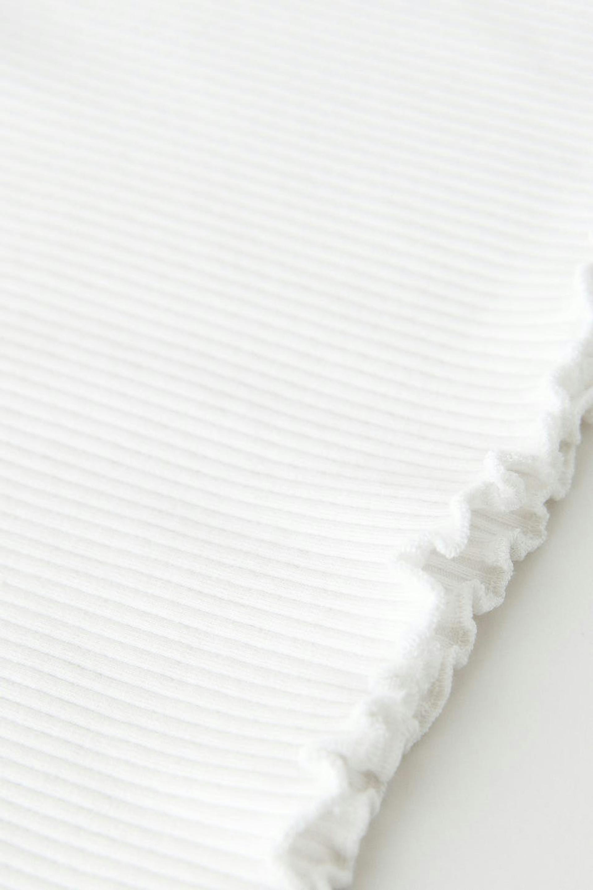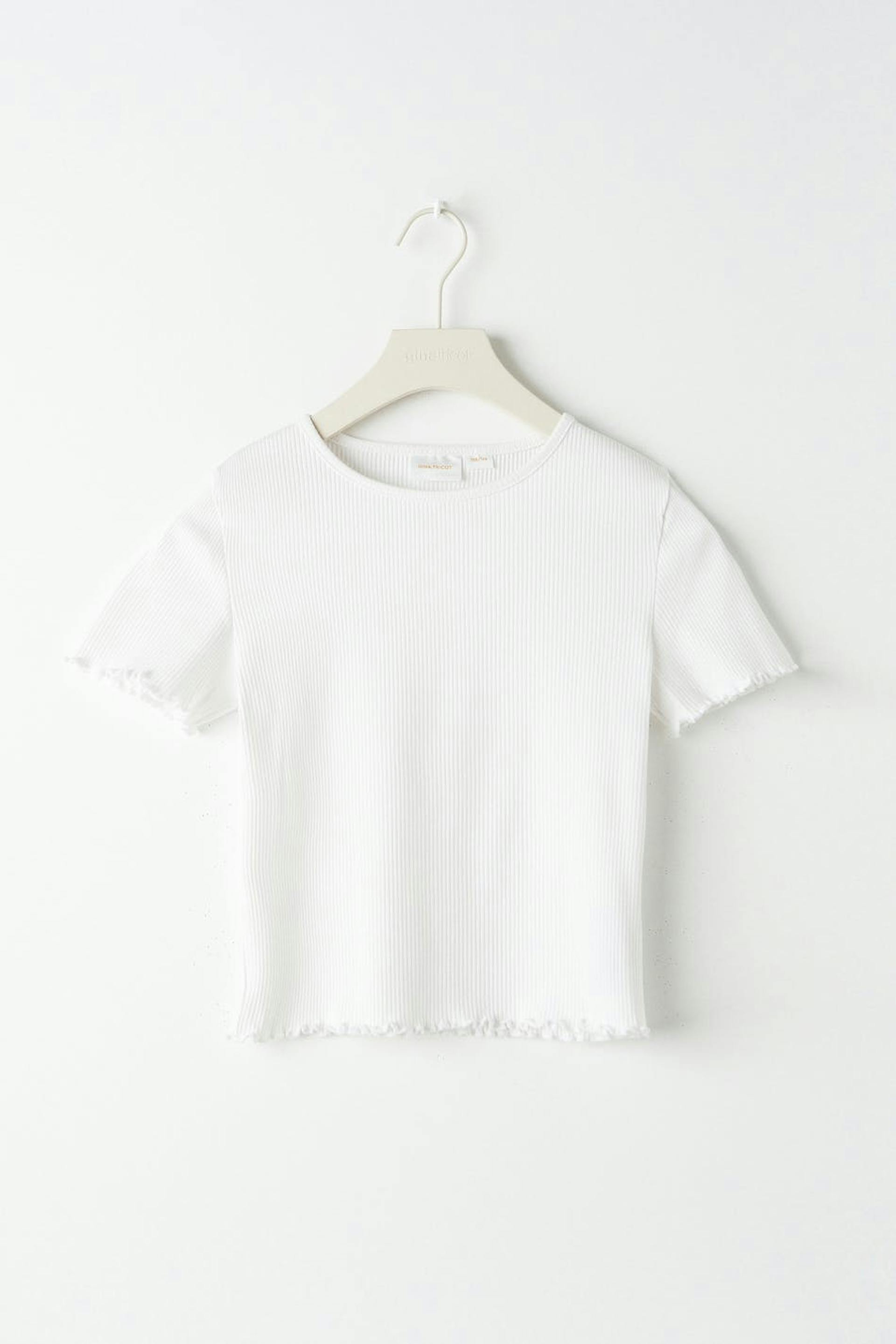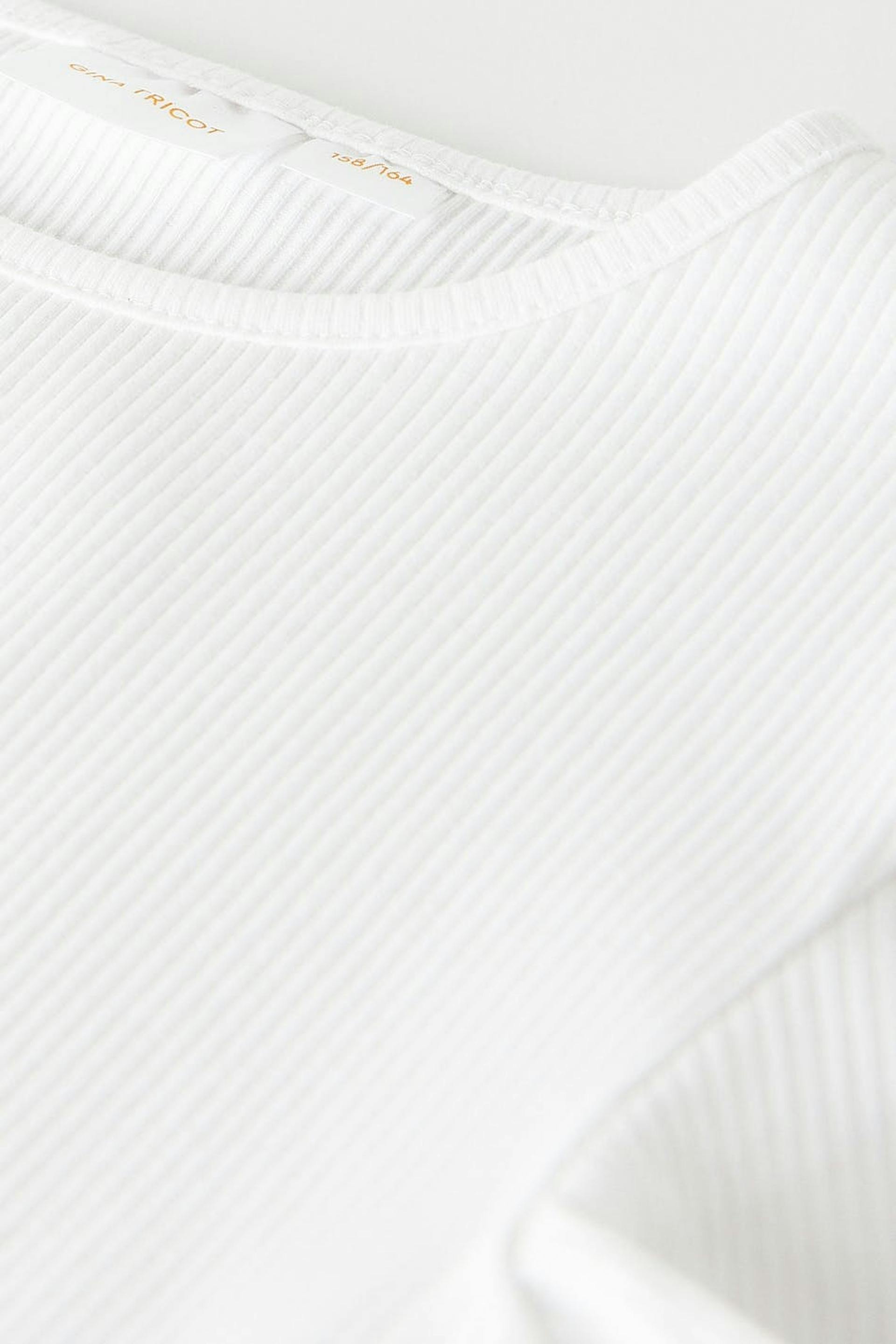 Ribbed t-shirt in jersey with a fitted fit. The t-shirt is white and has a rounded neckline. It has a cropped length and a curled hemline.