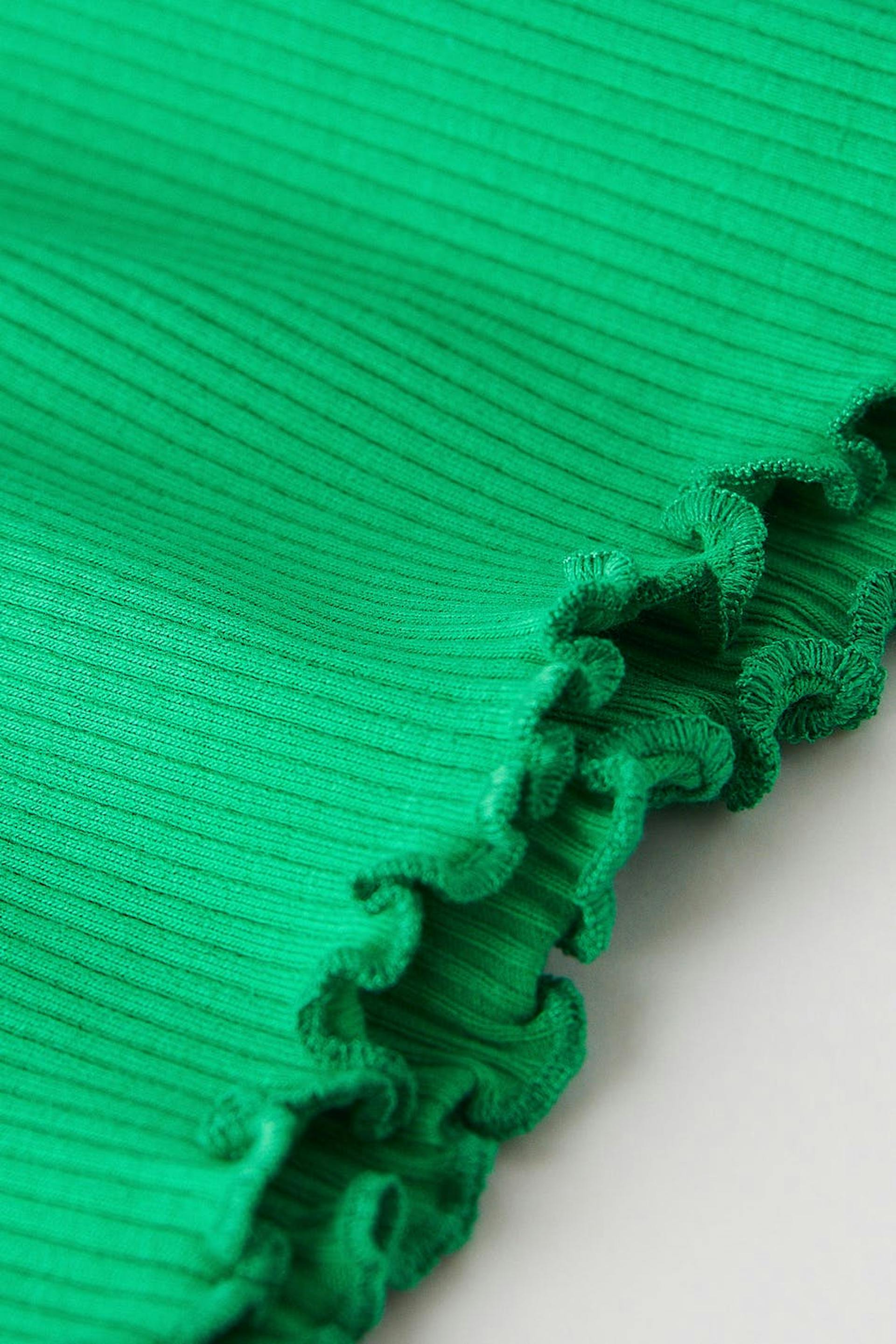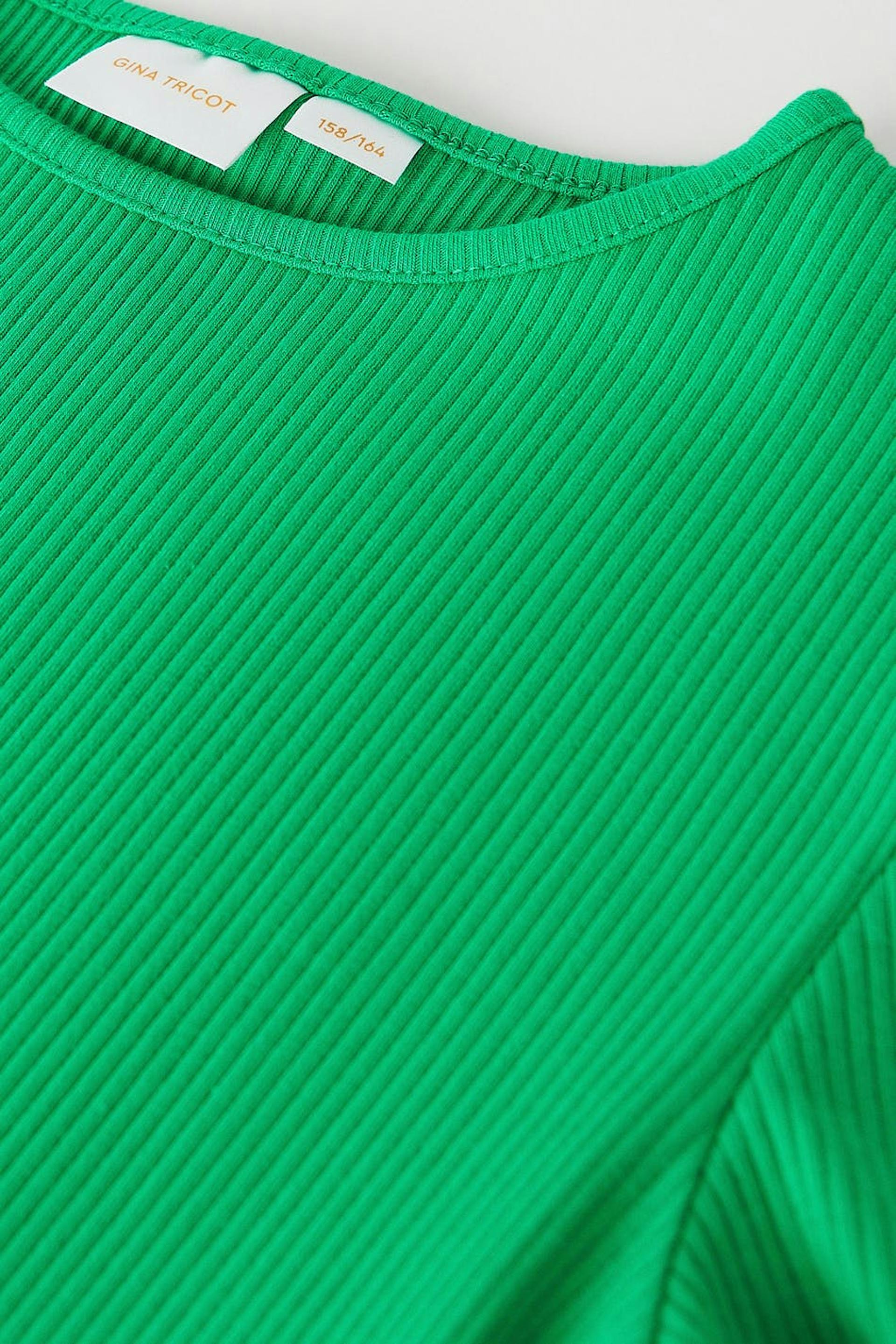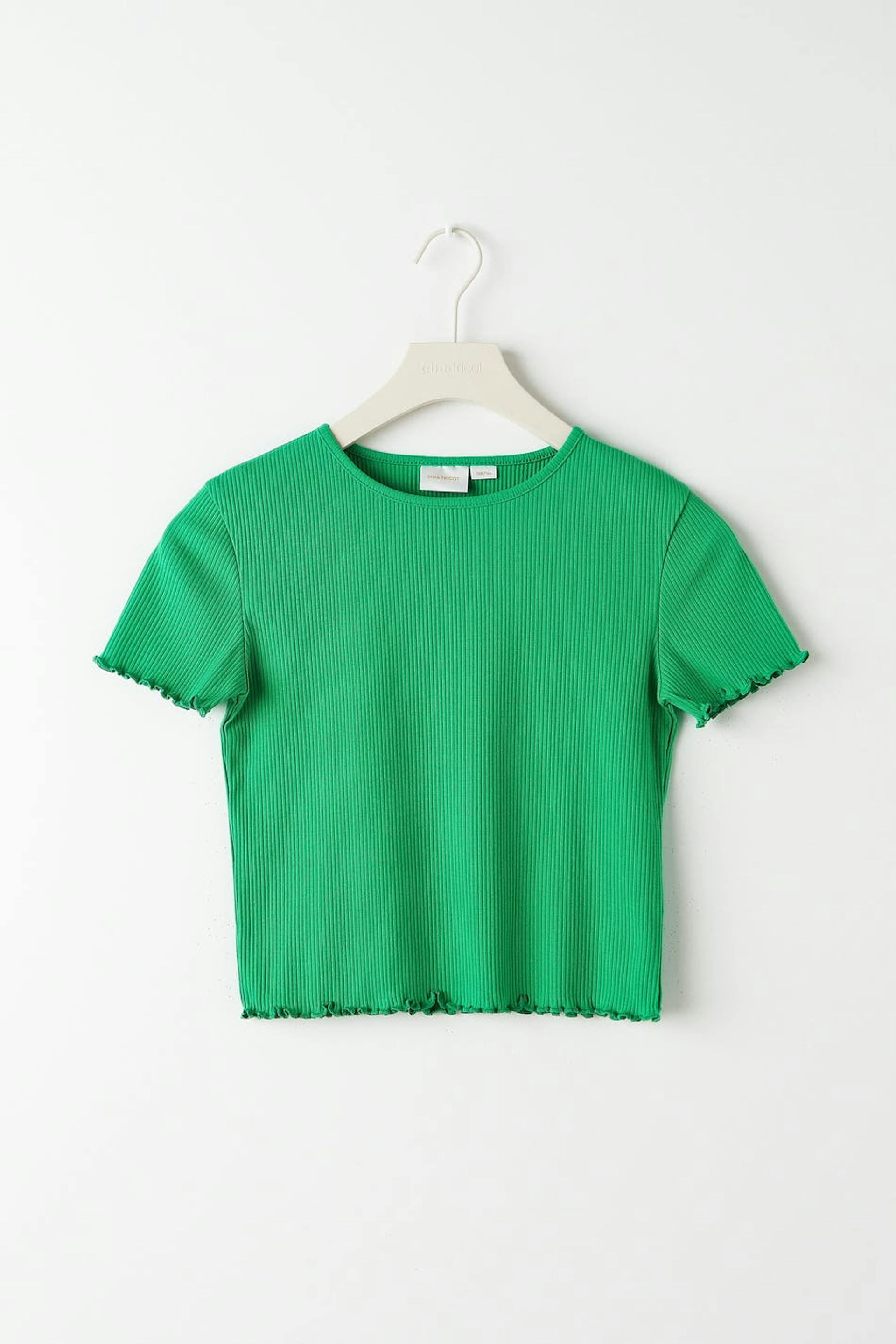 Ribbed t-shirt in jersey with a fitted fit. The t-shirt is green and has a rounded neckline. It has a cropped length and a curled hemline.