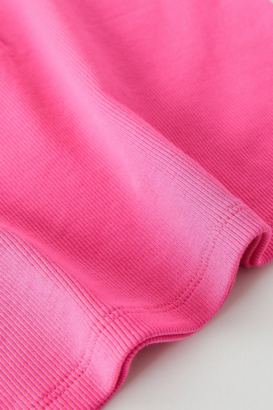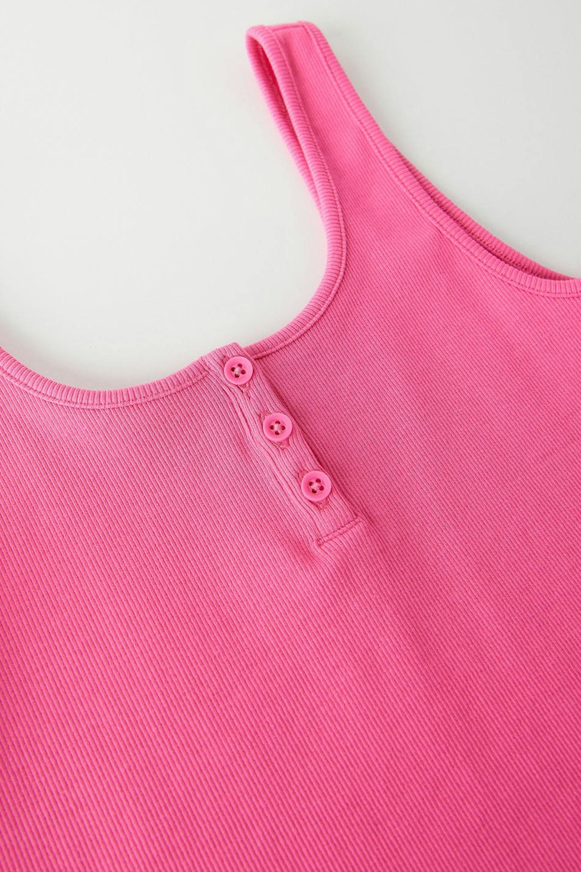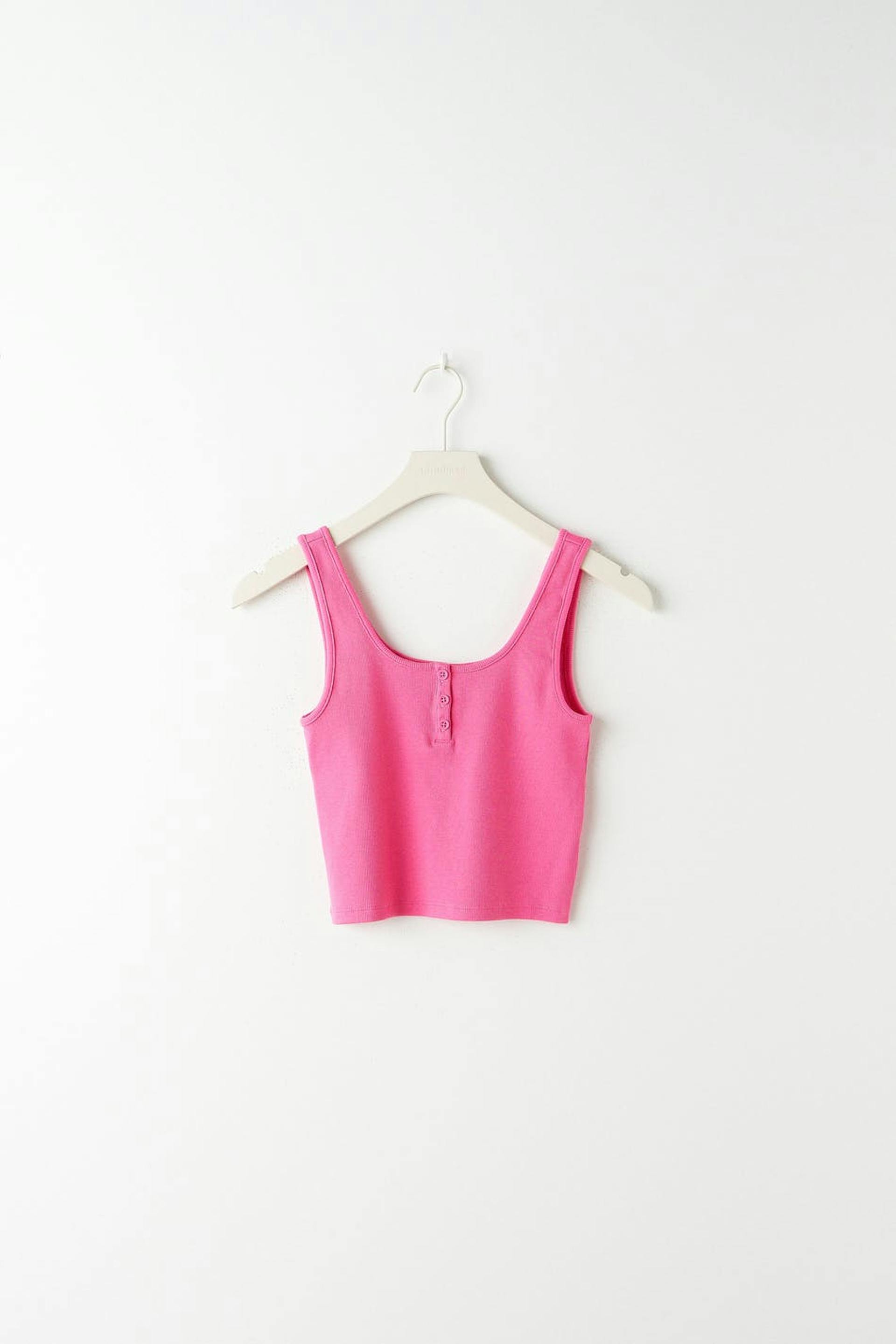 Ribbed tank by our Young assortment with a fitted fit. The tank is pink and has a soft quality in jersey. It has button placket at the top, a square neckline and a cropped length.