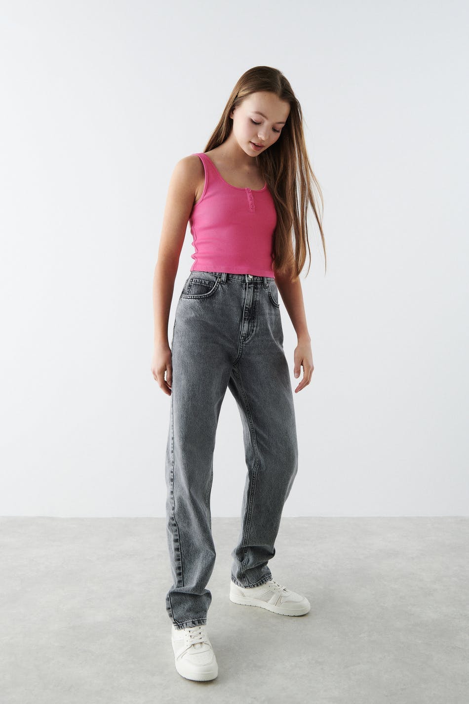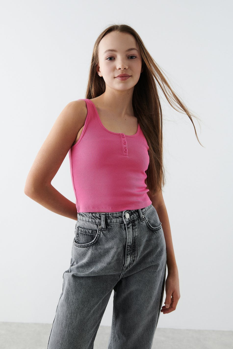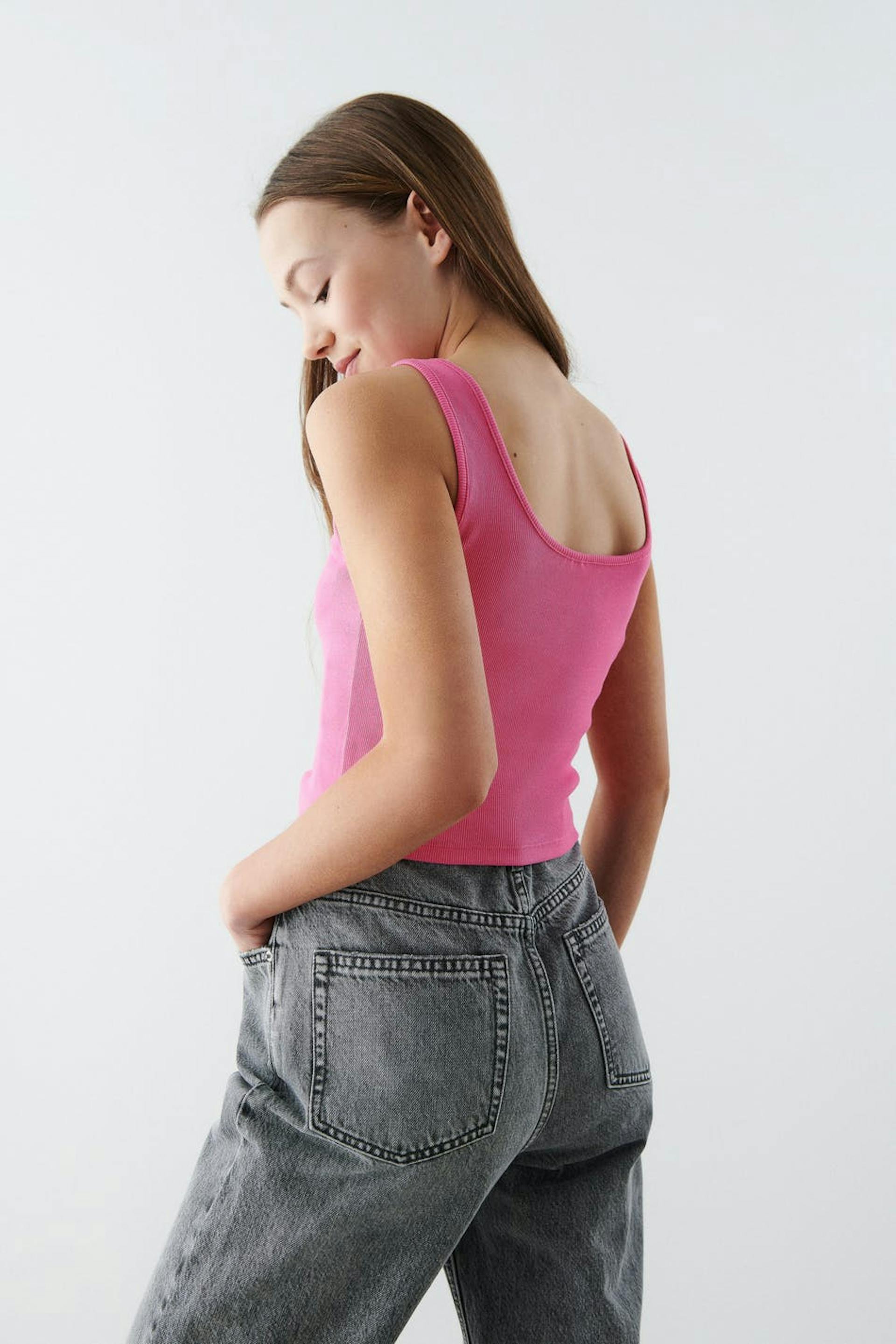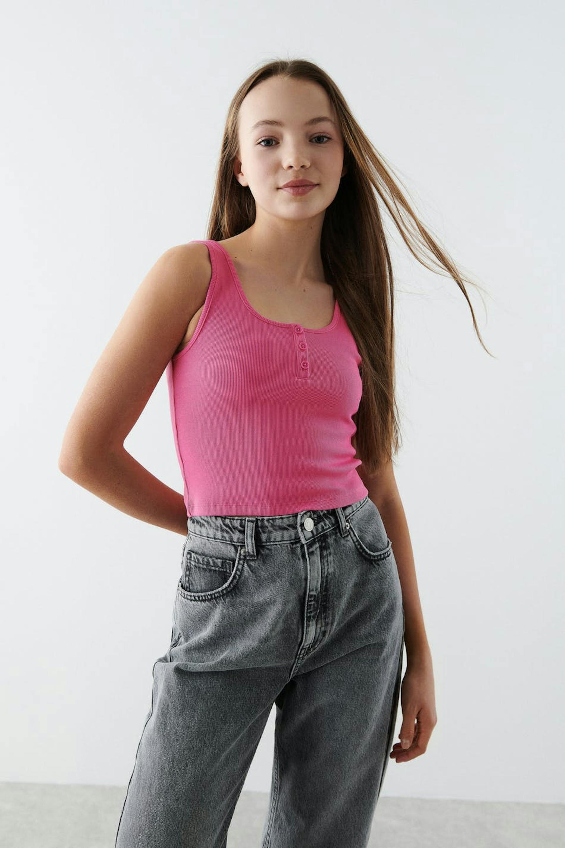 Ribbed tank by our Young assortment with a fitted fit. The tank is pink and has a soft quality in jersey. It has button placket at the top, a square neckline and a cropped length.