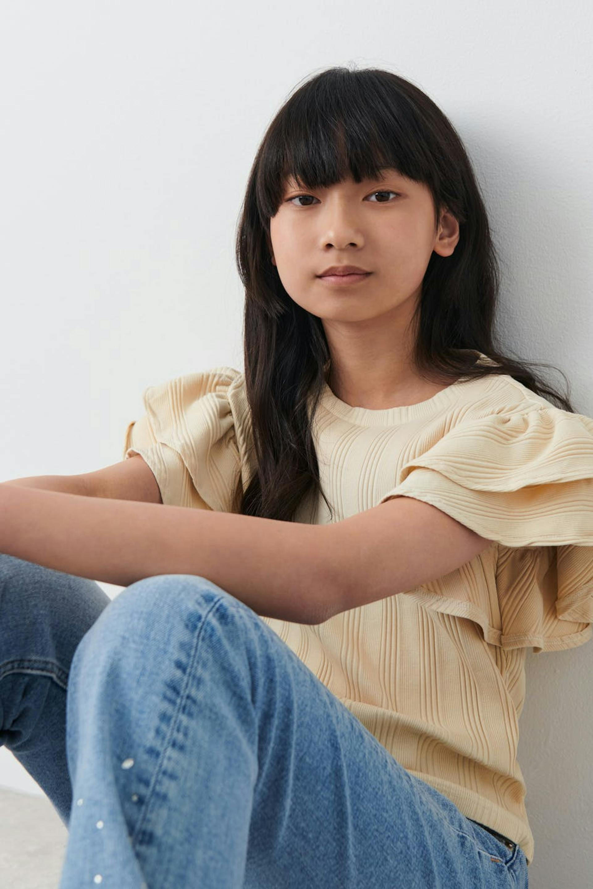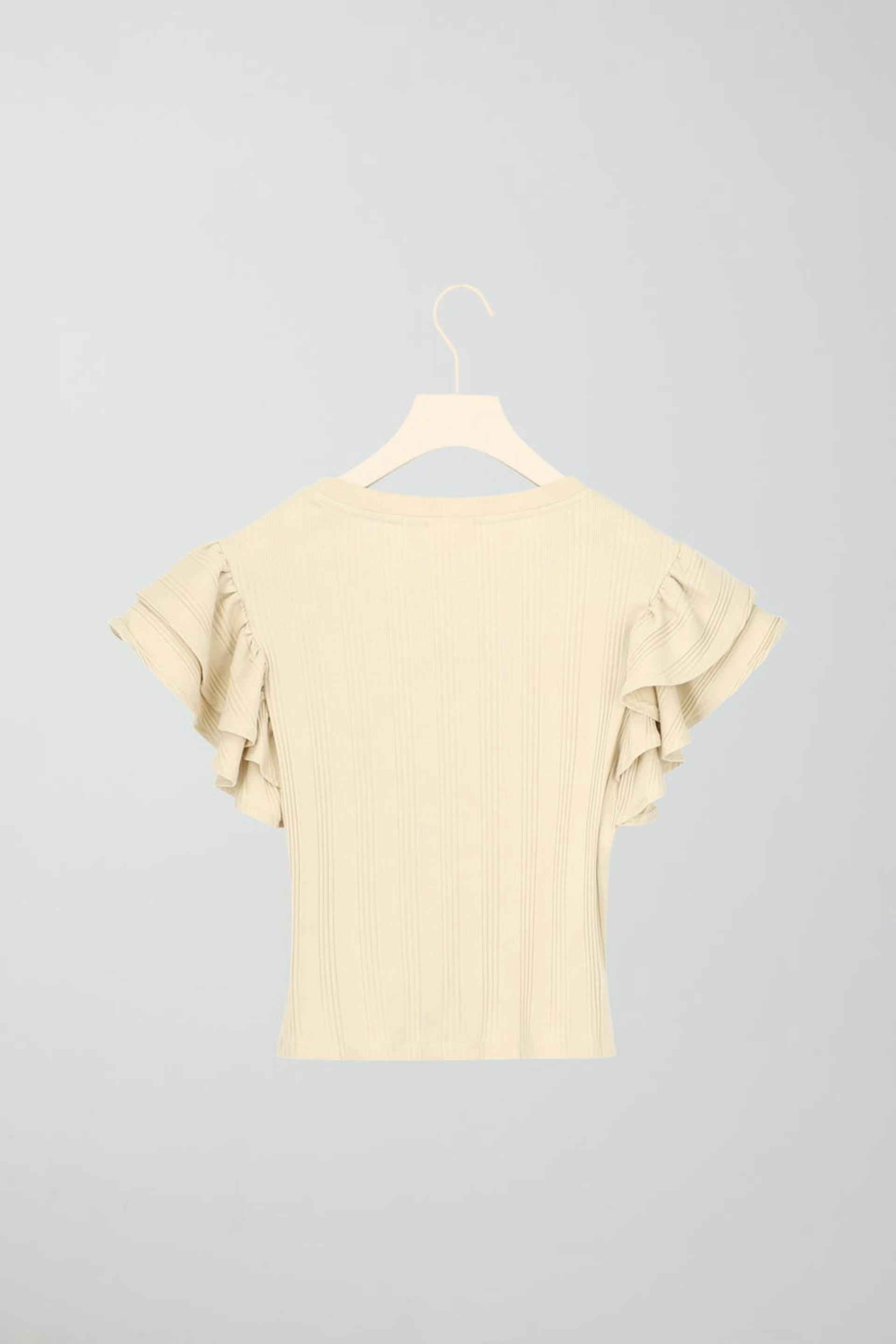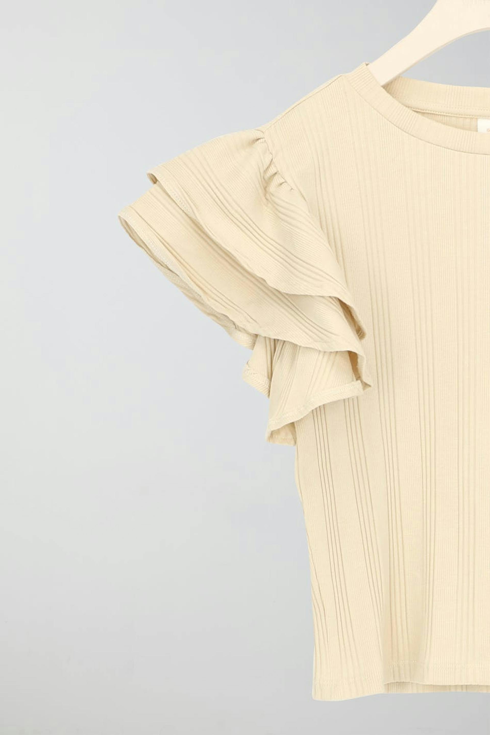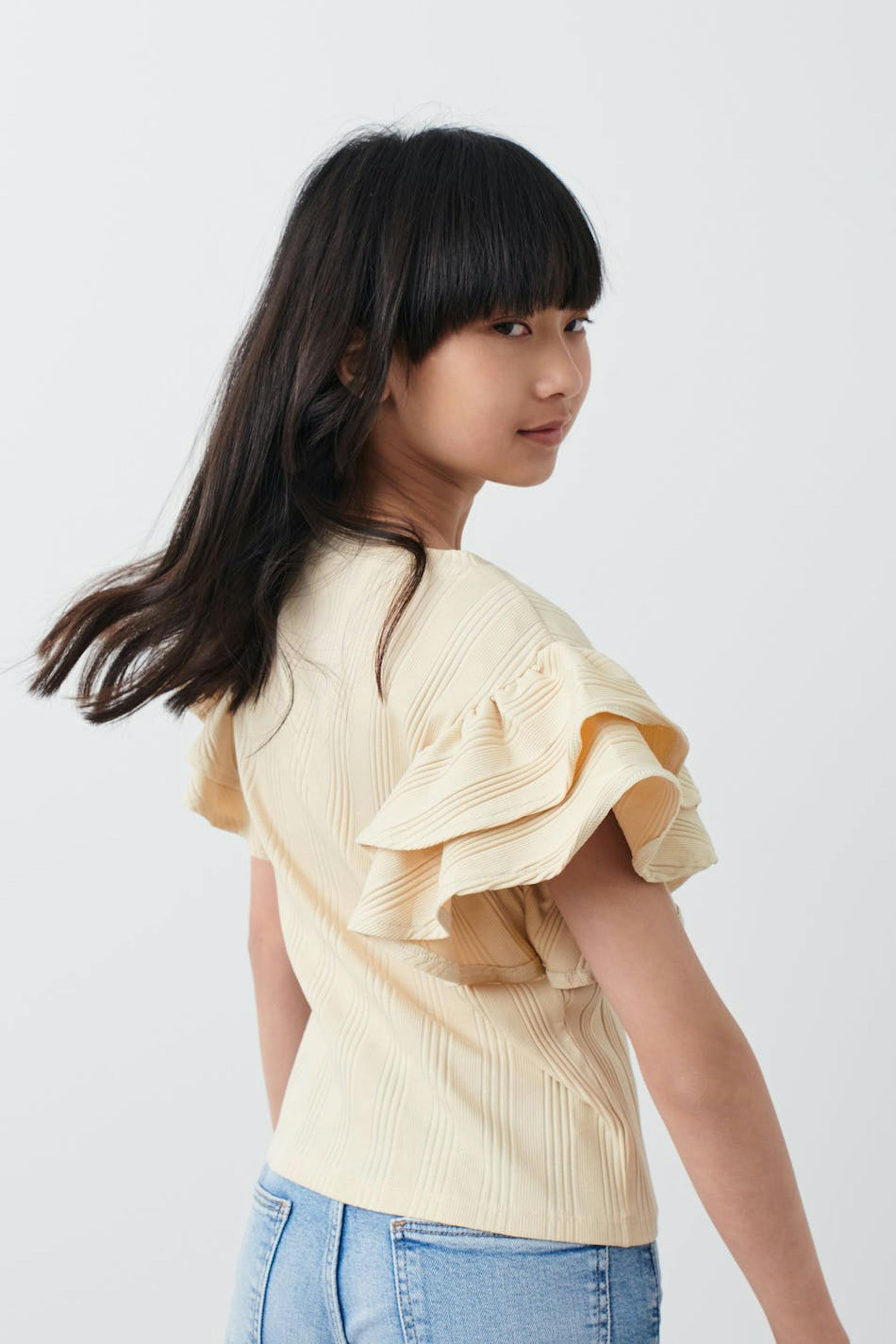 Top in jersey with frills. The top is beige and has ribbed quality.