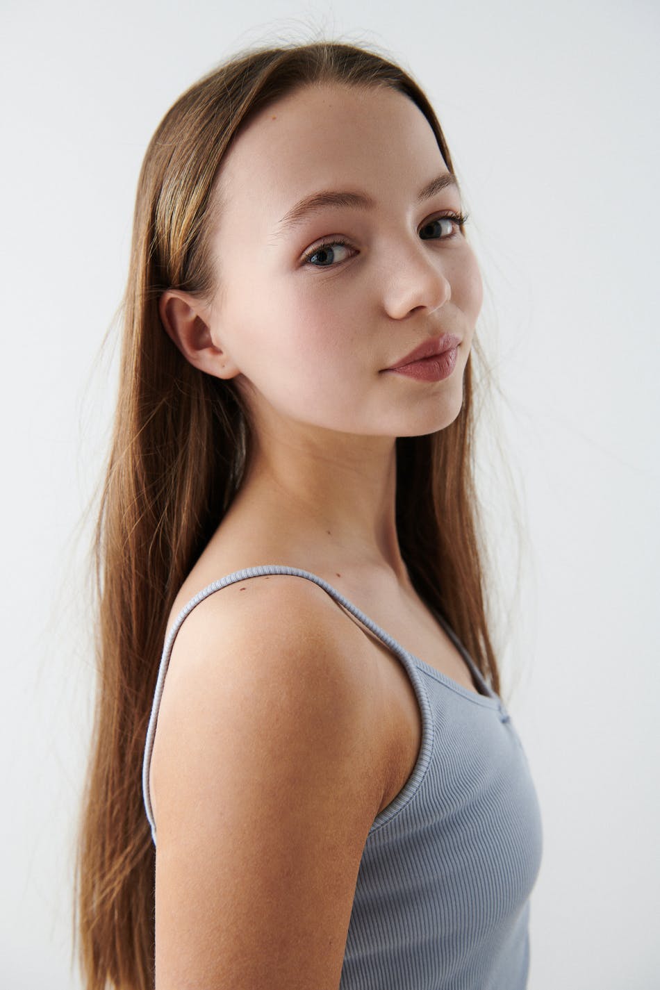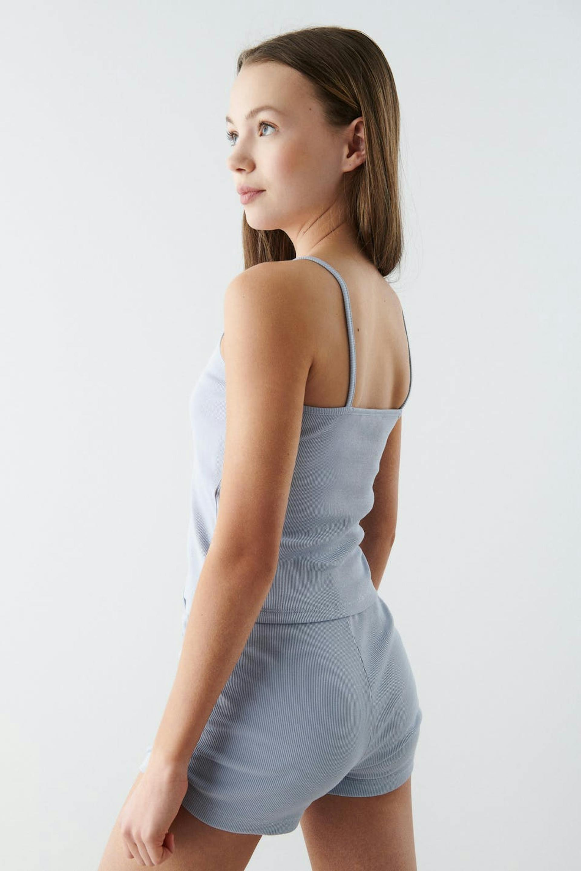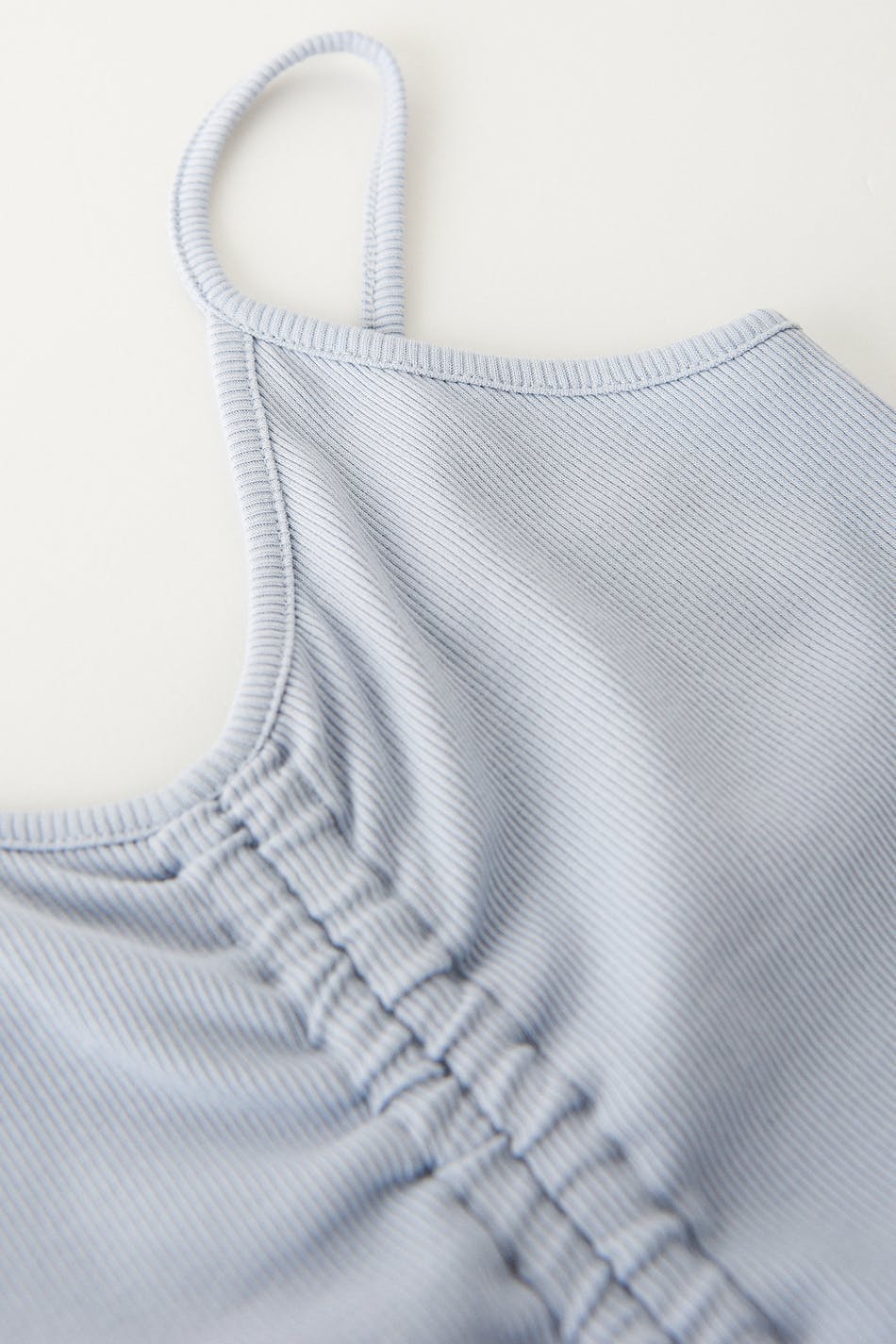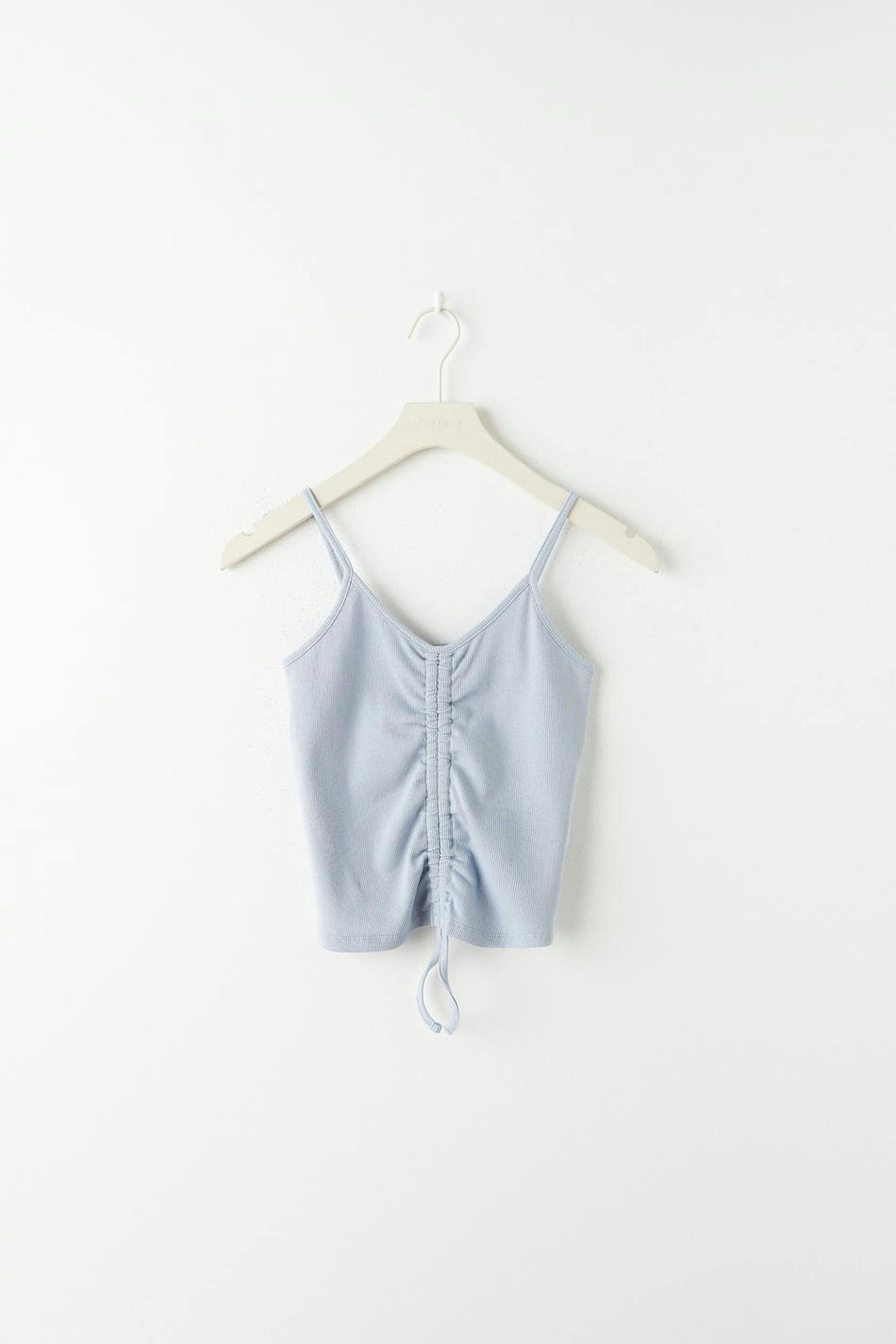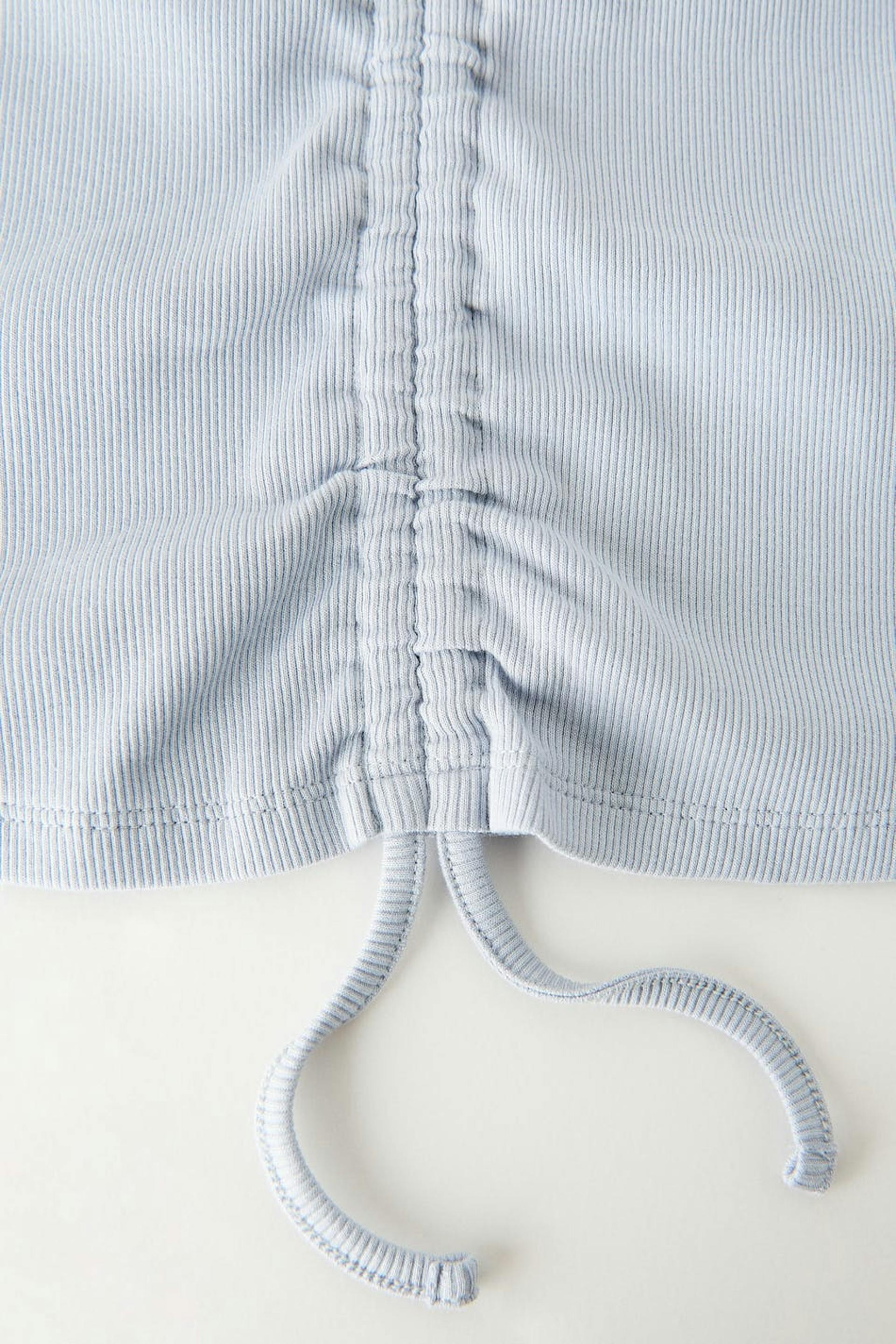 Ribbed top by our Young assortment in stretch jersey with a fake drawstring. The top is blue and has narrow shoulder straps.
