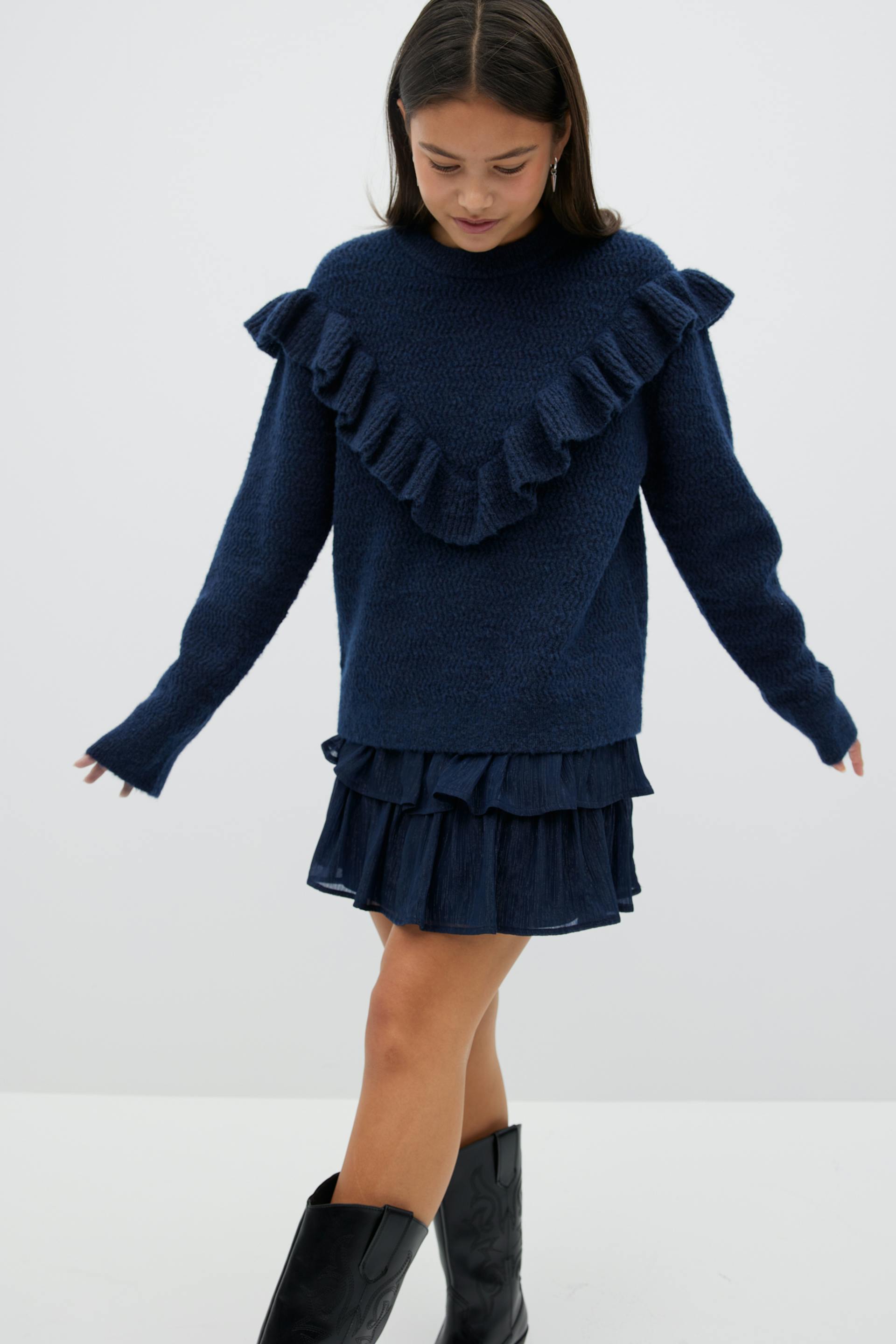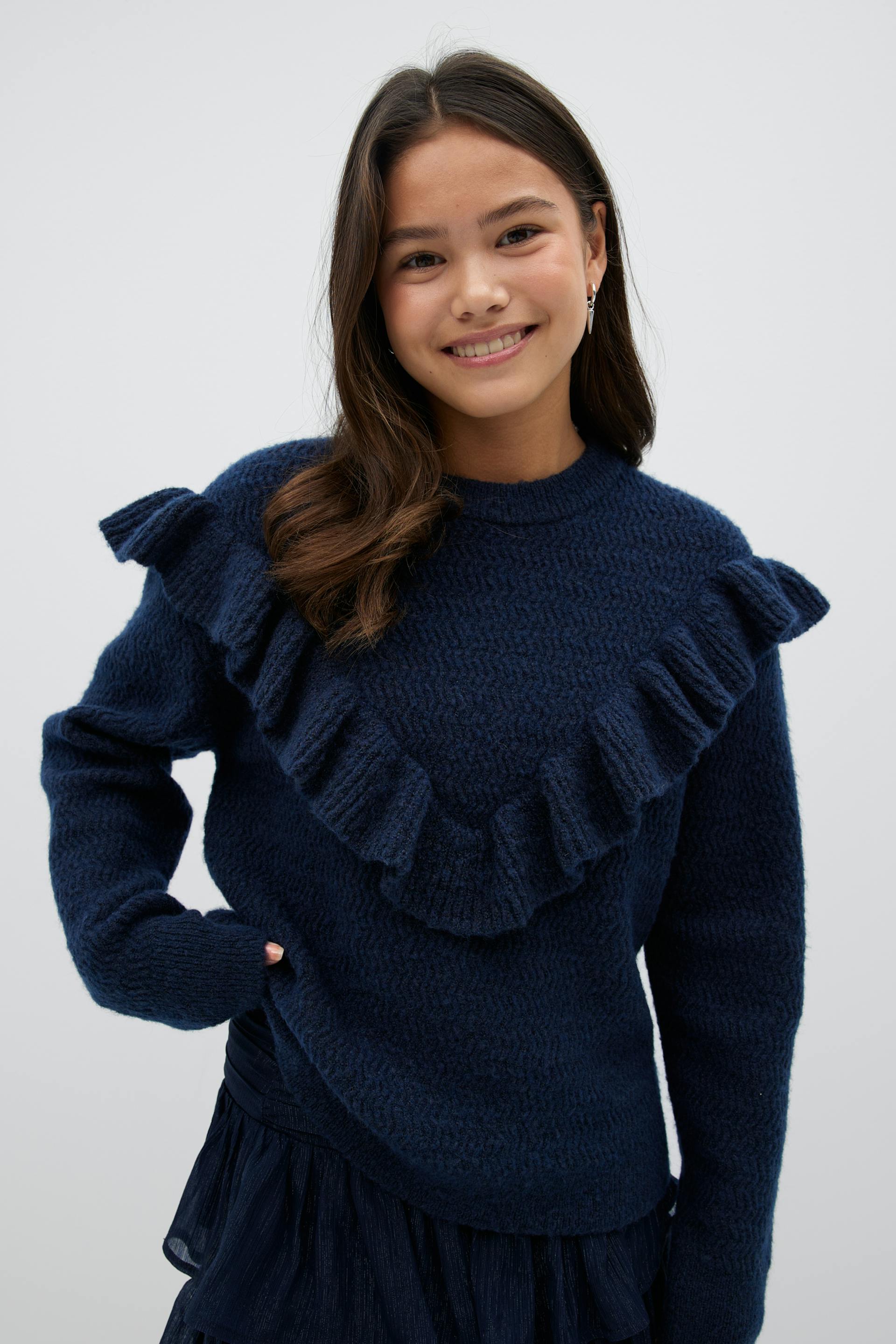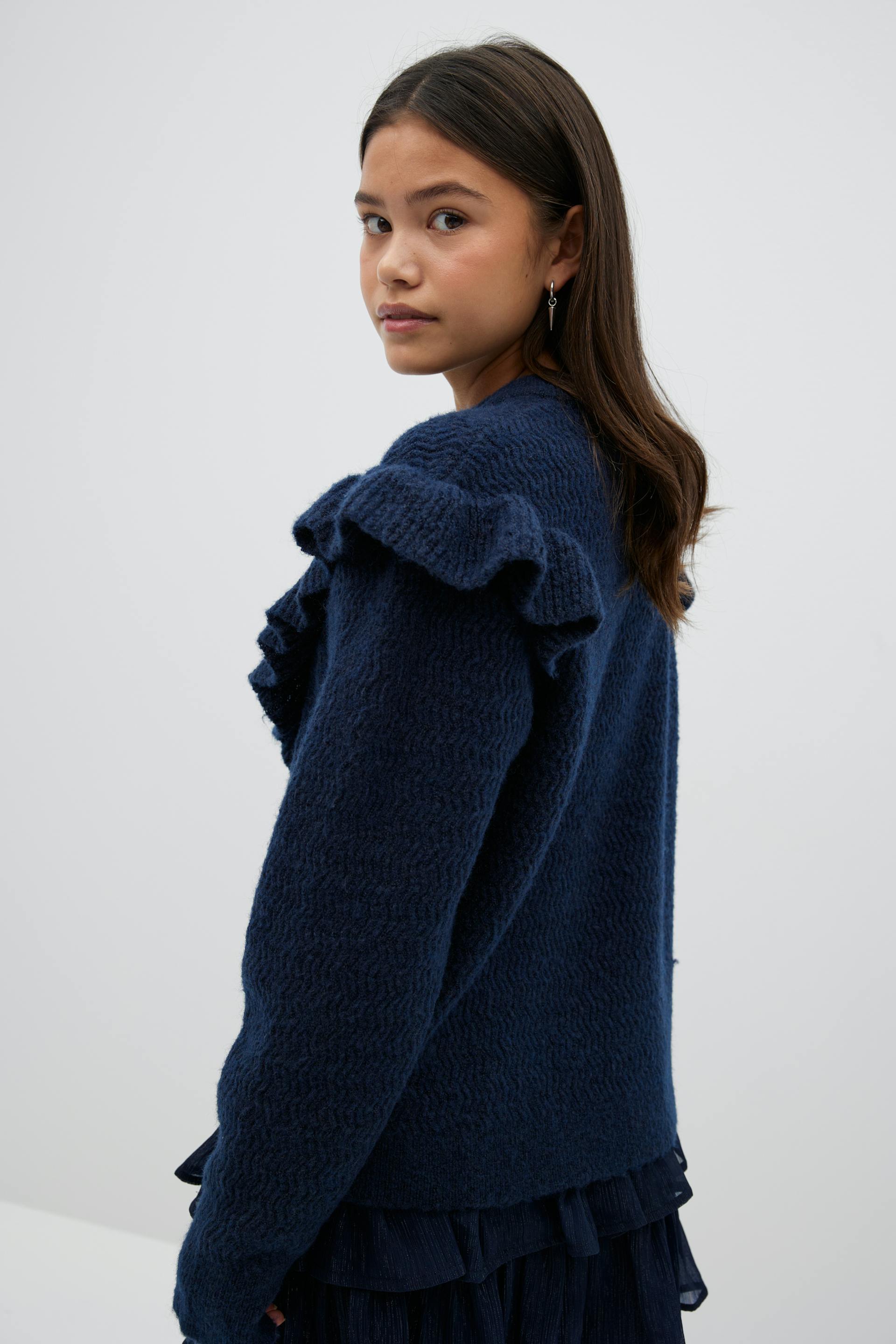 Knitted sweater with frill details at the front and around the shoulders. The sweat is navy and has oversize fit. It has round neckline and long sleeve.