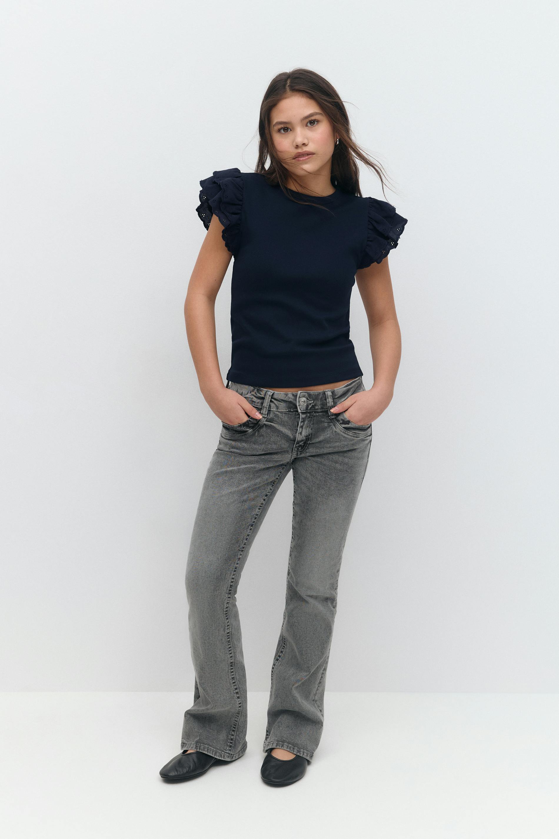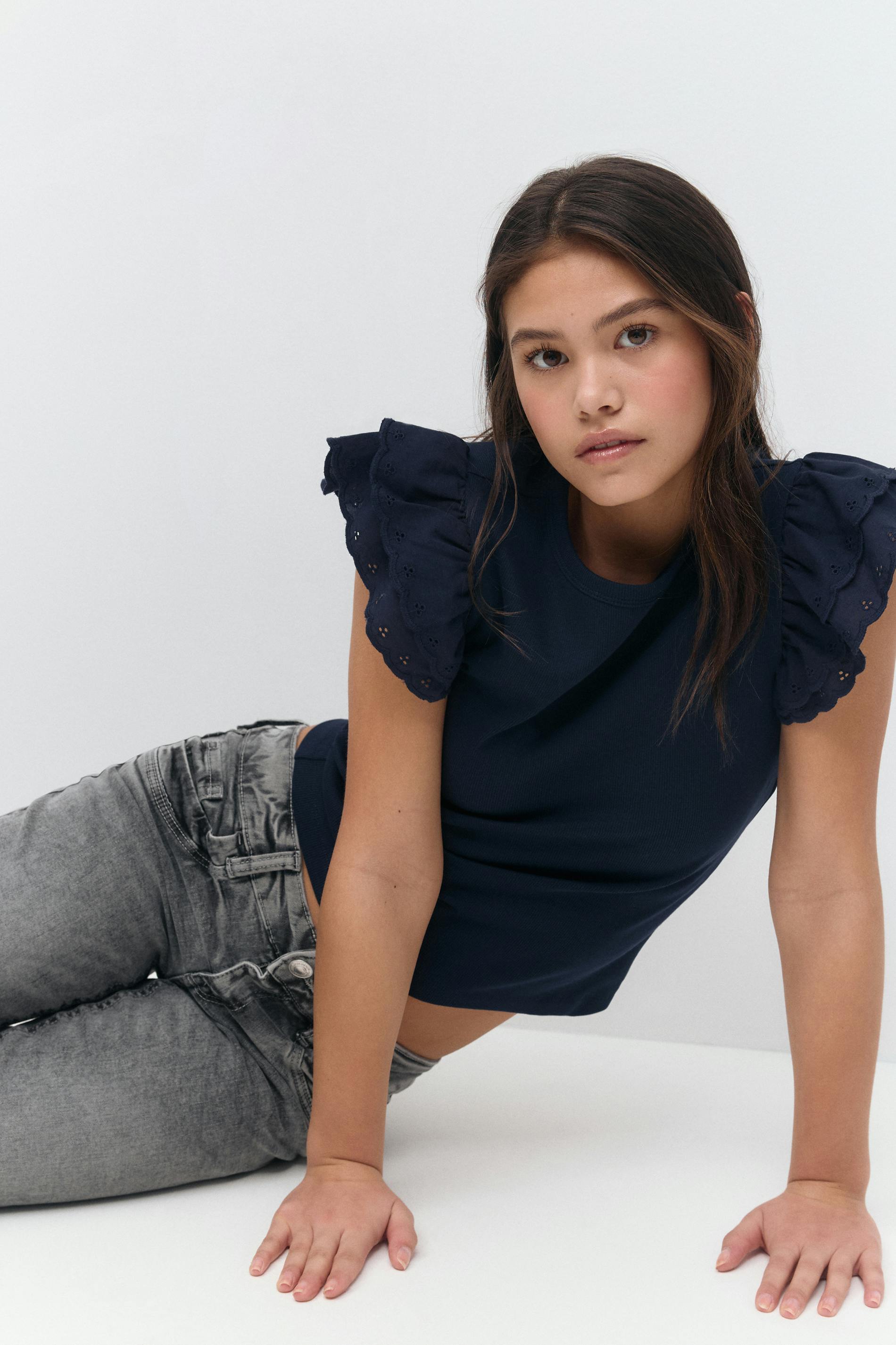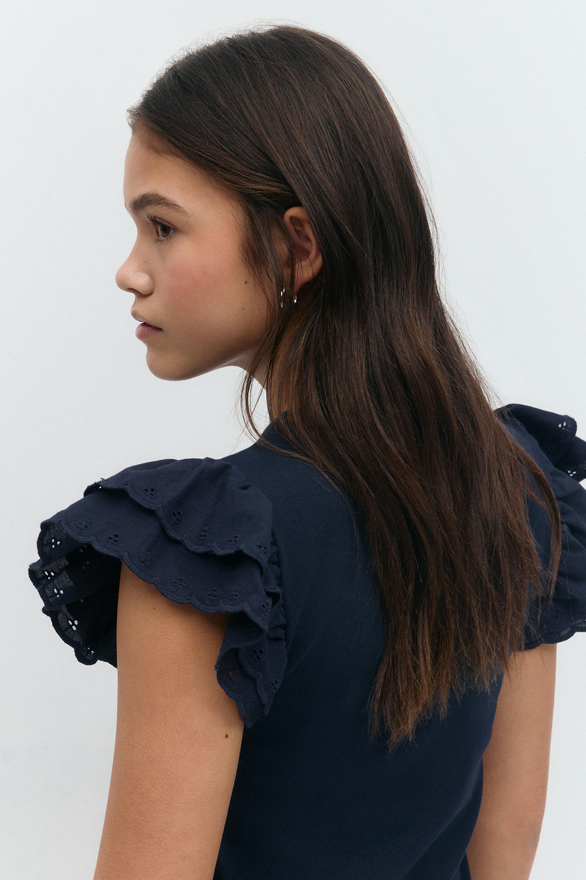 Singlet with an embroidered frill around the shoulders. The singlet is dark blue and has a normal fit. It has a round neckline and a rib knit.