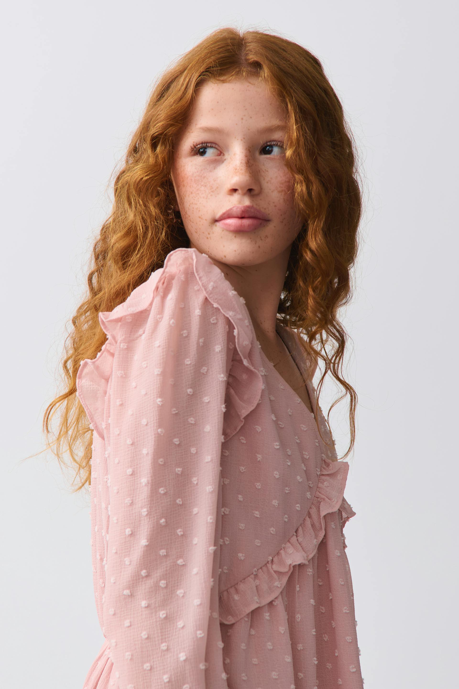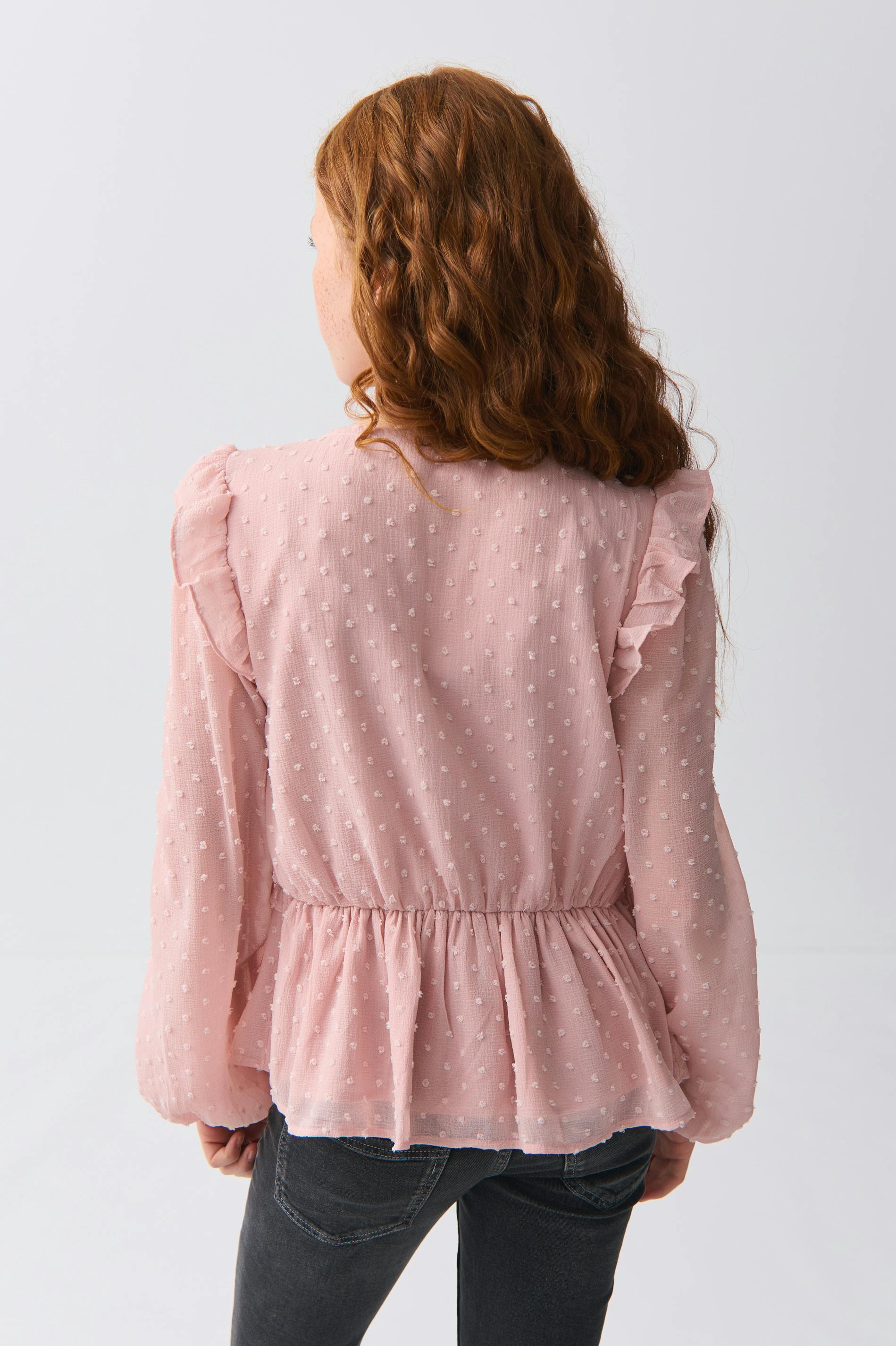 Dotted blouse with frill details at the front and around the shoulders. The blouse is pink, lined and long-sleeved and has v-neck. It has elasticized cuffs.