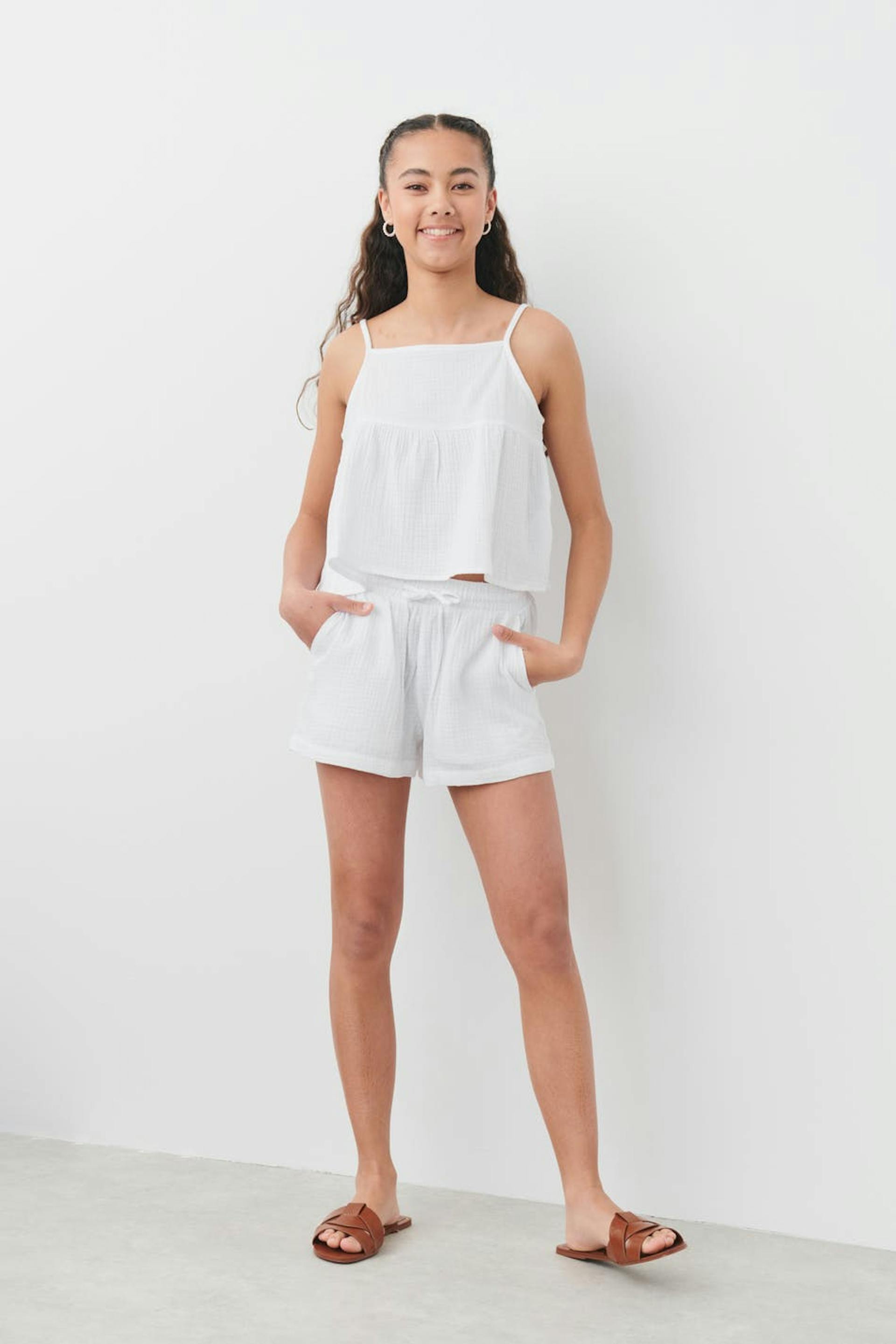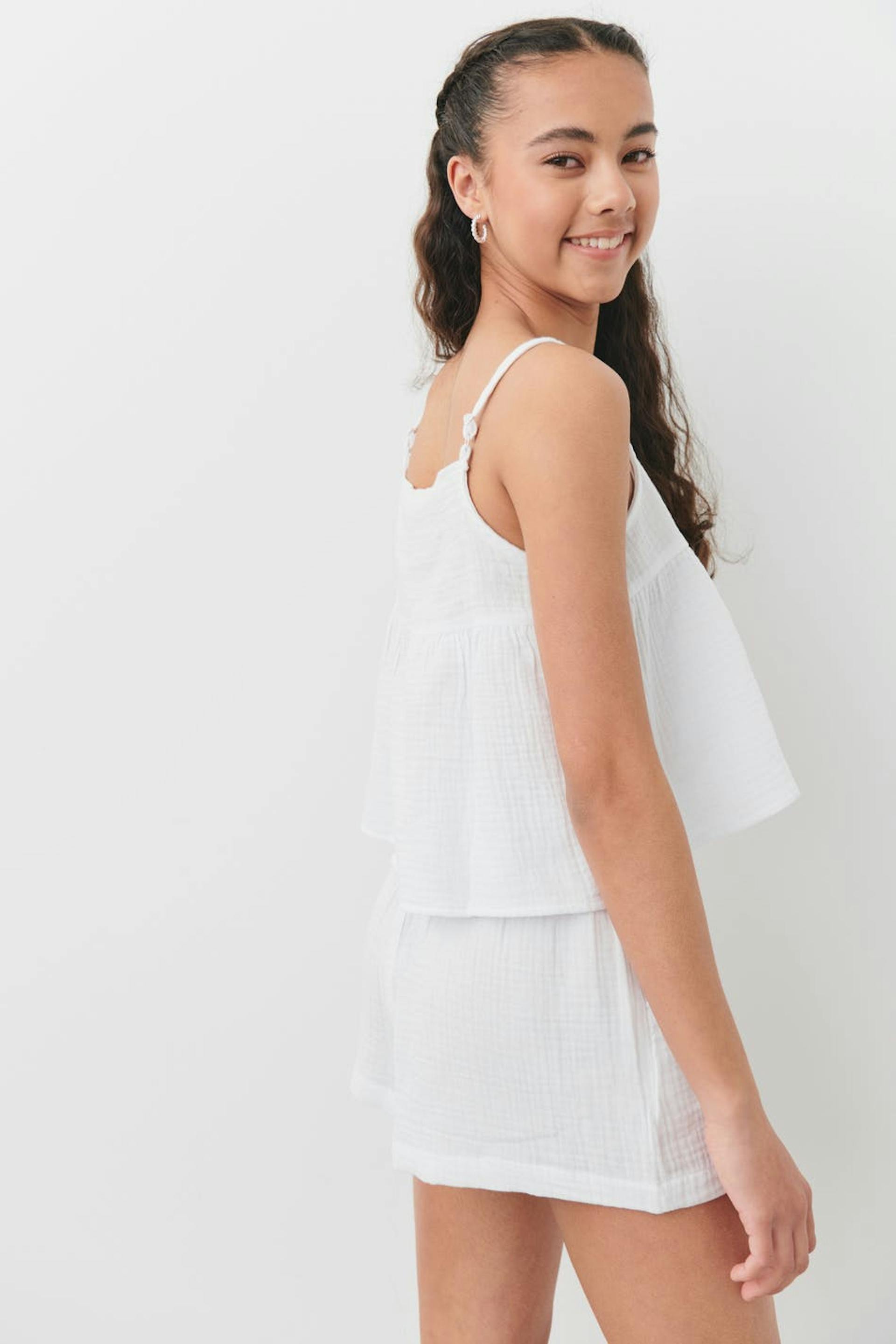 Singlet by Gina Tricot Young with structured, soft double-weave cotton quality. The singlet is white and has thin, adjustable shoulder straps. It has a loose-fitting style with gathering at the front and back.