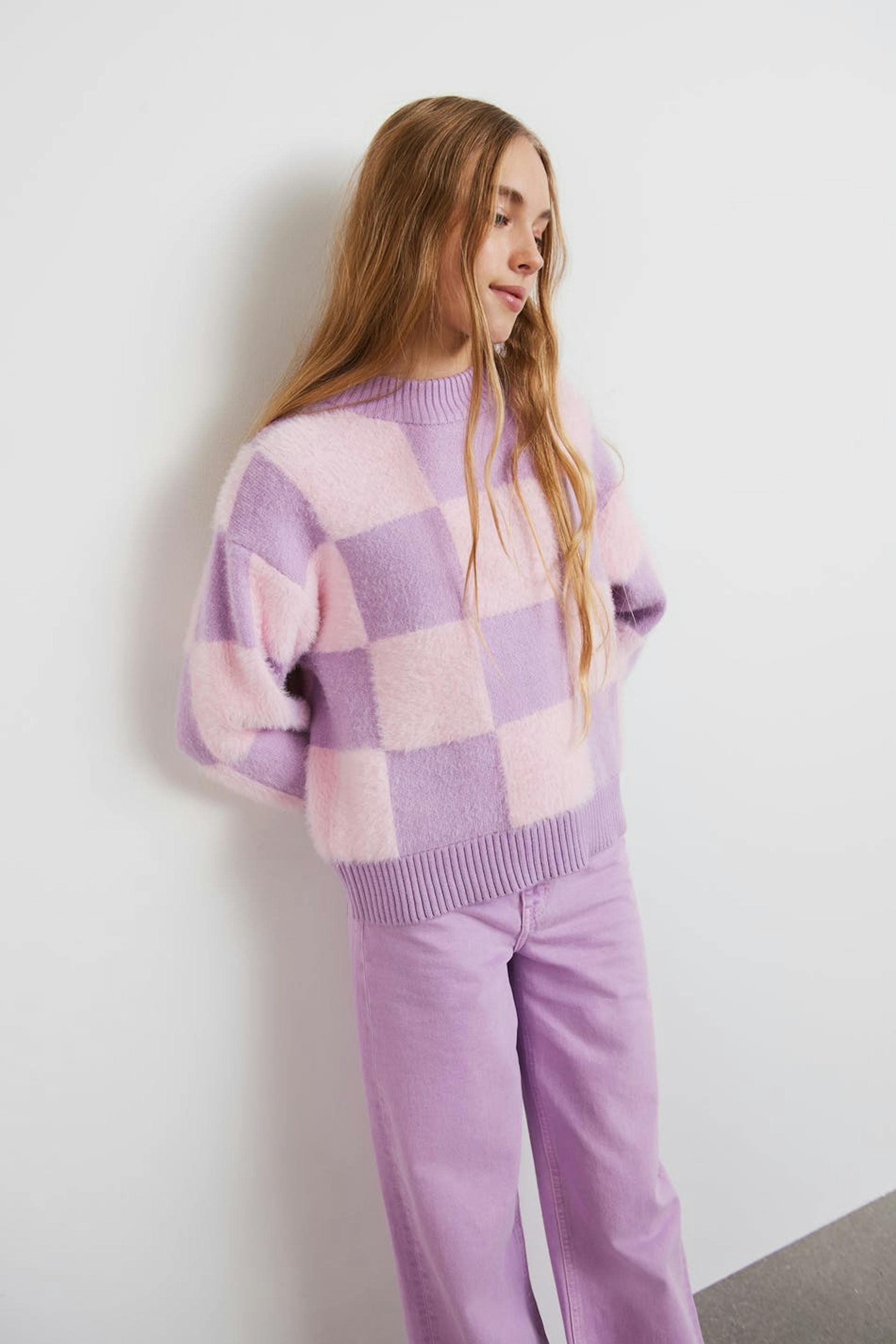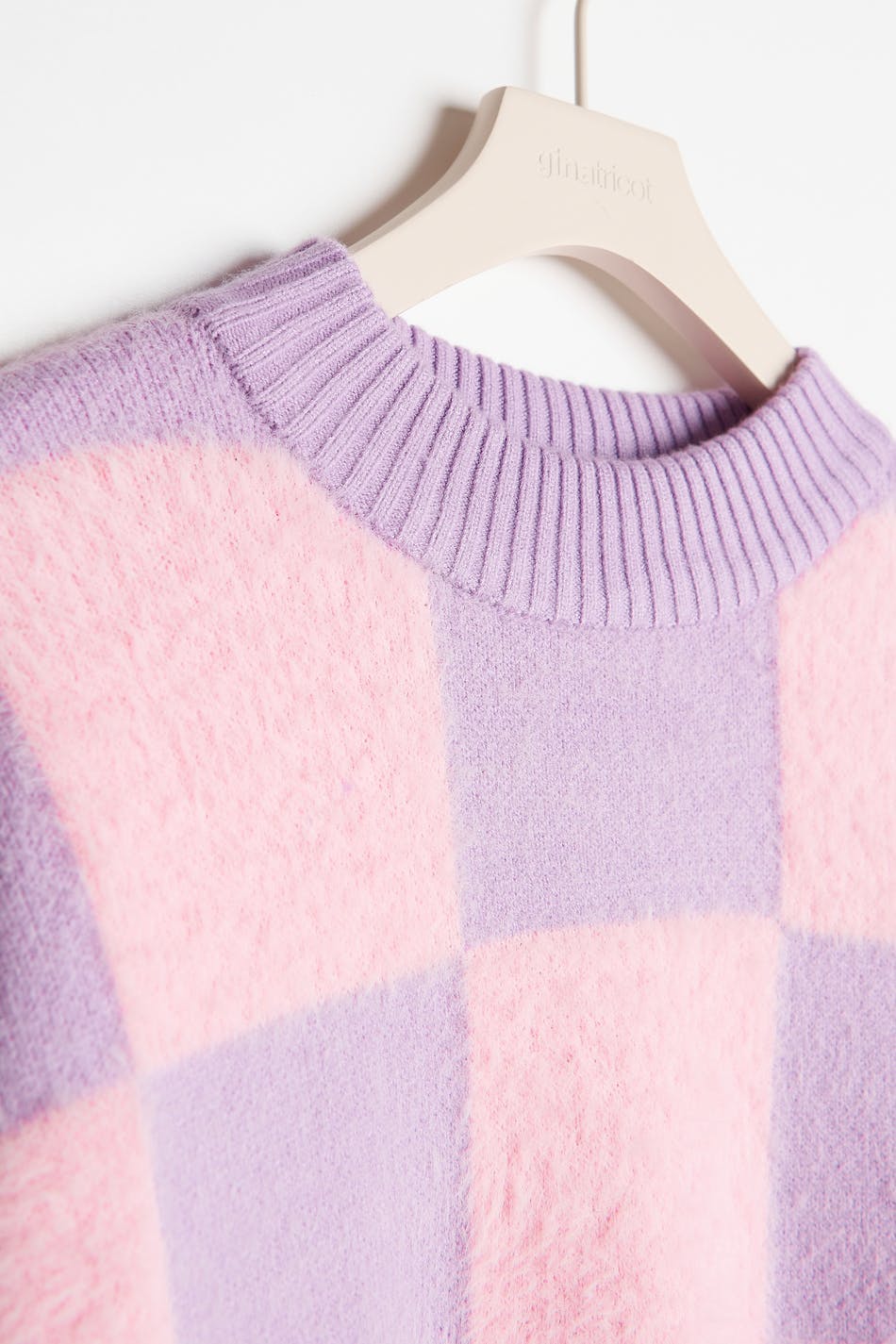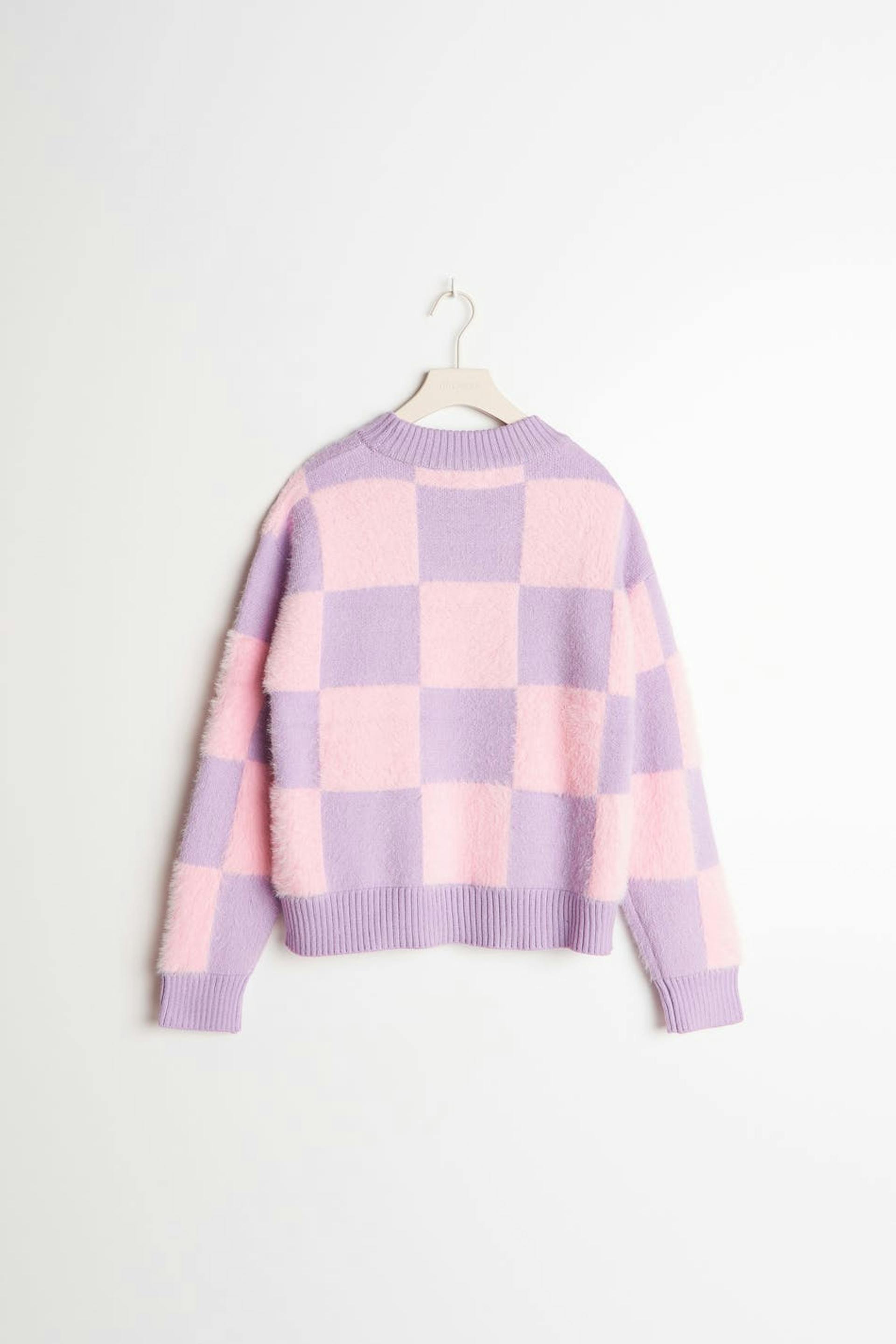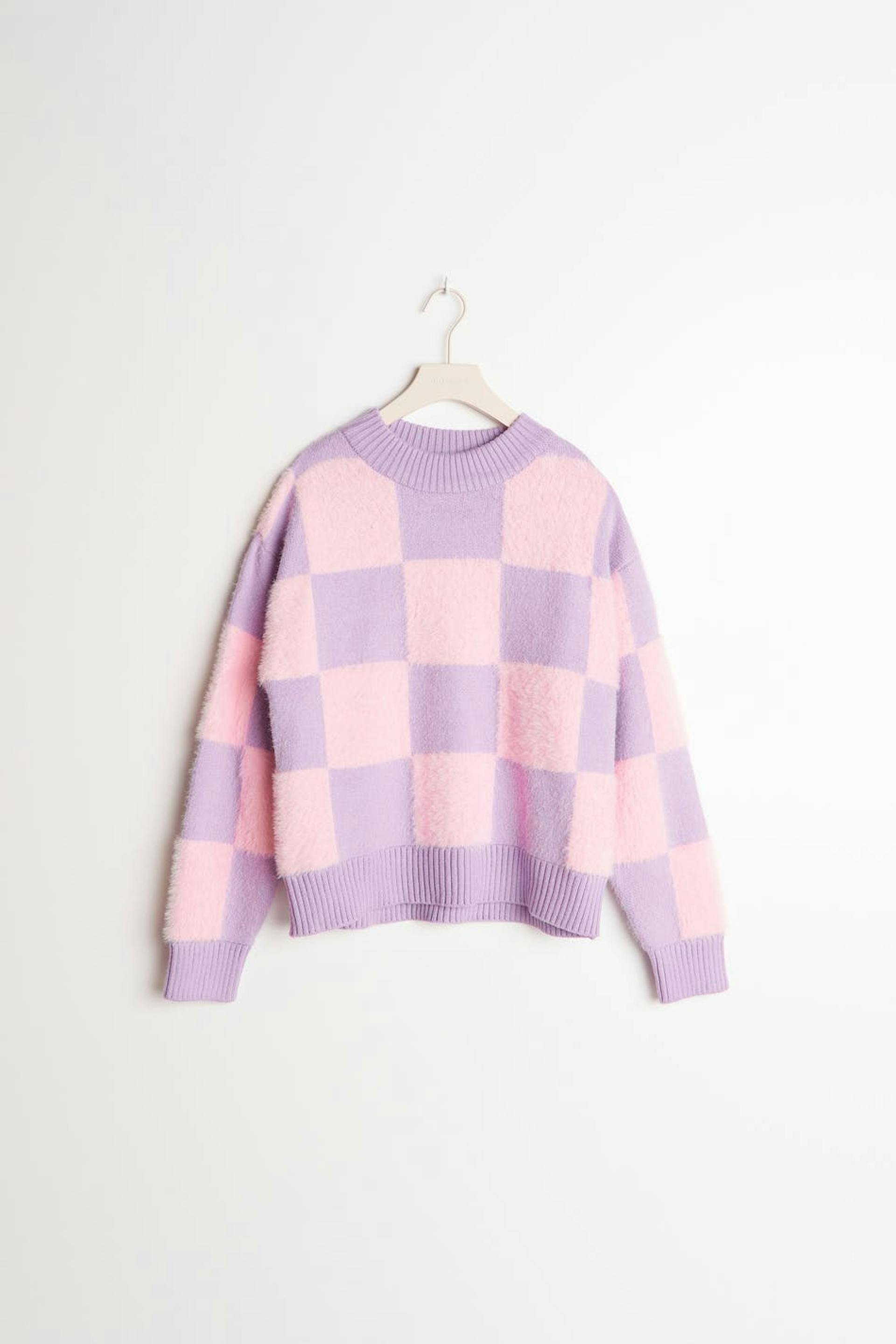 Checked knitted sweater by our Young assortment with an oversize fit. The sweat is pink and has a soft, fluffy material. It has long sleeves, high neckline and ribbed hem.