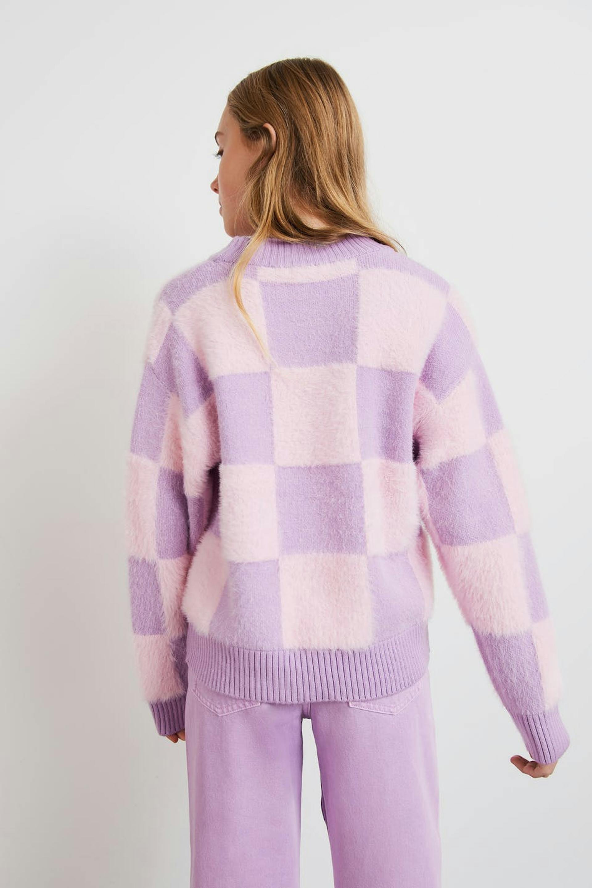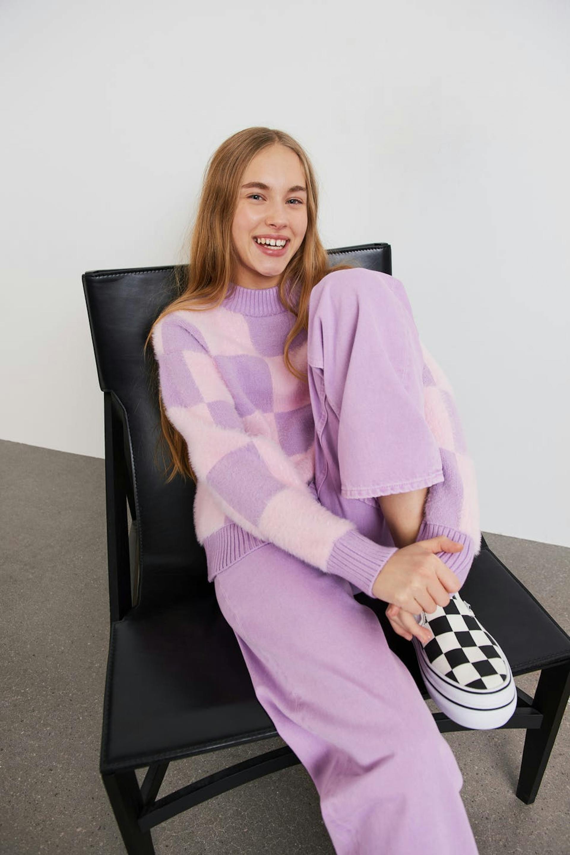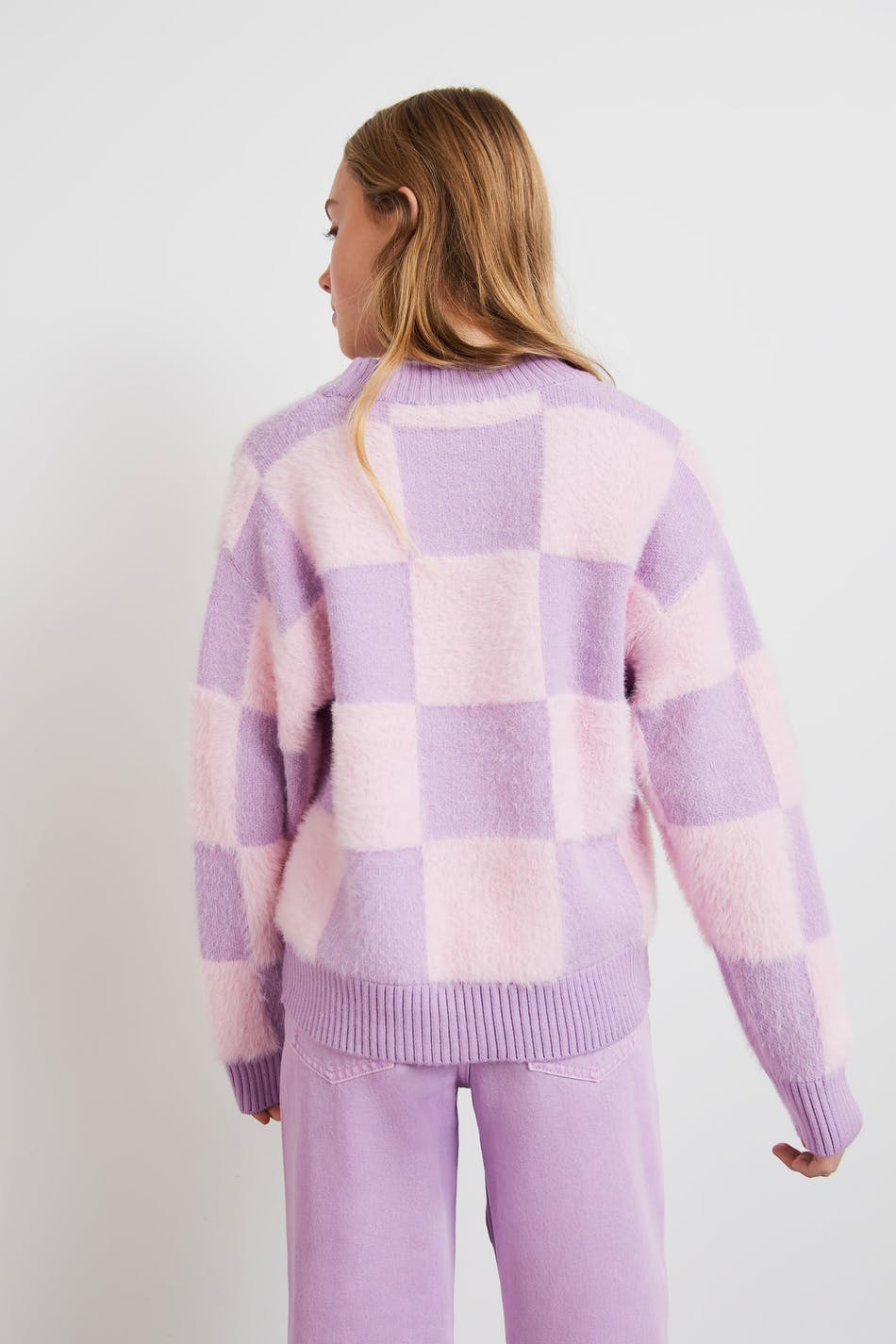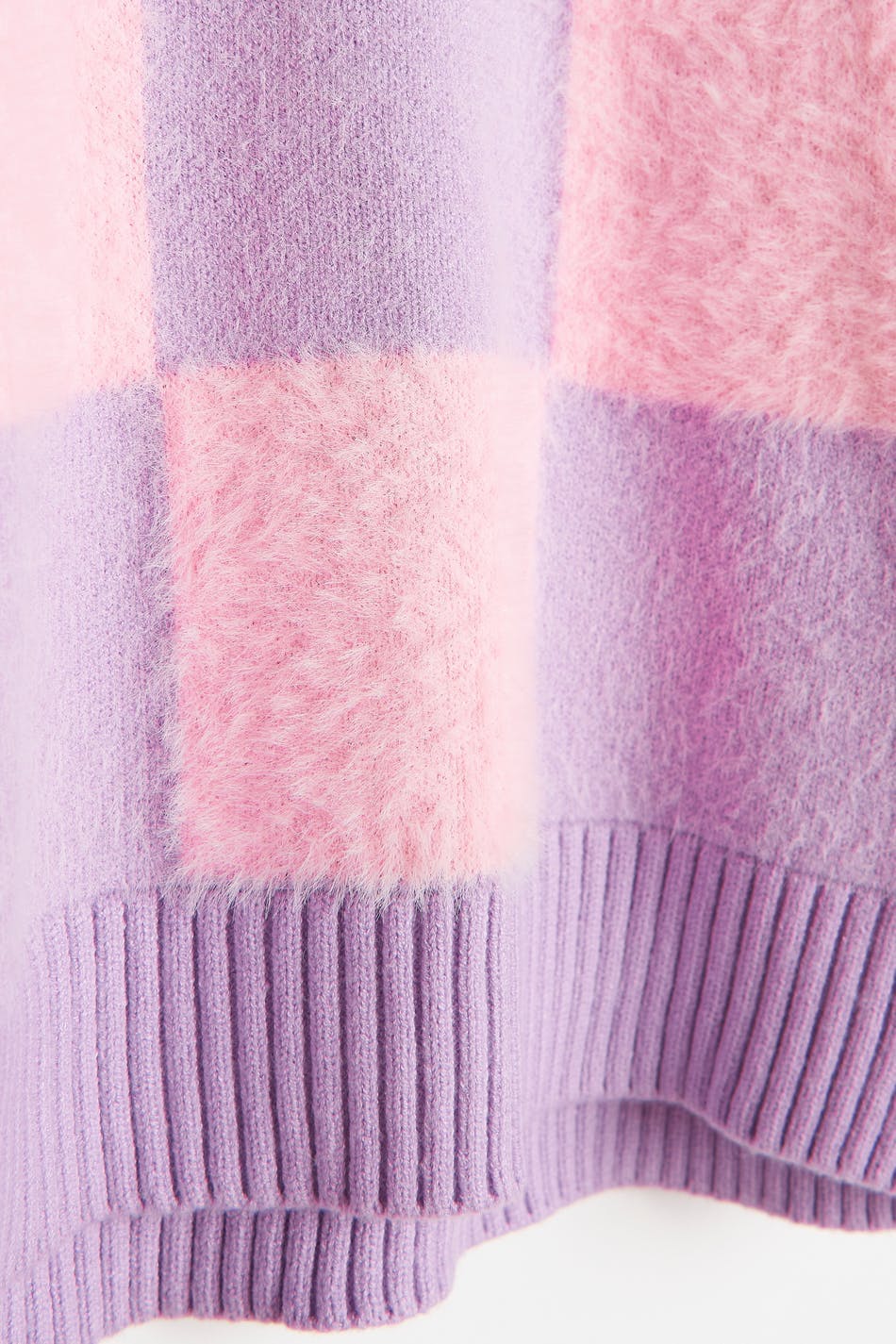 Checked knitted sweater by our Young assortment with an oversize fit. The sweat is pink and has a soft, fluffy material. It has long sleeves, high neckline and ribbed hem.
