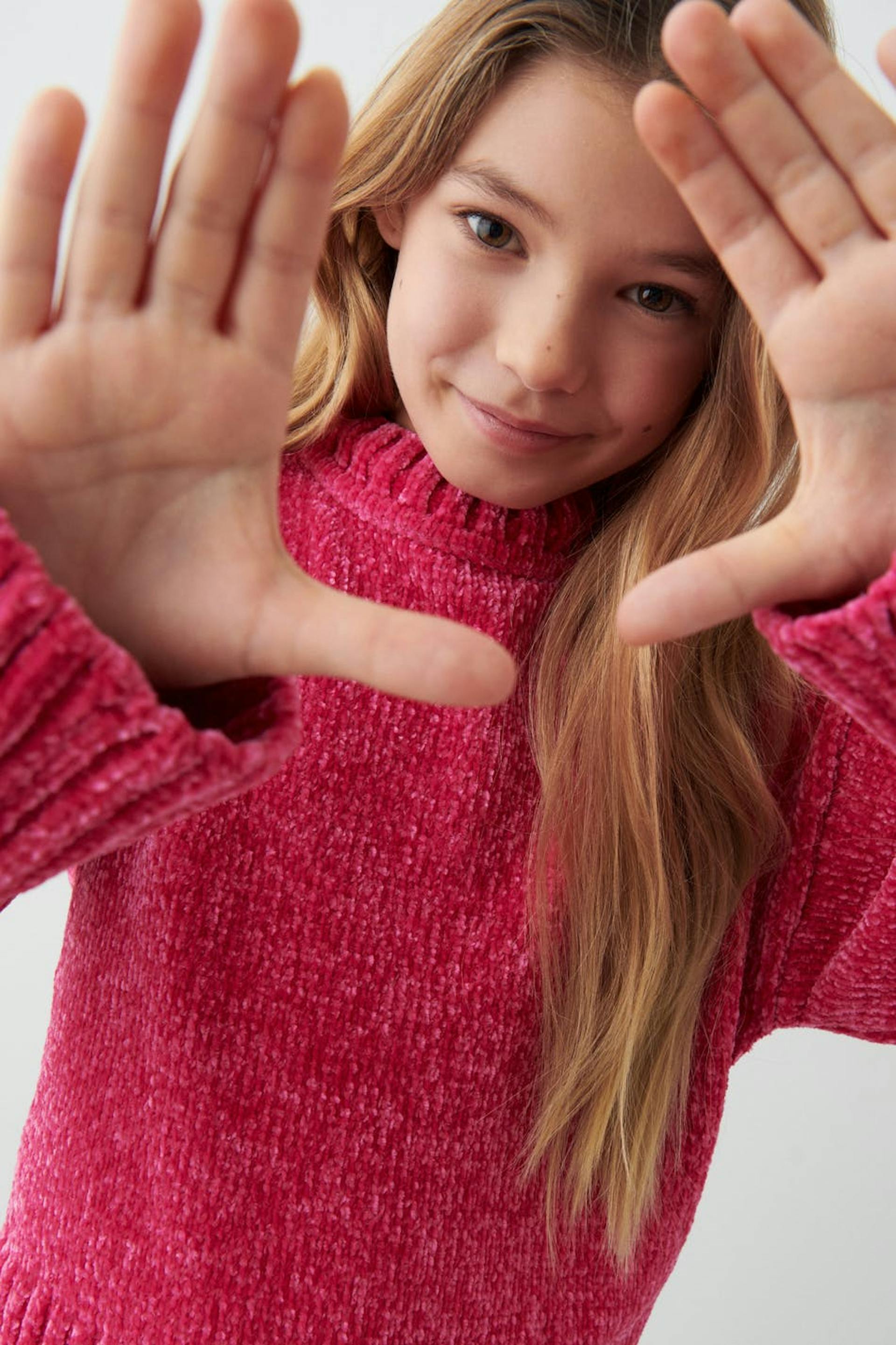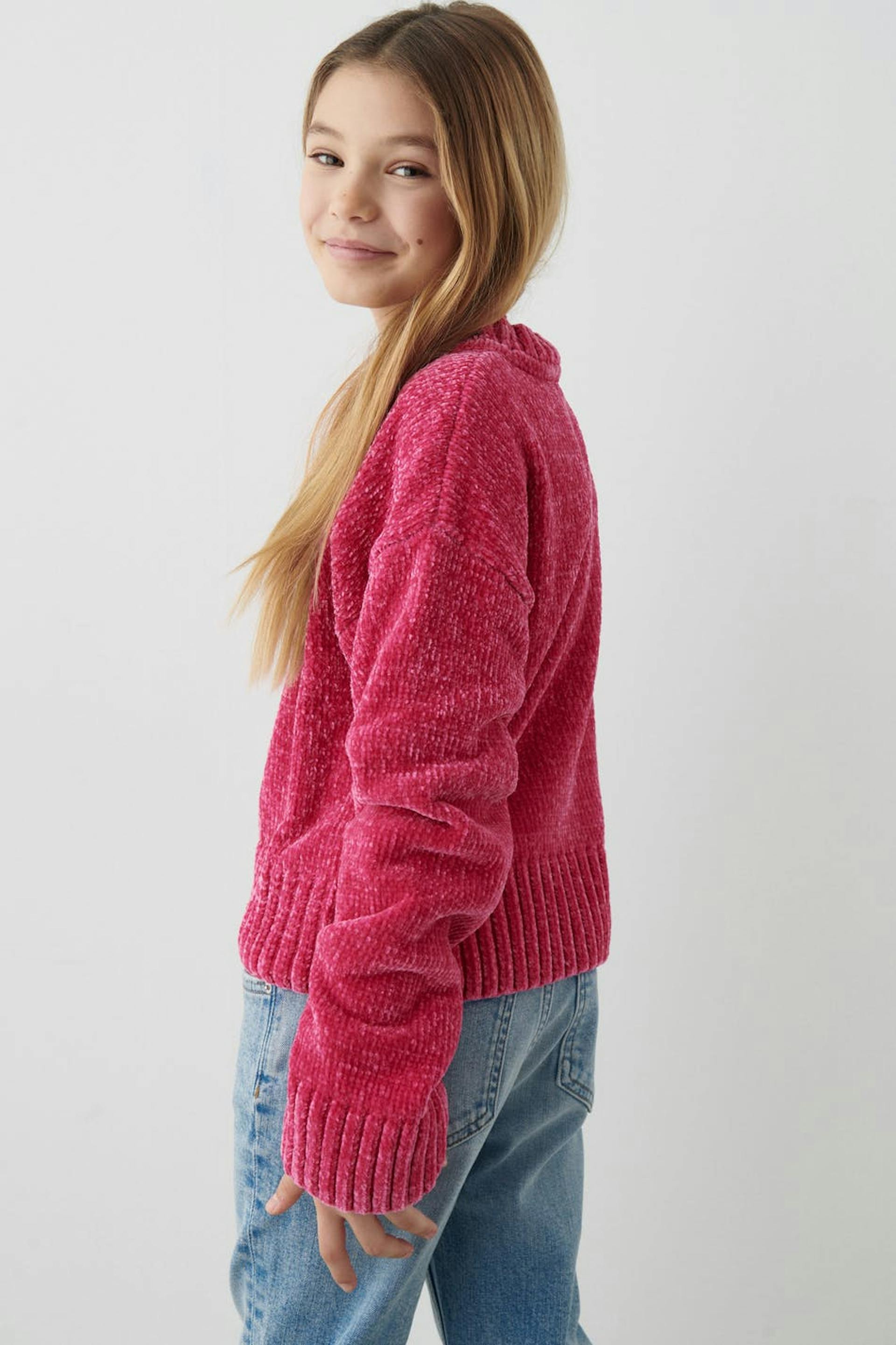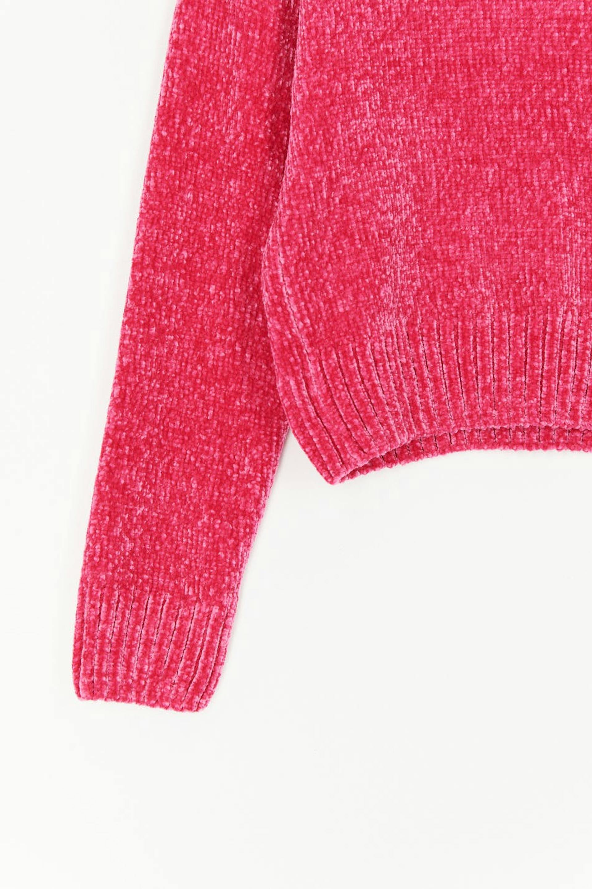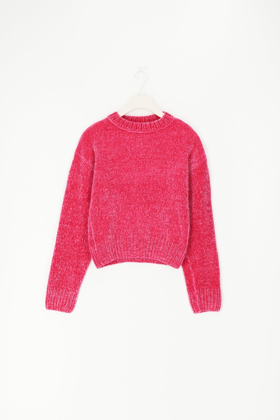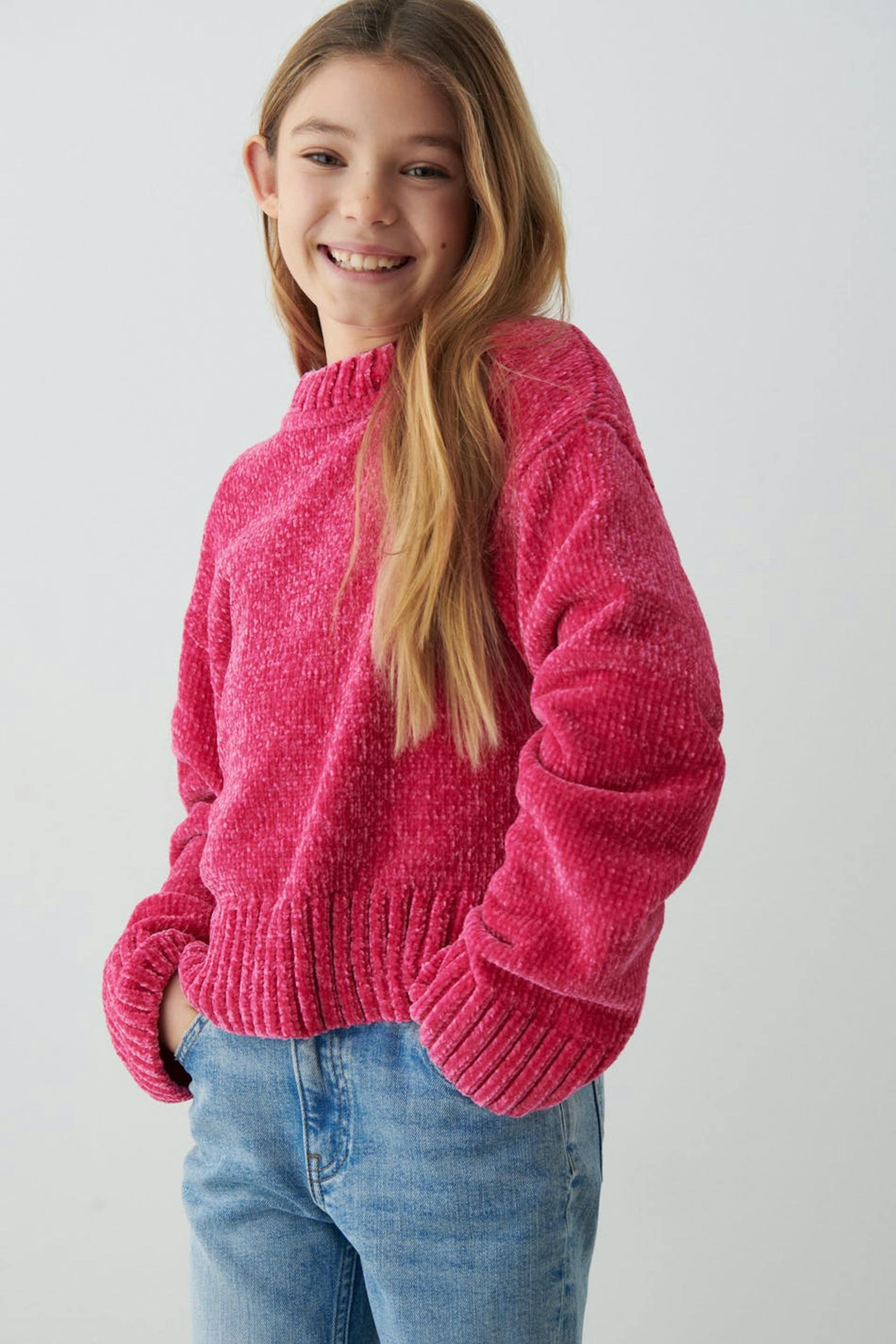 Knitted sweater by our Young assortment with boxy fit. The sweat is pink and has a soft quality in chenille. It has round neckline and rib knit at the bottom and on the sleeve ends.