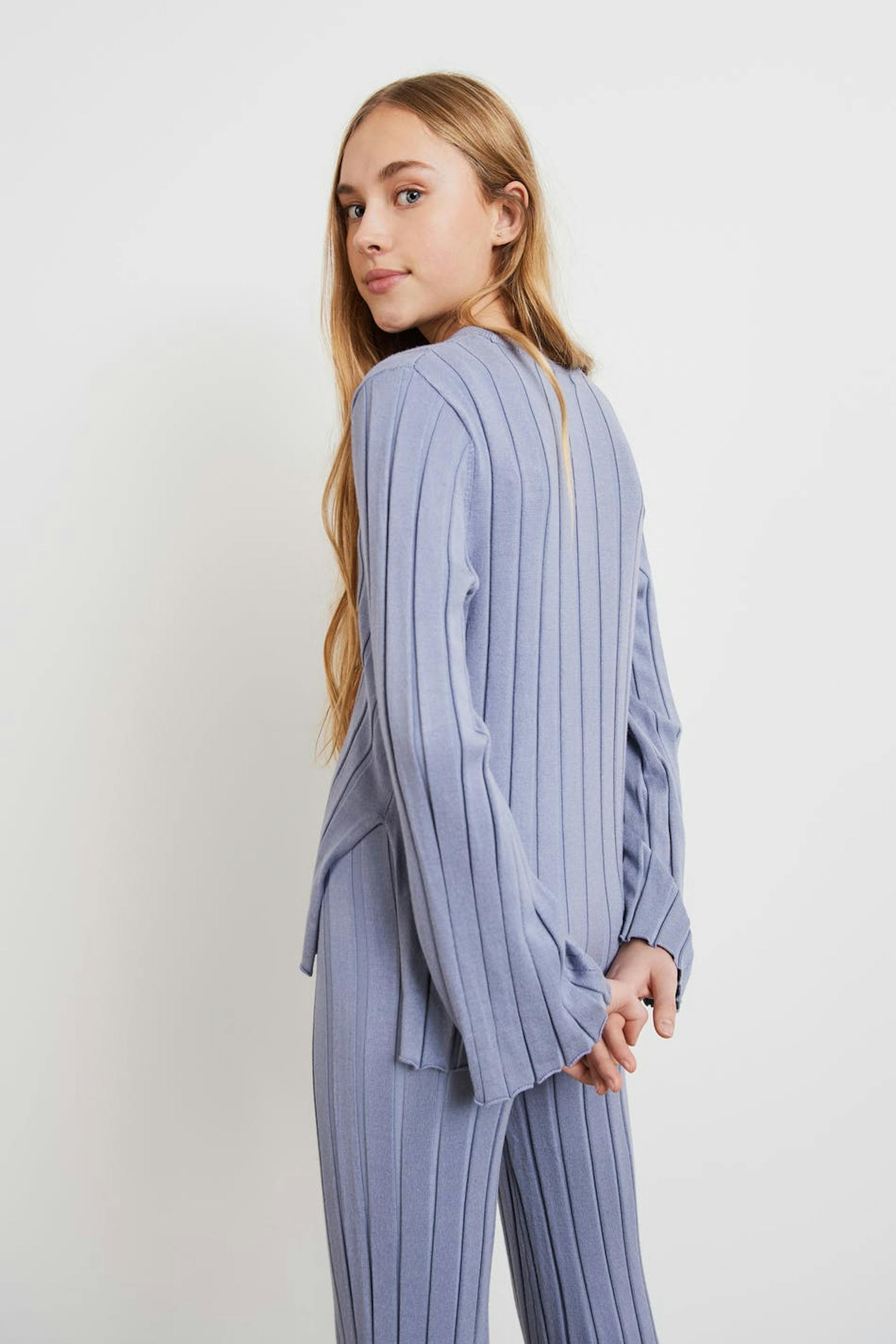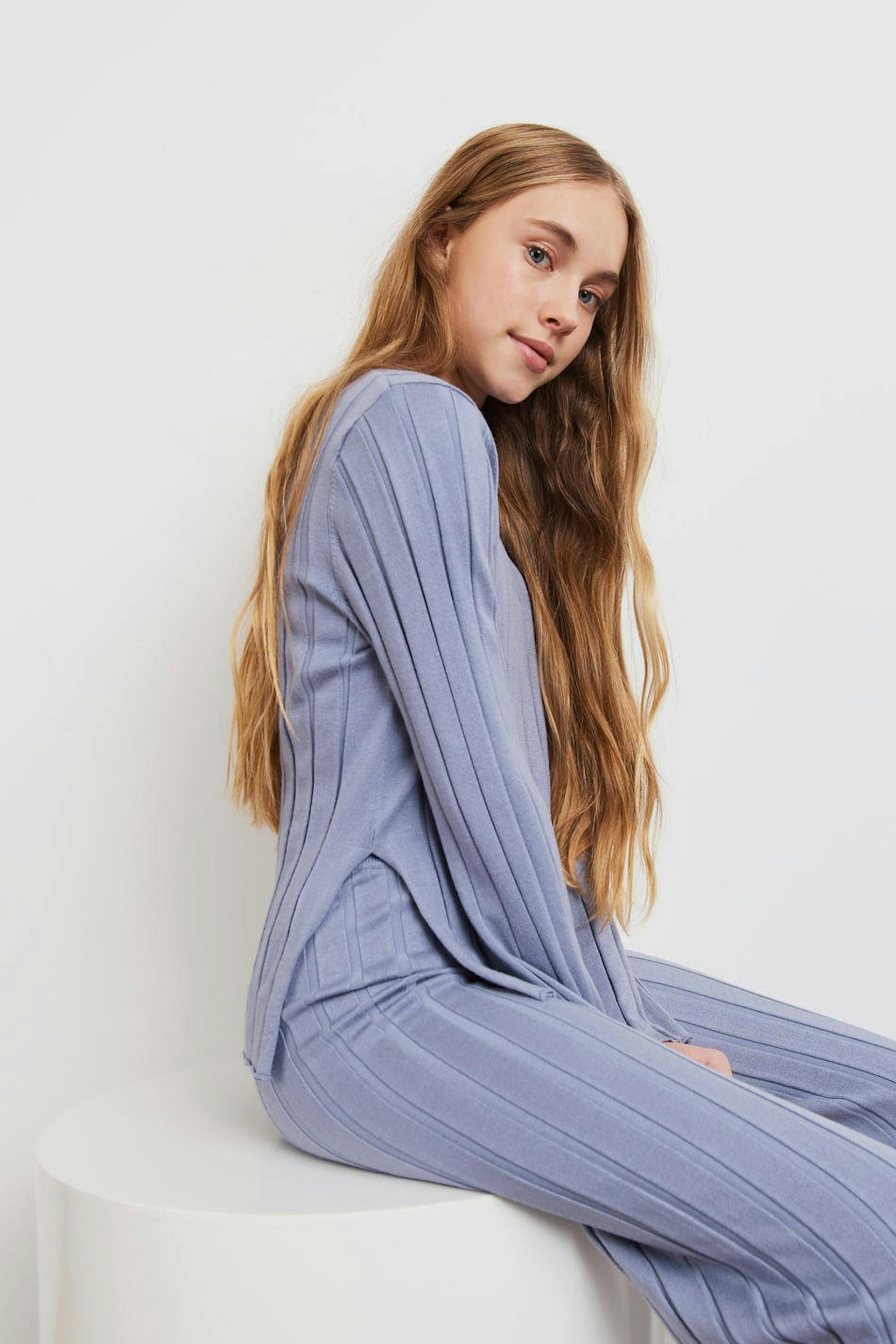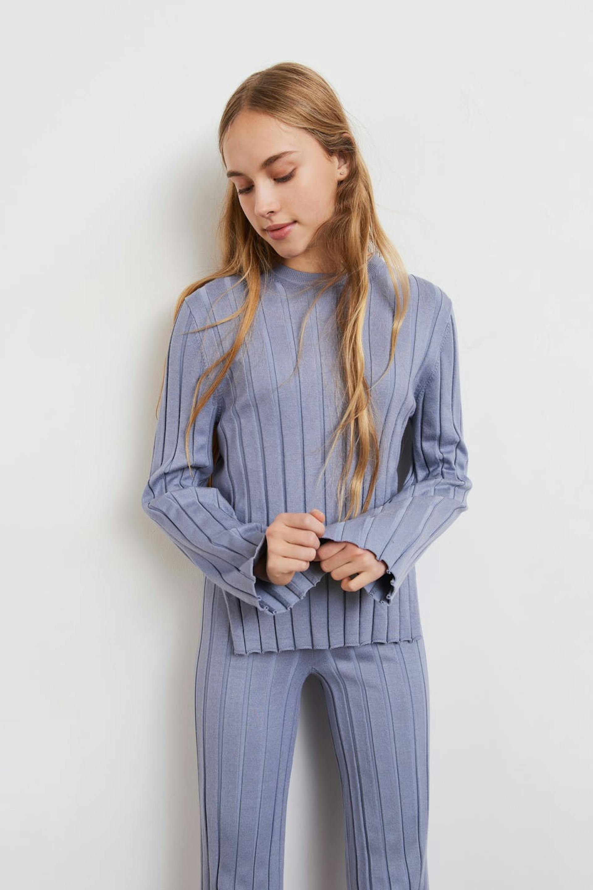 Knitted top by our Young assortment with slit on the sides. The top is blue and has a fitted fit. It has long sleeves and a soft material with wide ribbing.