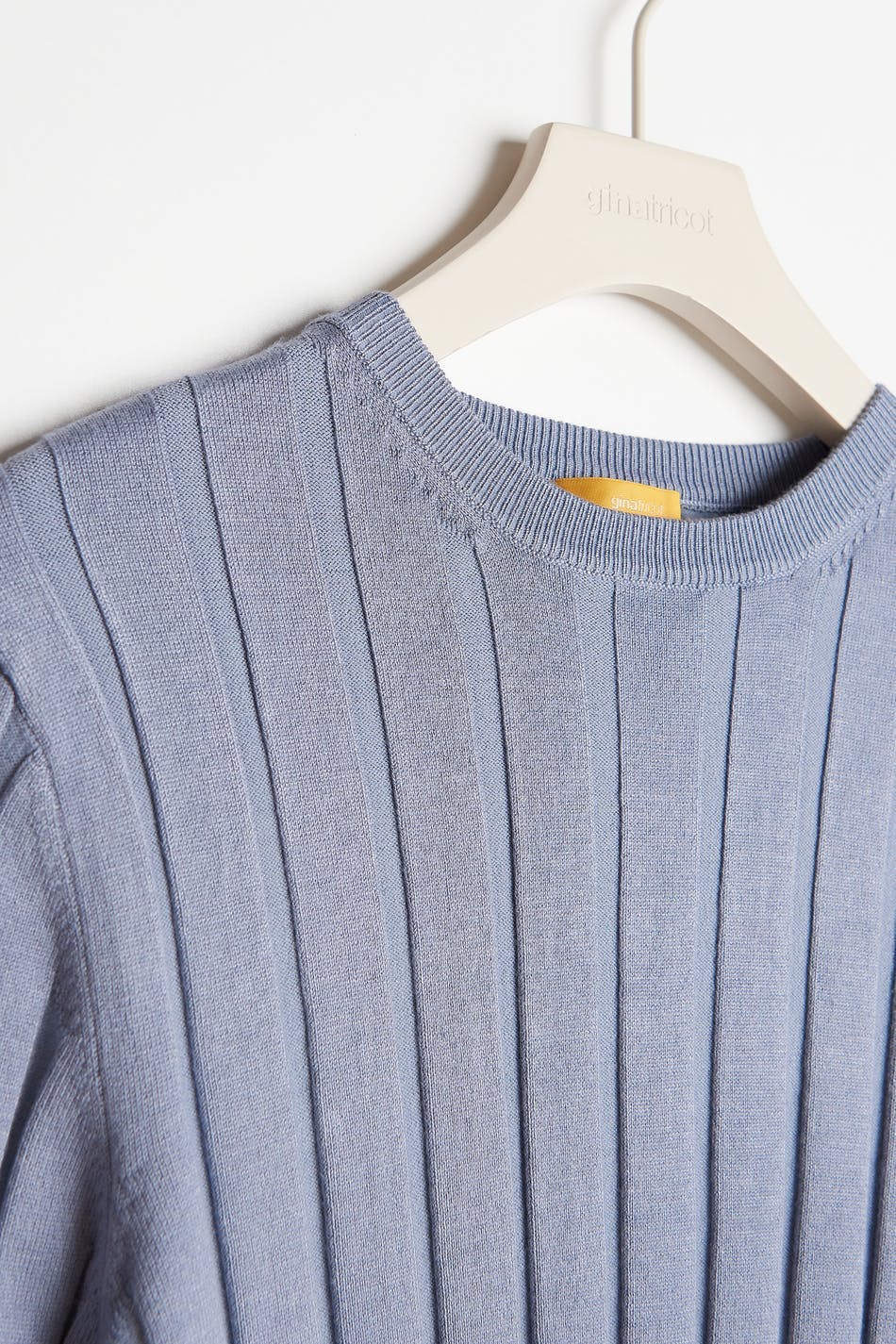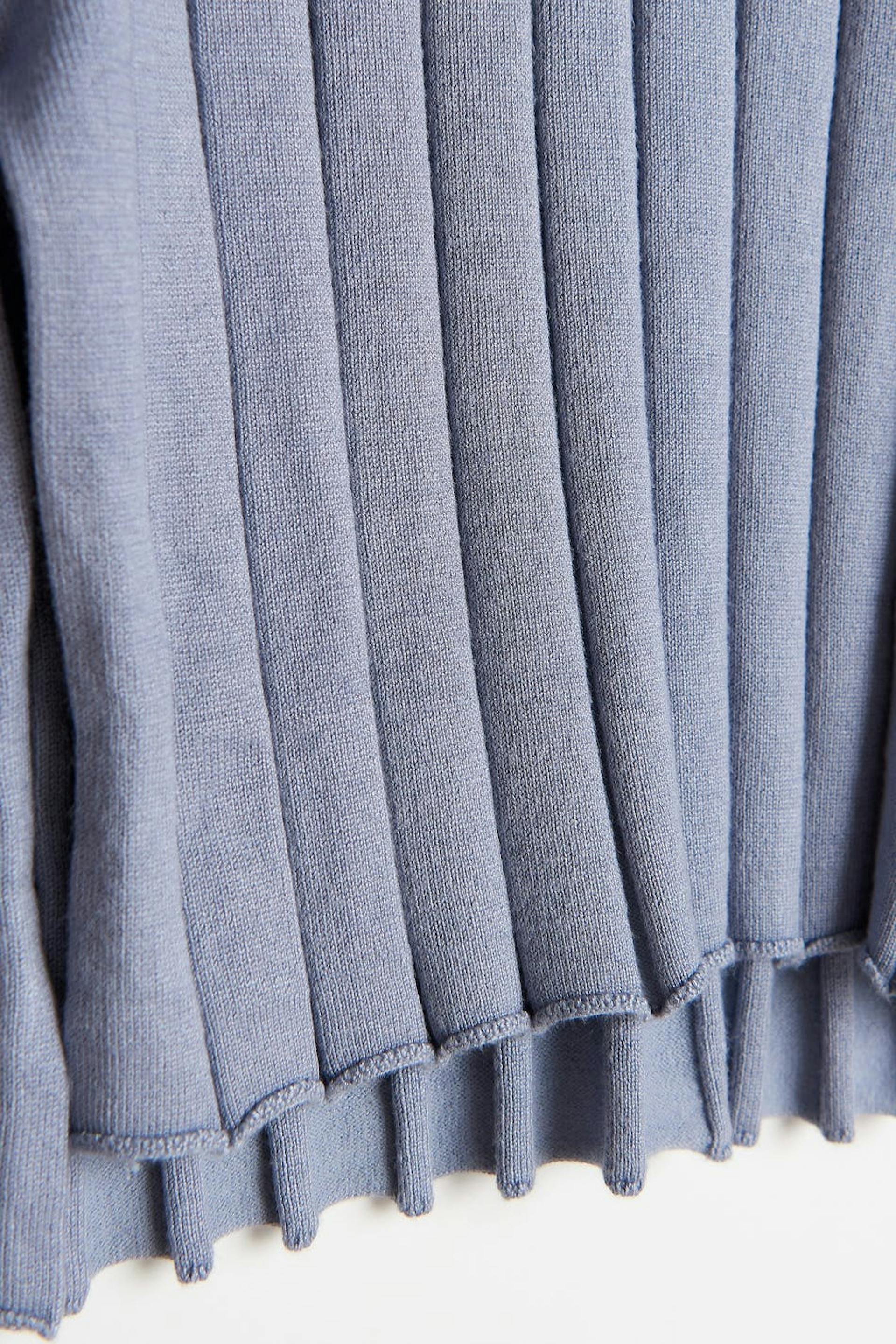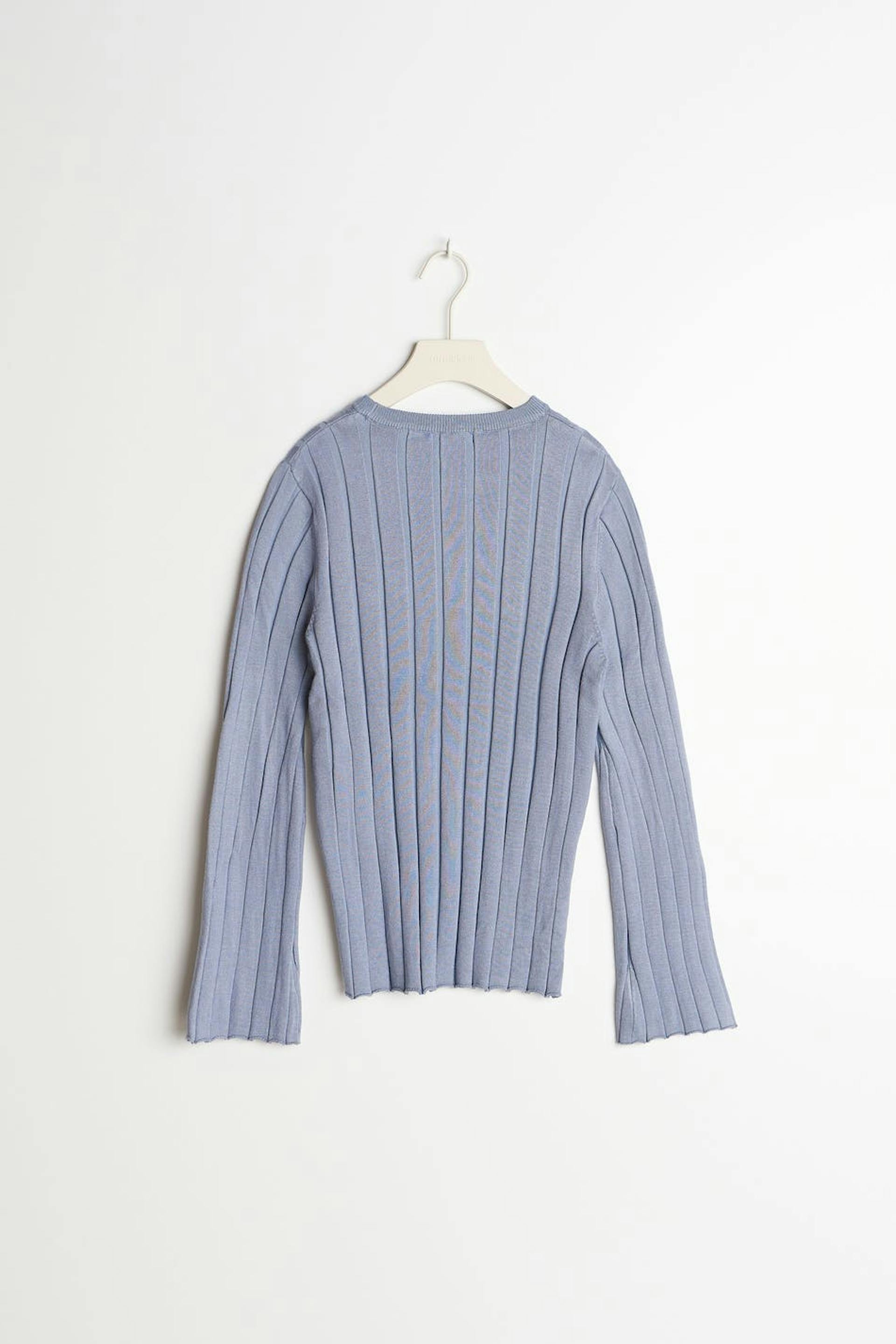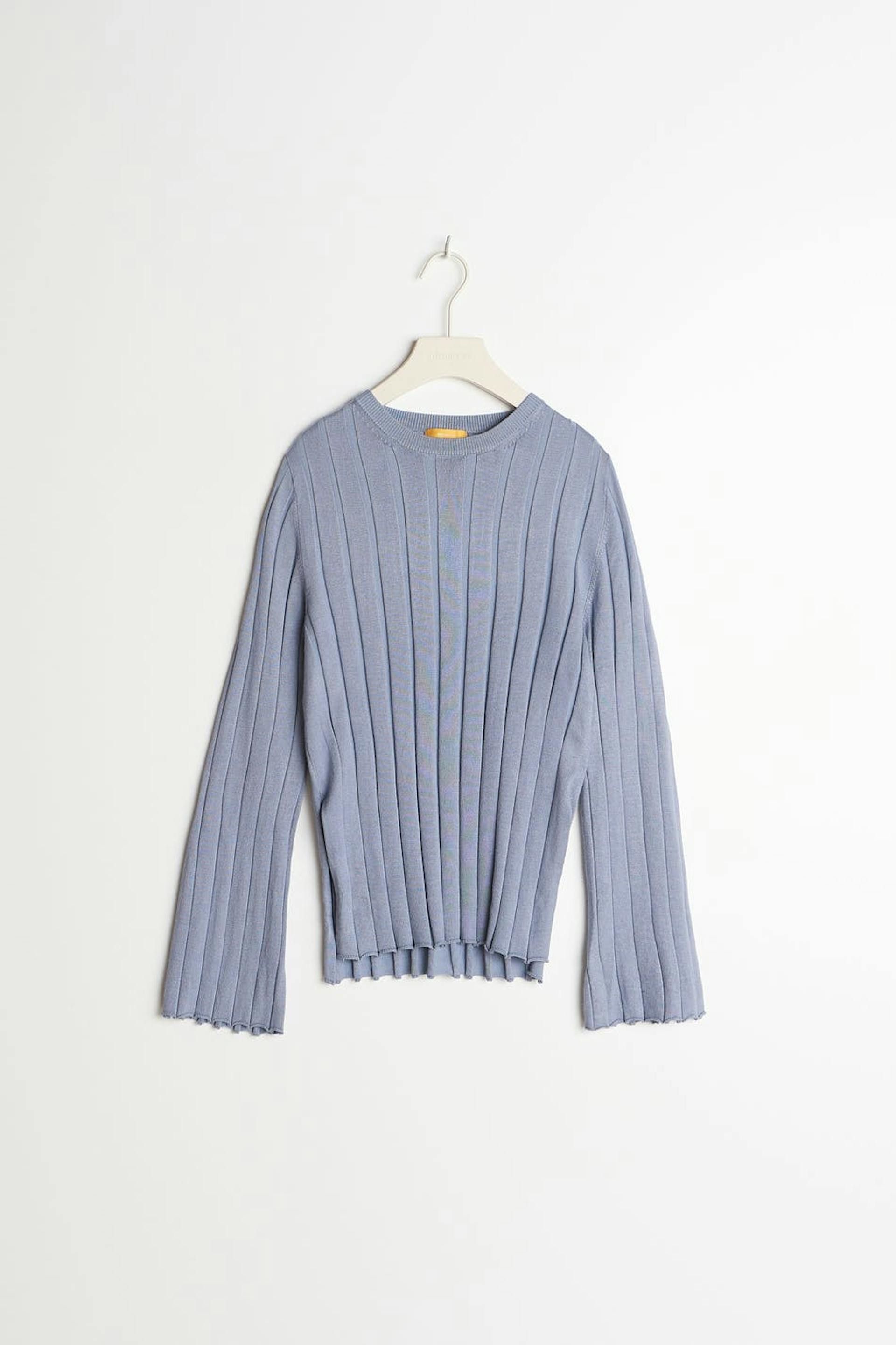 Knitted top by our Young assortment with slit on the sides. The top is blue and has a fitted fit. It has long sleeves and a soft material with wide ribbing.