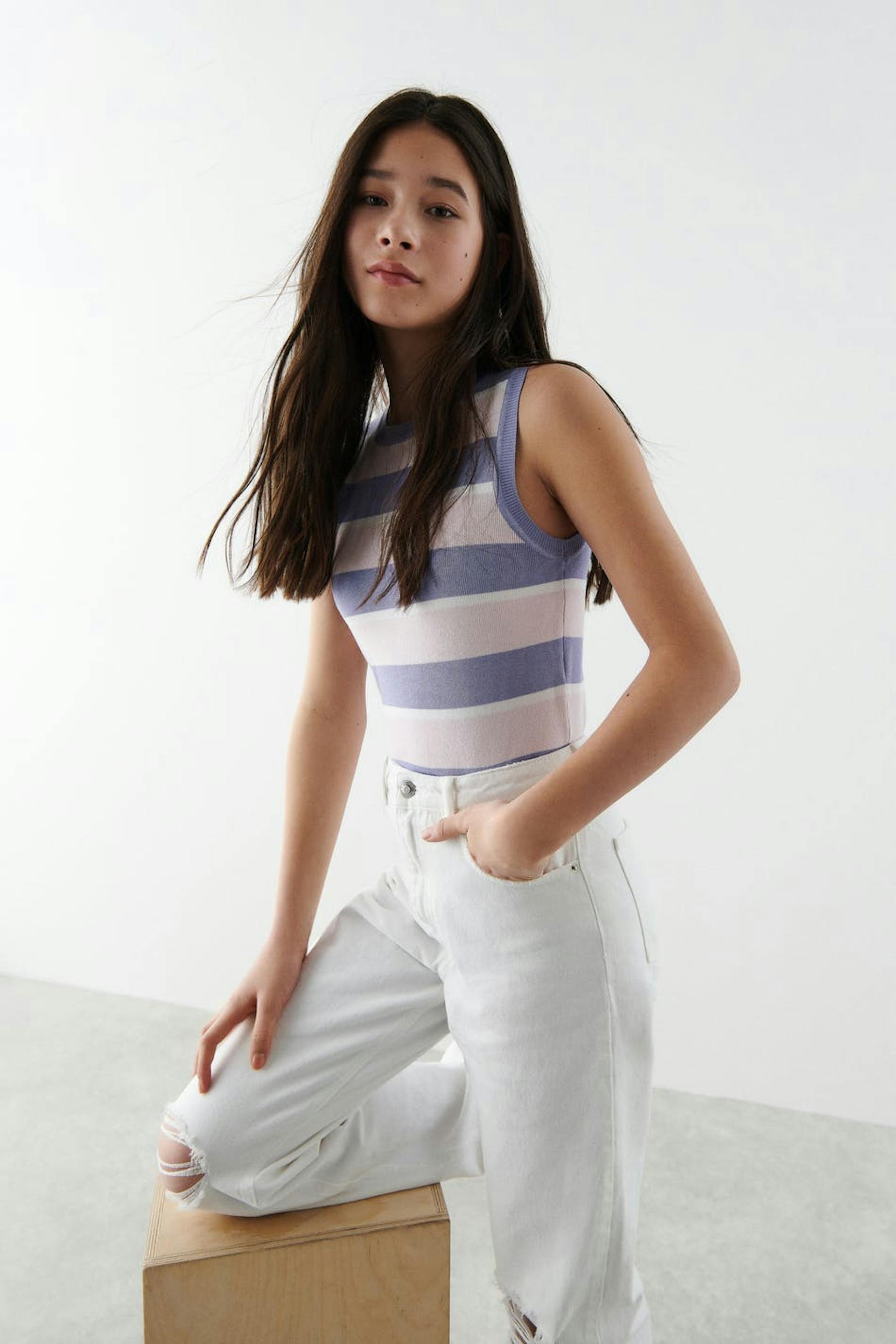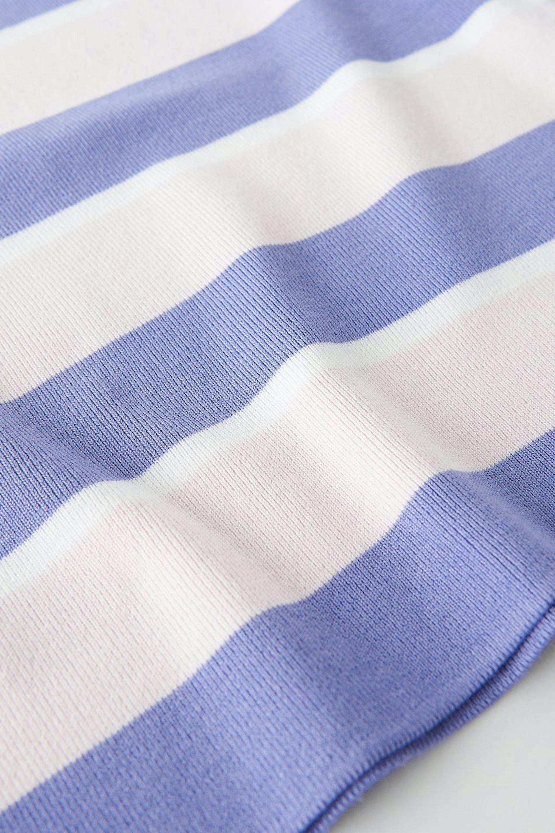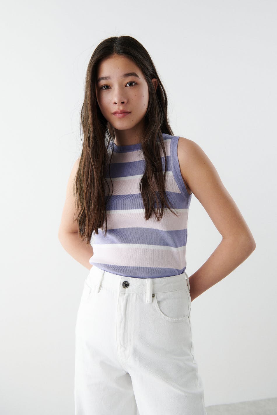 Striped knitted vest in LENZING™ viscose with fitted fit. The vest is purple and has high neckline.