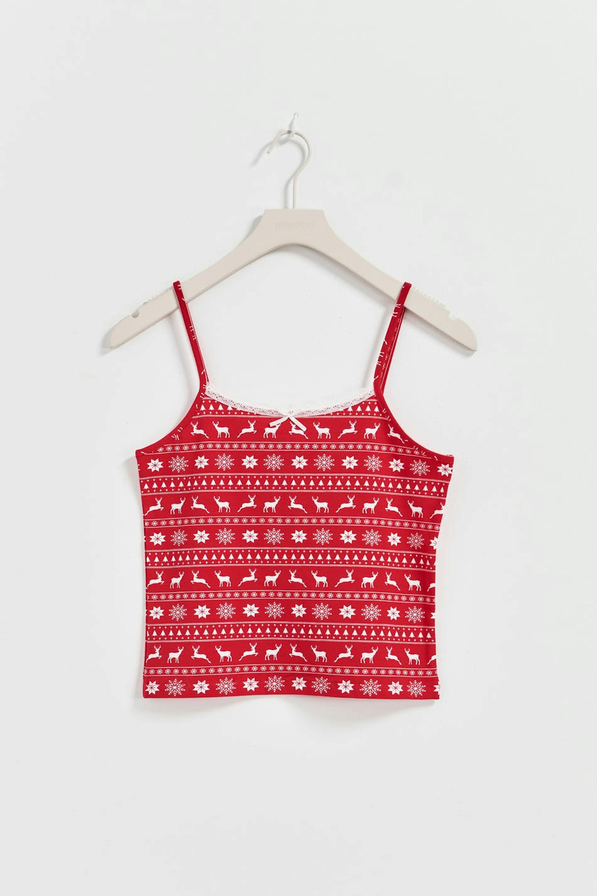 Patterned singlet with lace on the neckline. The singlet is red and has figure-hugging fit. It has thin shoulder straps and bow detail at the front.
