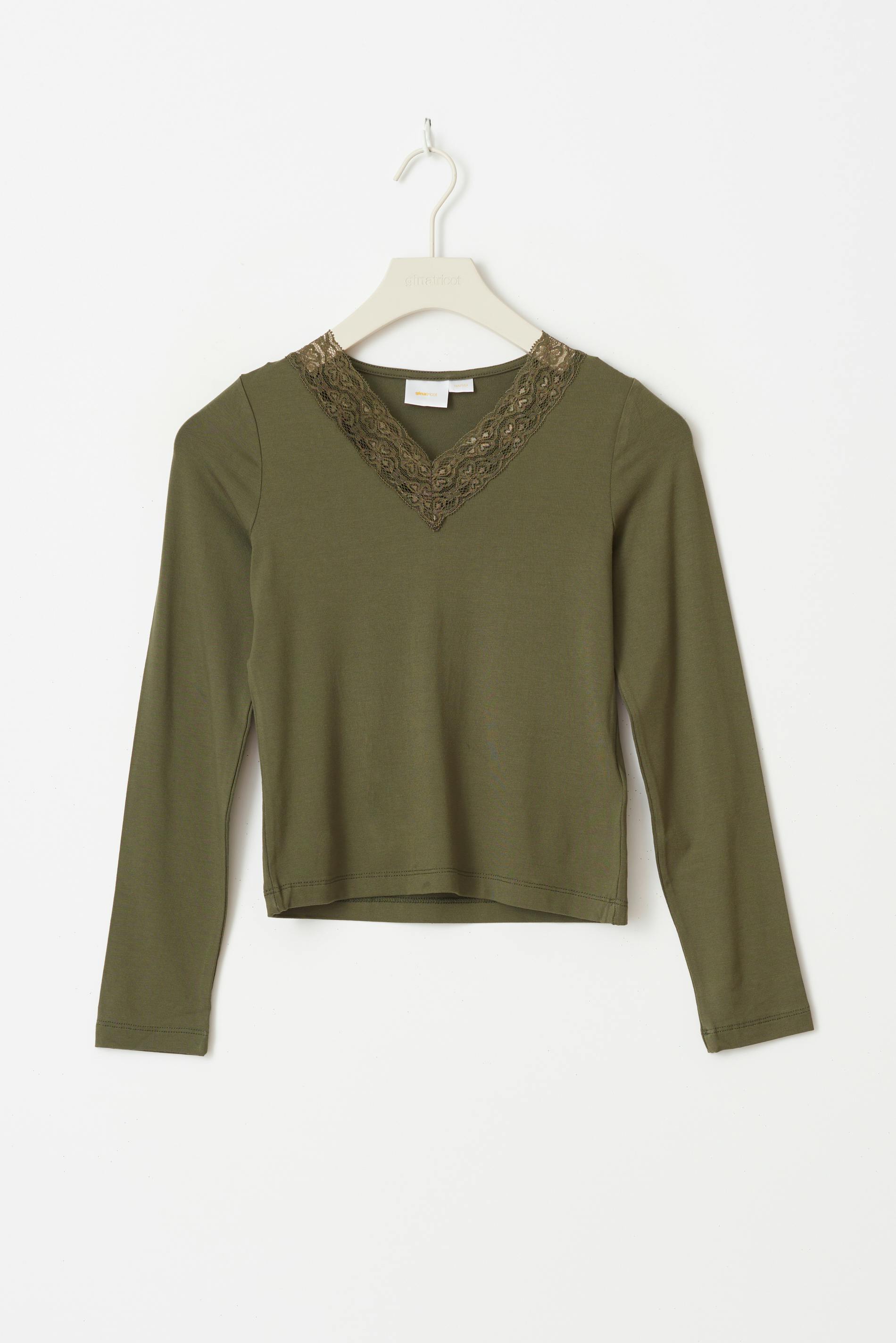 Long sleeve top with lace on the neckline. The top is green and has v-neck. It has figure-hugging fit.