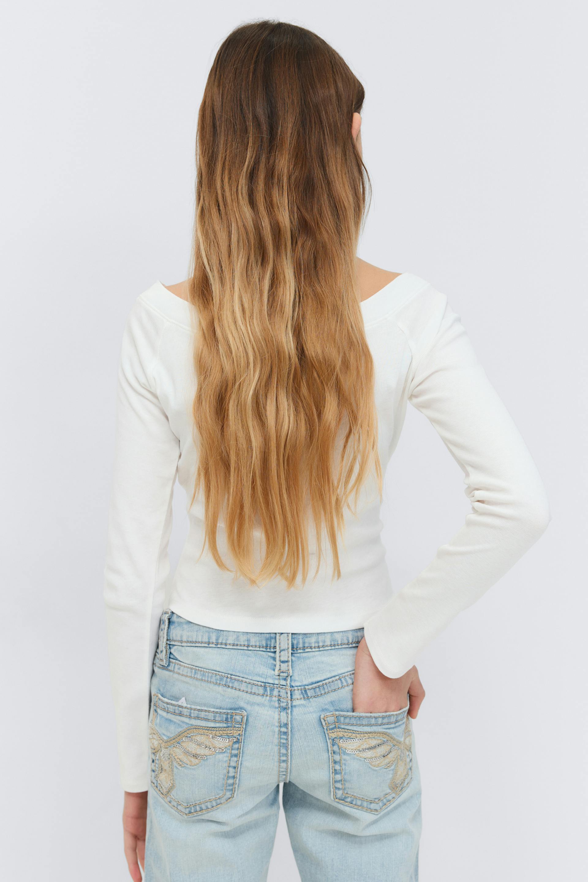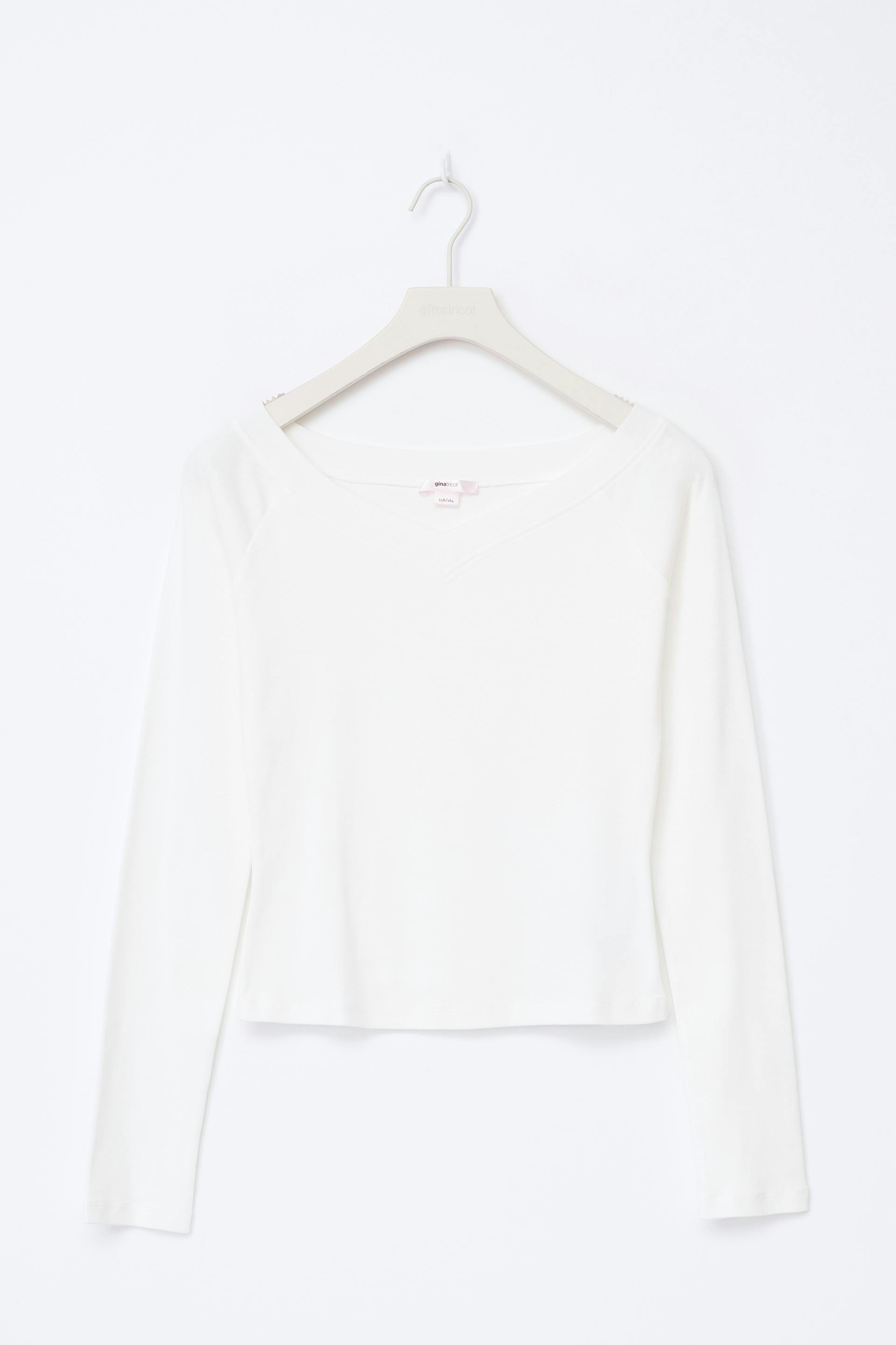 Long sleeve top with slim fit. The top is white and has boat neckline with v-shaped neck. It has soft quality.