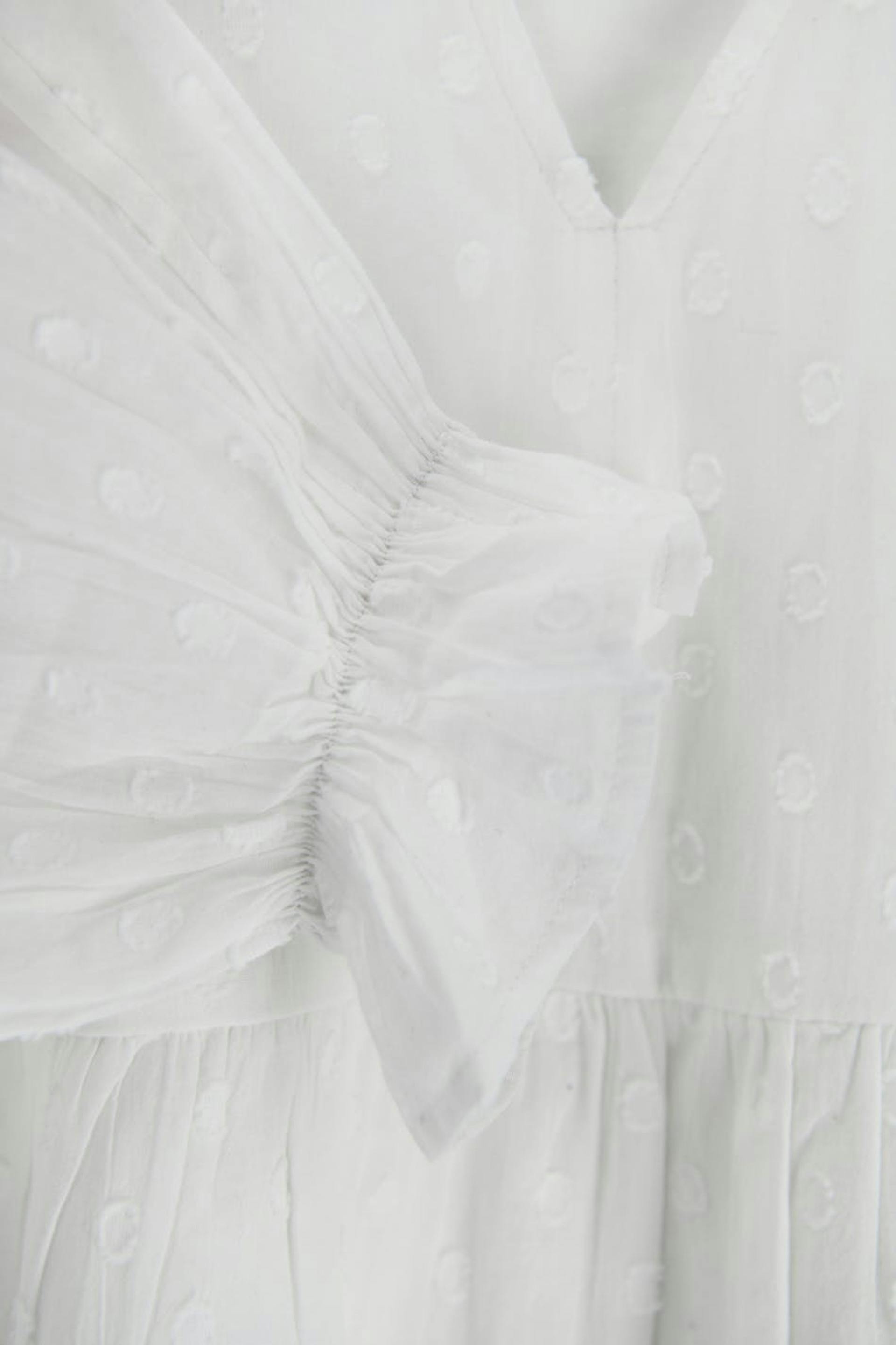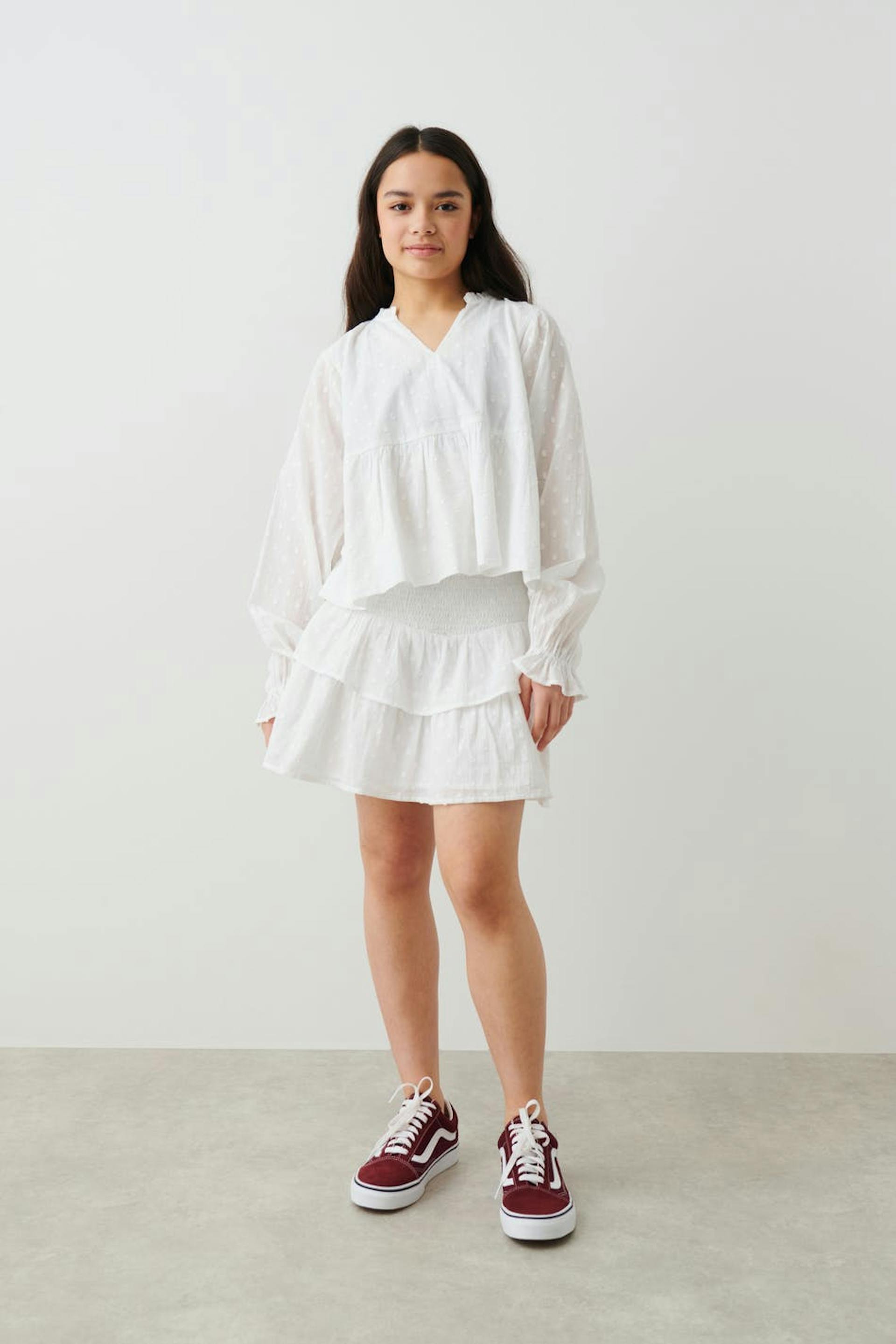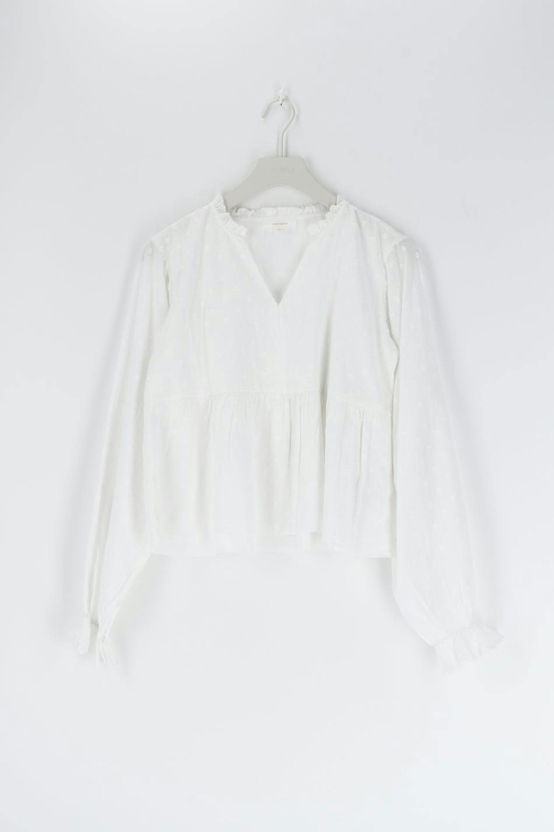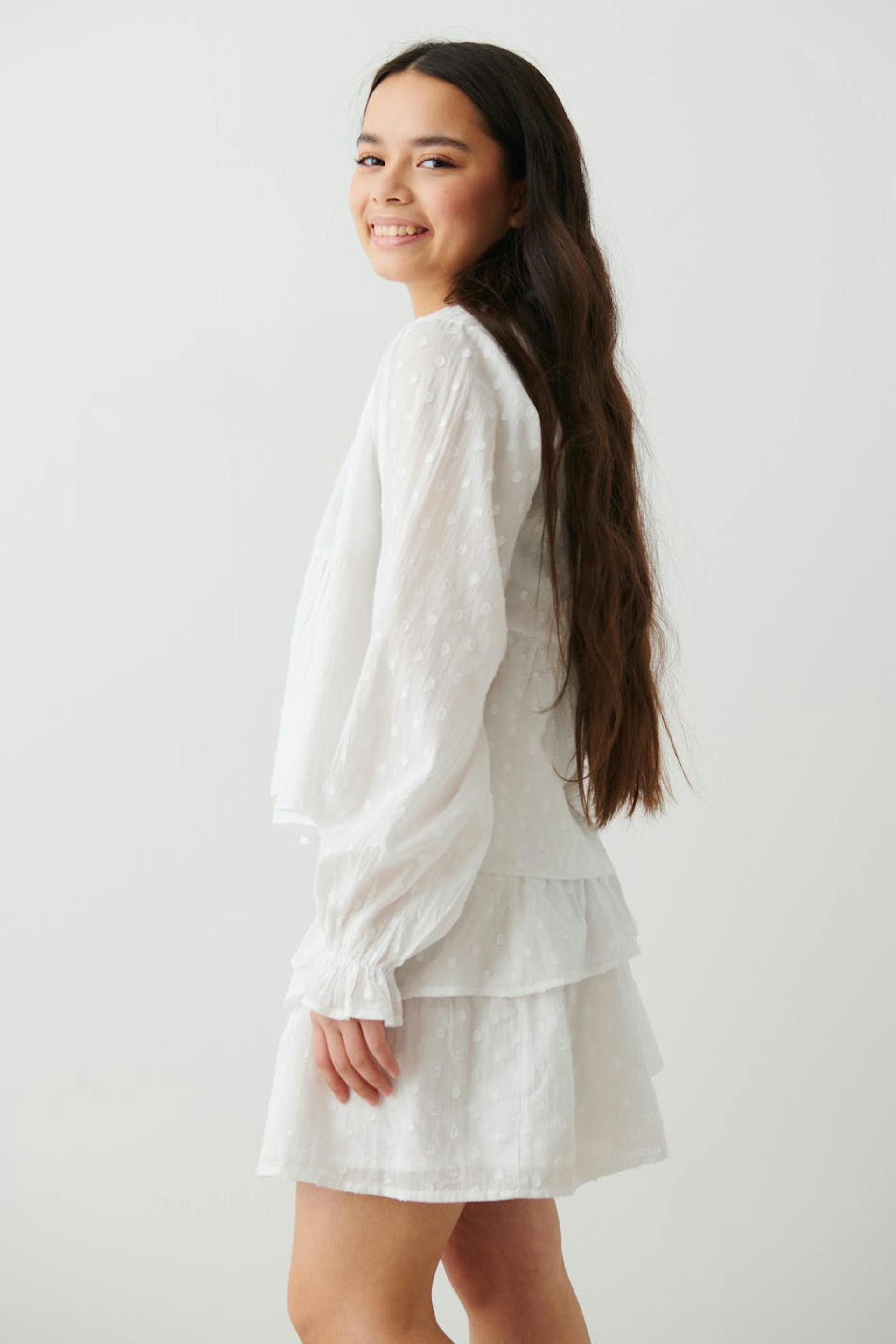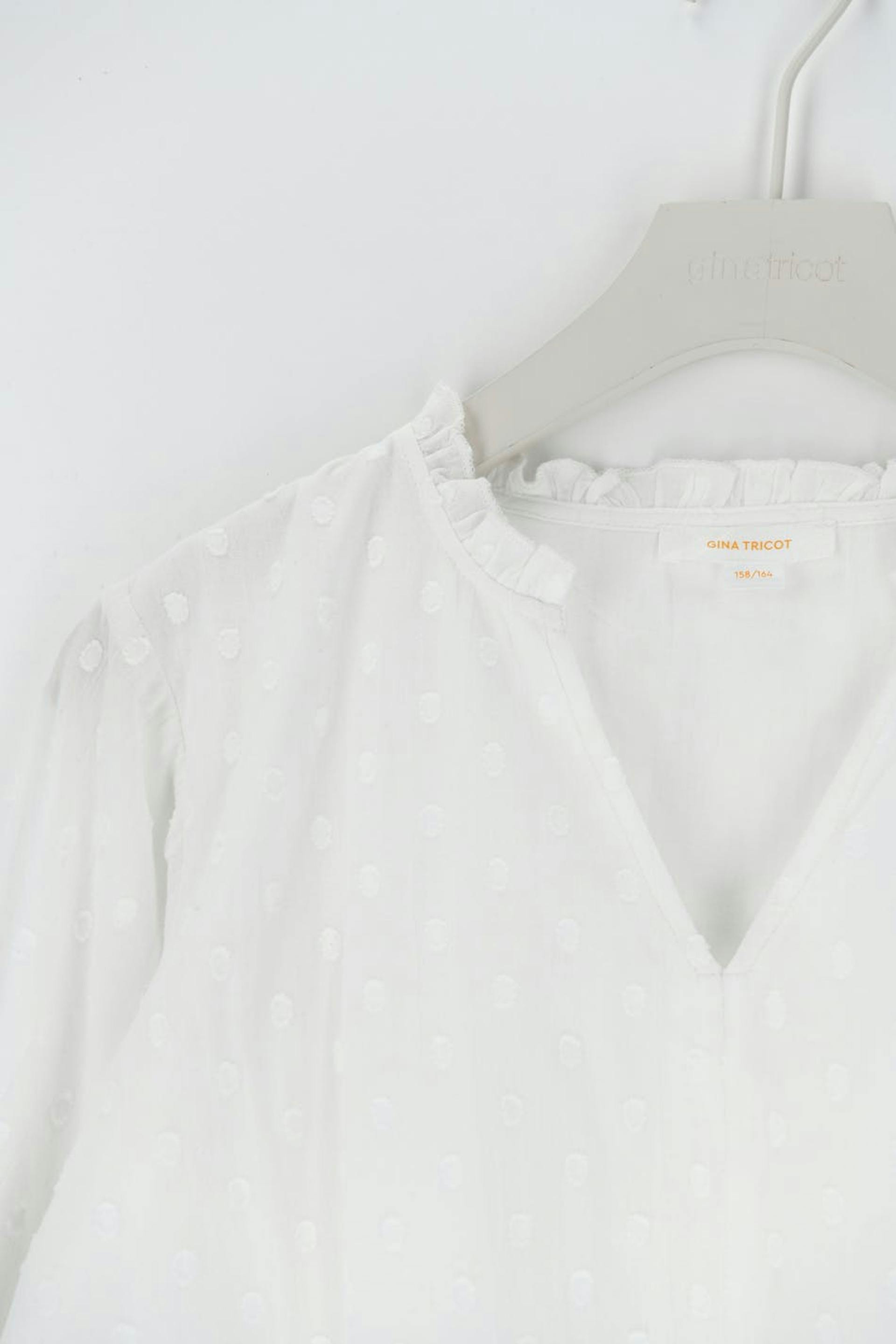 Blouse by Gina Tricot Young with v neckline. The blouse is white and has loose-fitting style. It has frills around the neckline and elasticized cuffs.