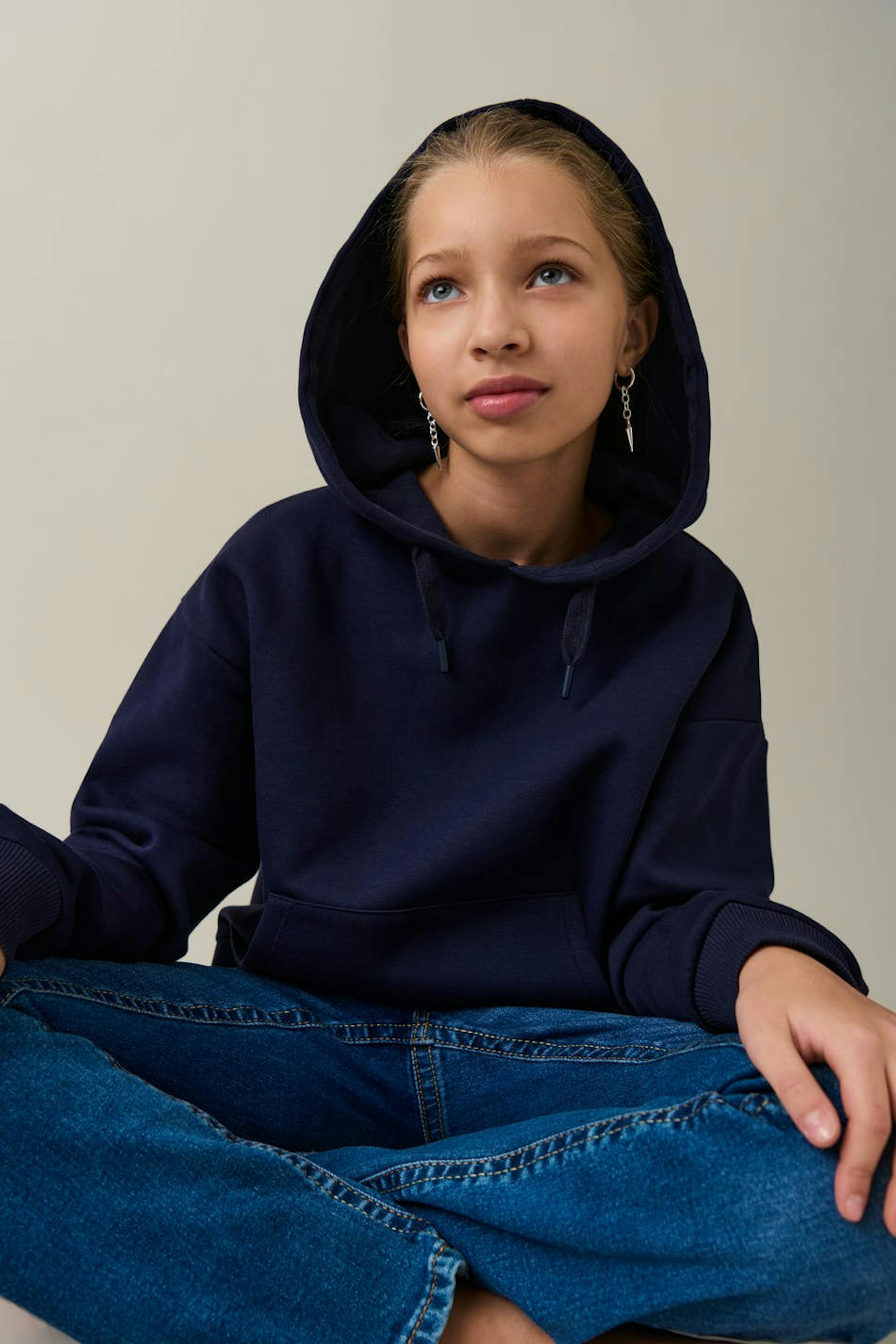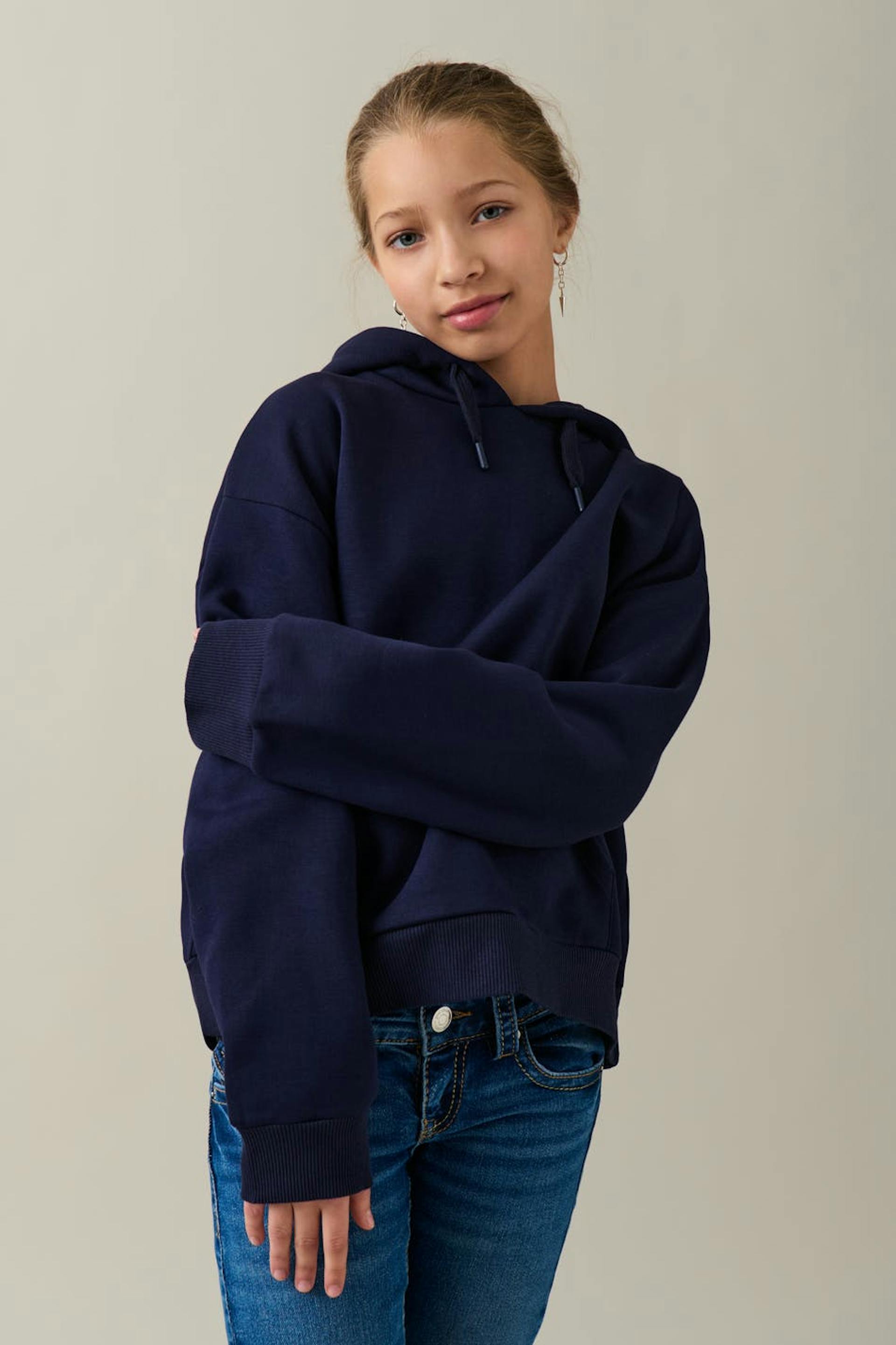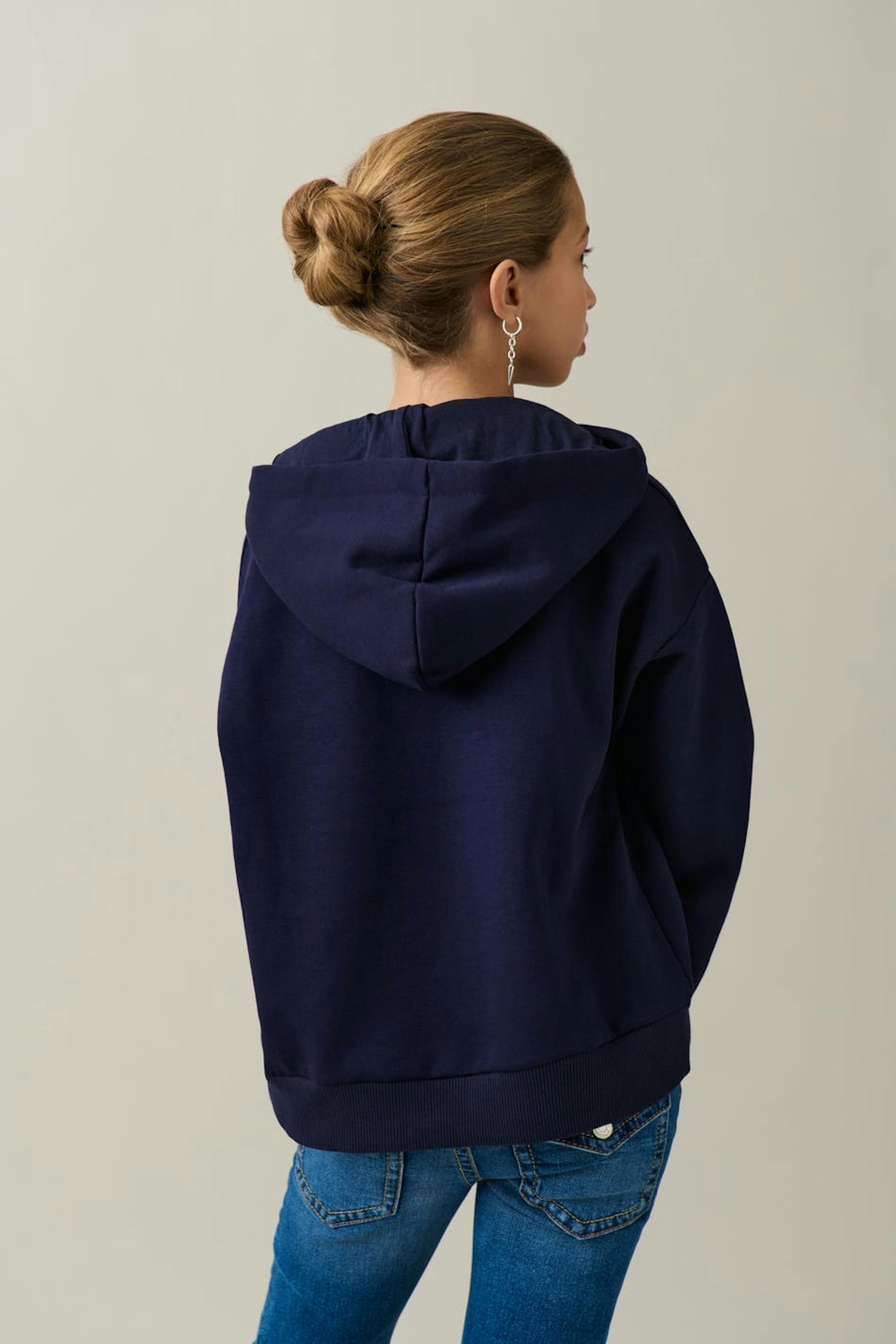 Soft hoodie in jersey material with lacing at the front. The hoodie is navy and has a hood at the back.