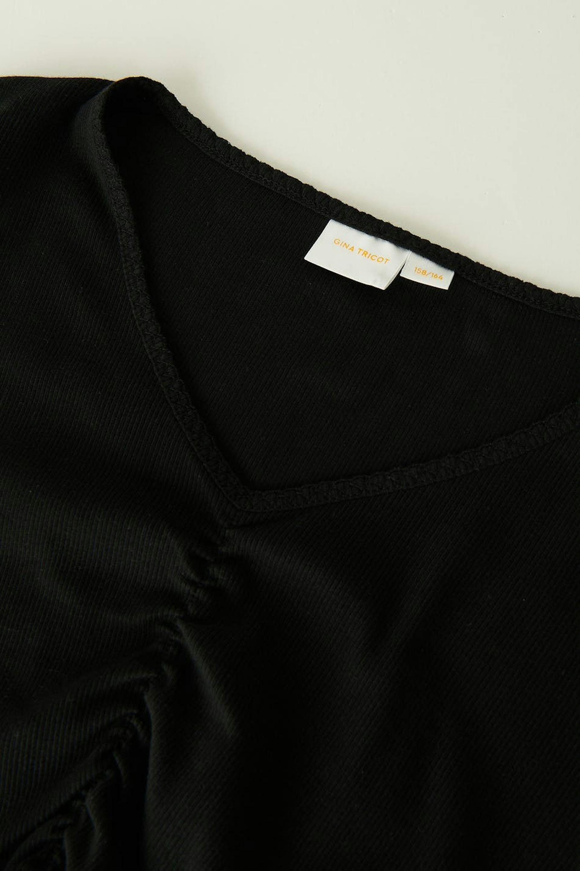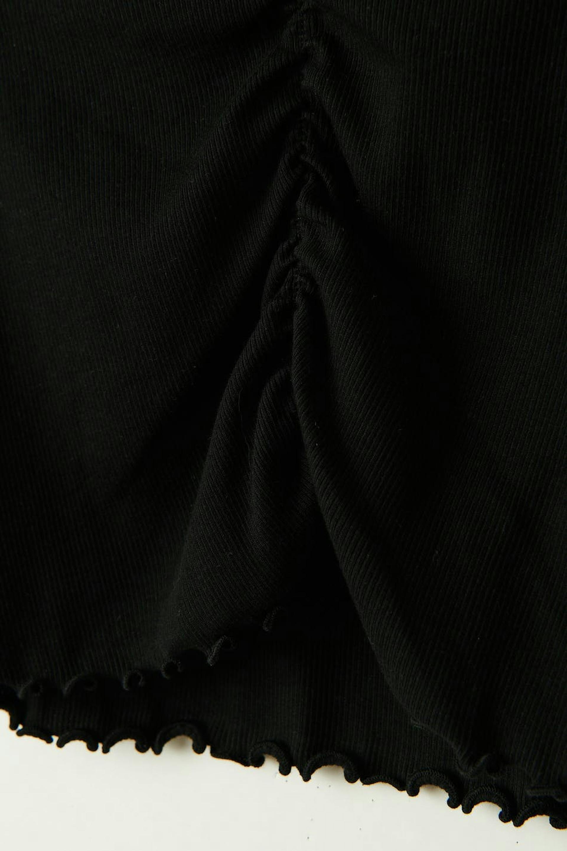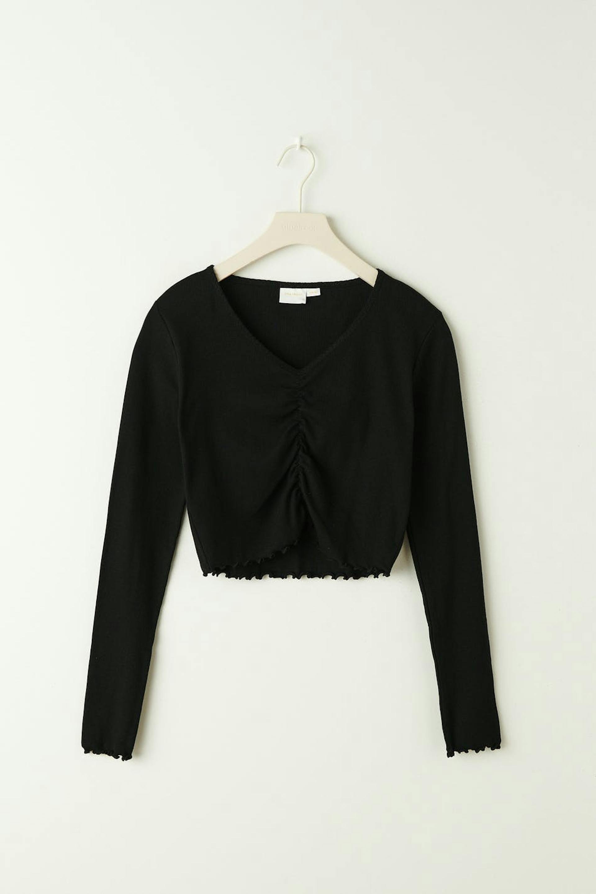 Long-sleeved jersey top by our Young assortment with ruching at the front. The jersey top is black and has fitted fit. It has v-neck and lettuce hem at sleeve ends and at the bottom.