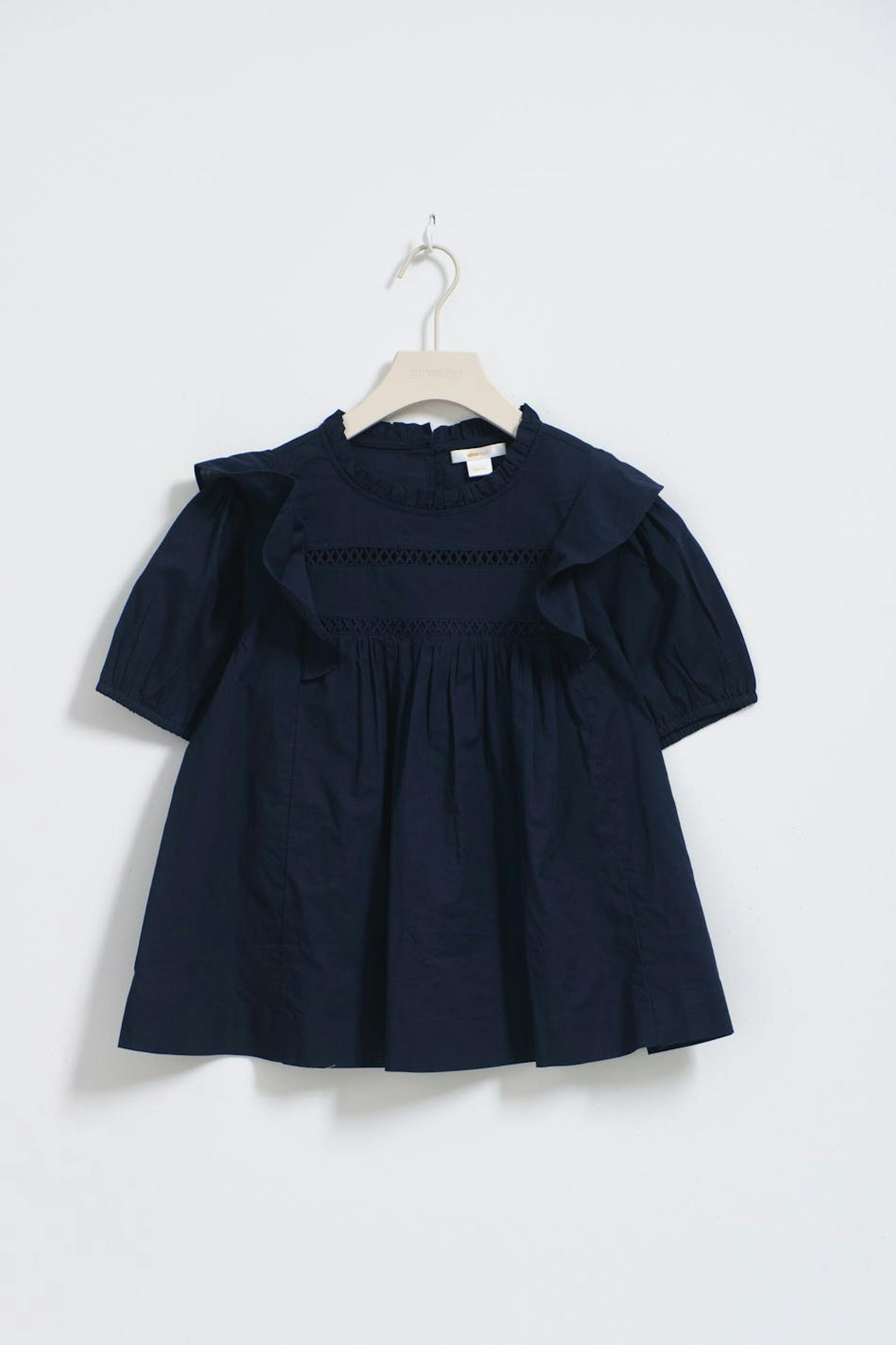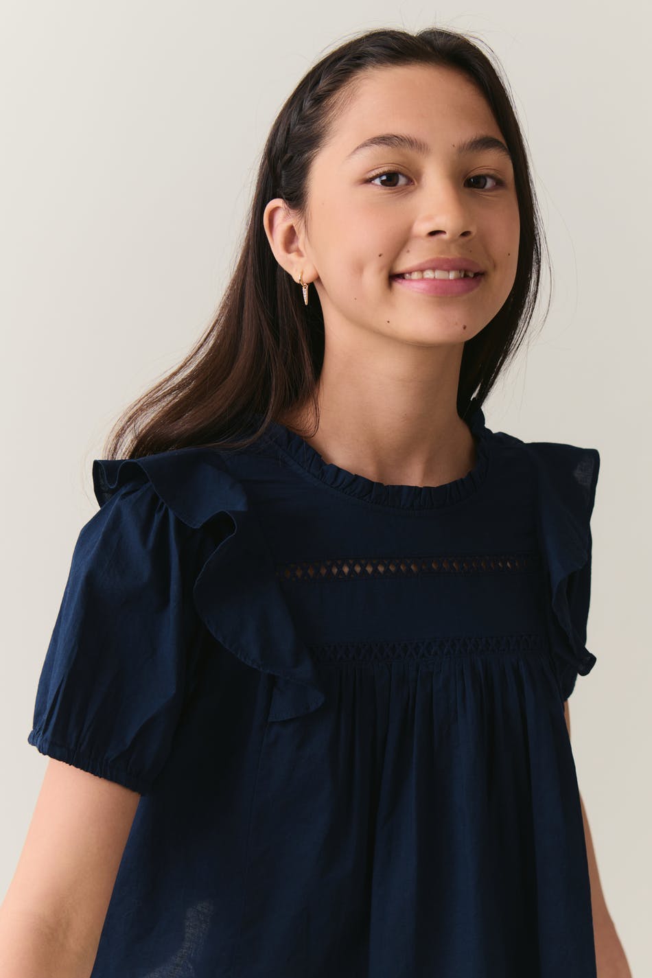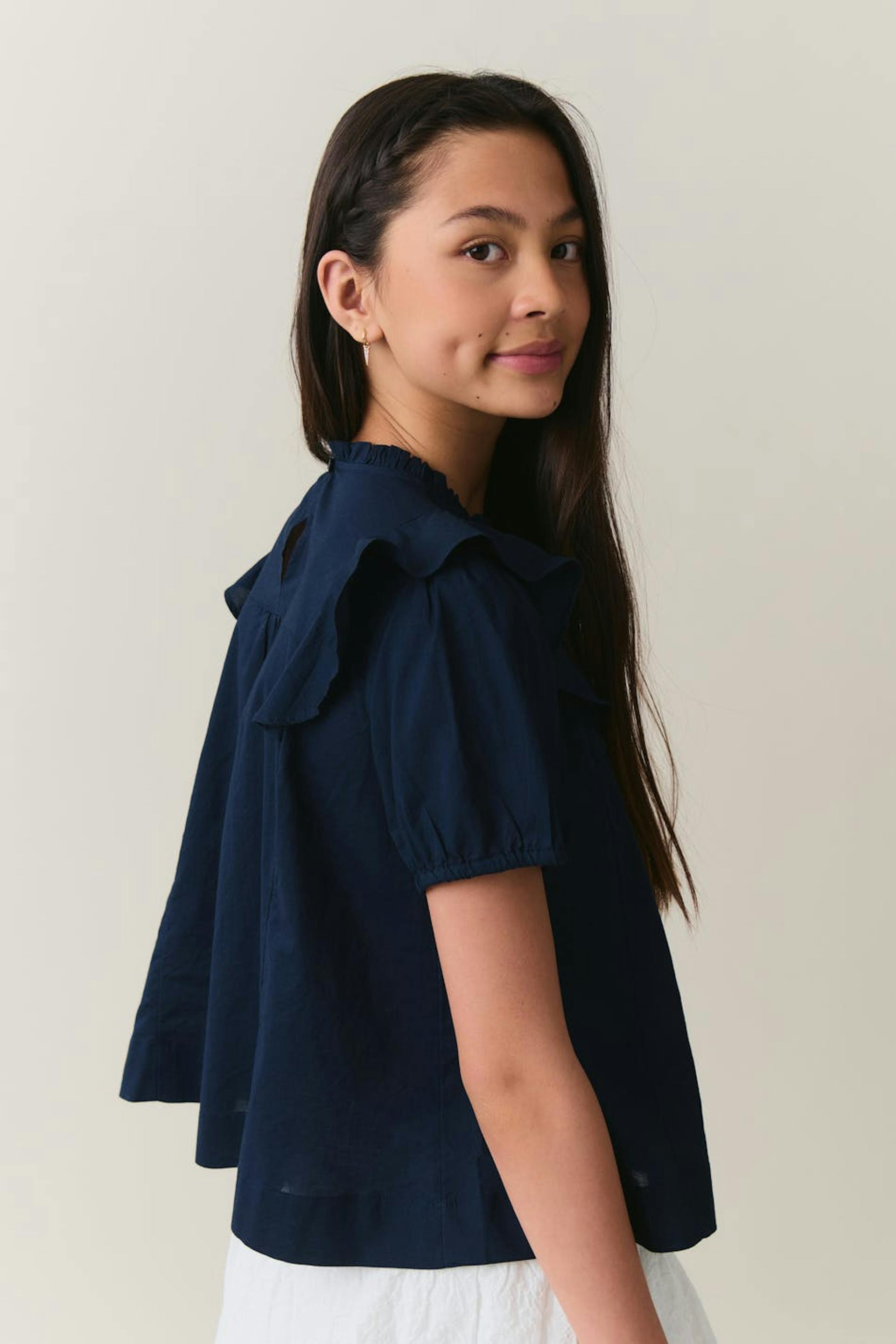 Short-sleeved blouse with frill at the shoulders and on the neckline. The blouse is navy and has an oversize fit. It has gathered seams at the front, round neckline, lace detail at the front and elasticized cuffs.
