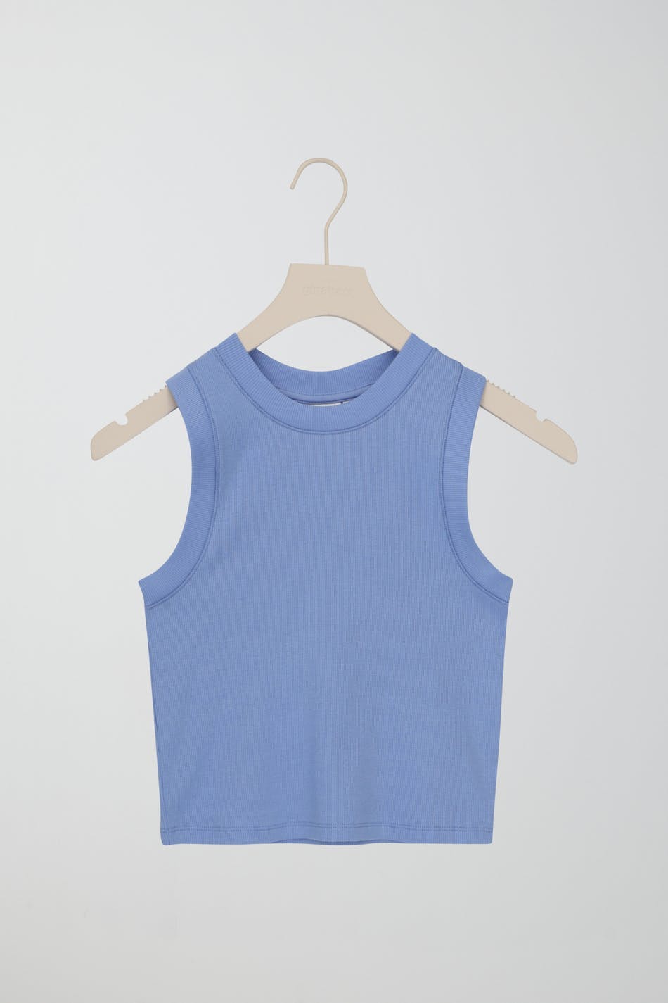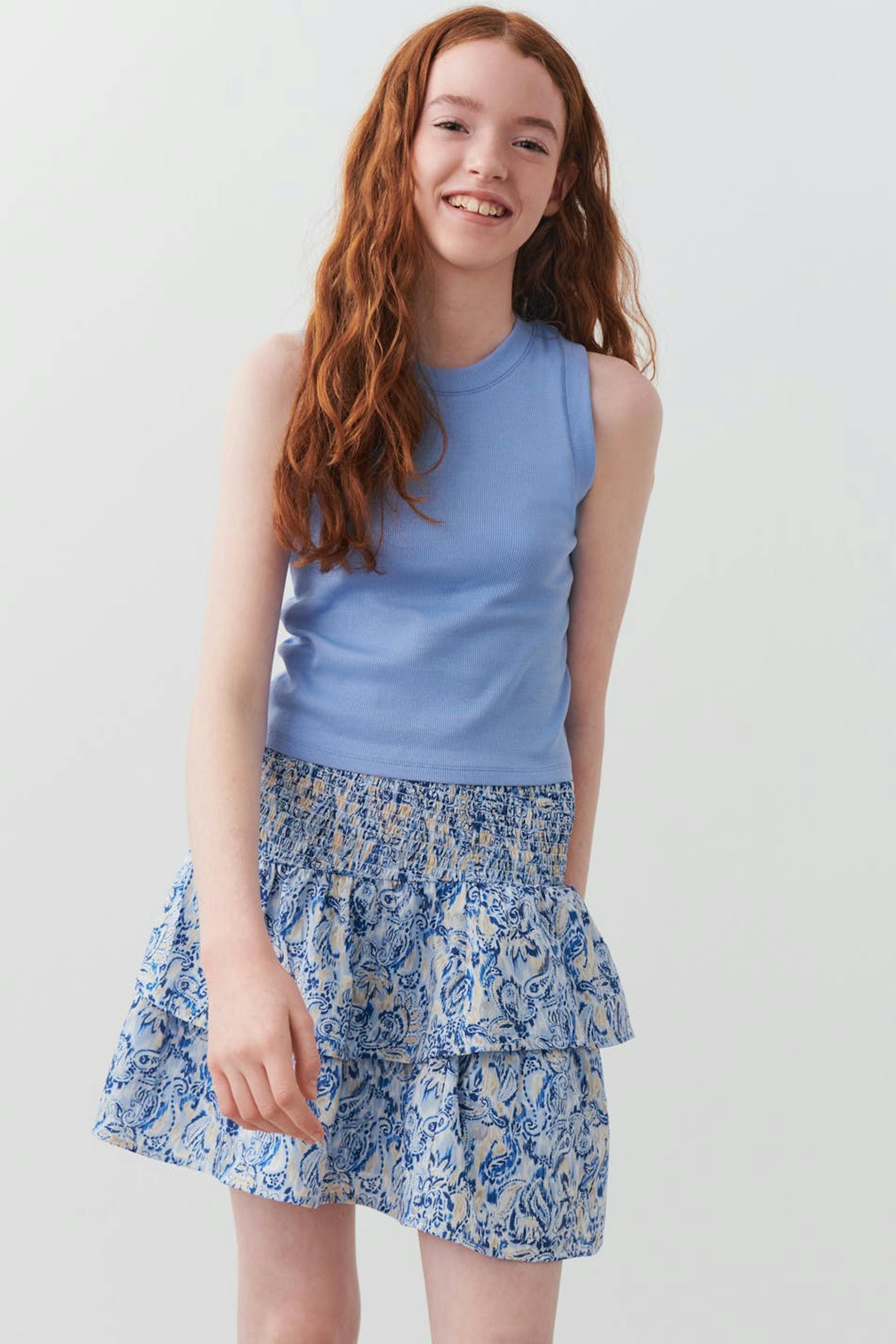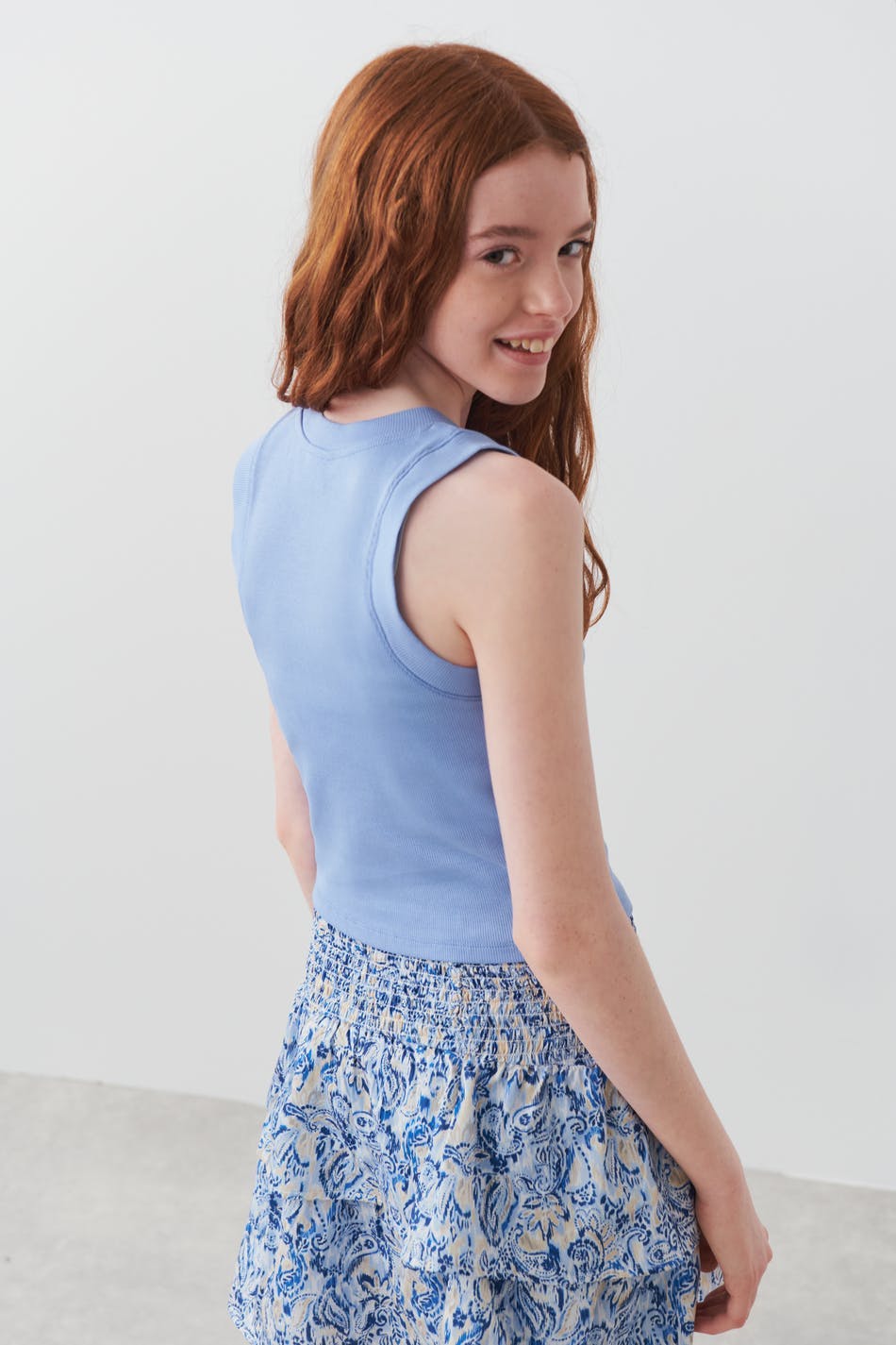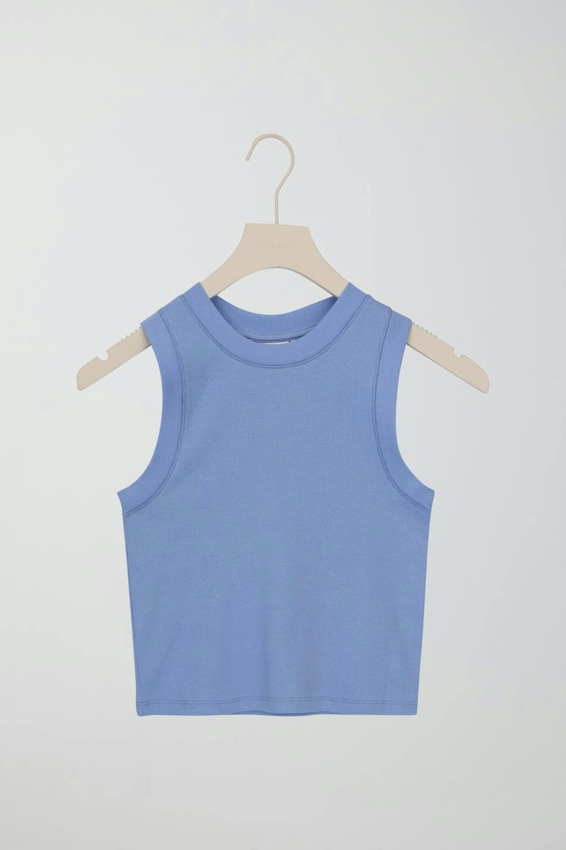 Tank by Gina Tricot Young in ribbed jersey with a fitted fit with a shorter length. The tank is blue.