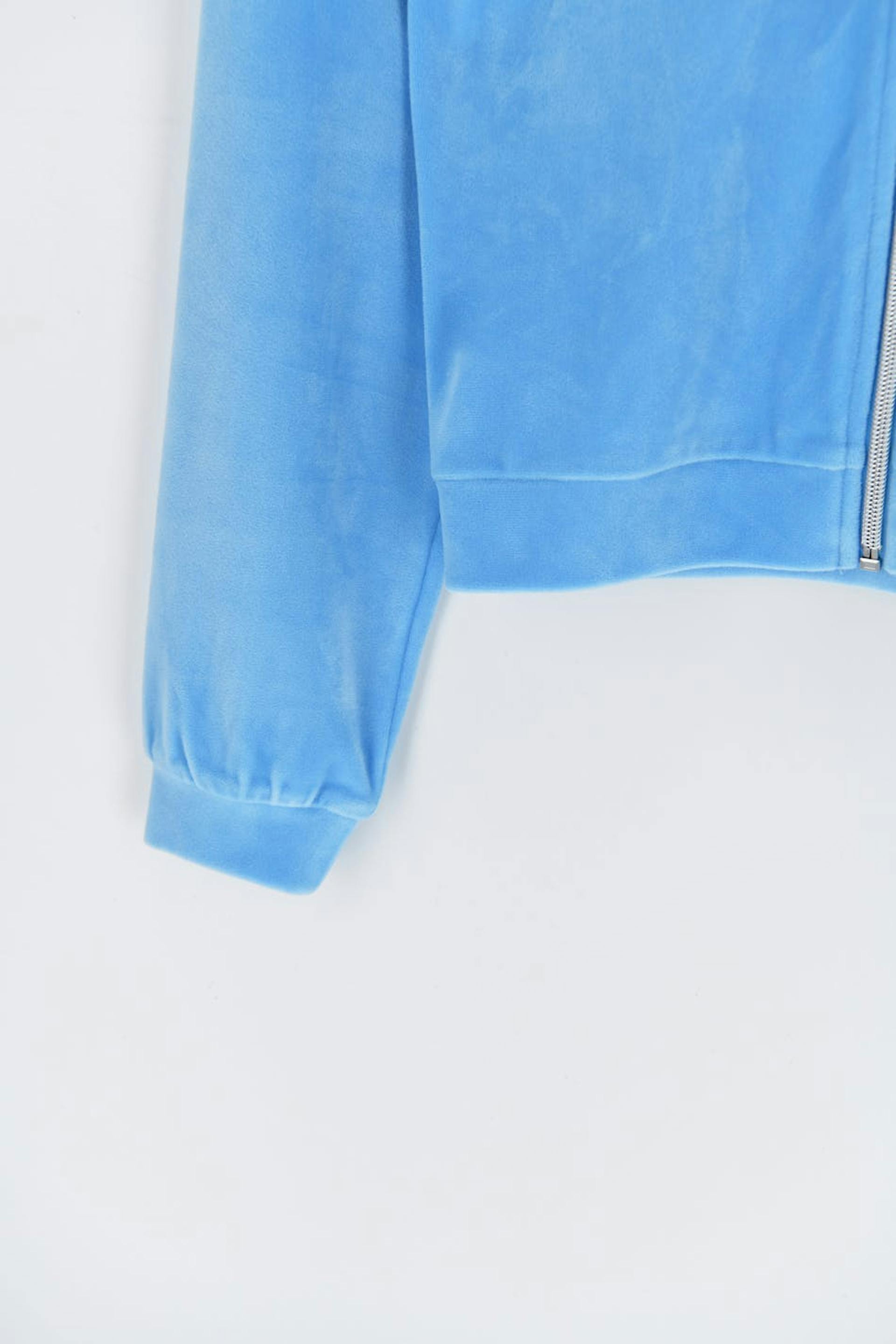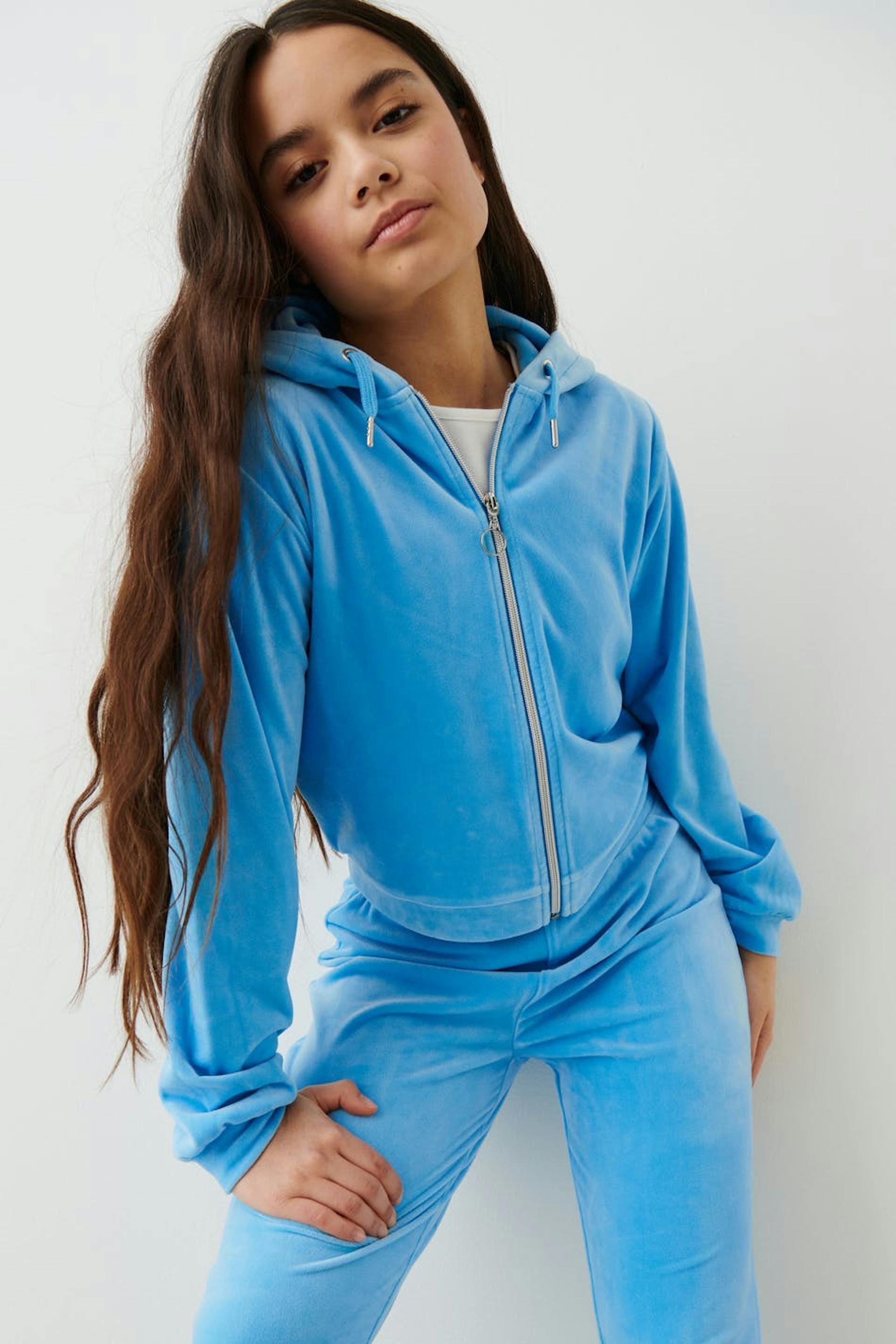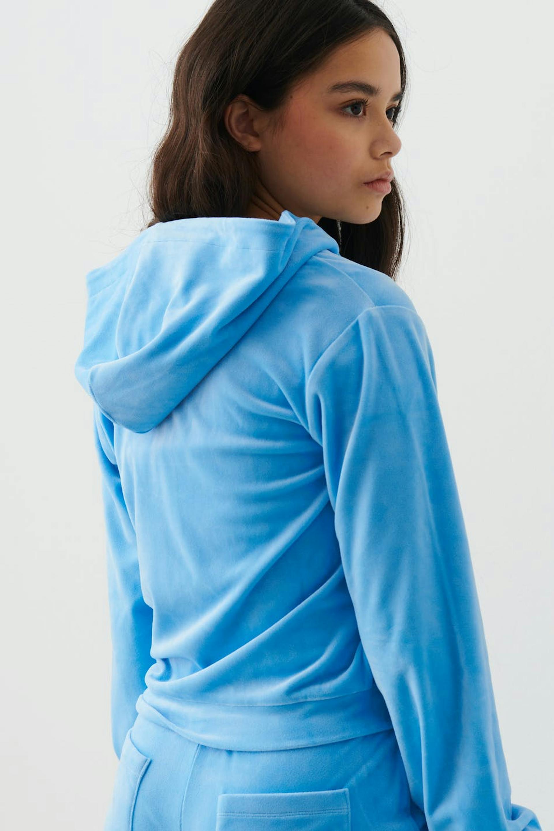 Soft hoodie in velour with zip closure in front. The hoodie is blue and has a hood at the back. It has a cropped length and elastic at the bottom and on the sleeve ends.