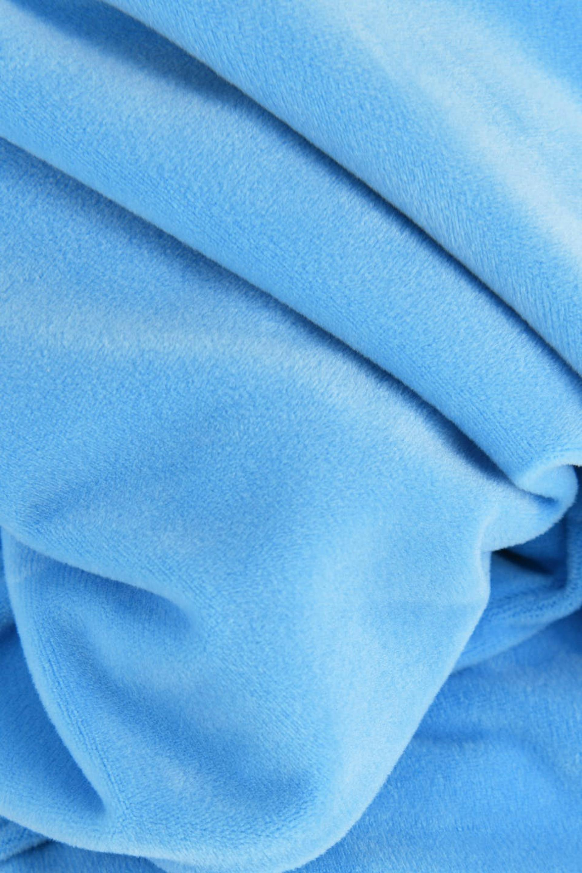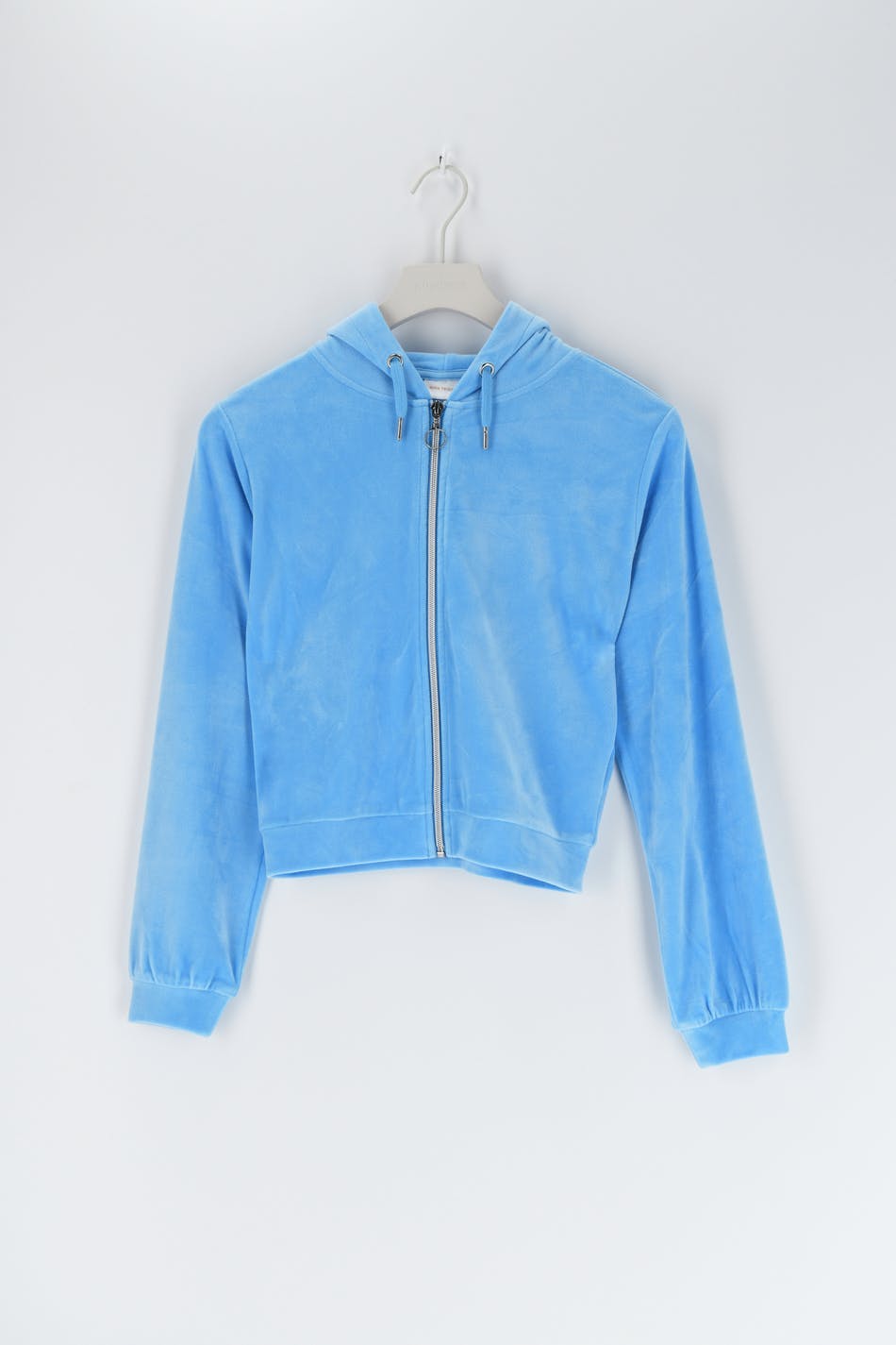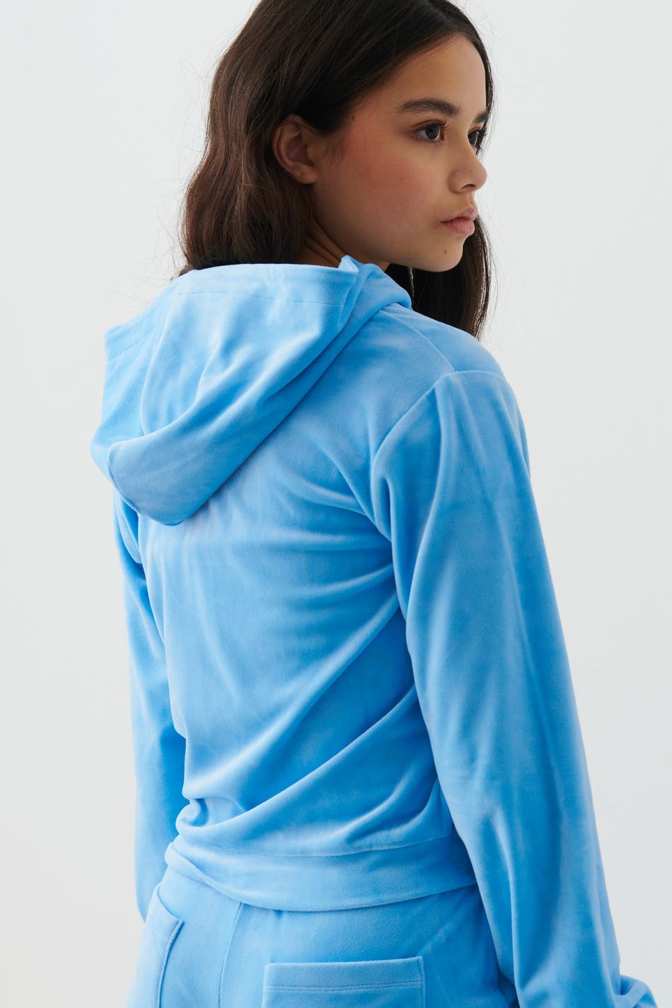 Soft hoodie in velour with zip closure in front. The hoodie is blue and has a hood at the back. It has a cropped length and elastic at the bottom and on the sleeve ends.