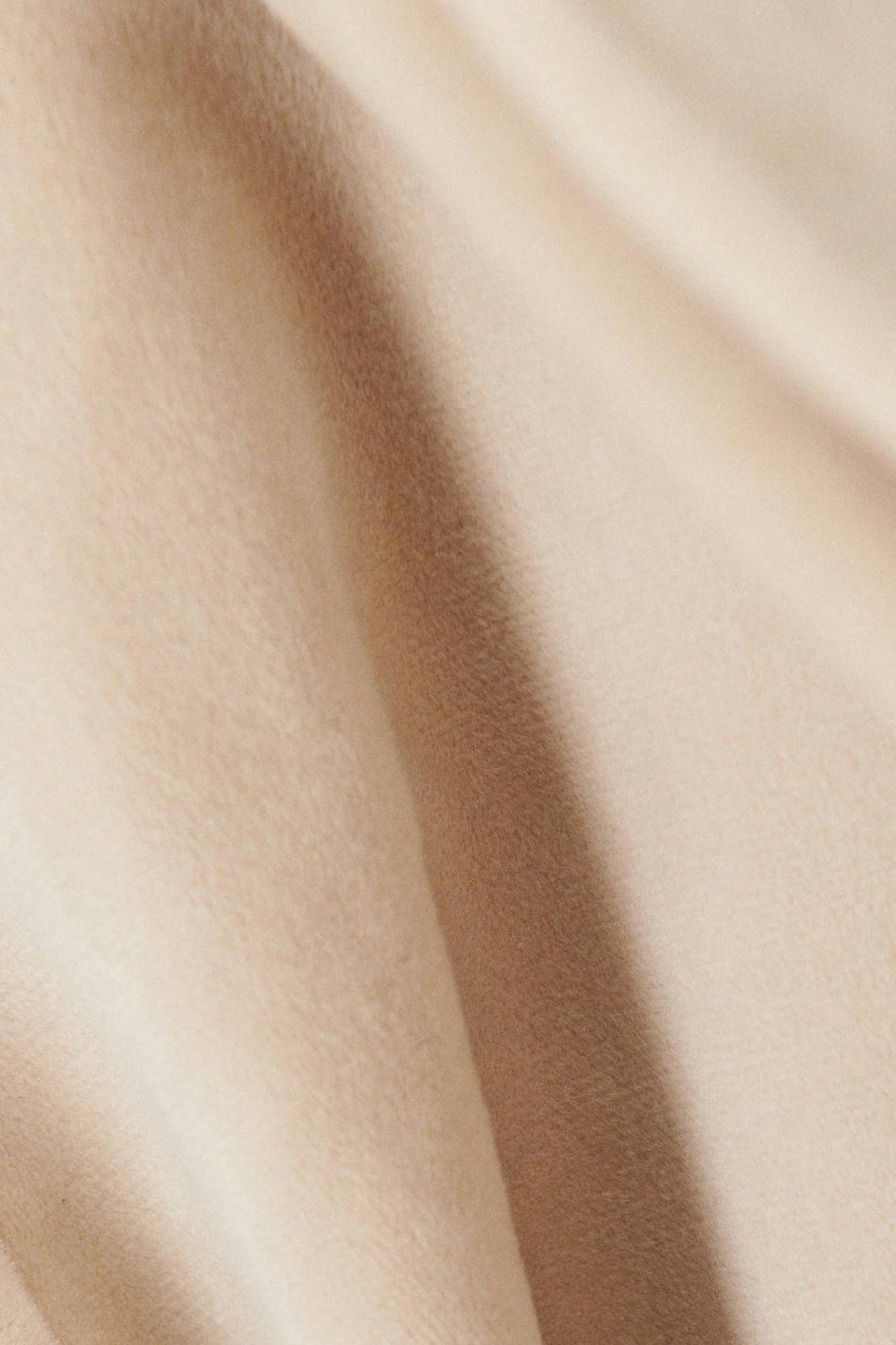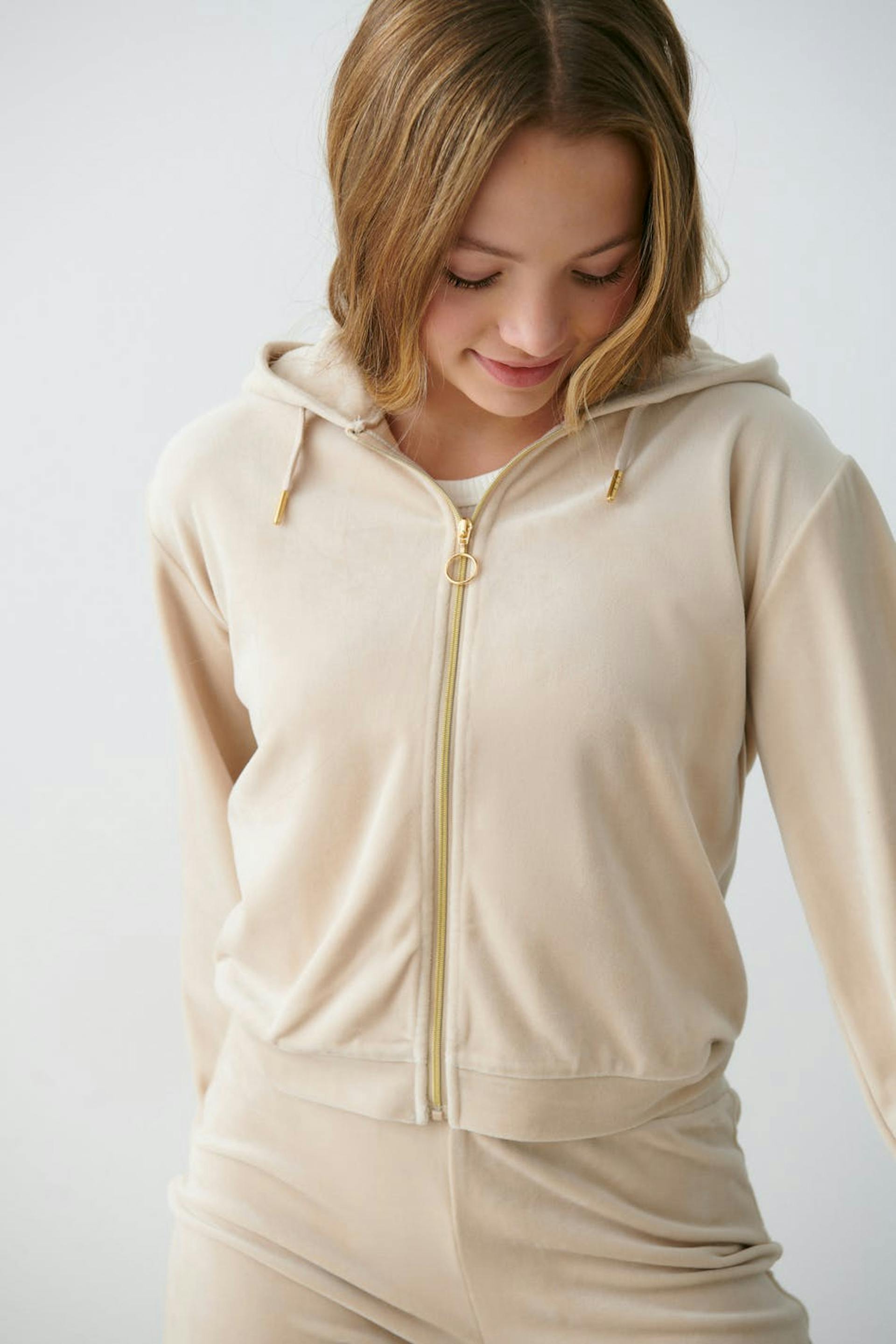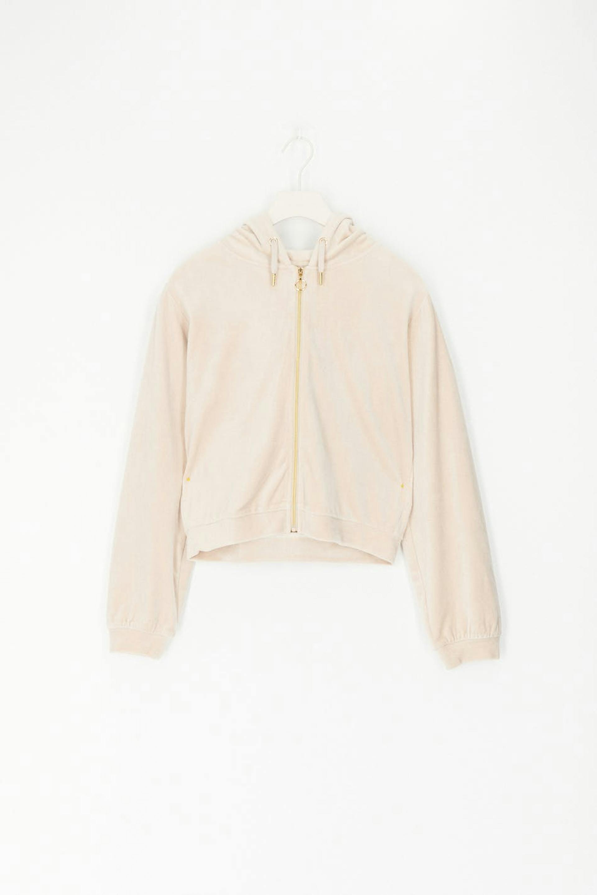 Soft hoodie in velour with zip closure in front. The hoodie is beige and has a hood at the back. It has a cropped length and elastic at the bottom and on the sleeve ends.