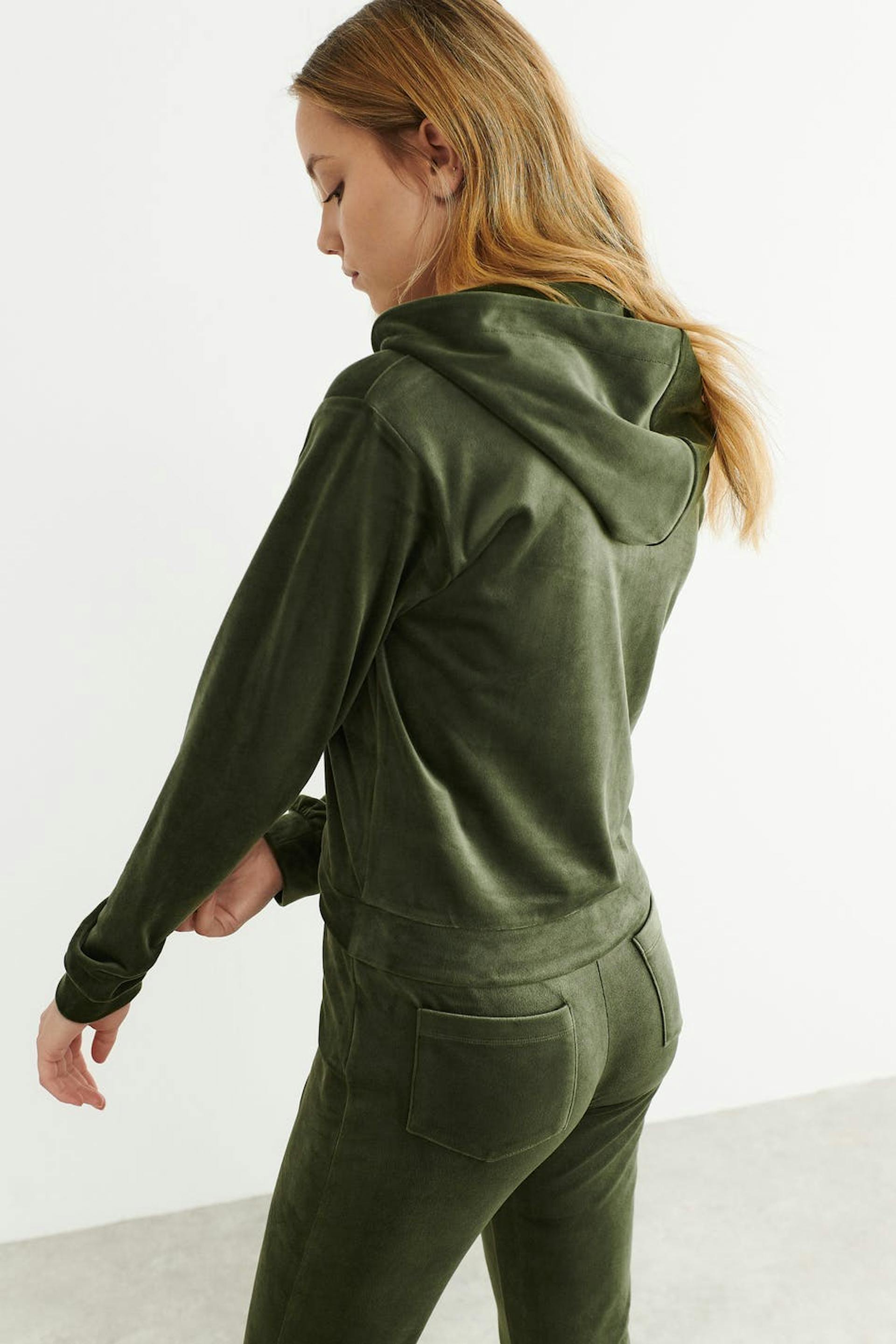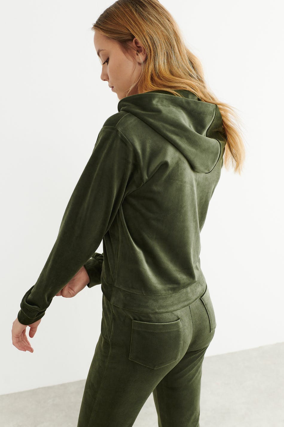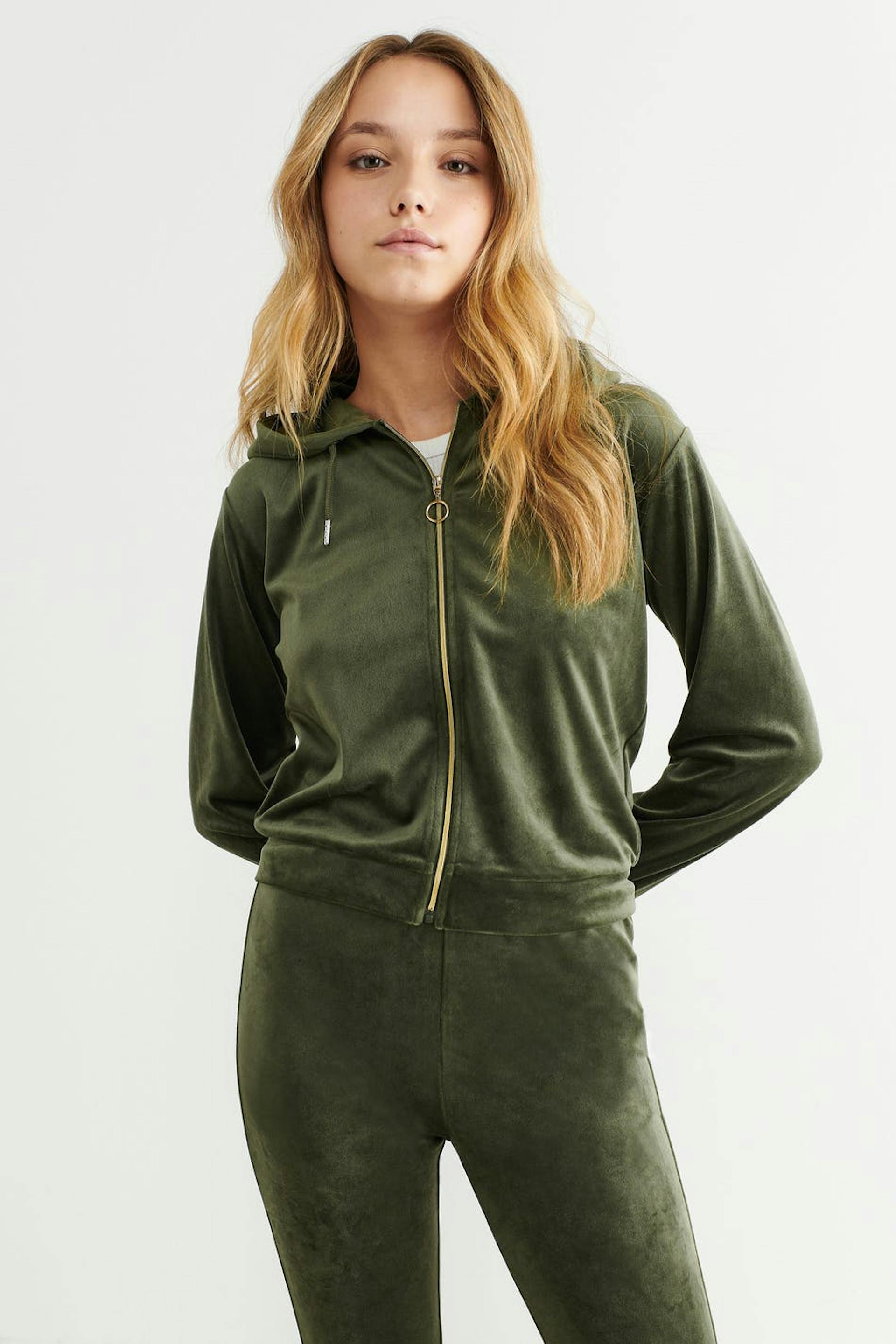 Cosy hoodie in velour with zip closure in front. The hoodie is soft and has a hood at the back. It has a cropped length and elastic at the bottom and on the sleeve ends.
