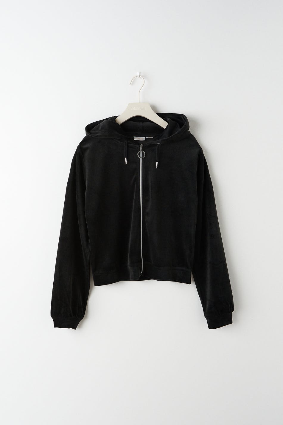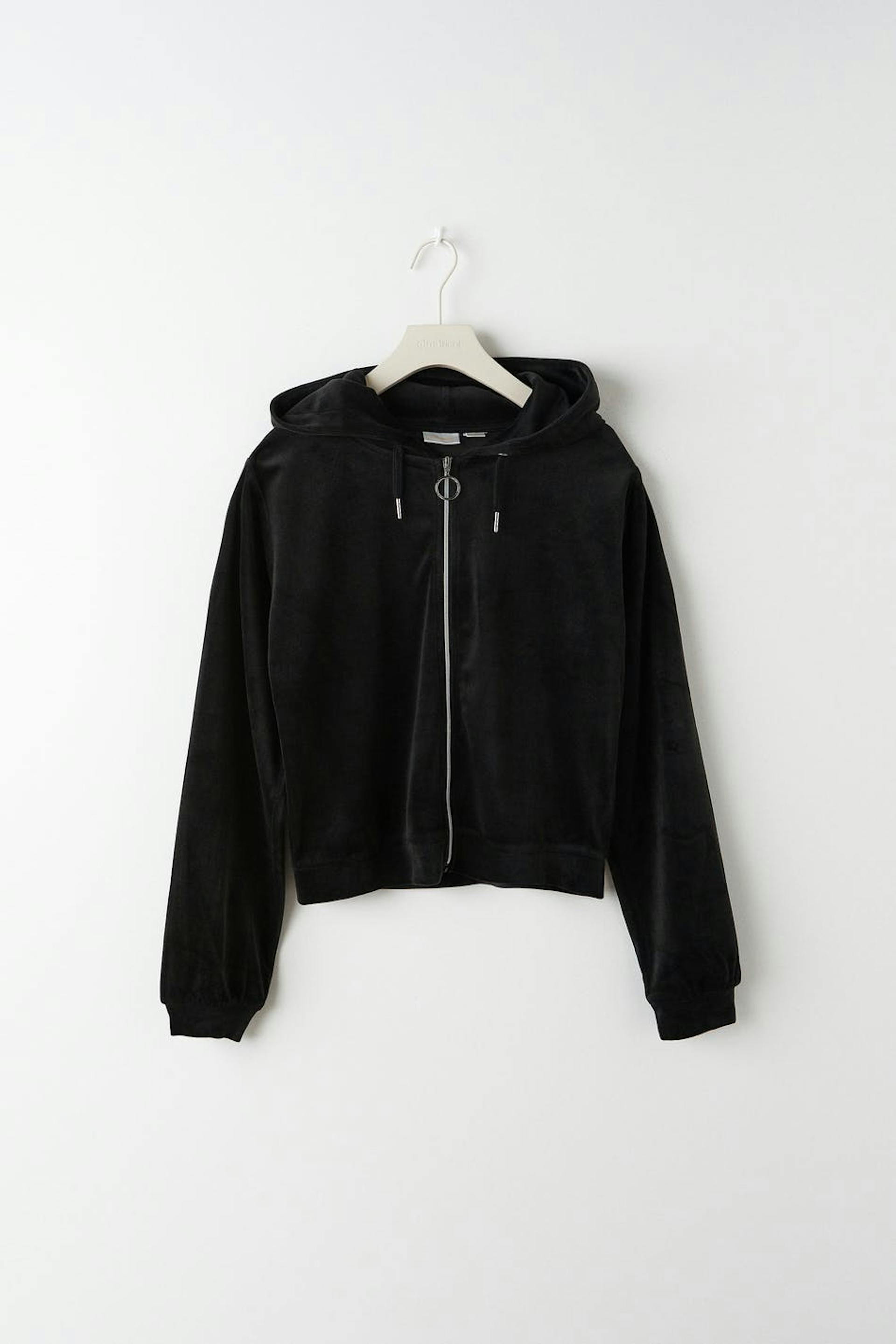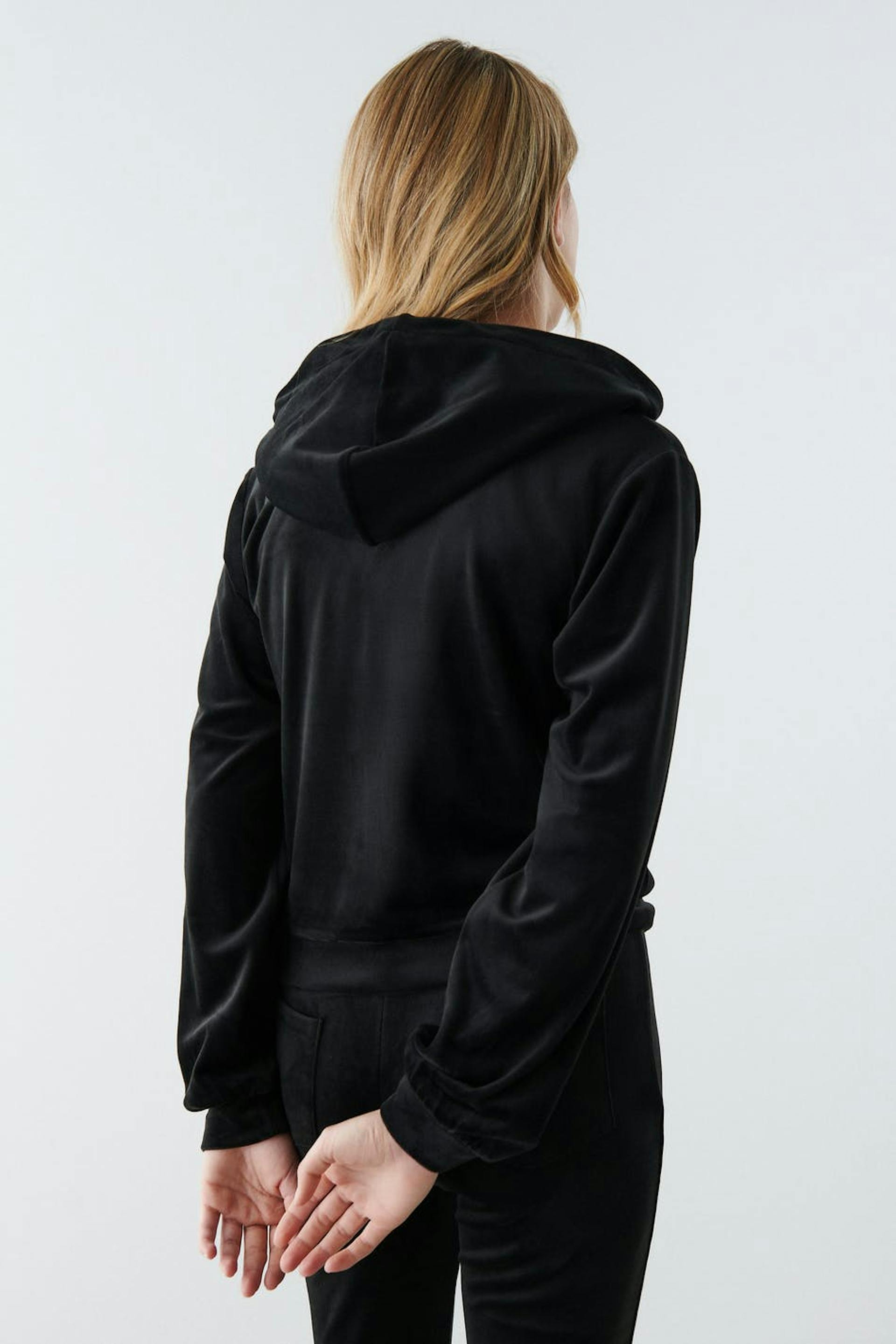 Soft hoodie in velour with zip closure in front. The hoodie is black and has a hood at the back. It has a cropped length and elastic at the bottom and on the sleeve ends.