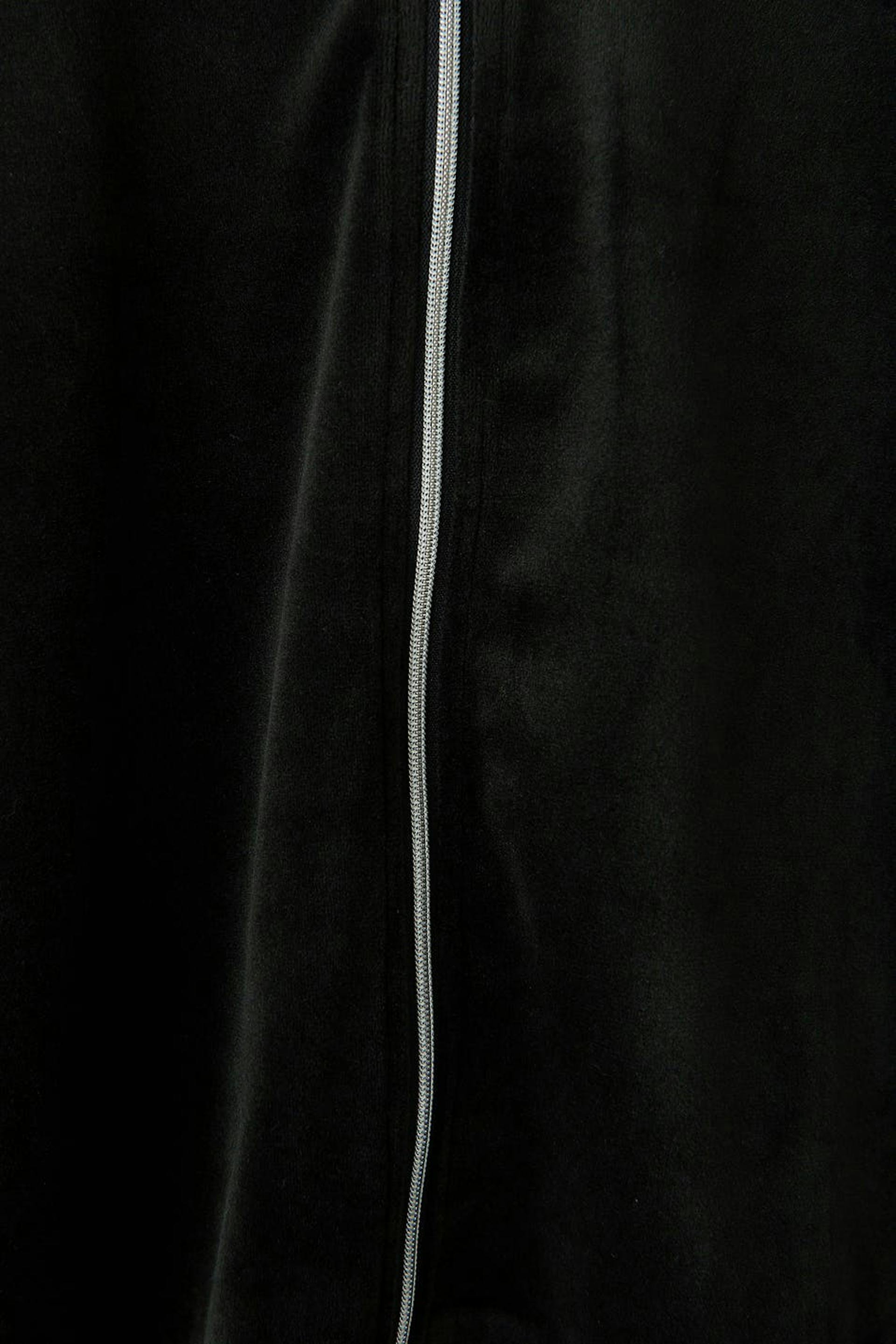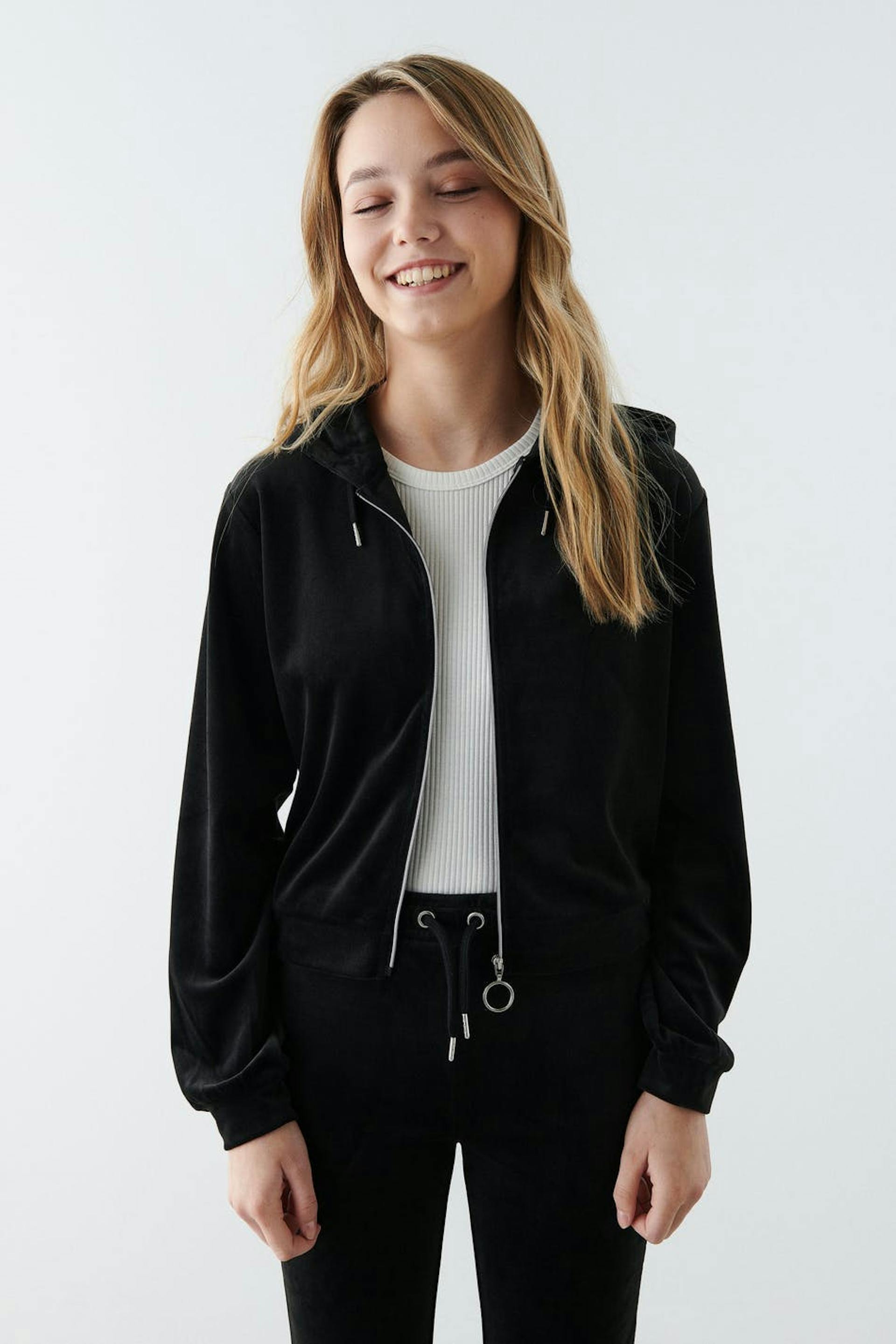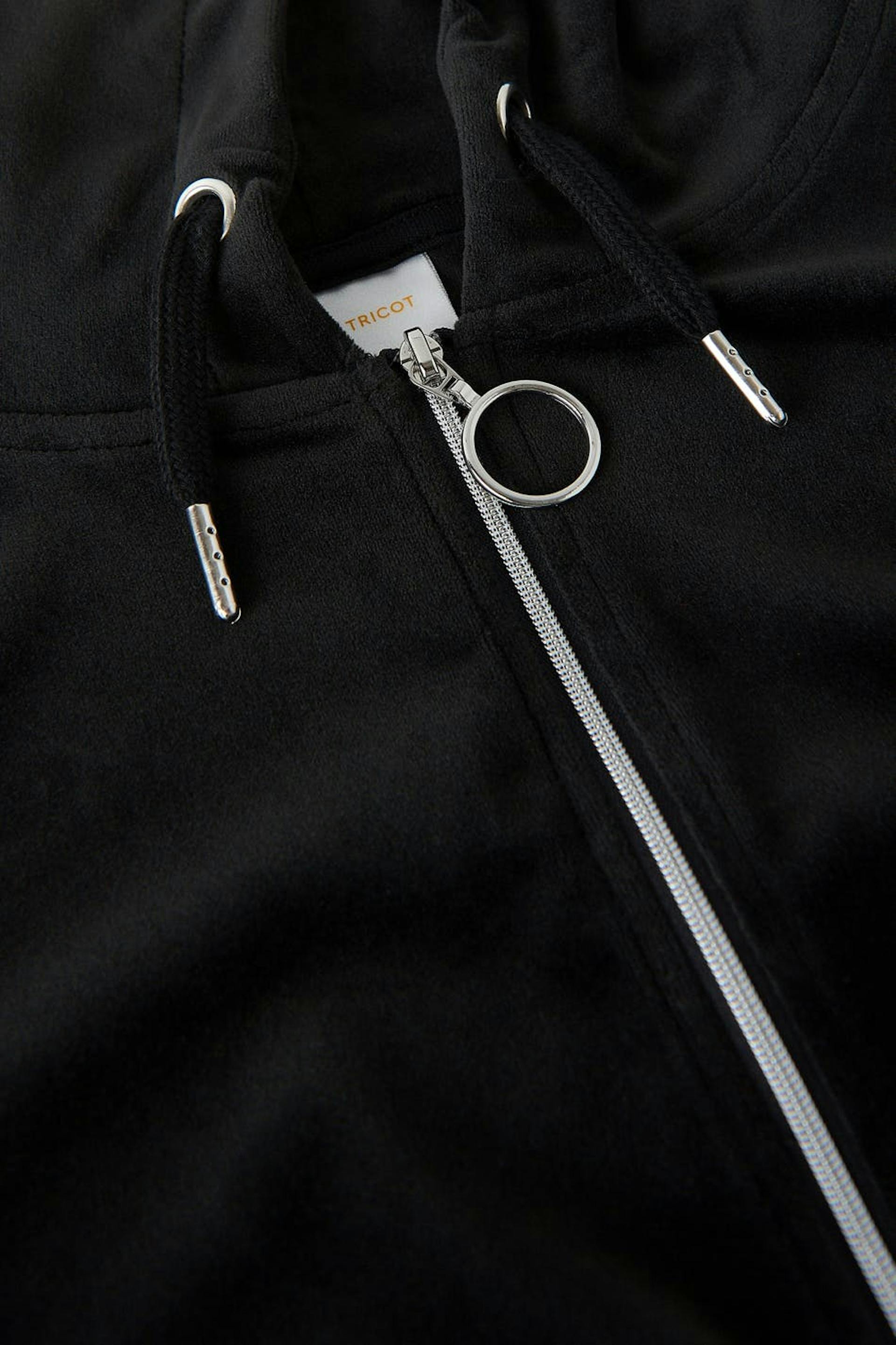 Soft hoodie in velour with zip closure in front. The hoodie is black and has a hood at the back. It has a cropped length and elastic at the bottom and on the sleeve ends.