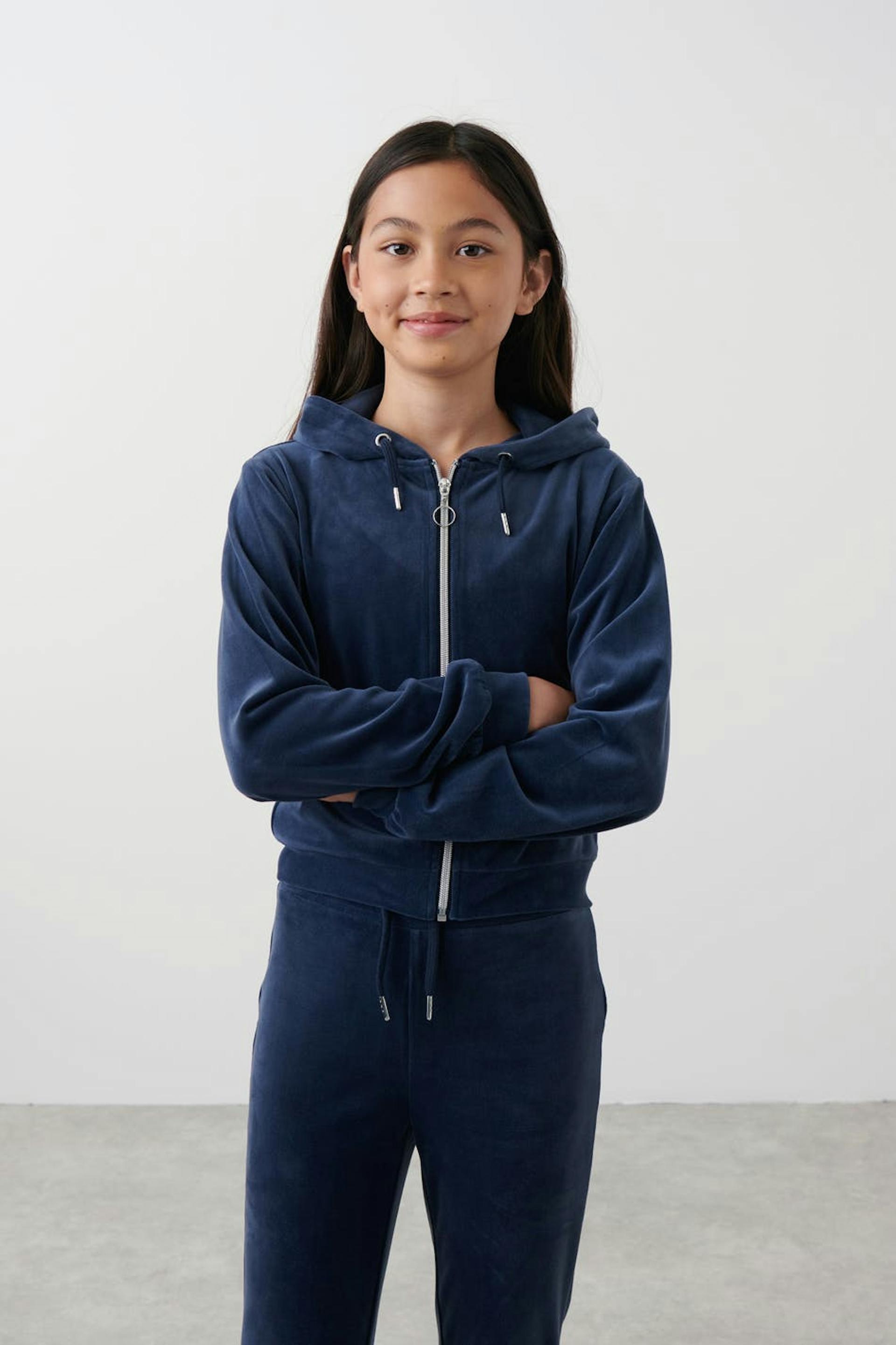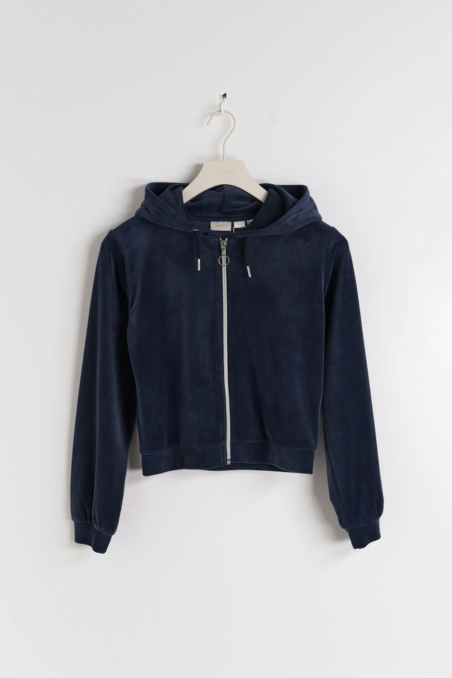 Cropped hoodie in velour with zip closure at the front. The hoodie is blue and has long sleeve with cuff.