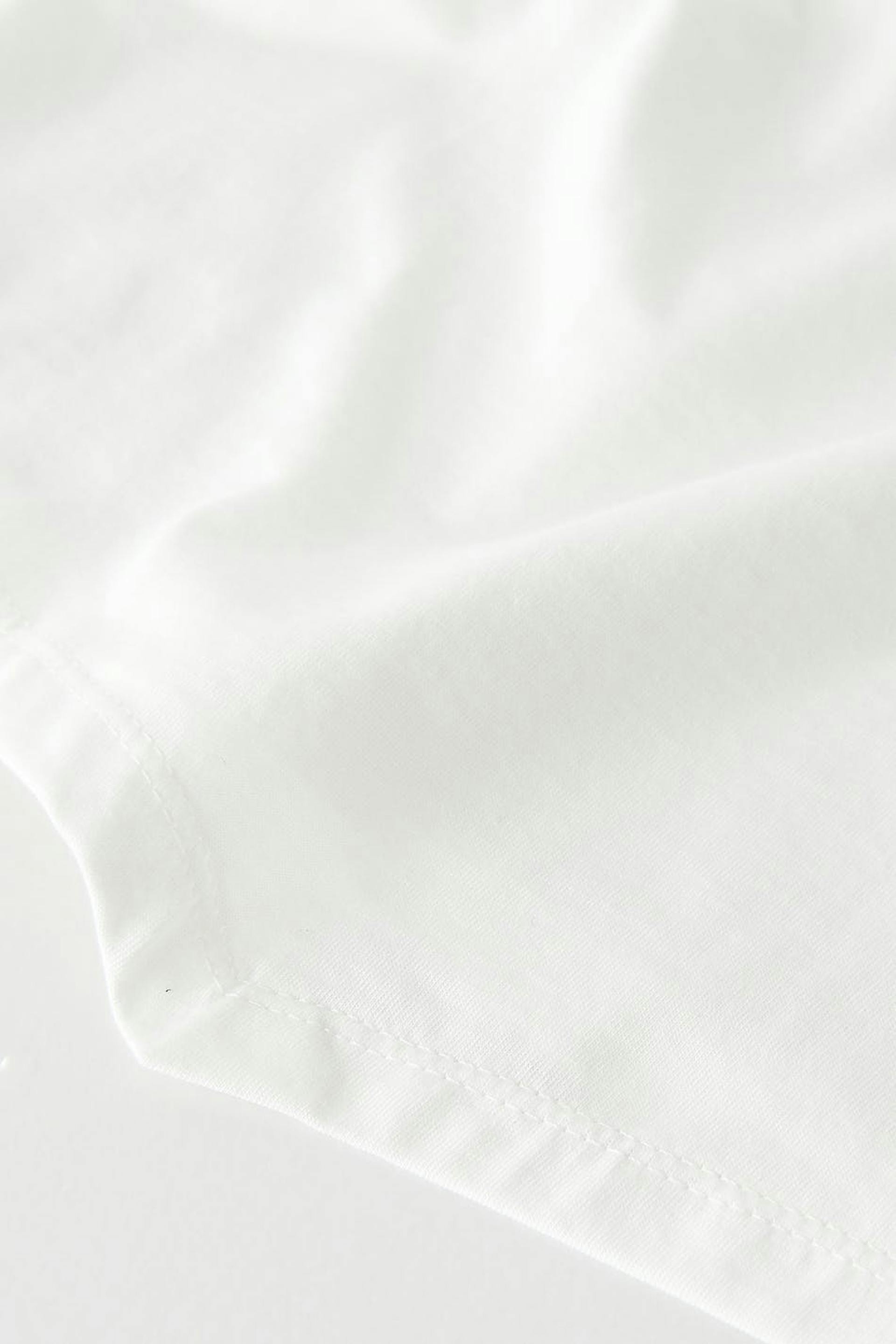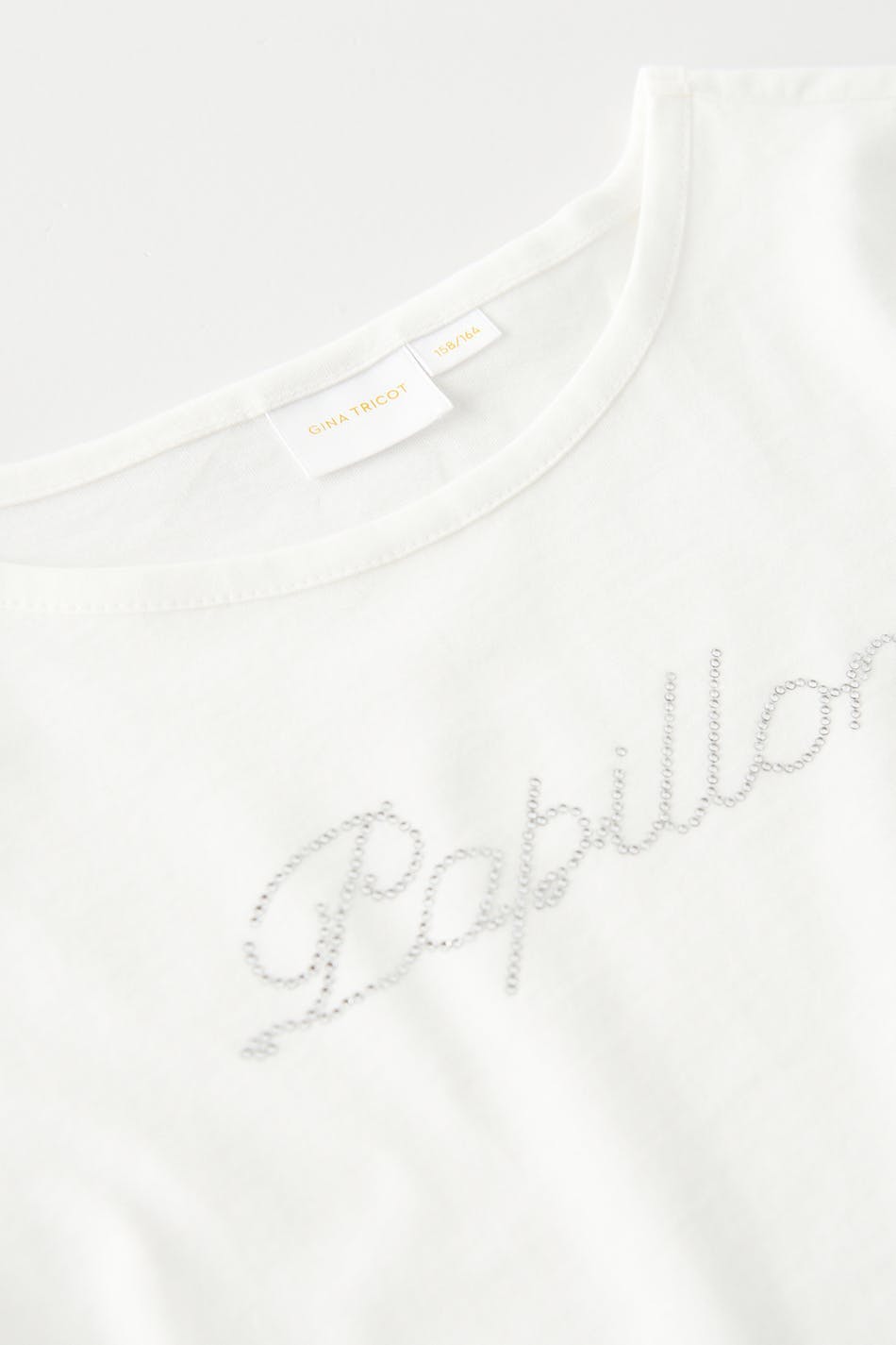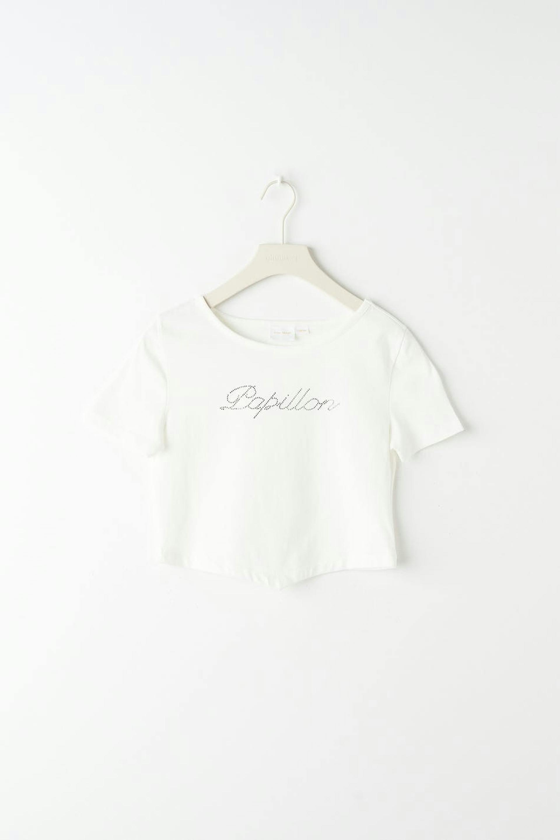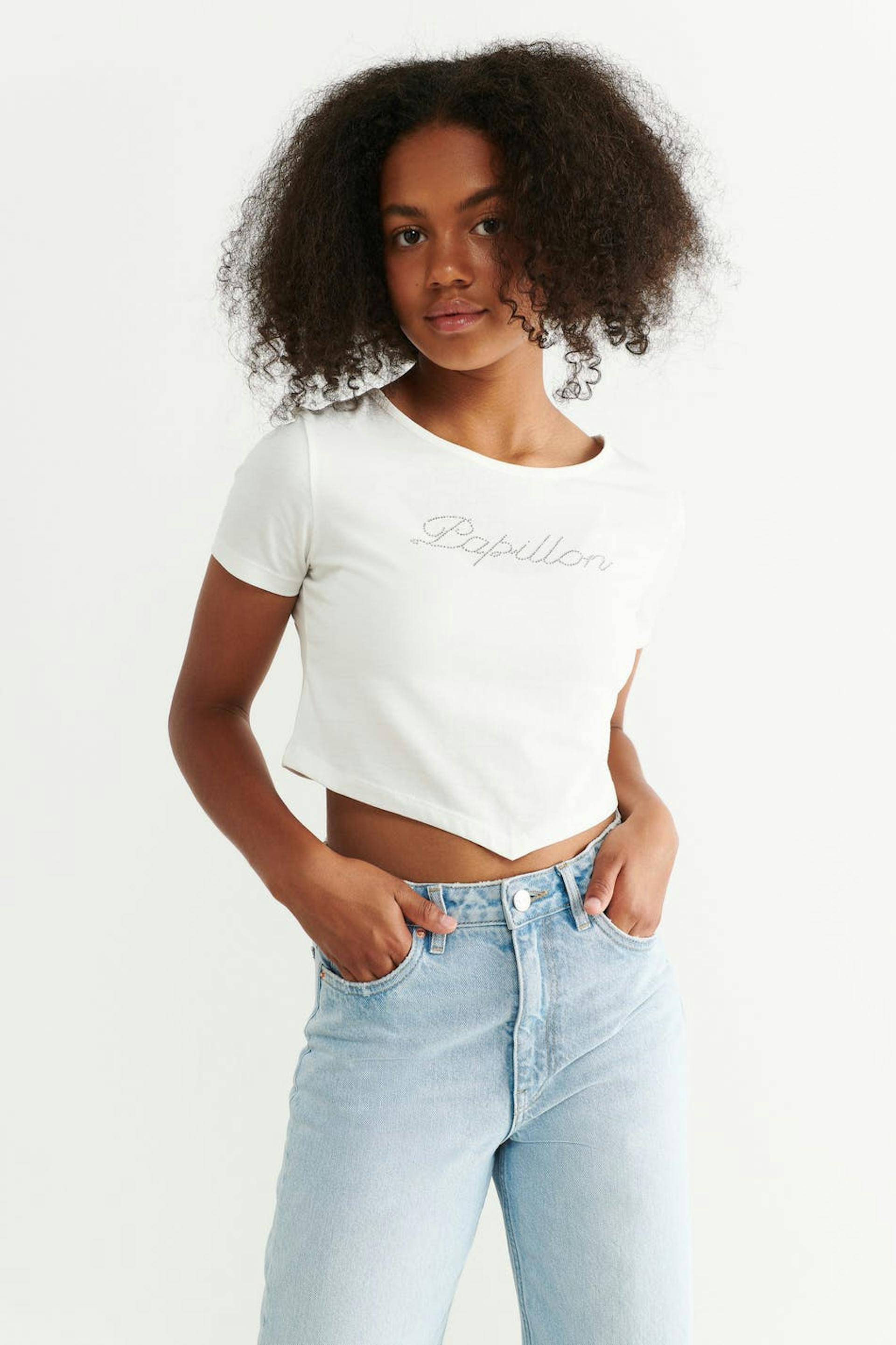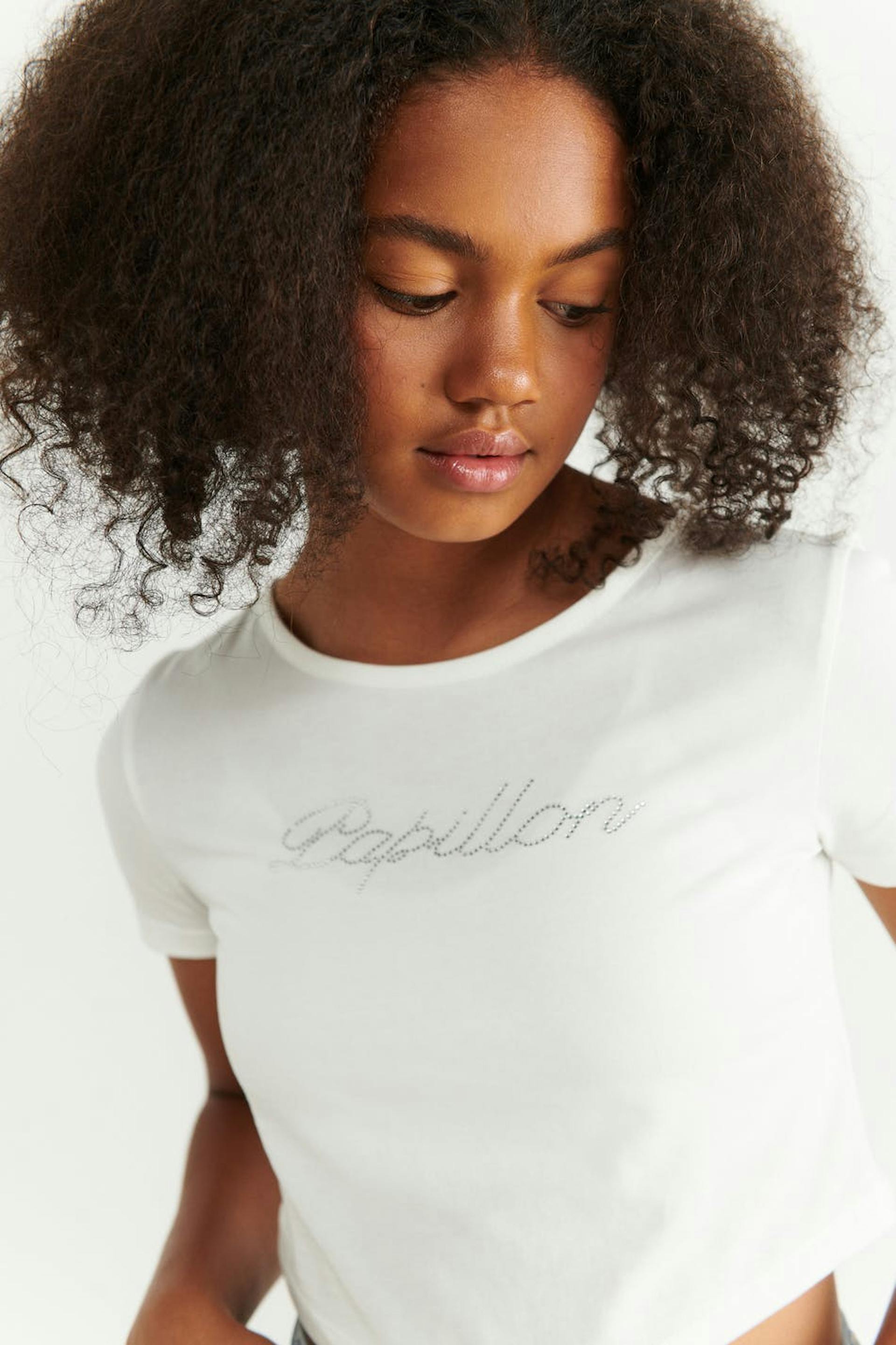 Cropped t-shirt in soft jersey with rhinestone embellishment. The t-shirt is white and has fitted fit with a v-shaped edge at the front.