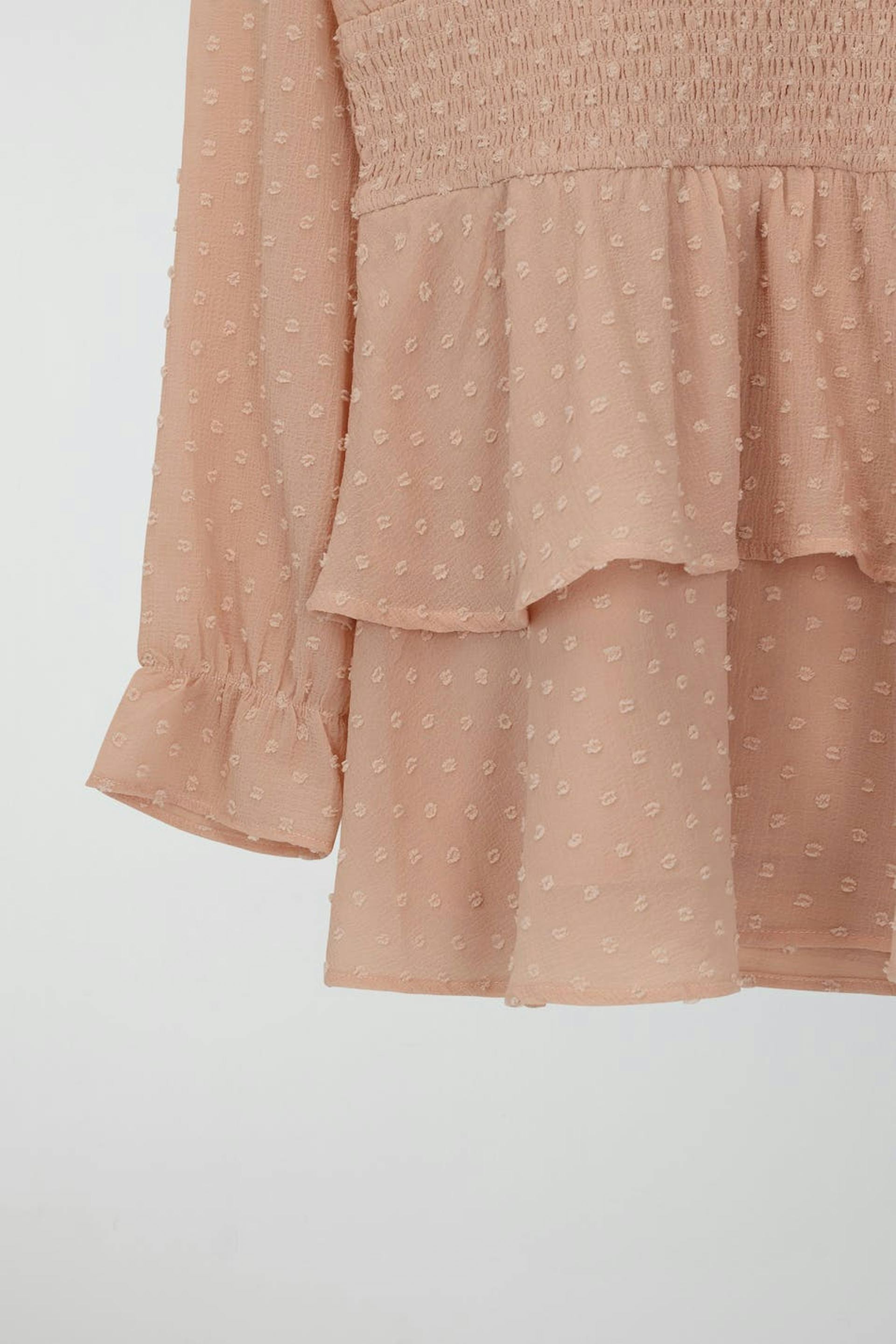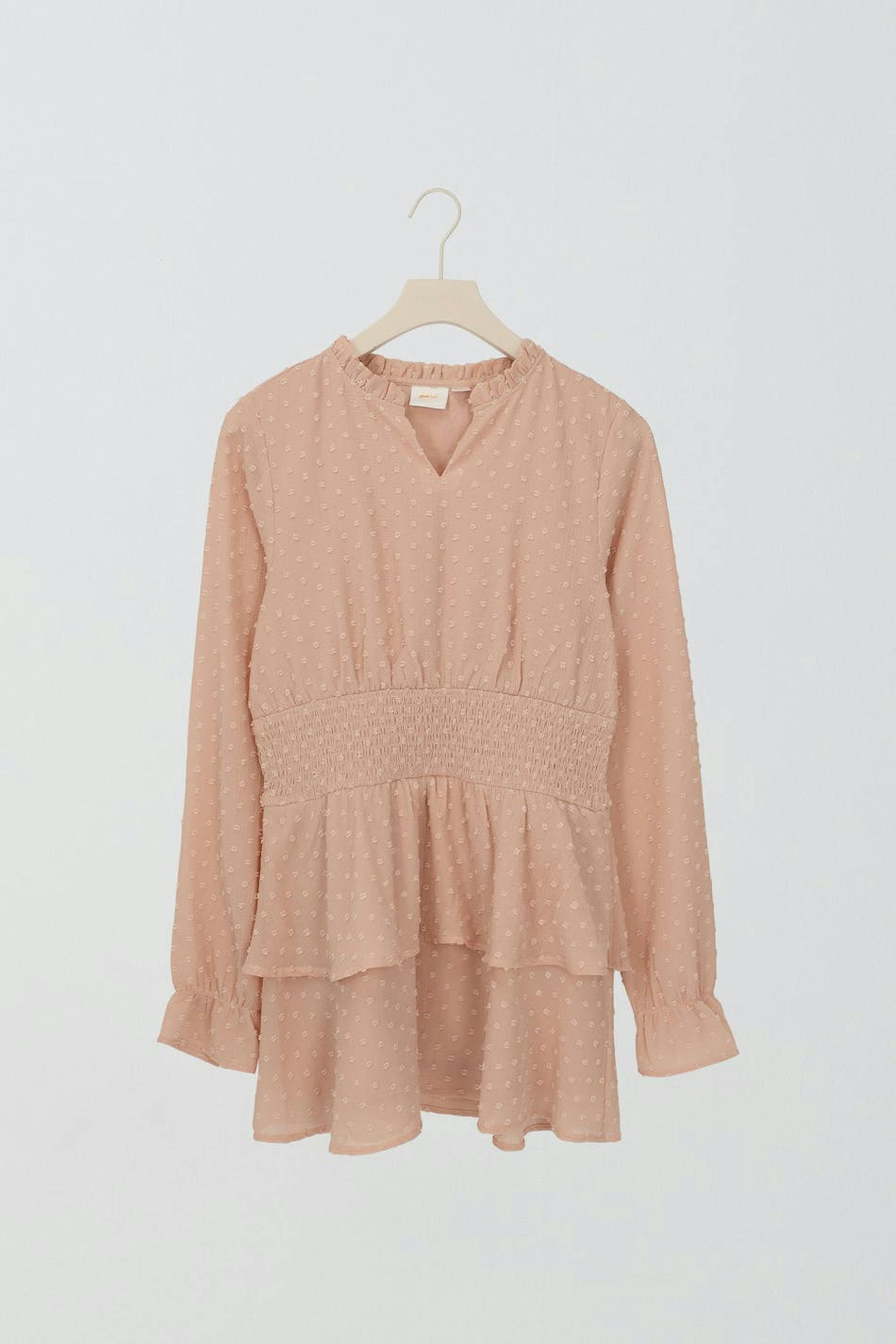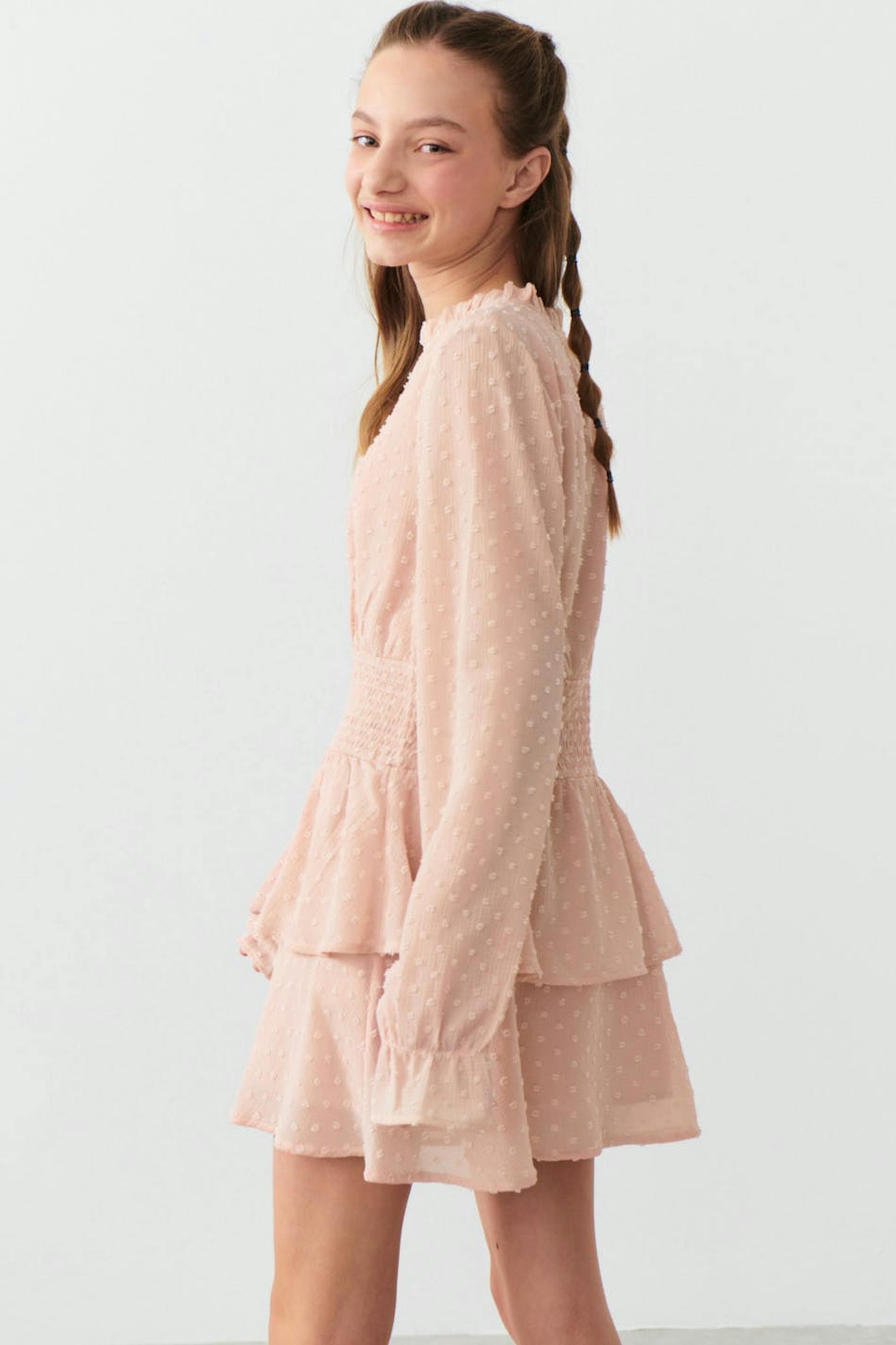 Dotted dress by Gina Tricot Young with frills around the neckline. The dress is pink, A-line shaped and long-sleeved. It has smocked waist, frill skirt and voluminous sleeves.