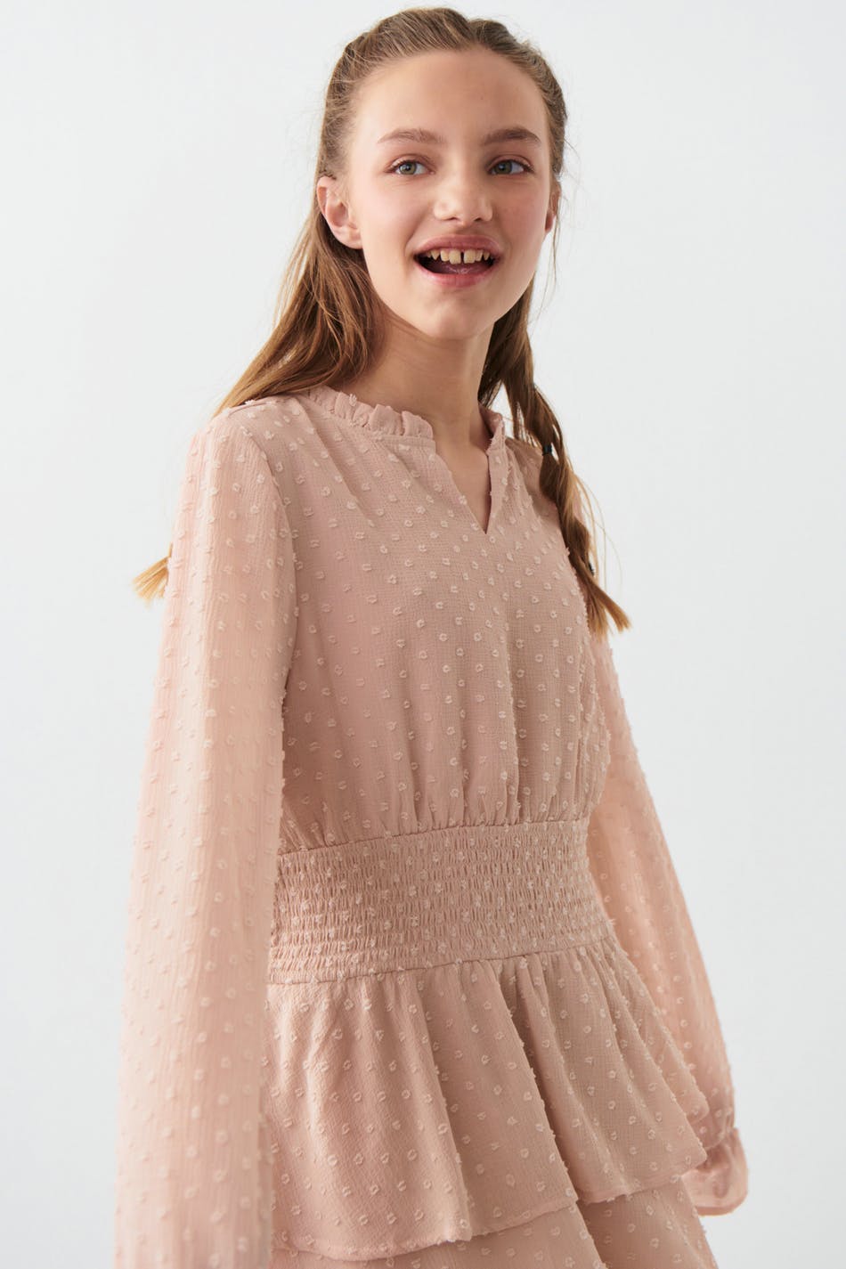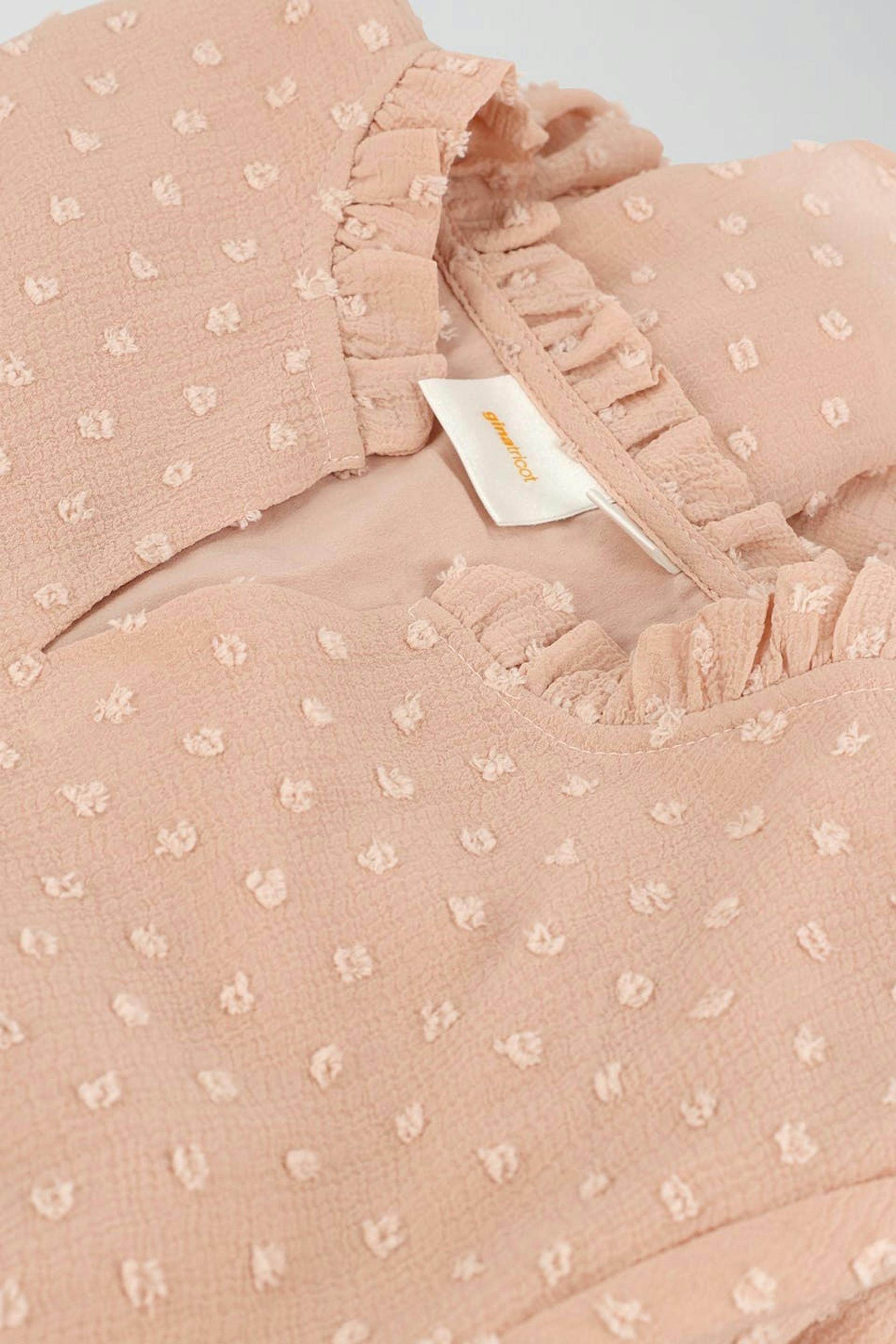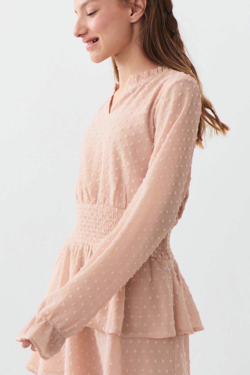Dotted dress by Gina Tricot Young with frills around the neckline. The dress is pink, A-line shaped and long-sleeved. It has smocked waist, frill skirt and voluminous sleeves.