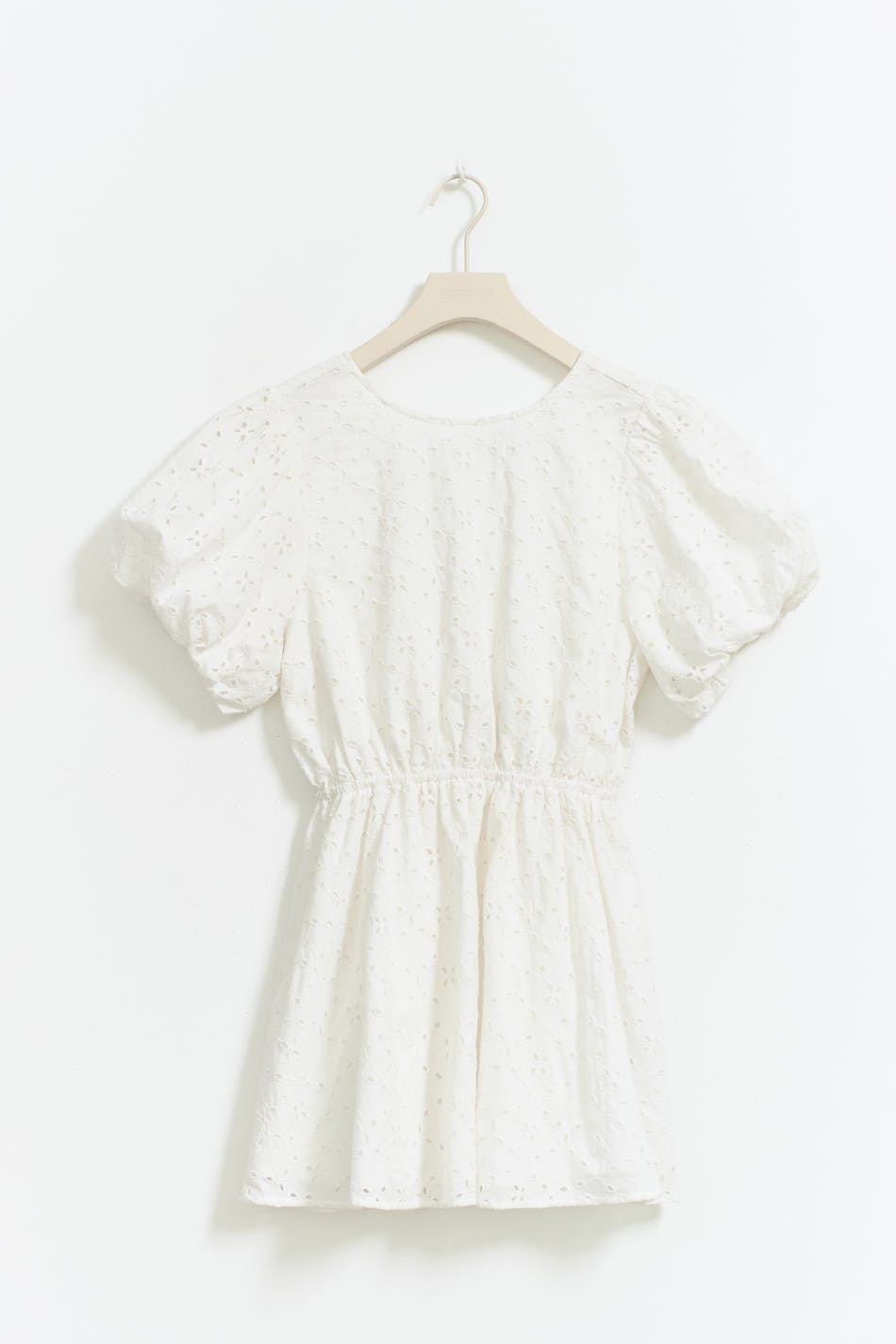 Embroidered dress with short puff sleeve. The dress is white, short and lined. It has elastic at the waist and open back with tie details.
