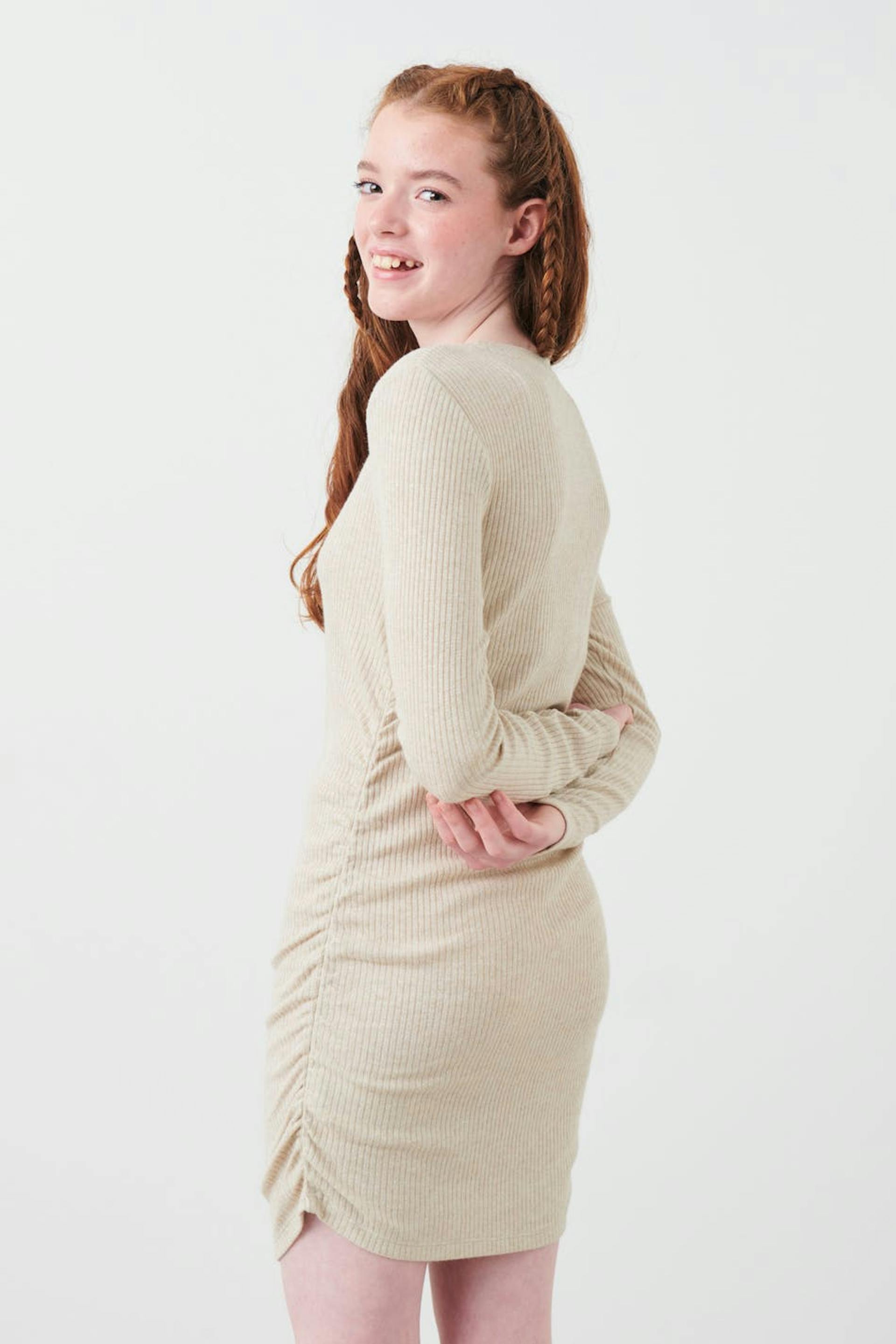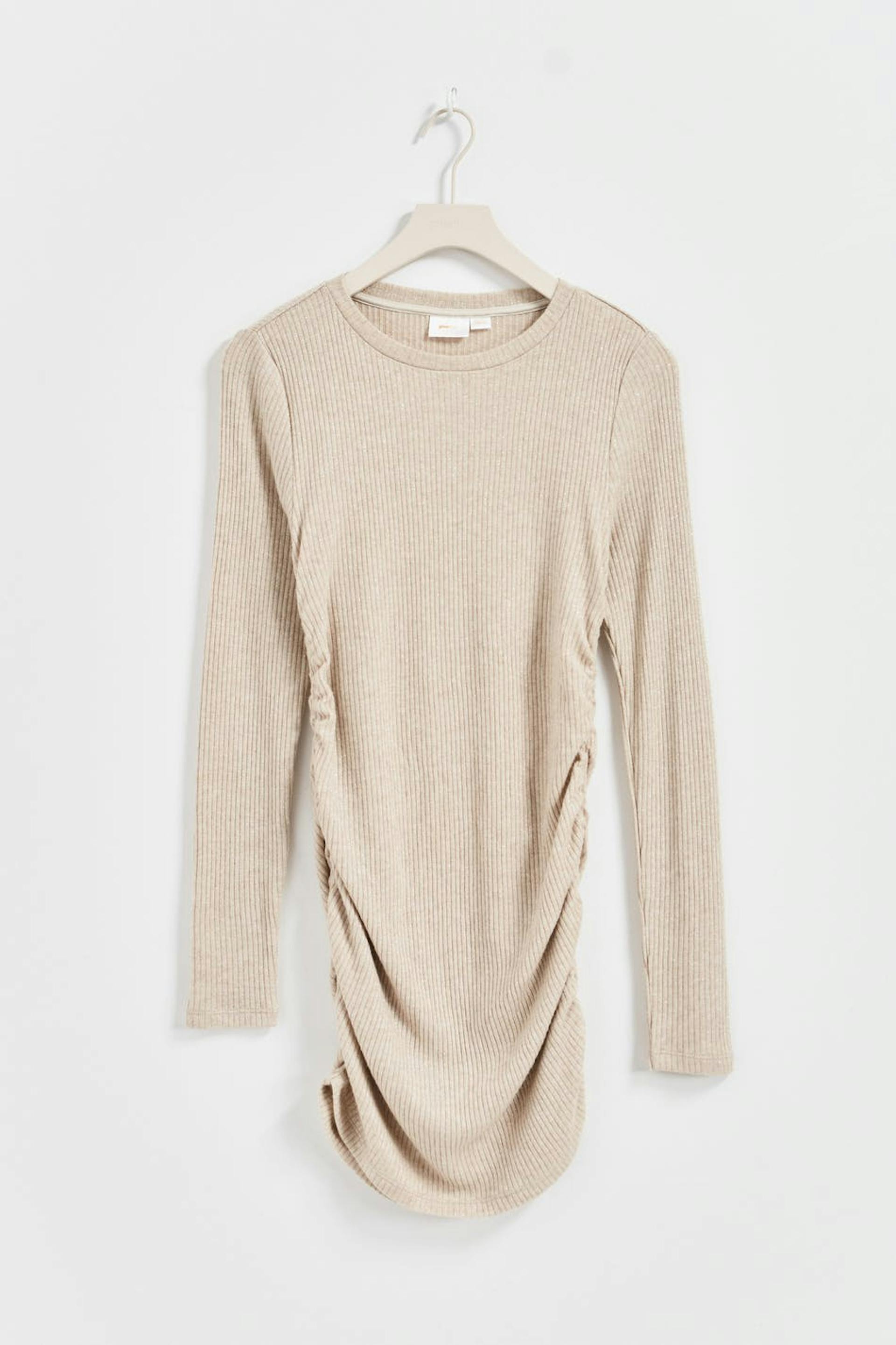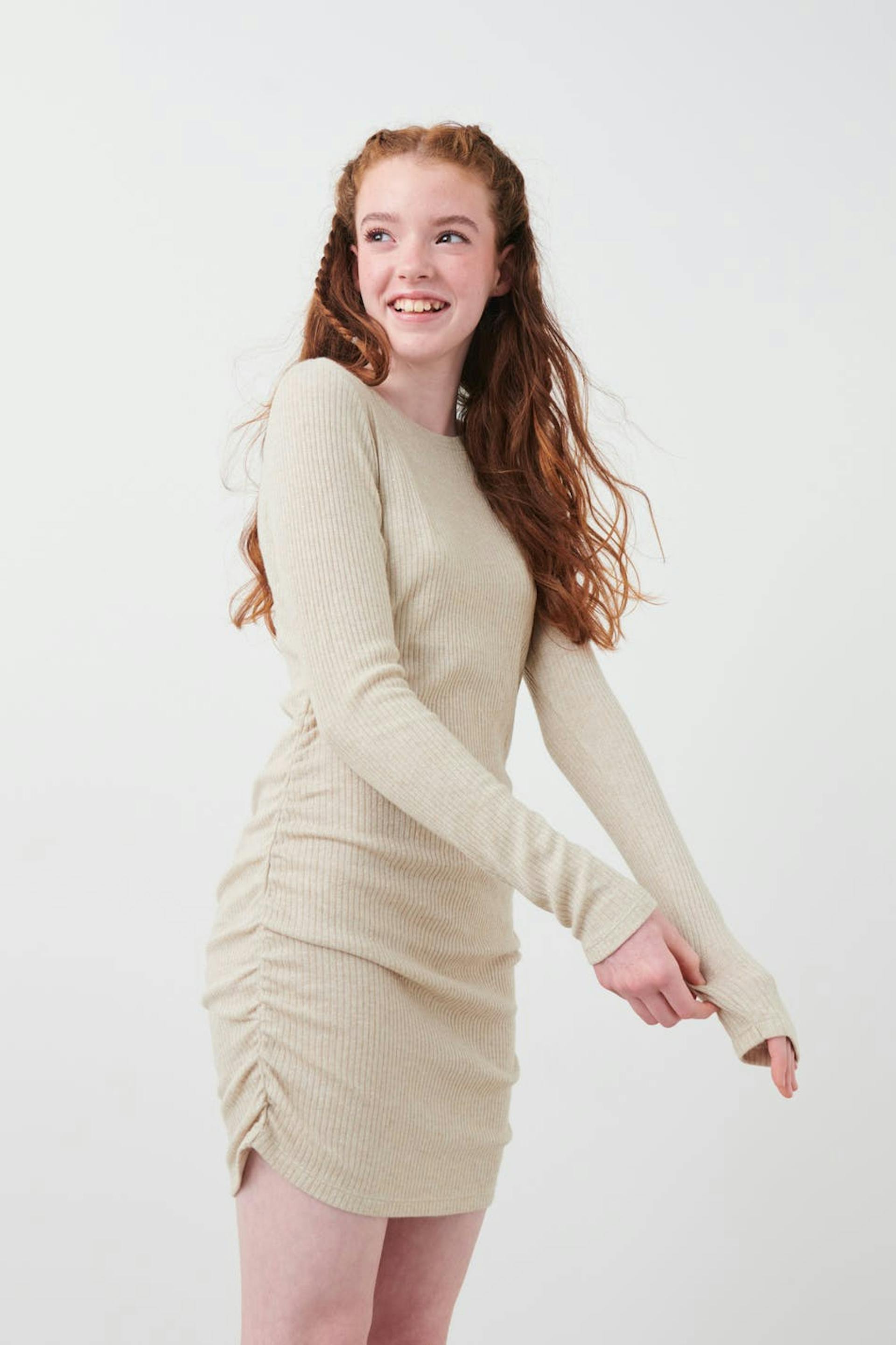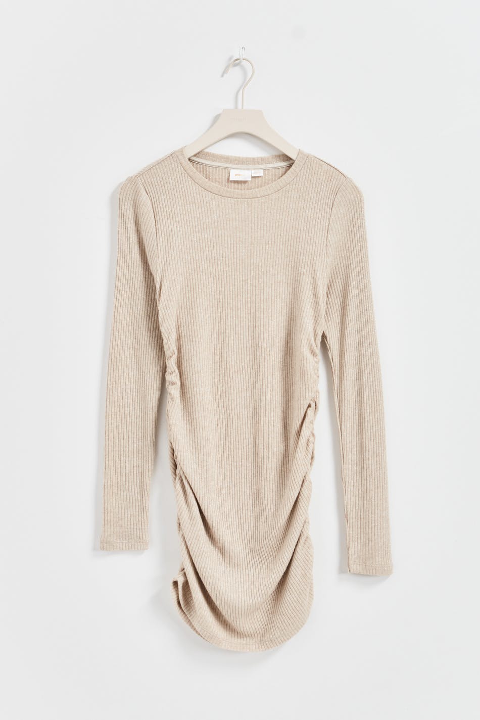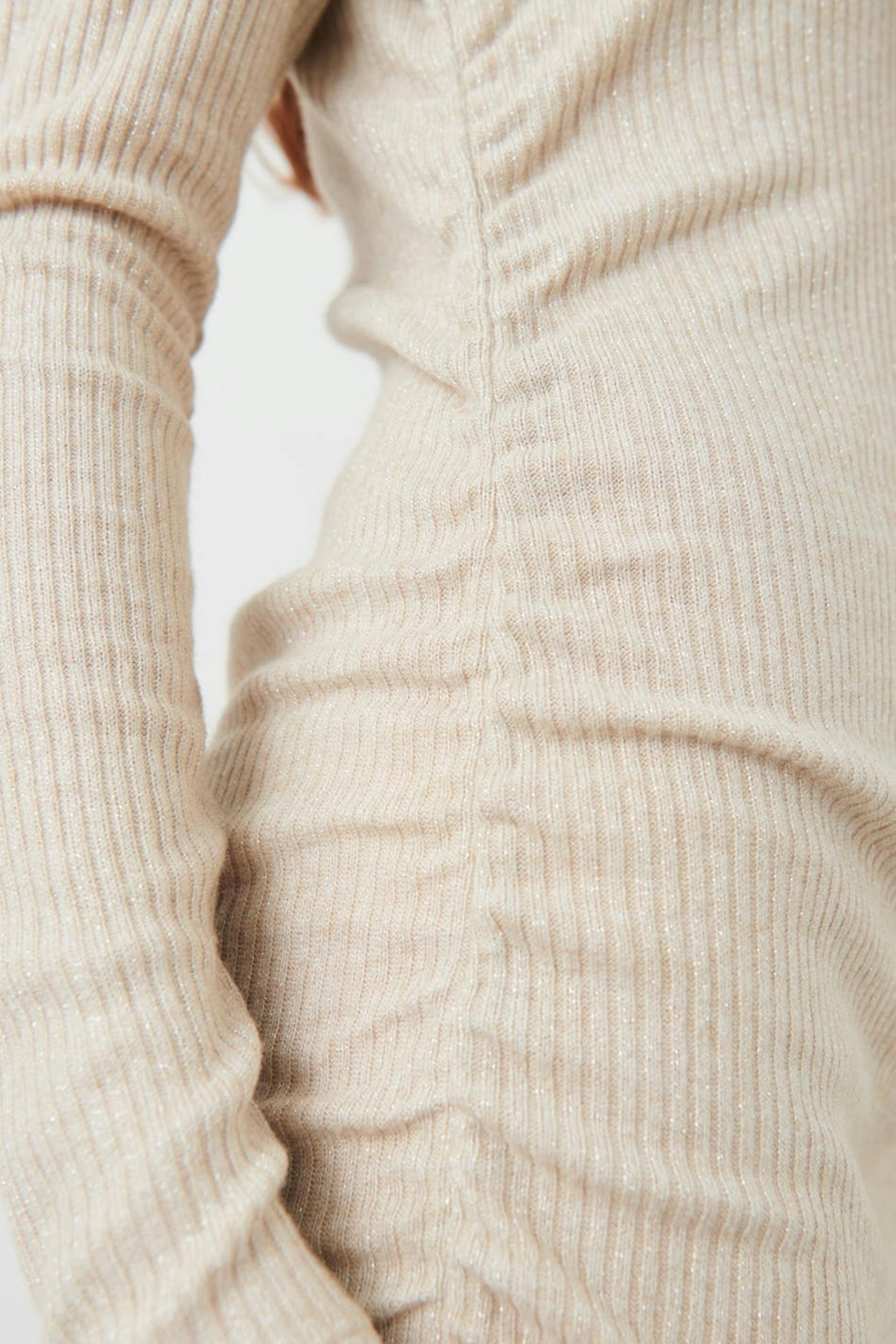 Glittery dress in jersey with ruching in the sides. The dress is beige, long-sleeved and short. It has round neckline, figure-hugging fit and ribbed quality.