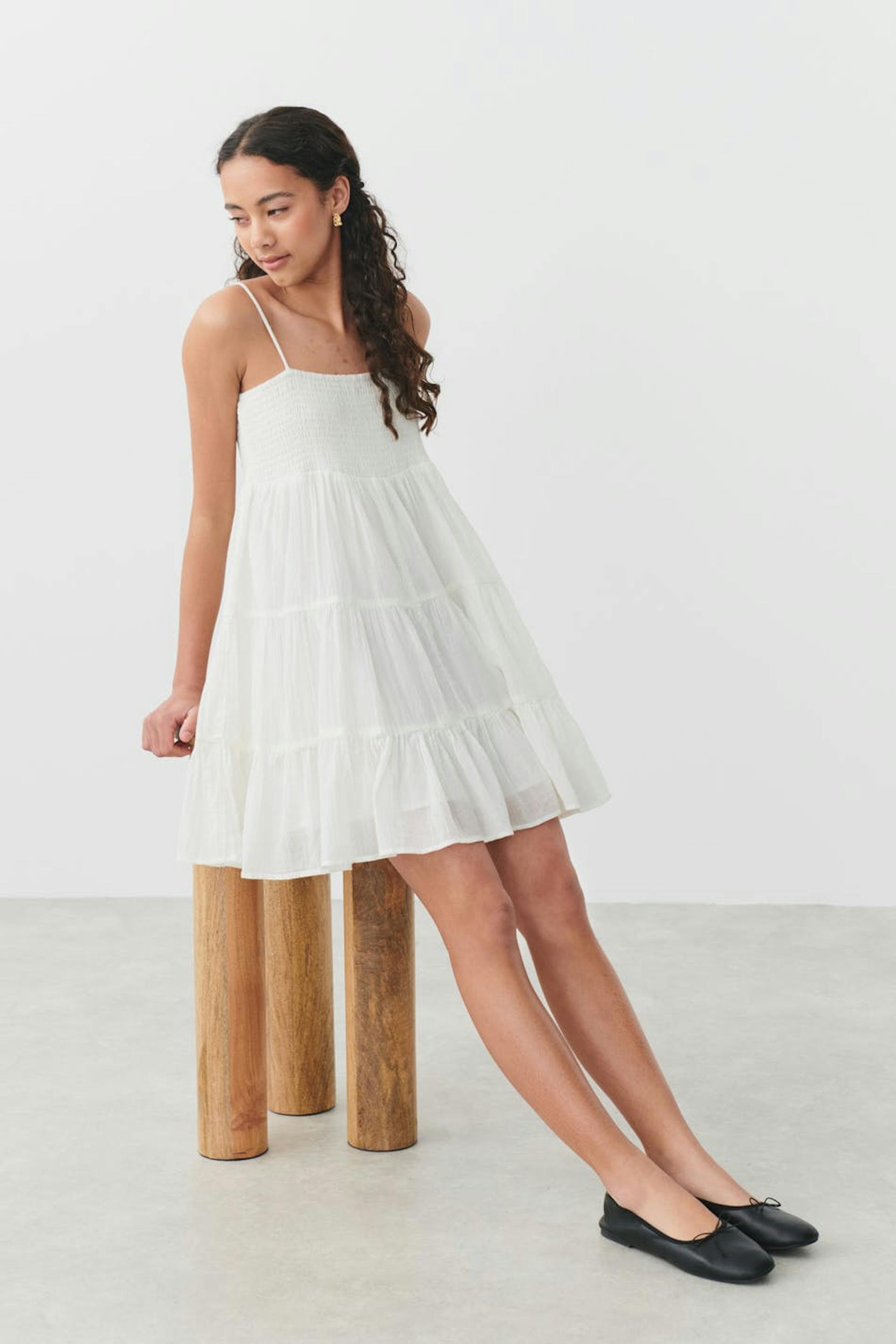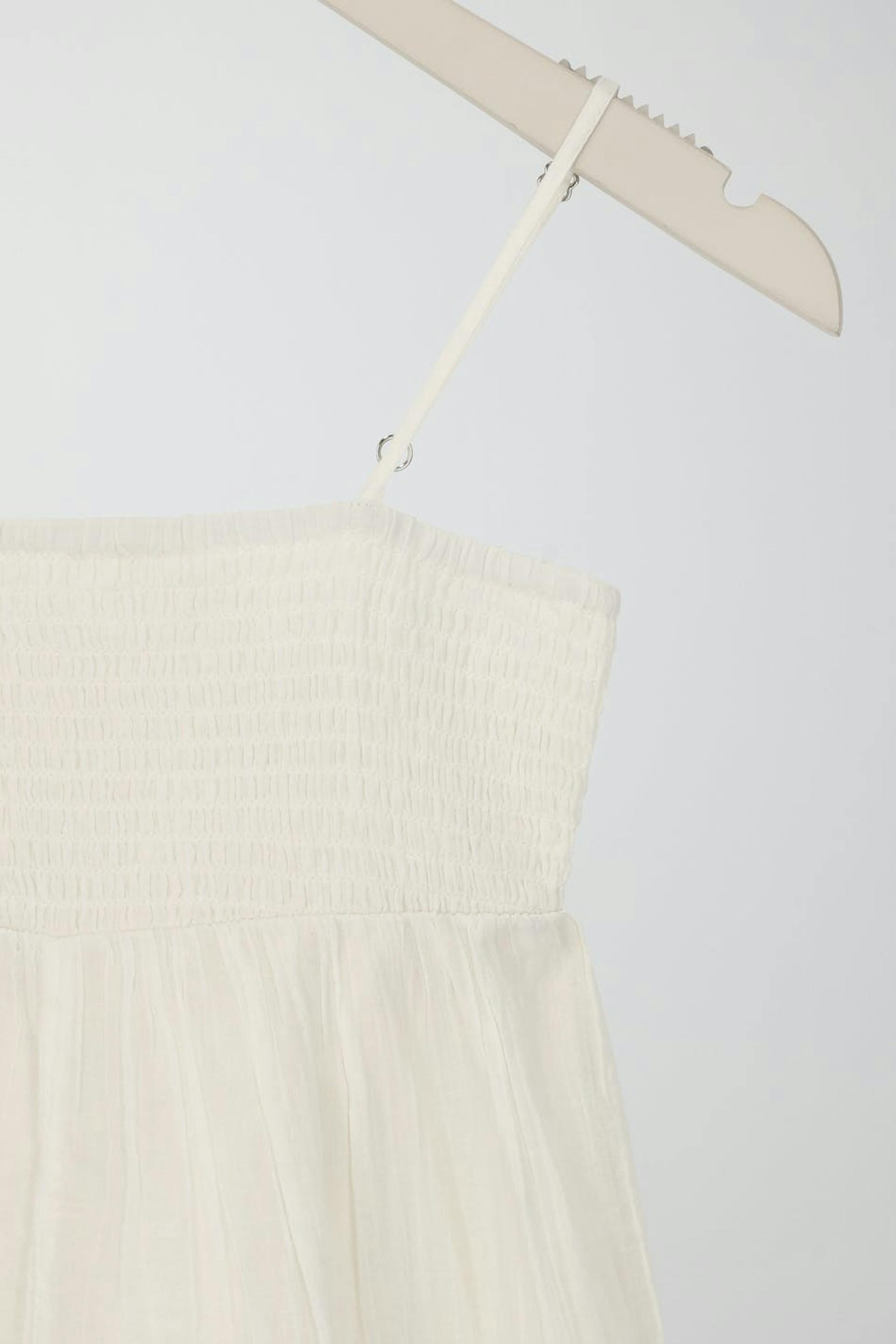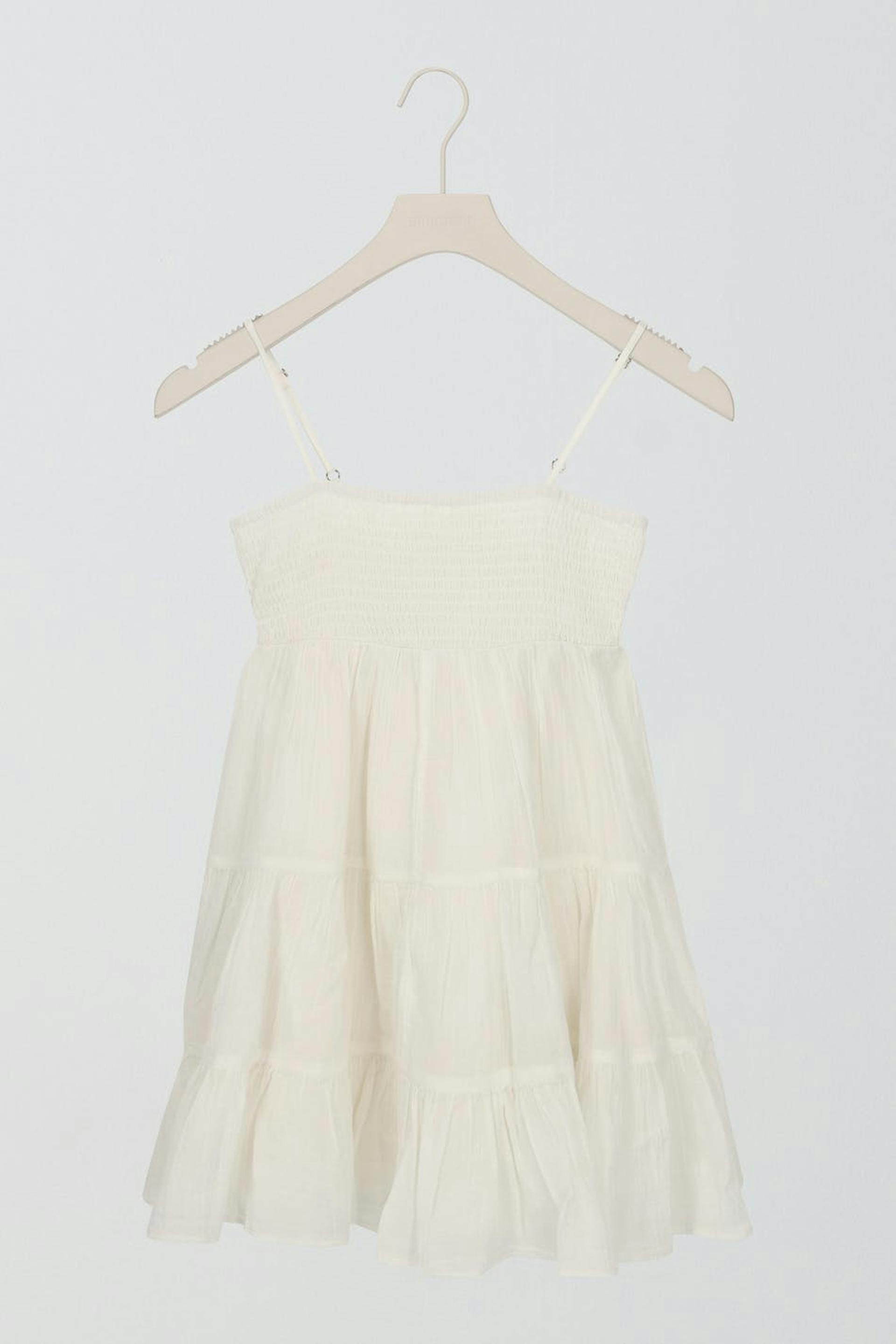 Woven dress by Gina Tricot Young with a smocking on the chest. The dress is white and short and has adjustable straps.