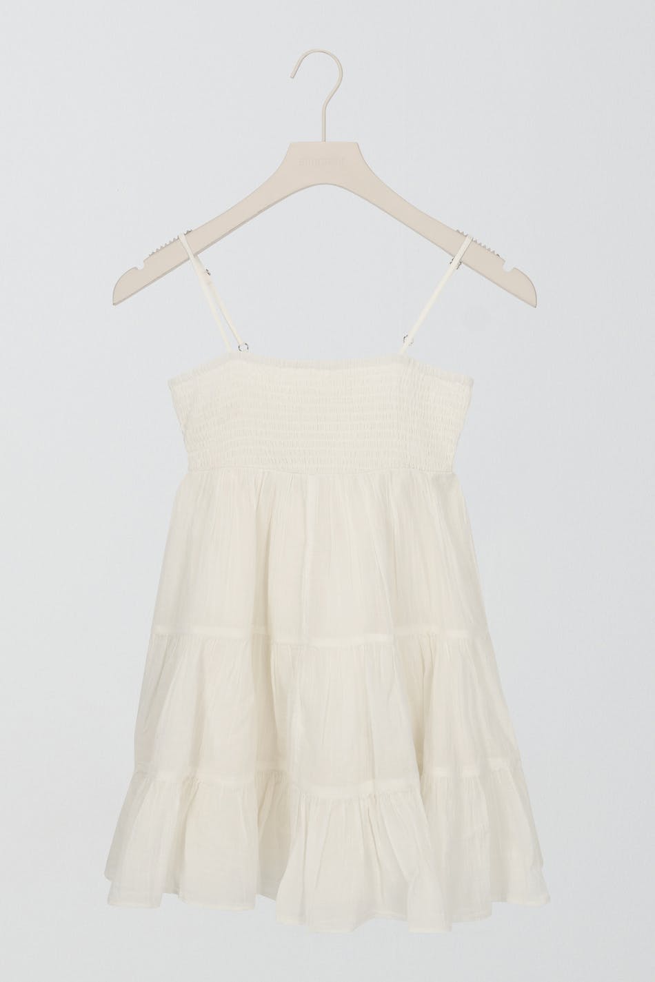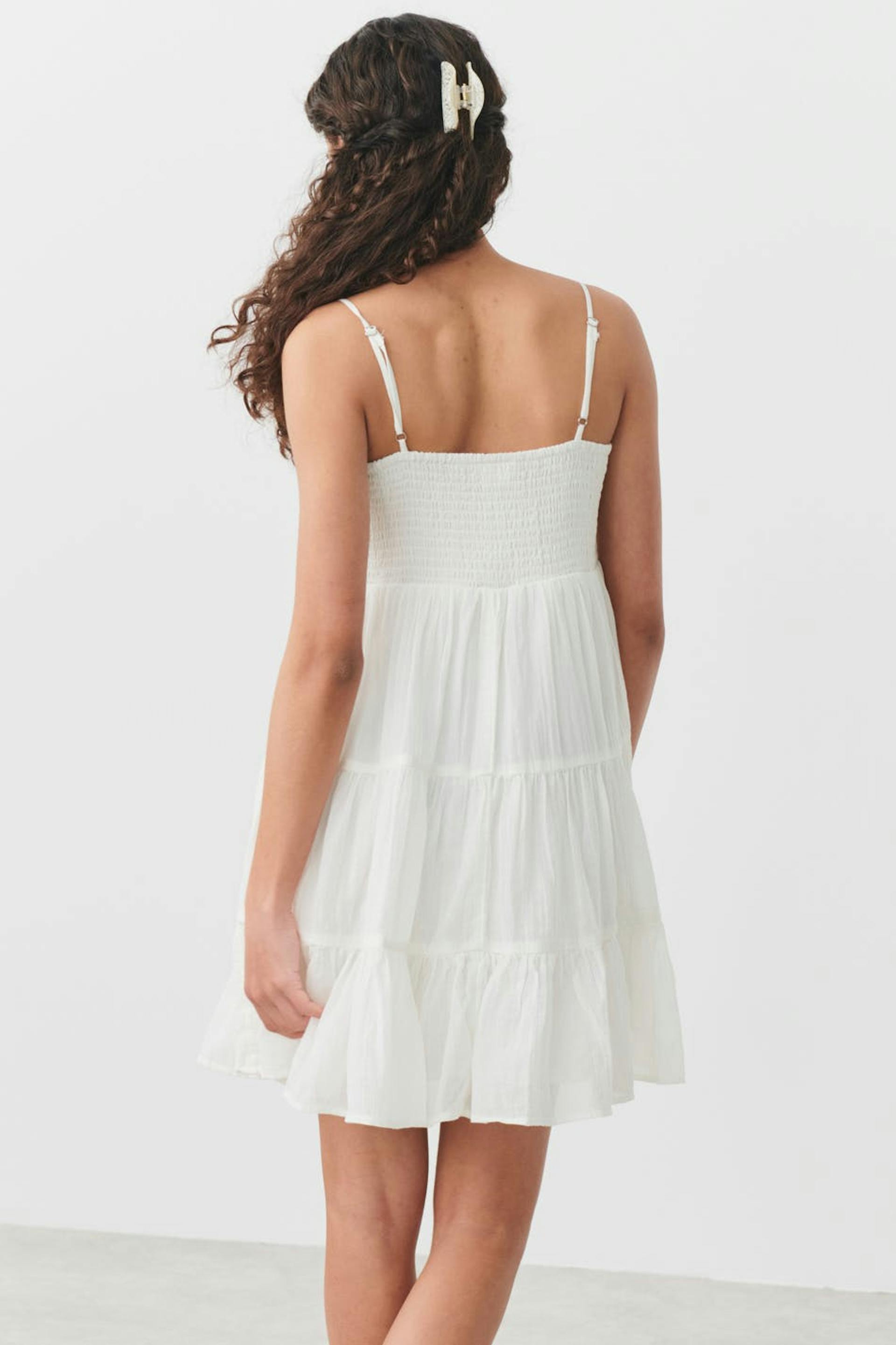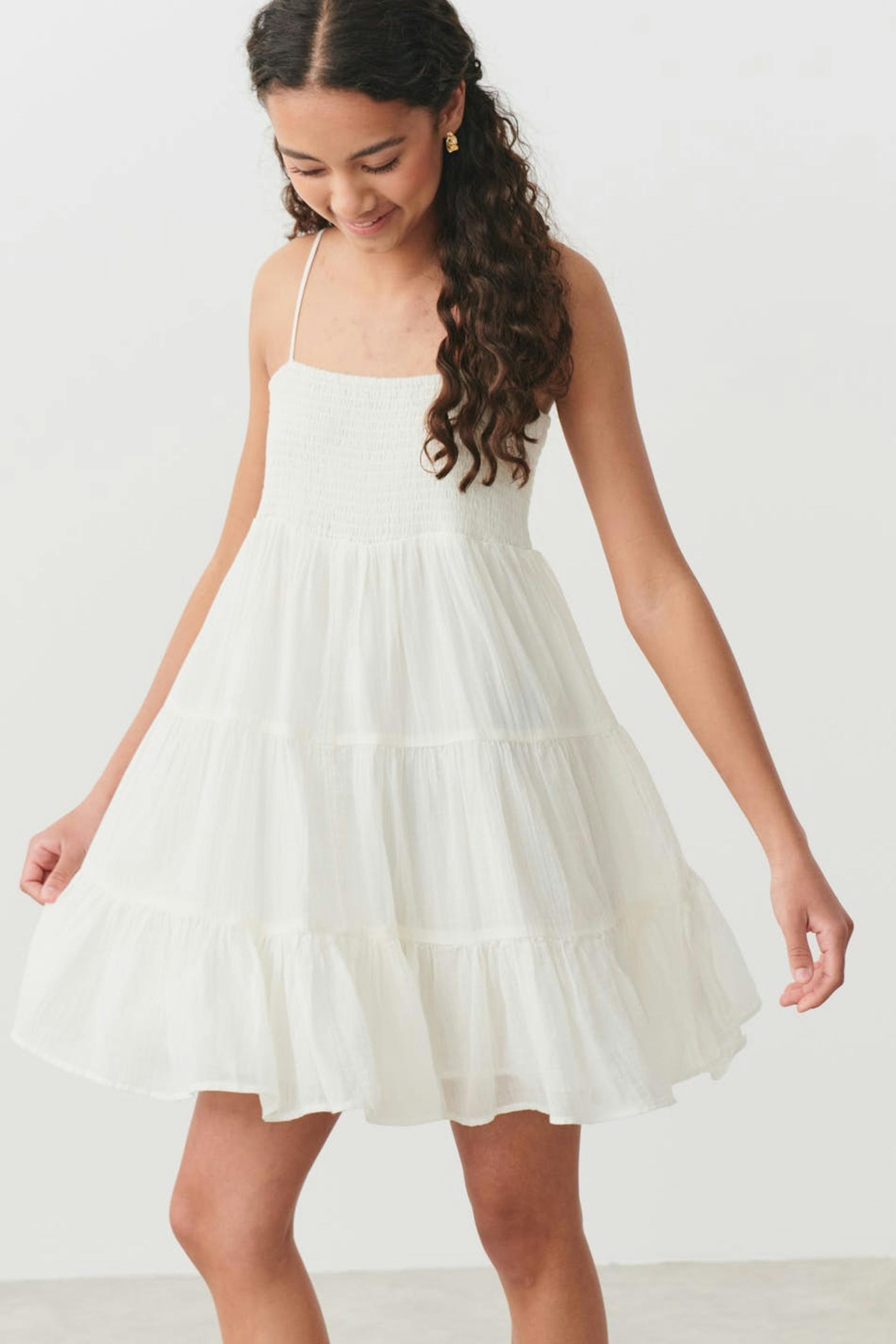 Woven dress by Gina Tricot Young with a smocking on the chest. The dress is white and short and has adjustable straps.