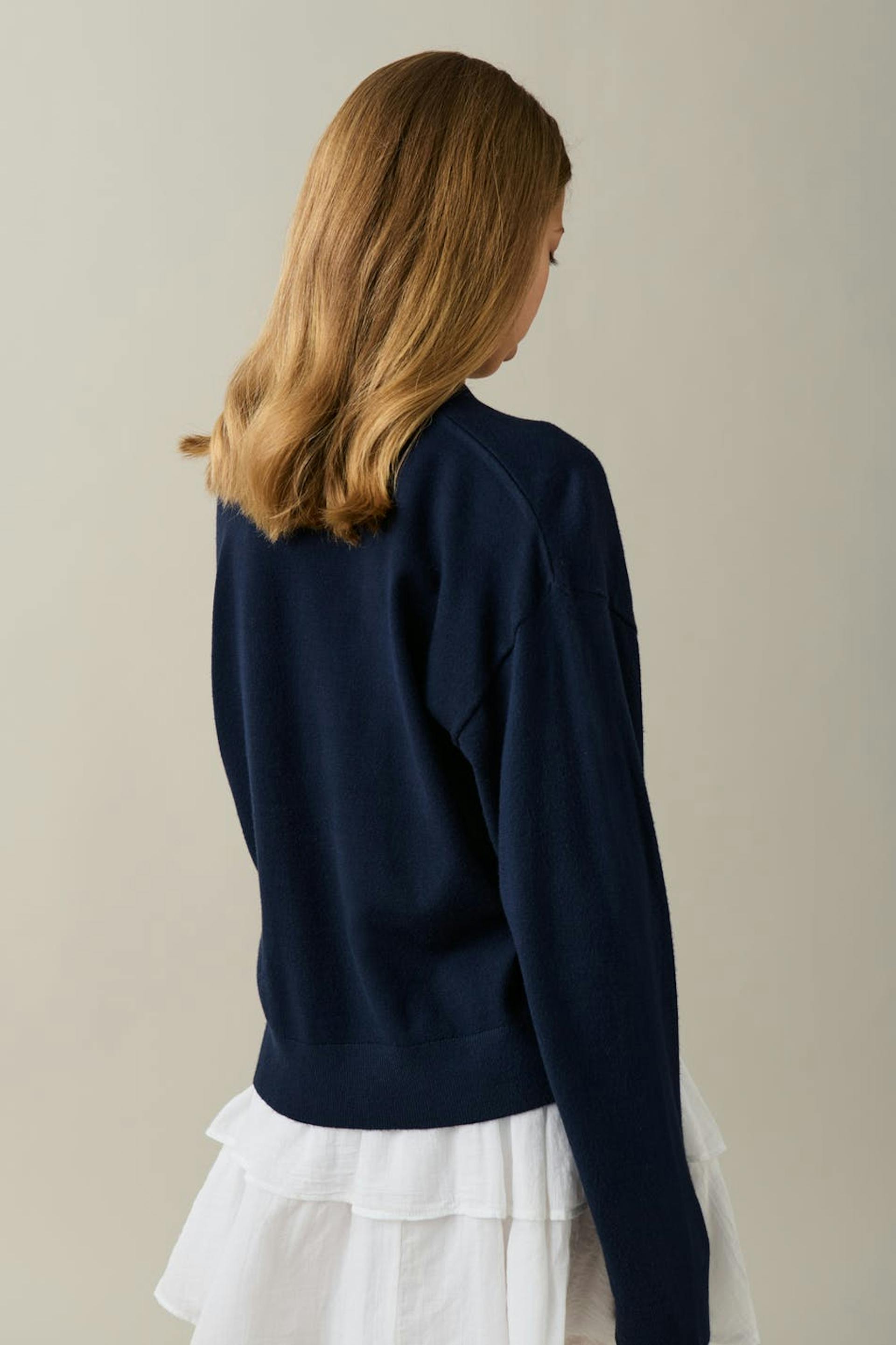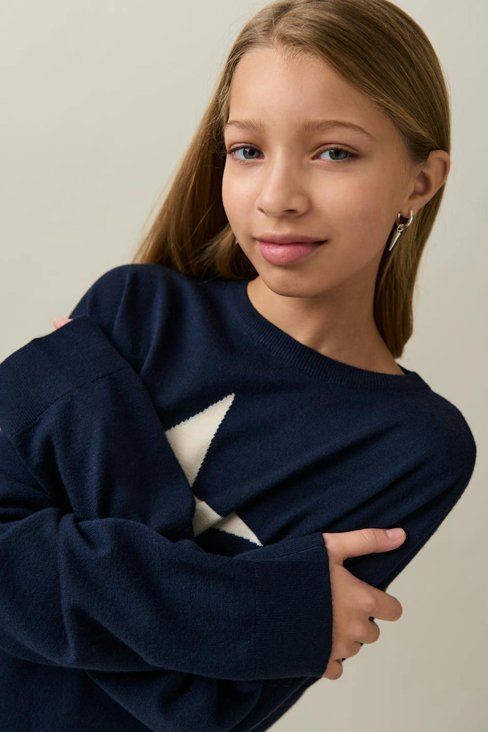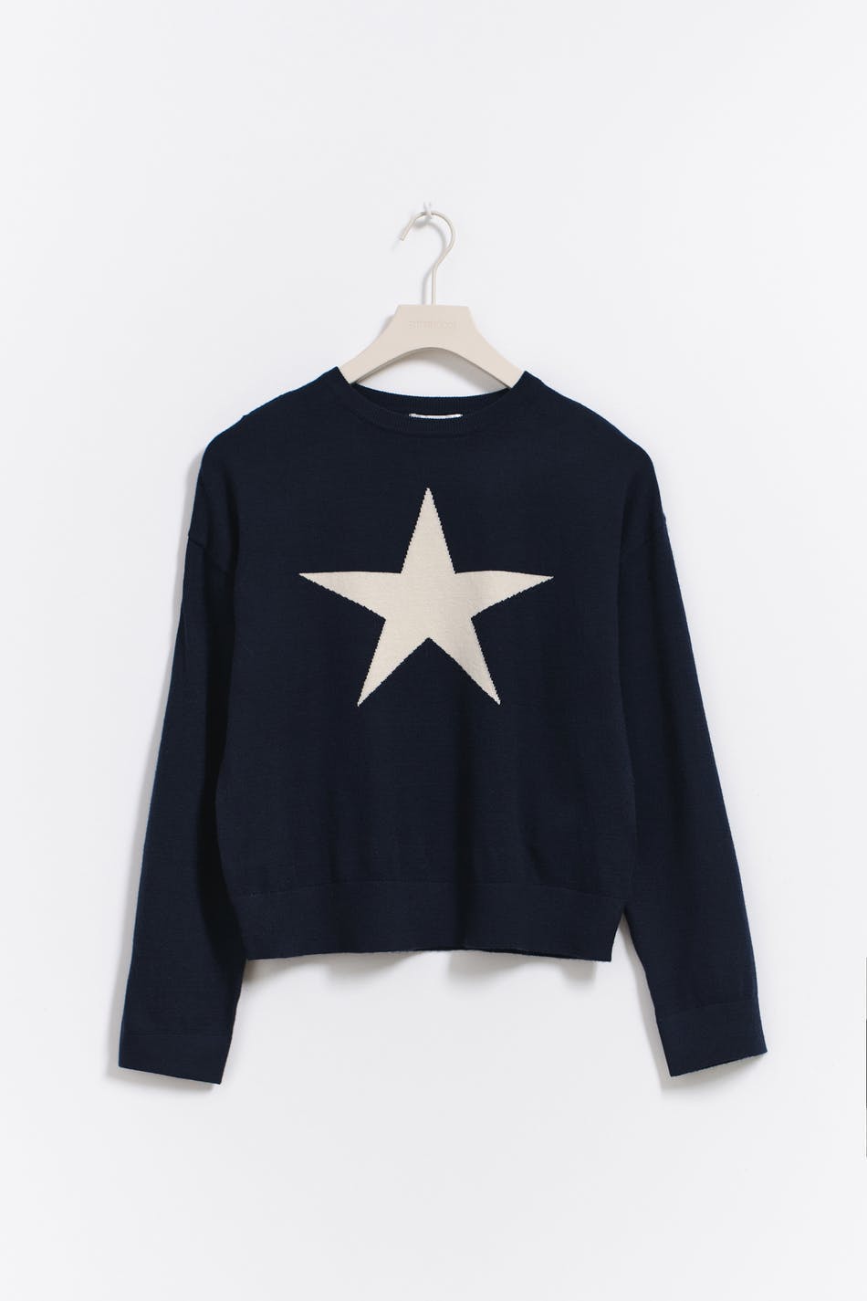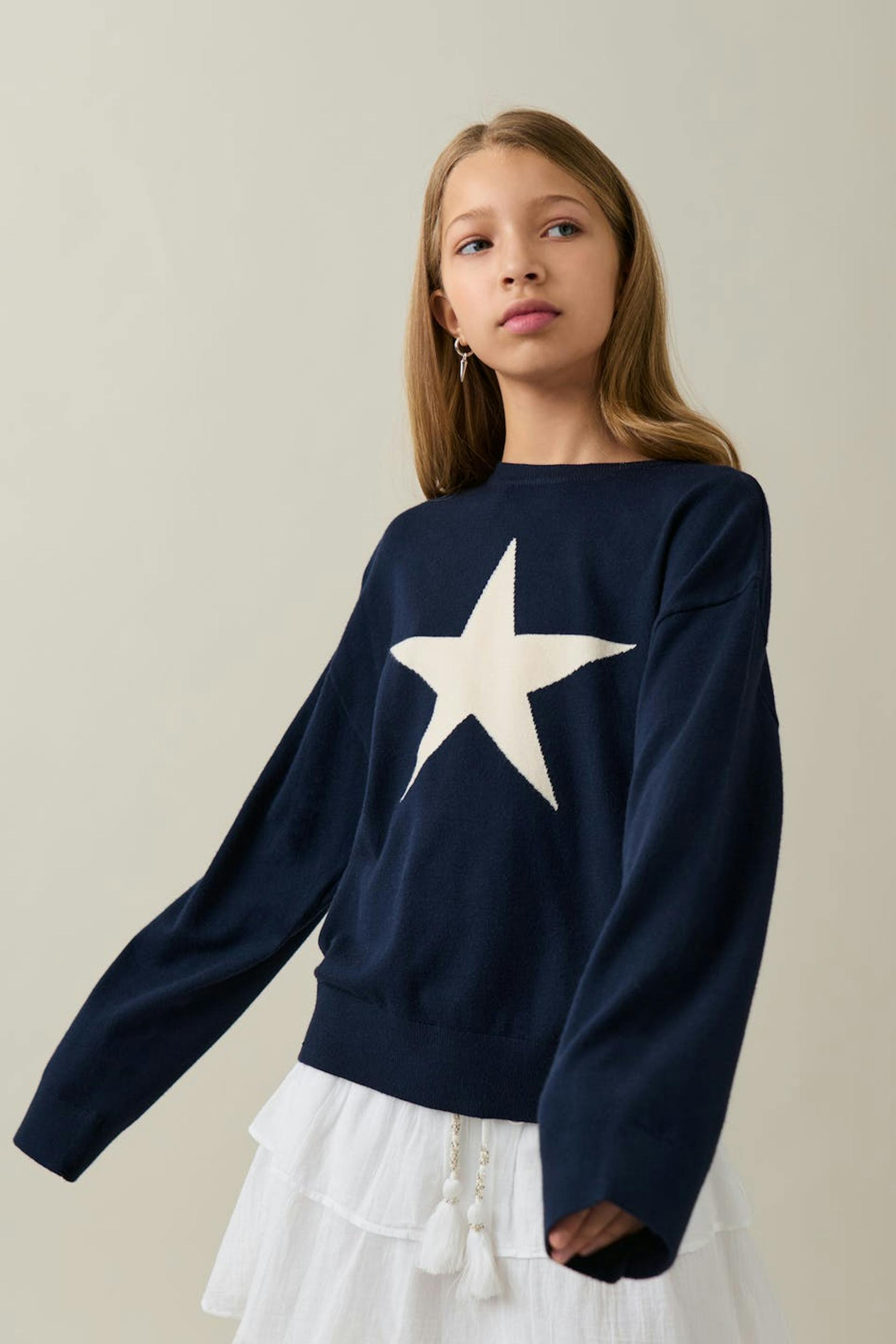 Knitted sweater with stars on the sleeves. The sweat is marine and blue and has regular fit. It has rib knit at sleeve ends and at the bottom.