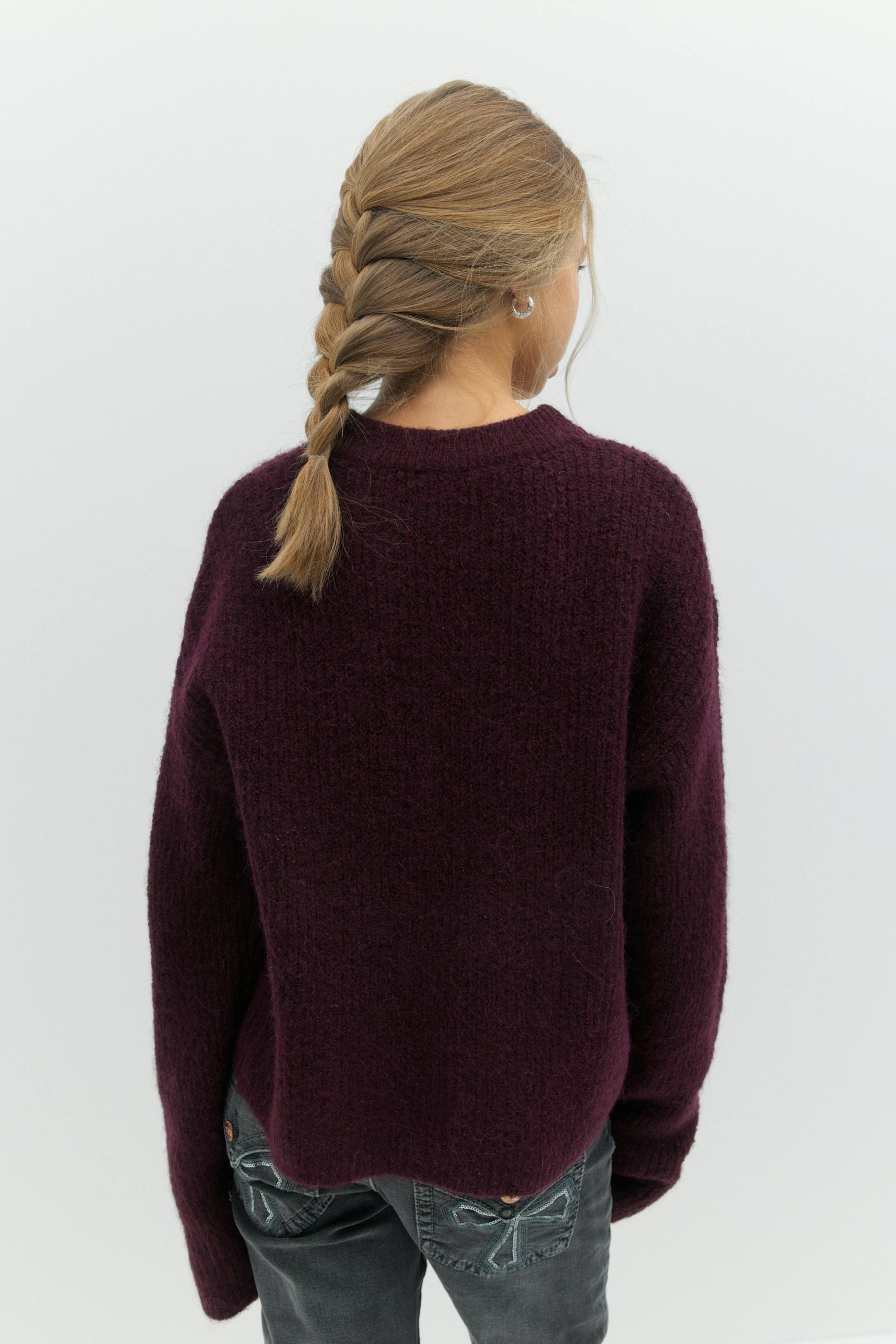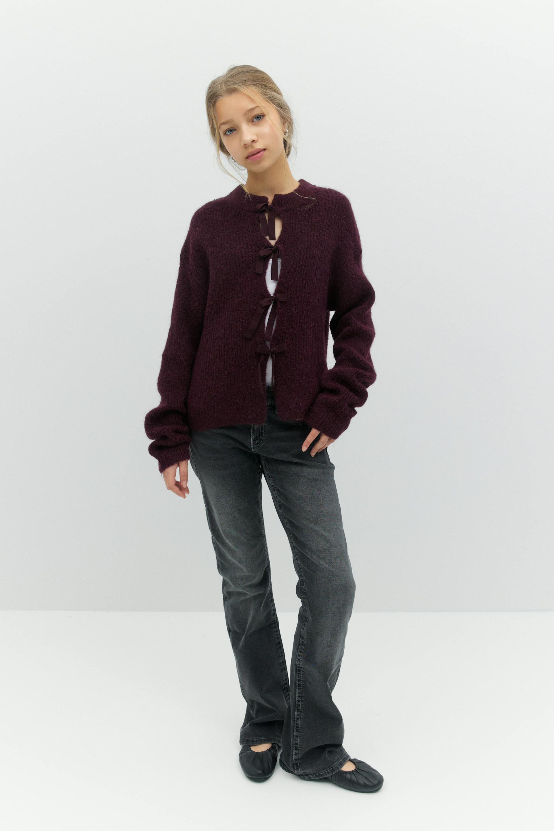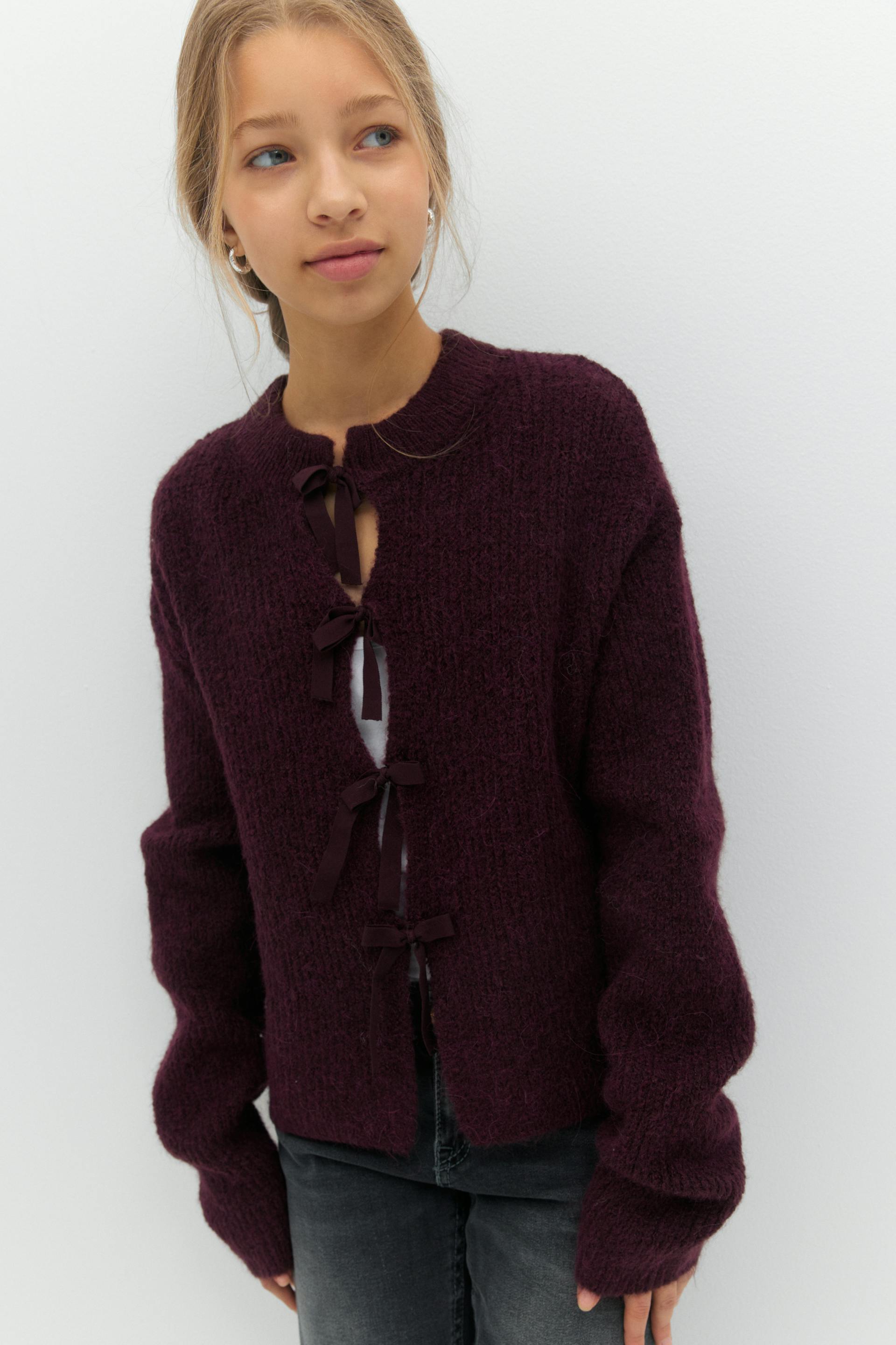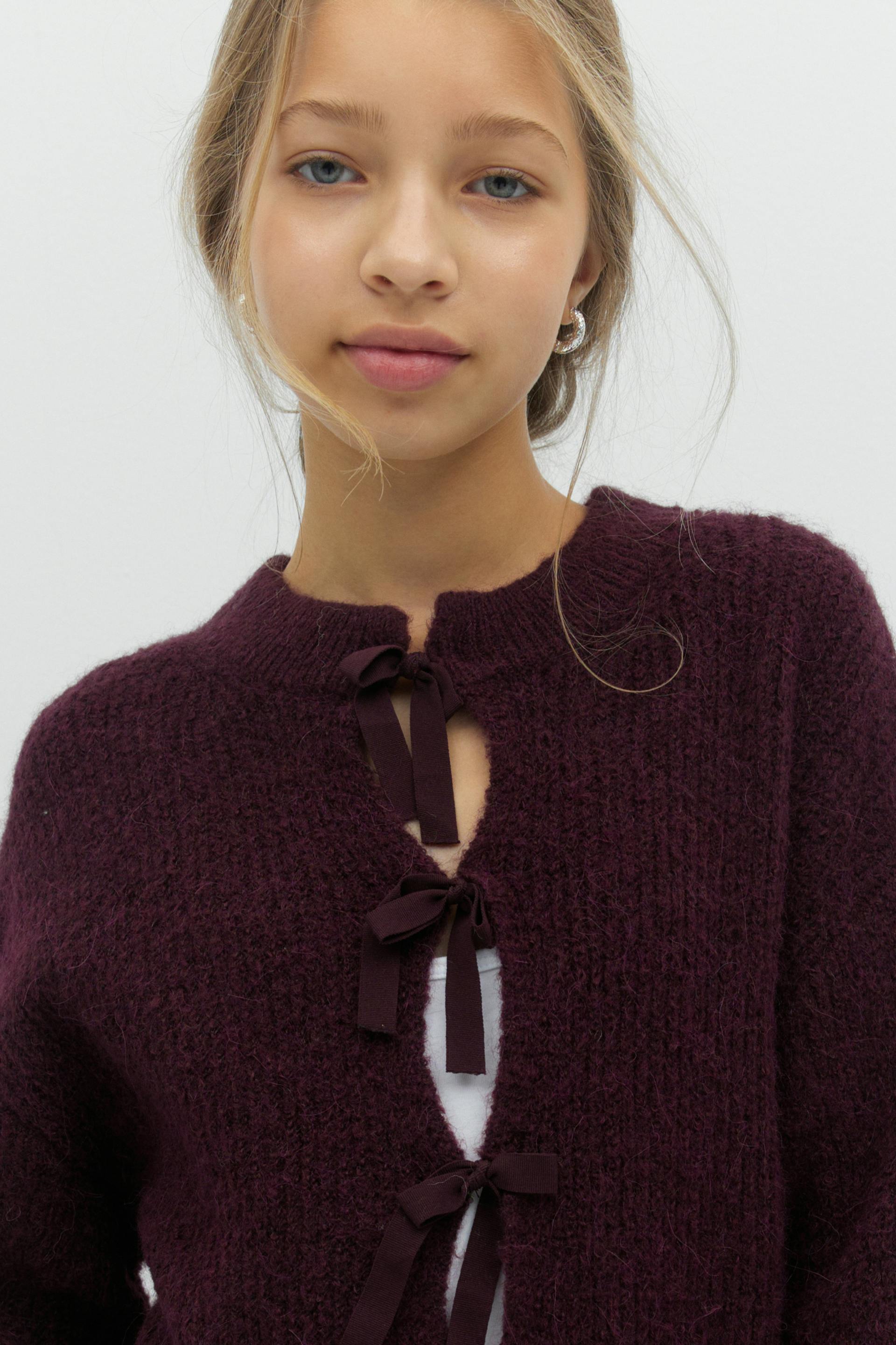 Knit cardigan in wool blend with round neckline. The cardigan is wine and has string tie closure with bows at the front. It has long sleeve and regular fit.