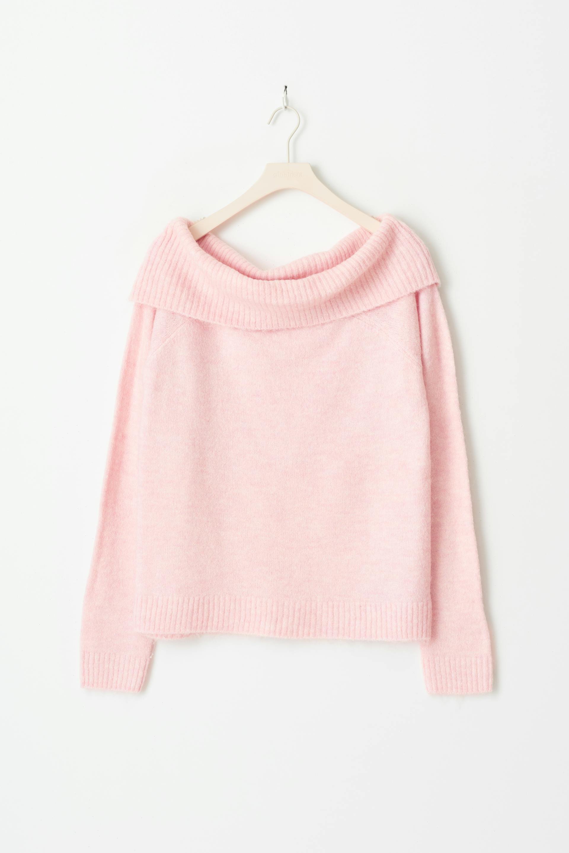 Off the shoulder jumper with turn-down upper edge. The jumper is pink and has loose-fitting style. It has raglan sleeve and ribbed trims.