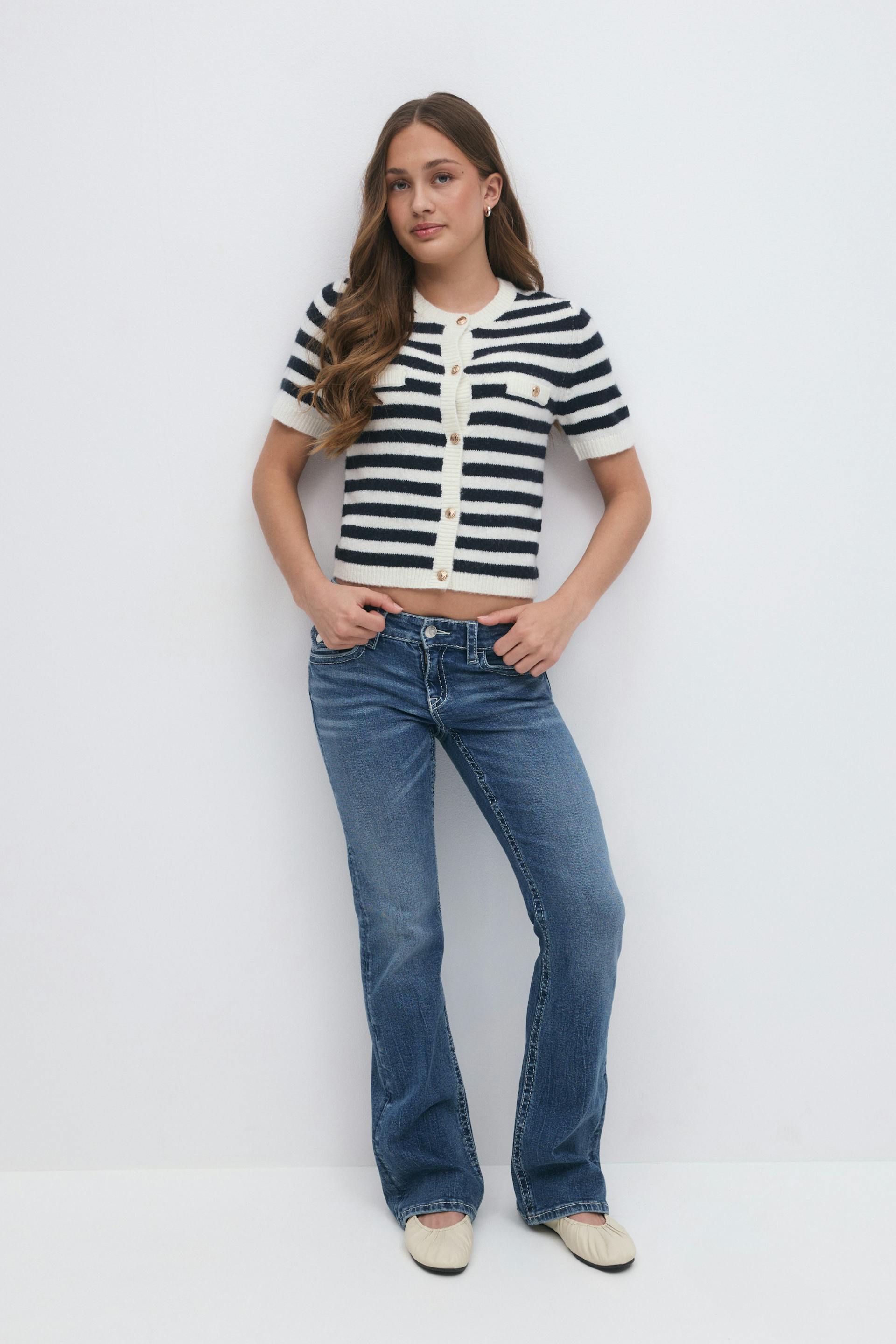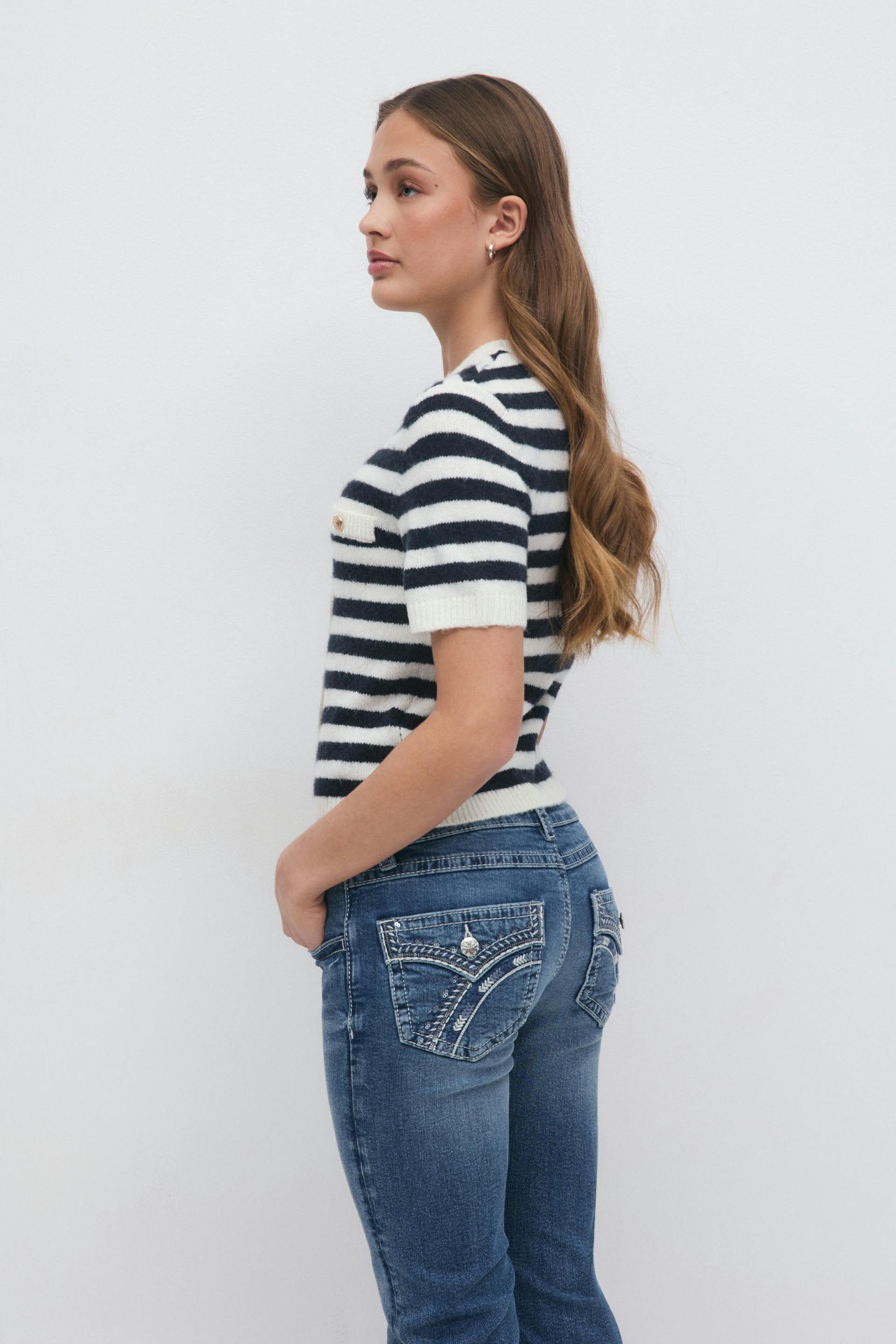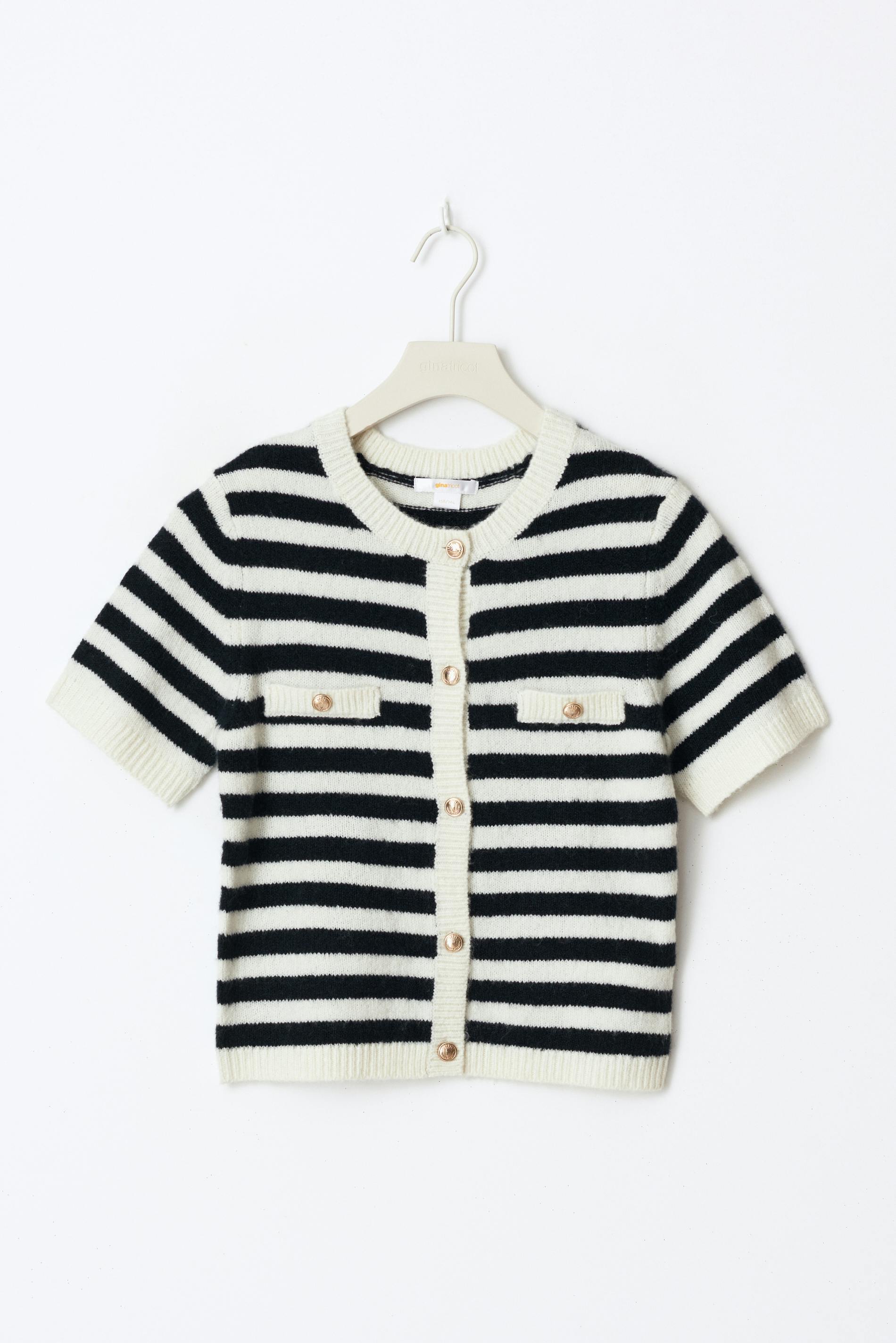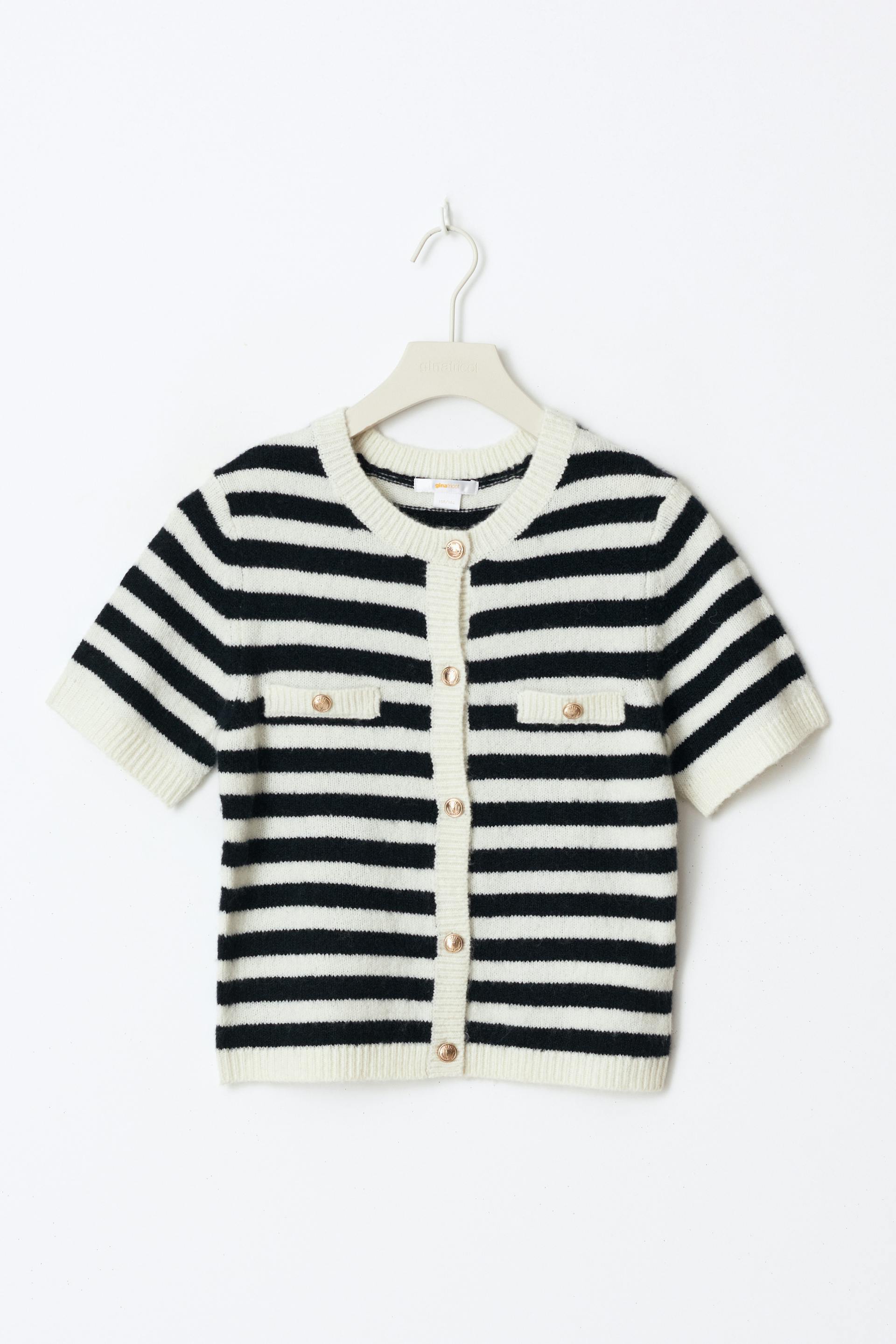 Striped cardigan with gold buttons at the front. The cardigan is navy, white and short-sleeved and has rounded neckline. It has regular fit and pockets at the front.