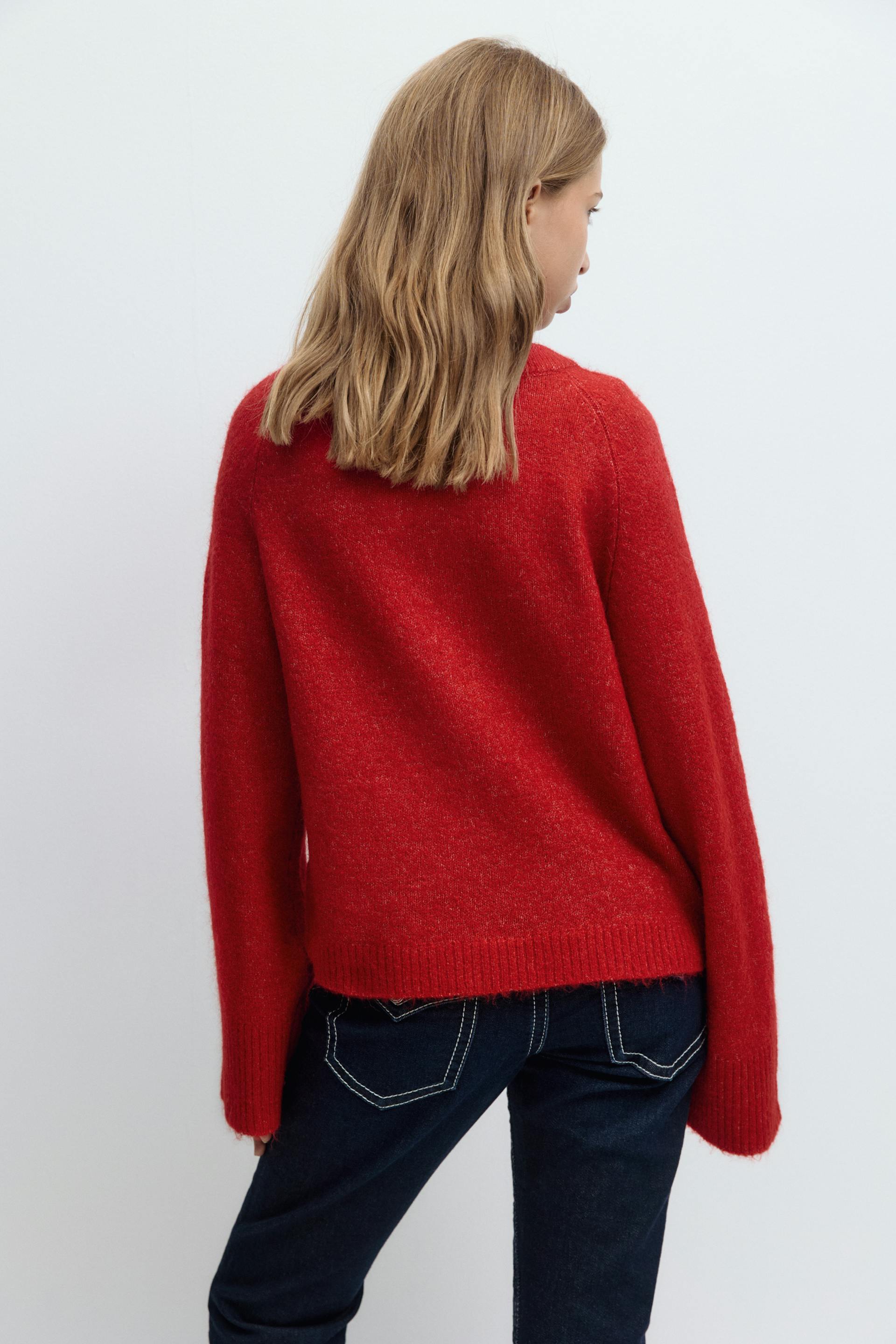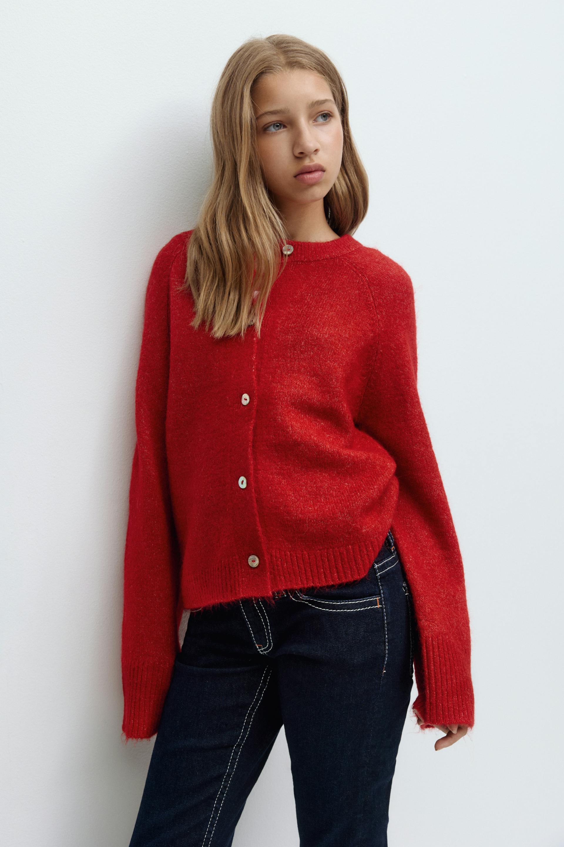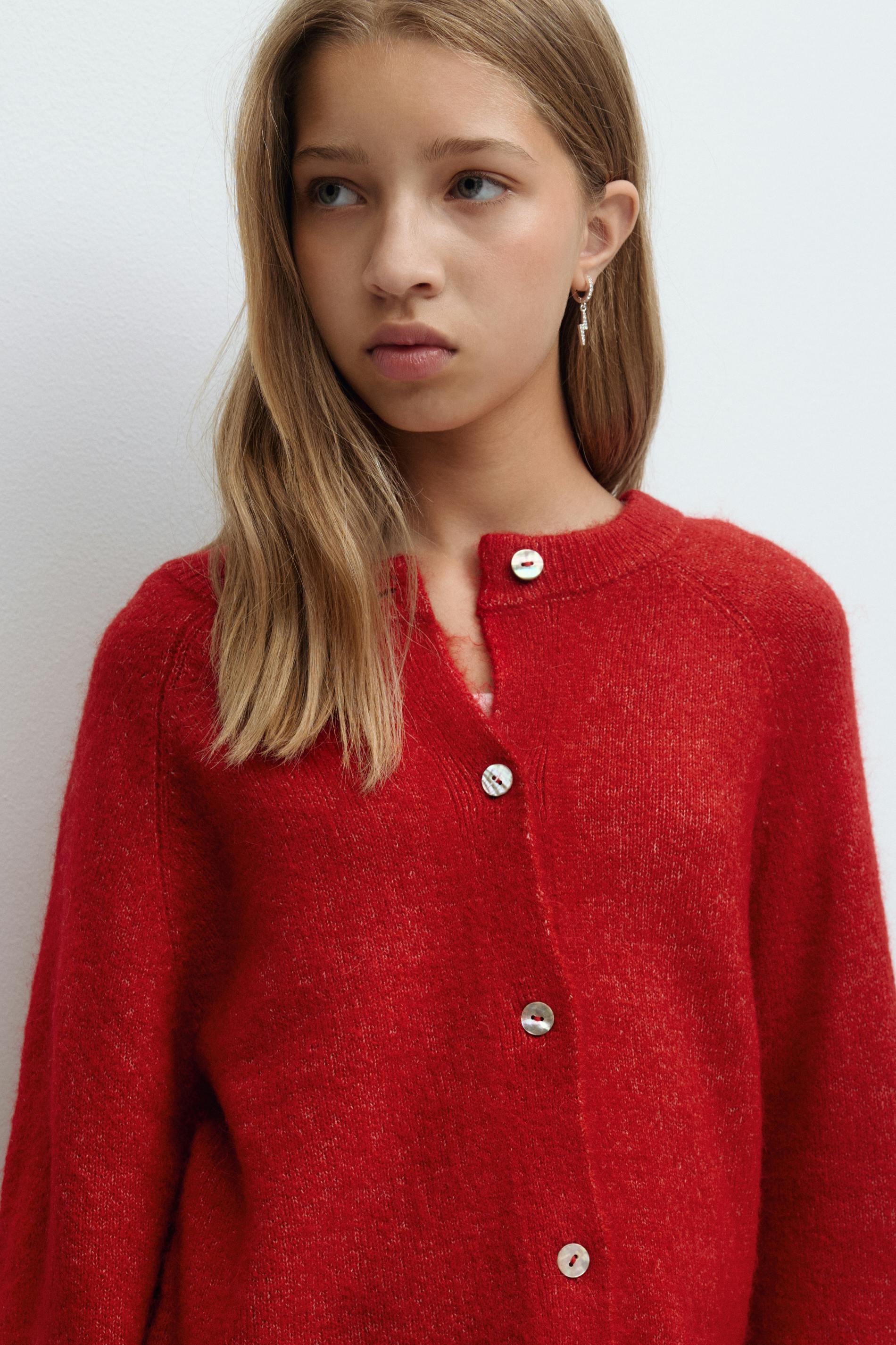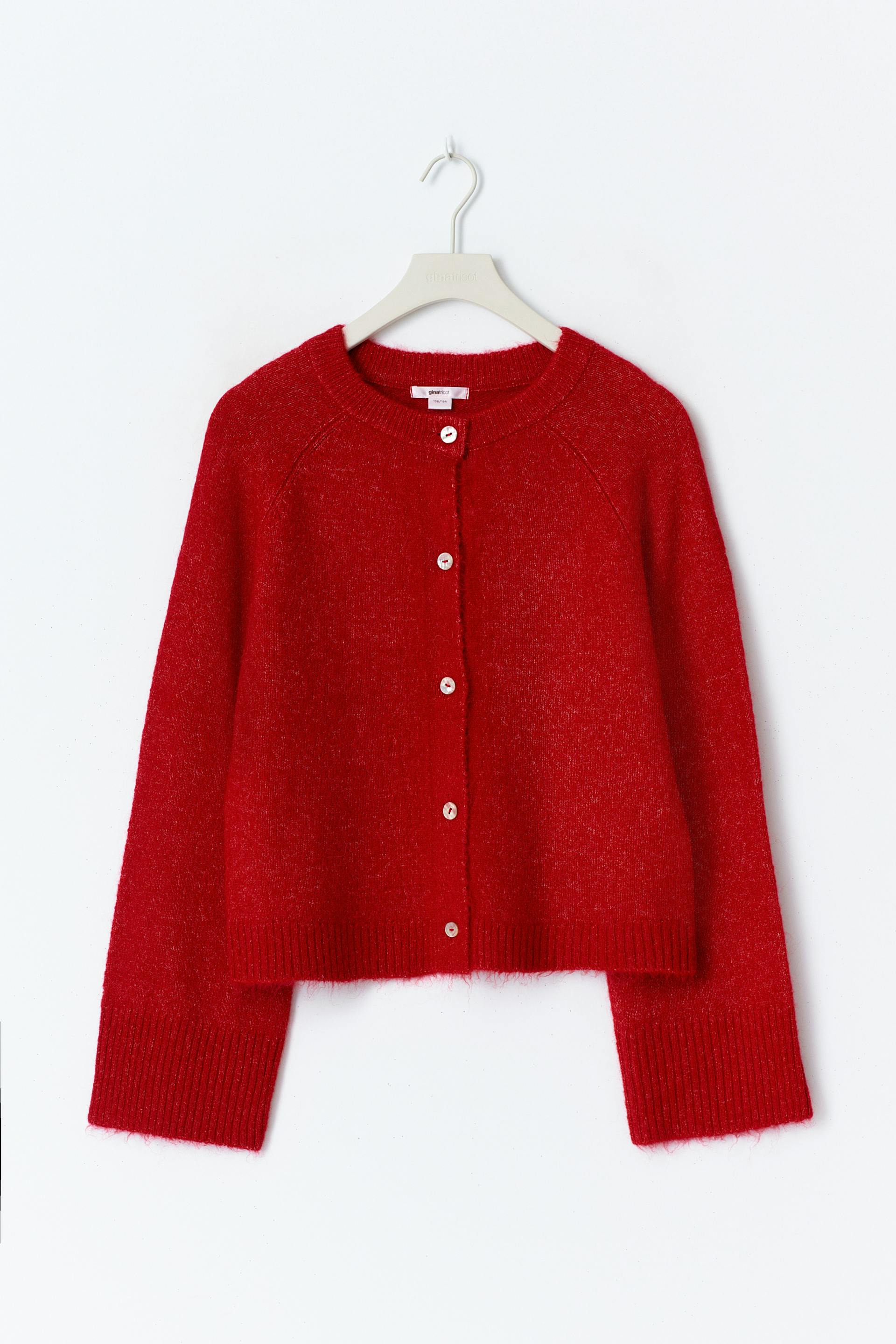 Knit cardigan in wool blend with buttons at the front. The cardigan is red and has long sleeves. It has regular fit, round neckline and rib knit at sleeve ends.