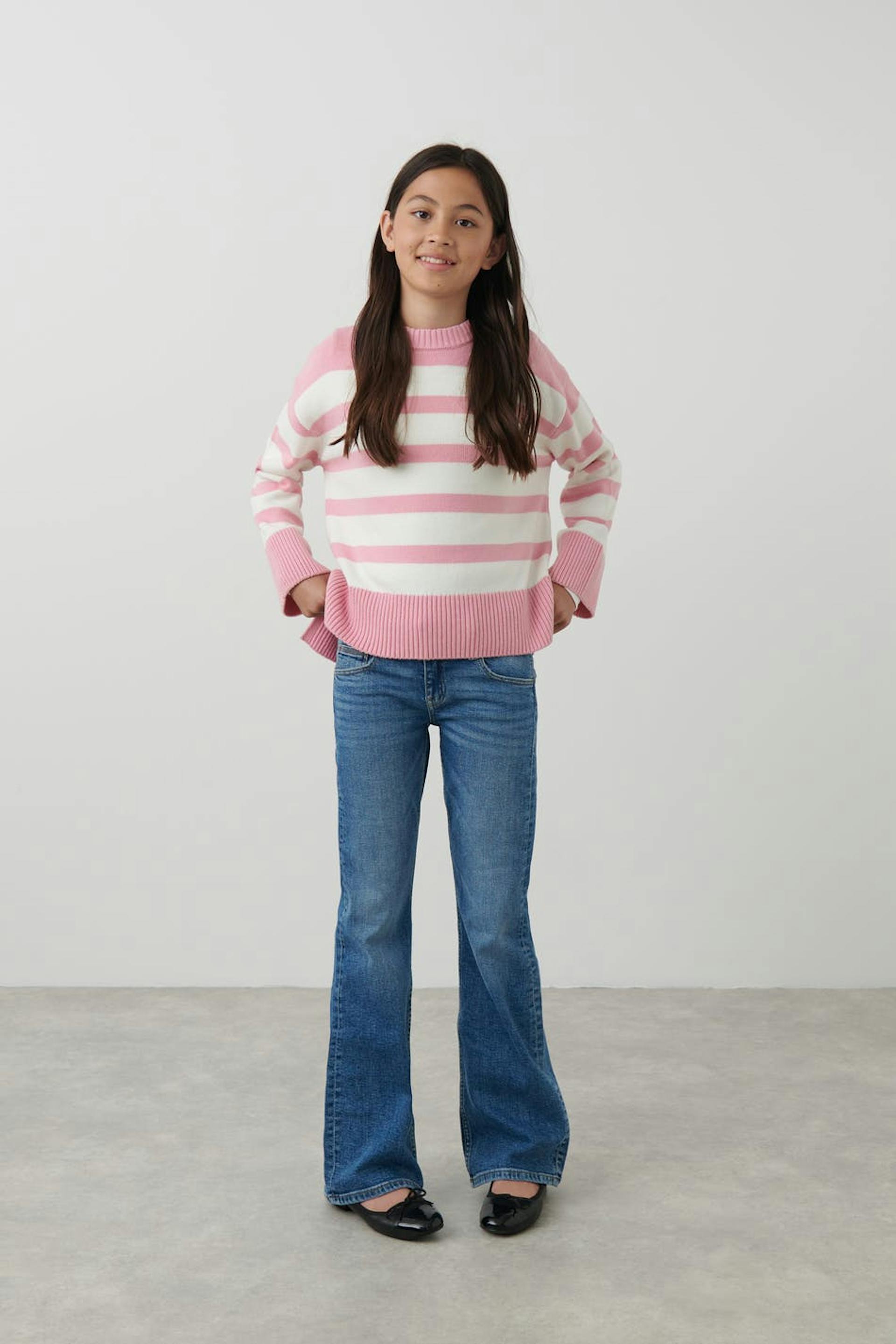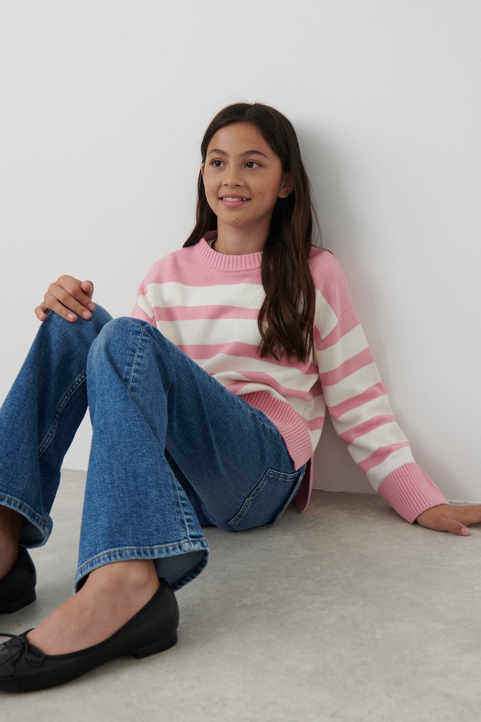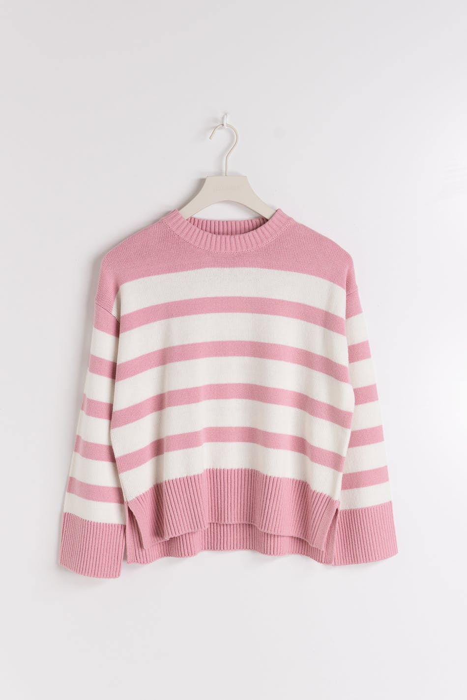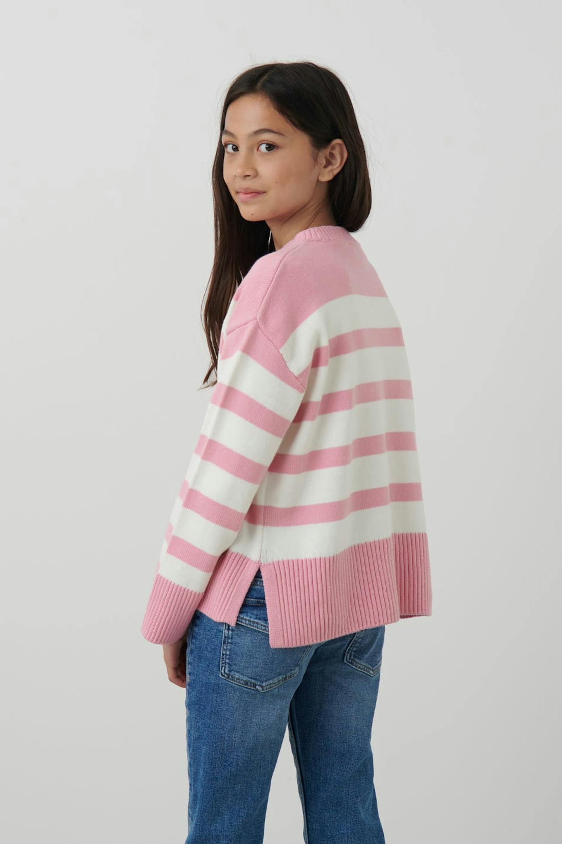 Striped knitted sweater by Gina Tricot Young with regular fit. The sweat is pink and has ribbed neckline. It has slit in the sides and rib knit at sleeve ends and at the bottom.