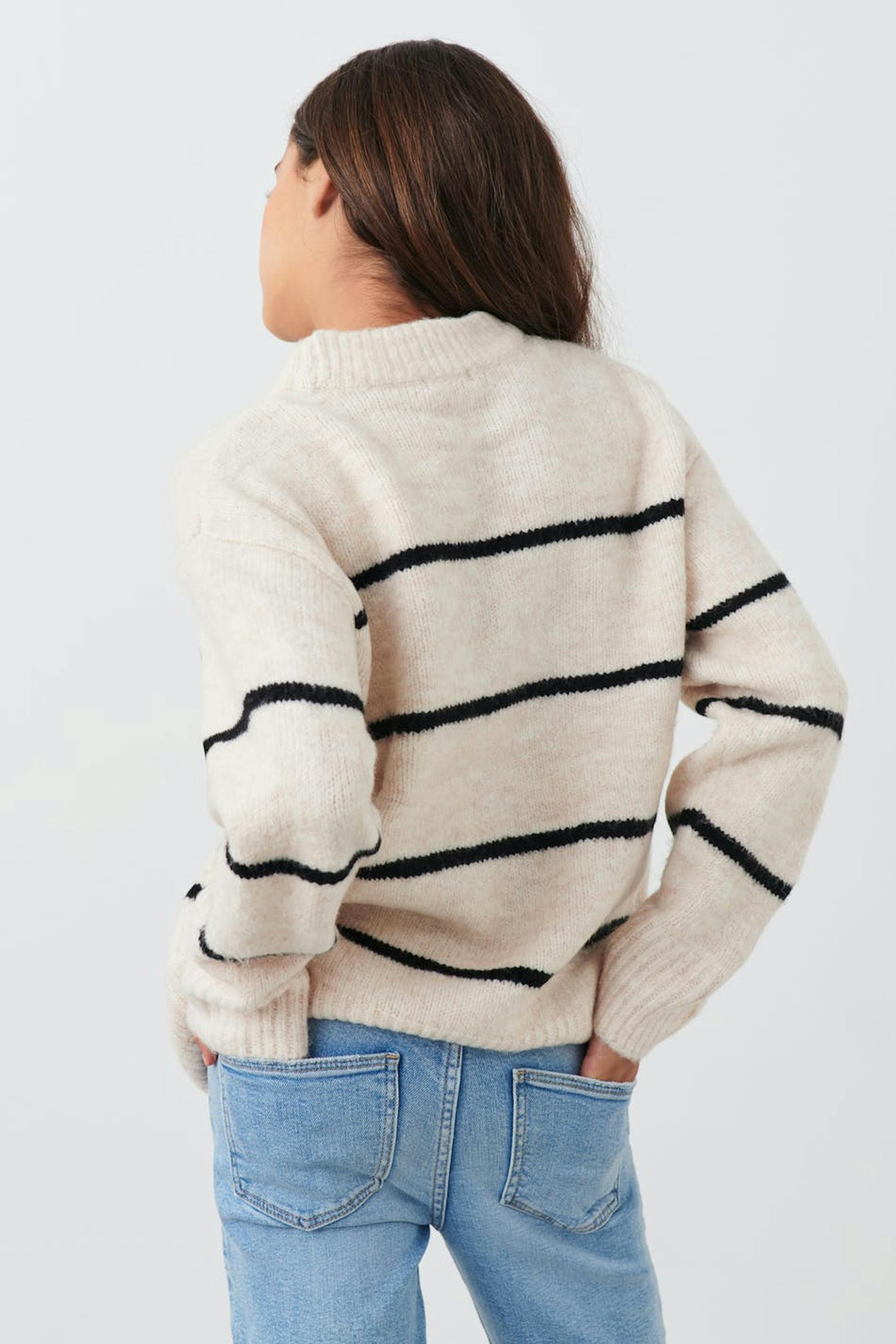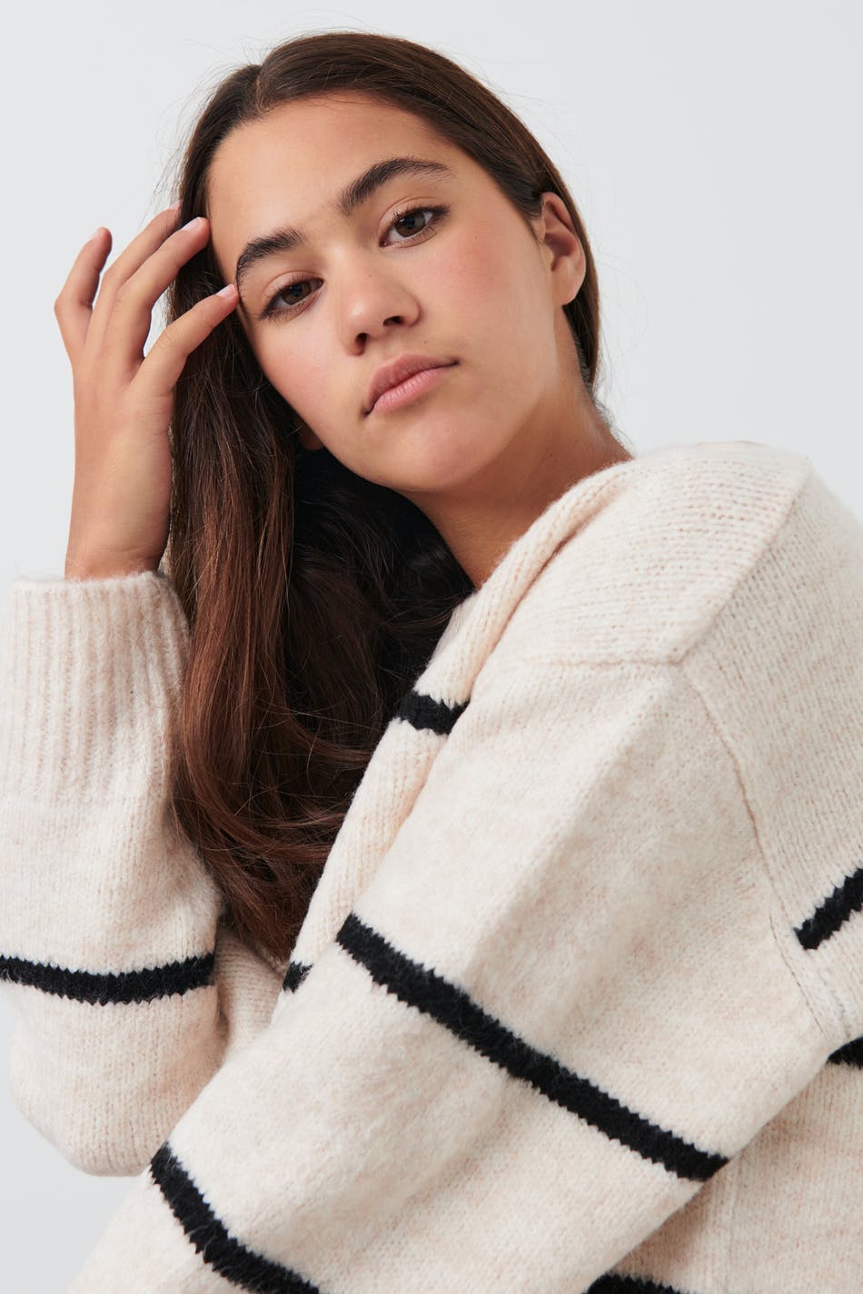 Striped knitted sweater by Gina Tricot Young with turtleneck. The sweat is beige and has slit in the sides. It has regular fit, wide sleeves, cropped length and rib knit at the bottom.