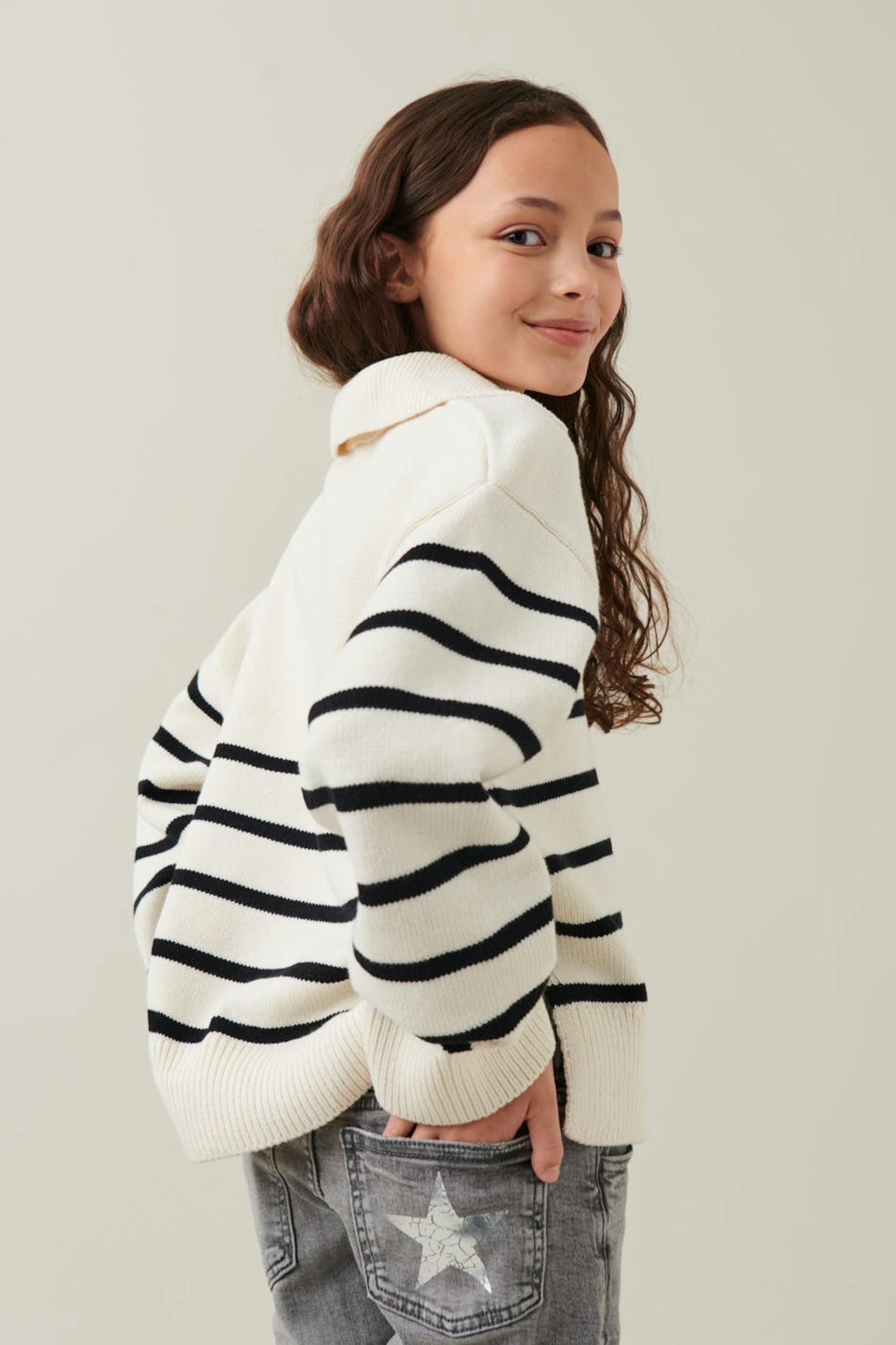 Striped sweat with loose-fitting style. The sweat is beige, black and knitted. It has collar, v-neck, straight sleeve, slit in the sides and rib knit at sleeve ends and at the bottom.
