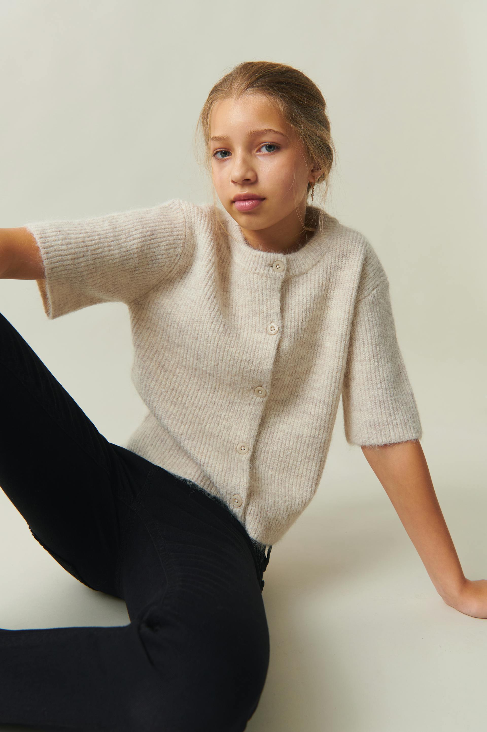 Short-sleeved cardigan with buttons in wool blend at the front. The cardigan is beige and has soft, knitted quality. It has loose-fitting style and round neckline.